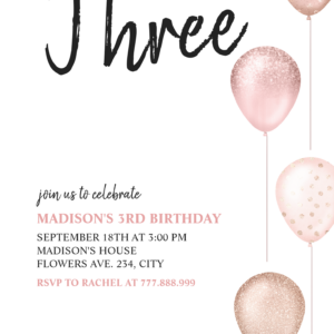 Girl Modern Simple 3rd Pink Balloons Birthday Invitation