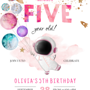 Girl Pink Astronaut Outer Space 5th Birthday Invitation