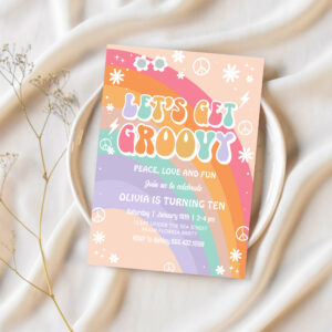 Lets Get Groovy Hippie 70S Party Rainbow Birthday Invitation