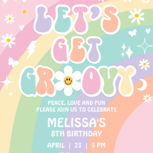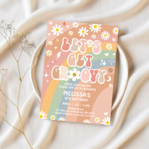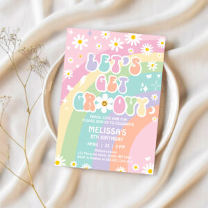 Lets Get Groovy Daisy Rainbow Hippie Birthday Invitation