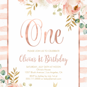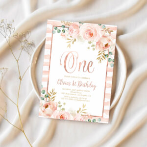 Blush Pink Floral Rose Gold First Birthday Invitation