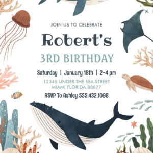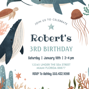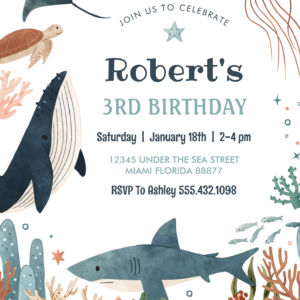 Under The Sea Whale Turtle Shark 1st Birthday Invitation