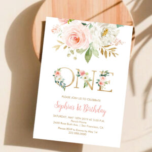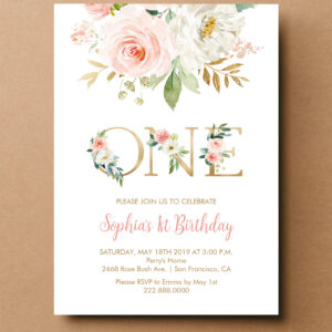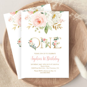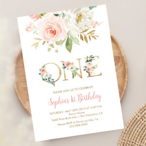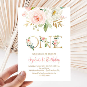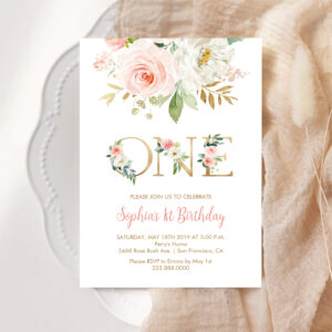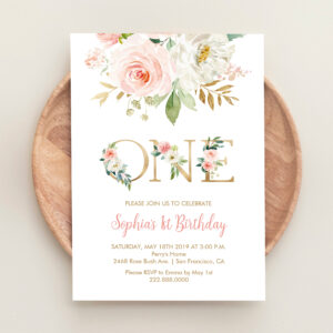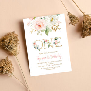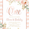 Blush Pink Floral Gold One Girls Birthday Party Invitation
