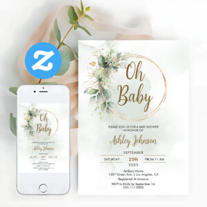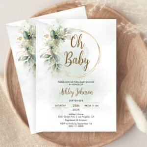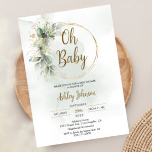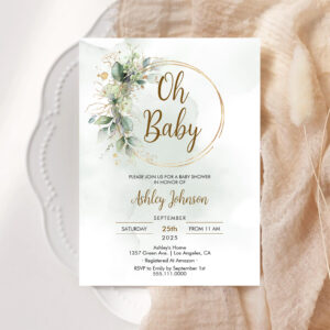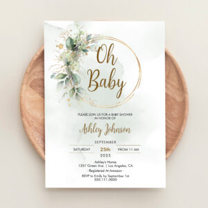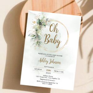 Boho Floral Oh Baby Green And Gold Baby Shower Invitation