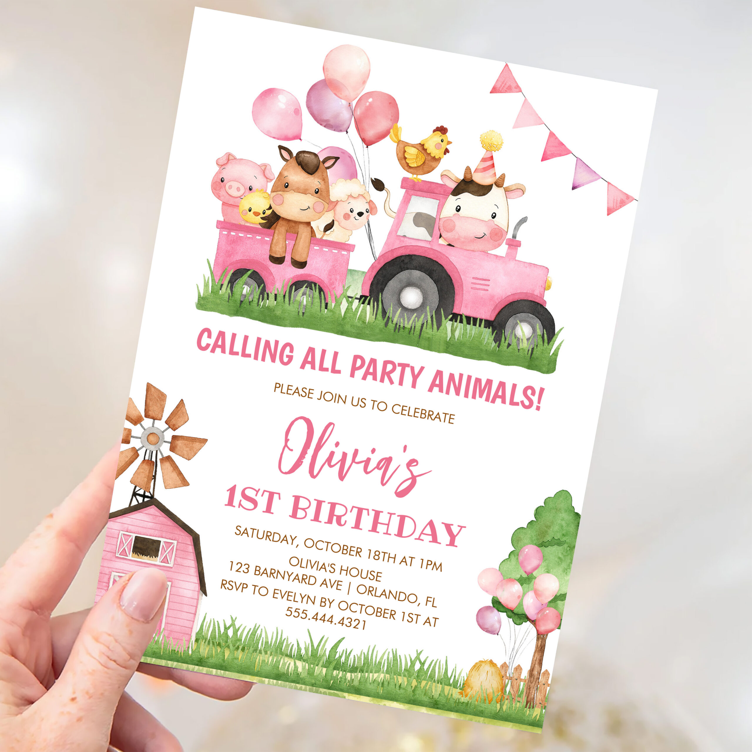 Farm Animals Barnyard Ranch Girls 1st Birthday Invitation