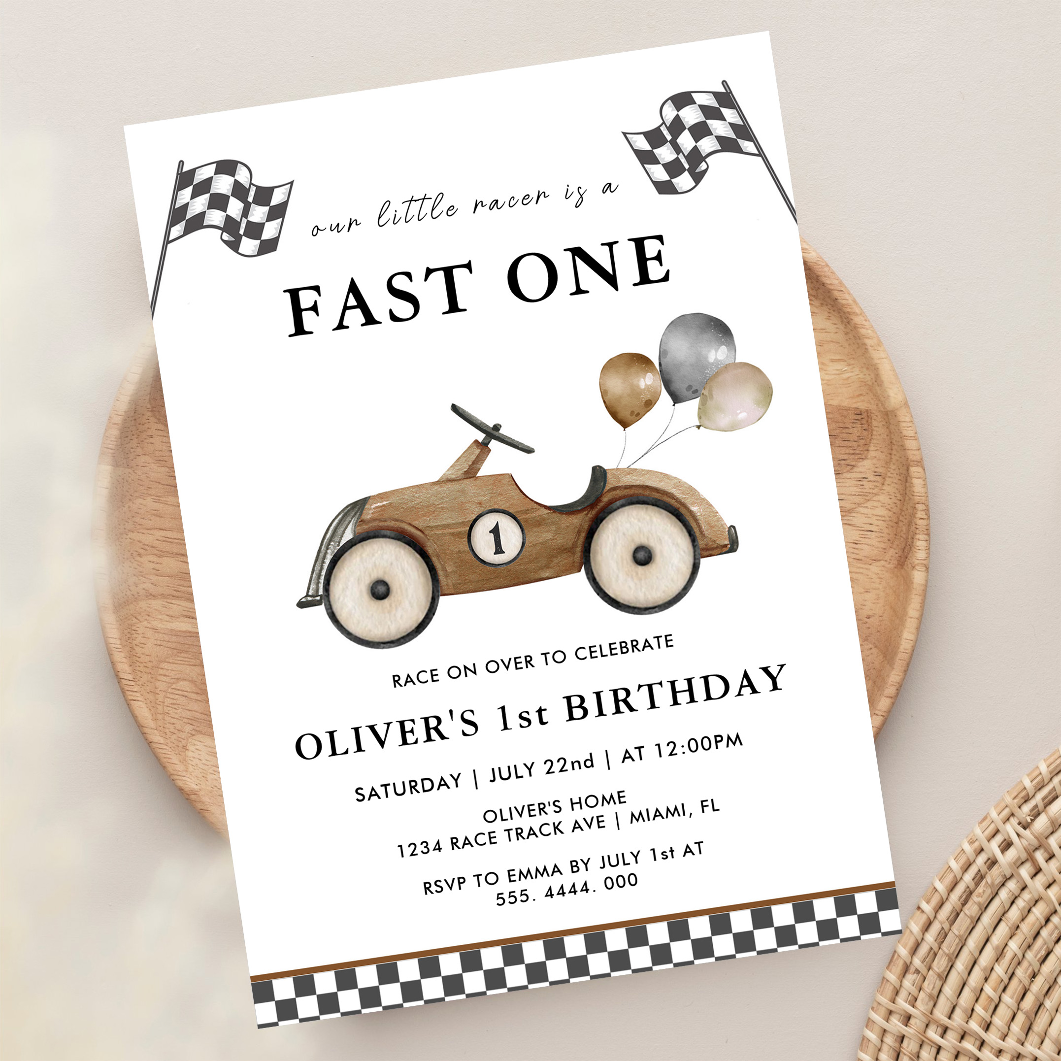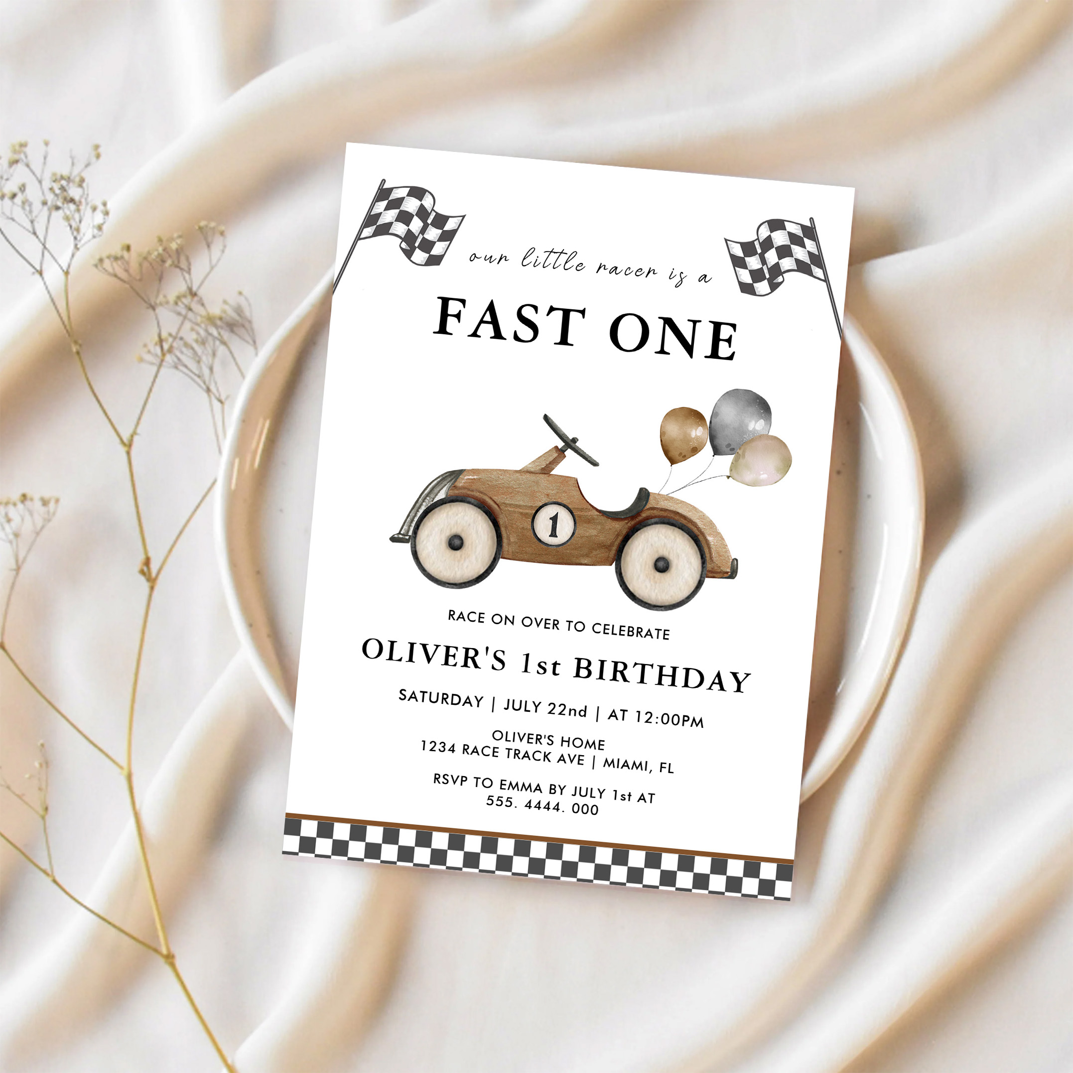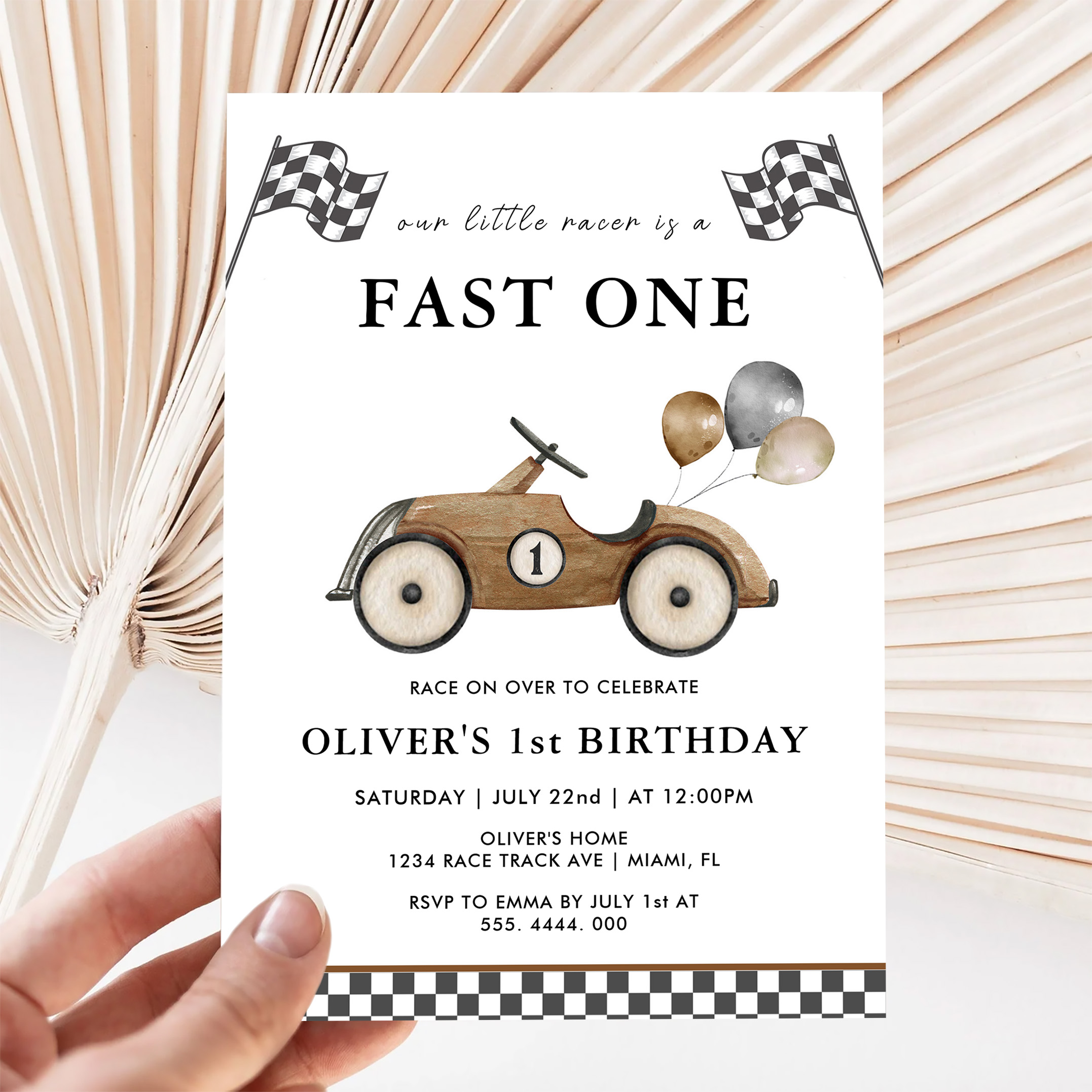 Fast One Brown Race Car Boys 1st Birthday Invitation