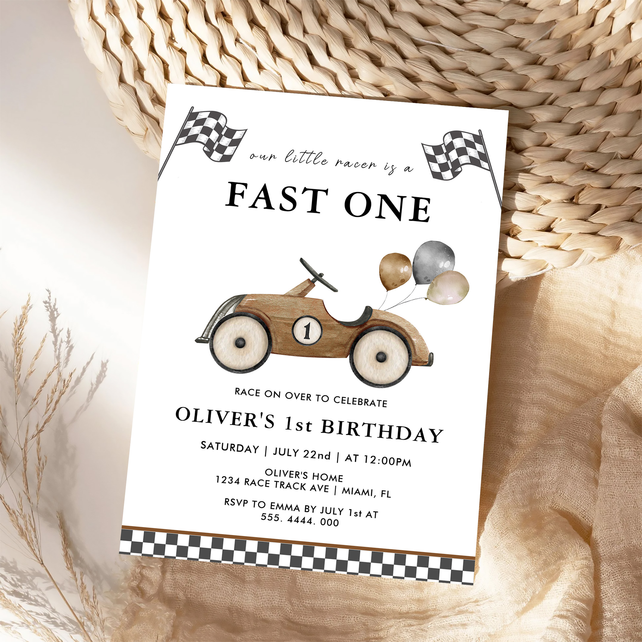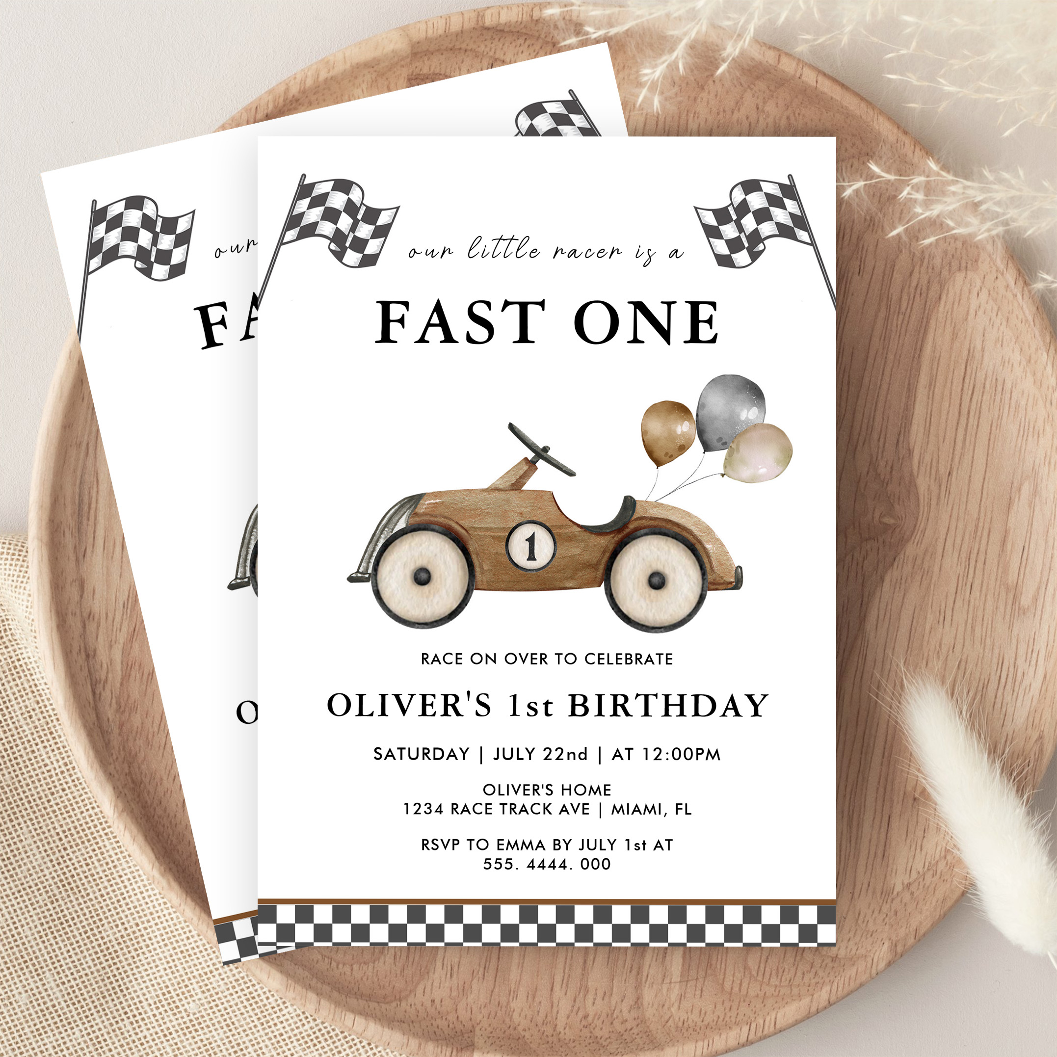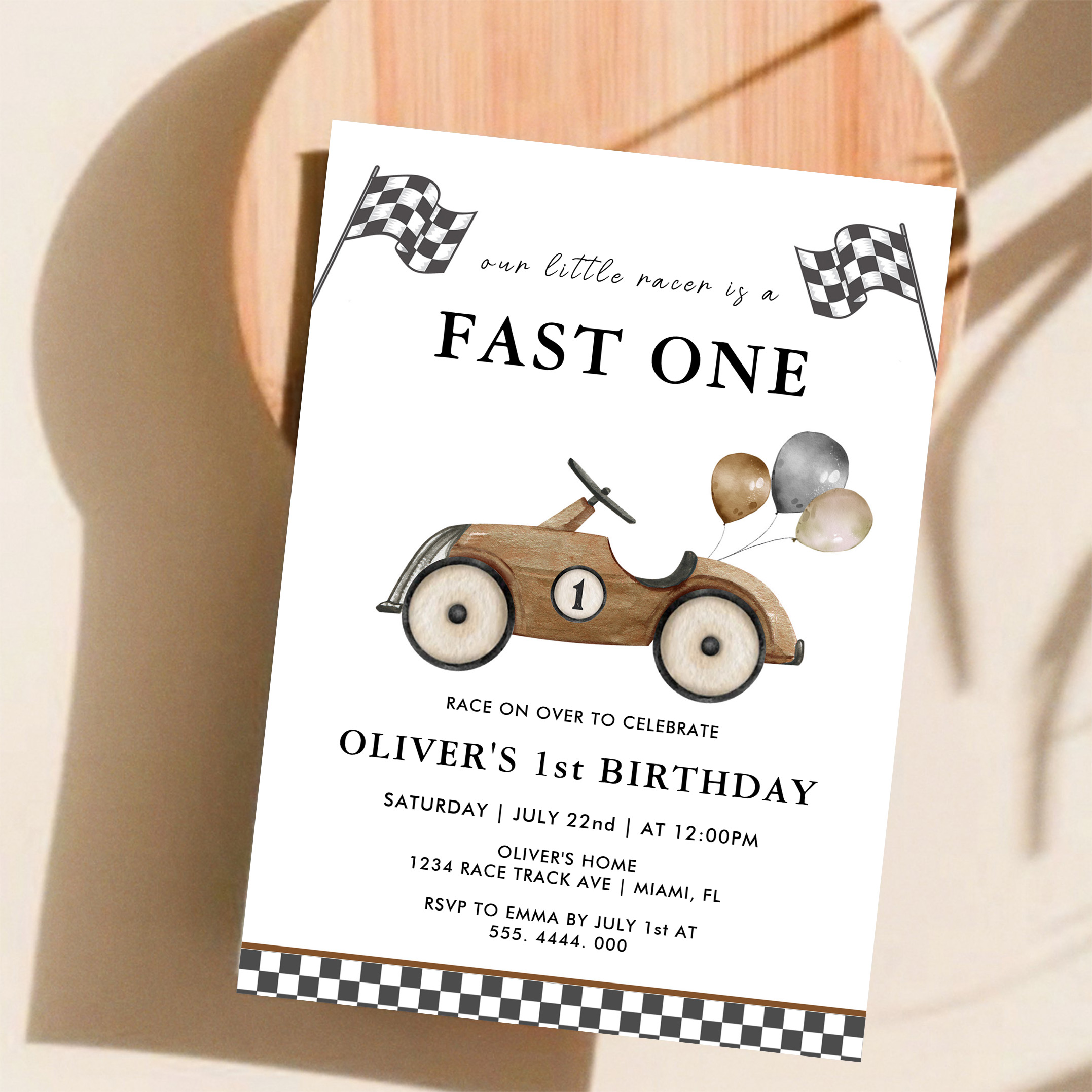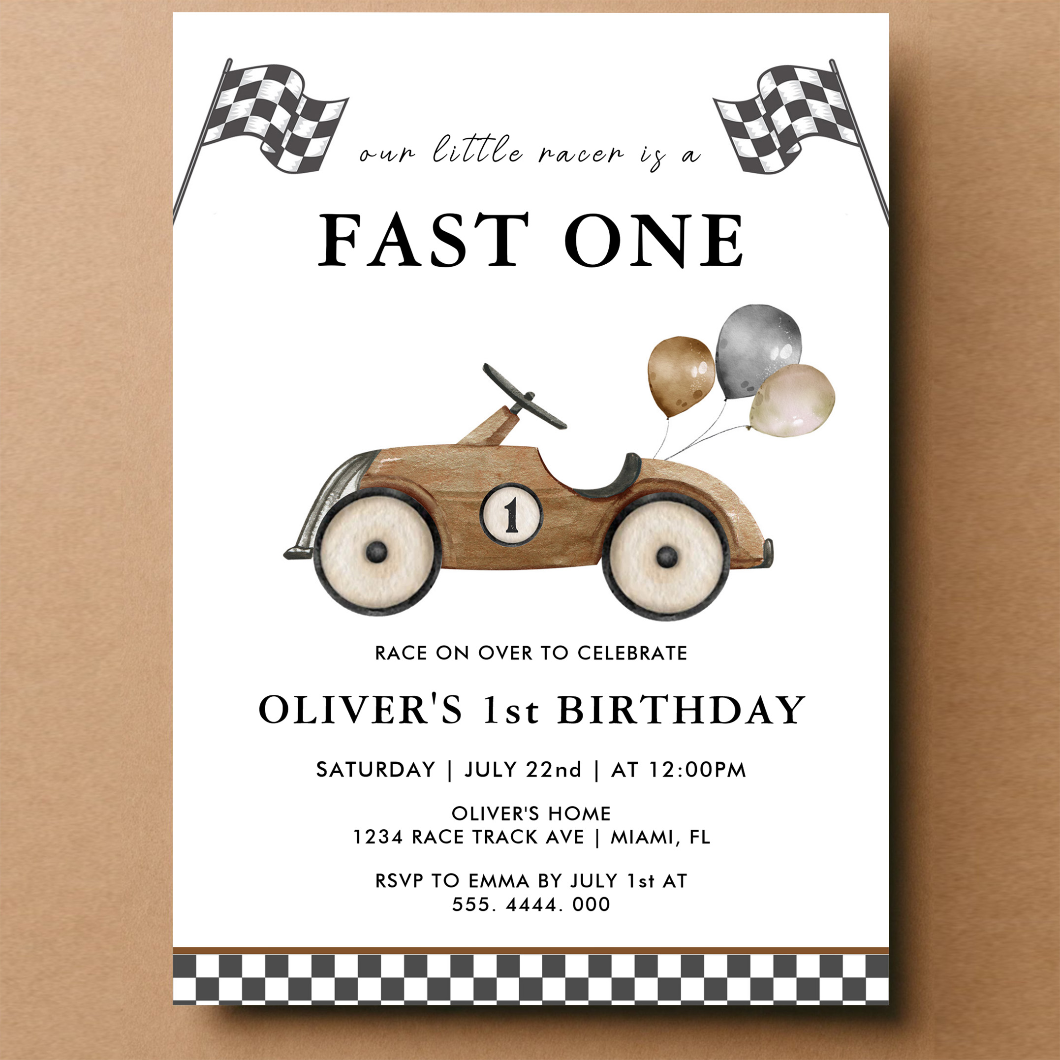 Fast One Brown Race Car Boys 1st Birthday Invitation
