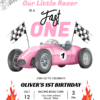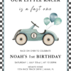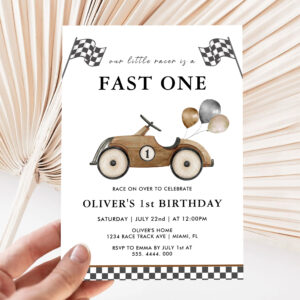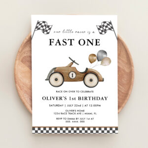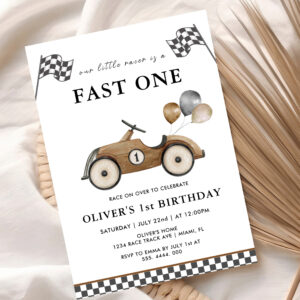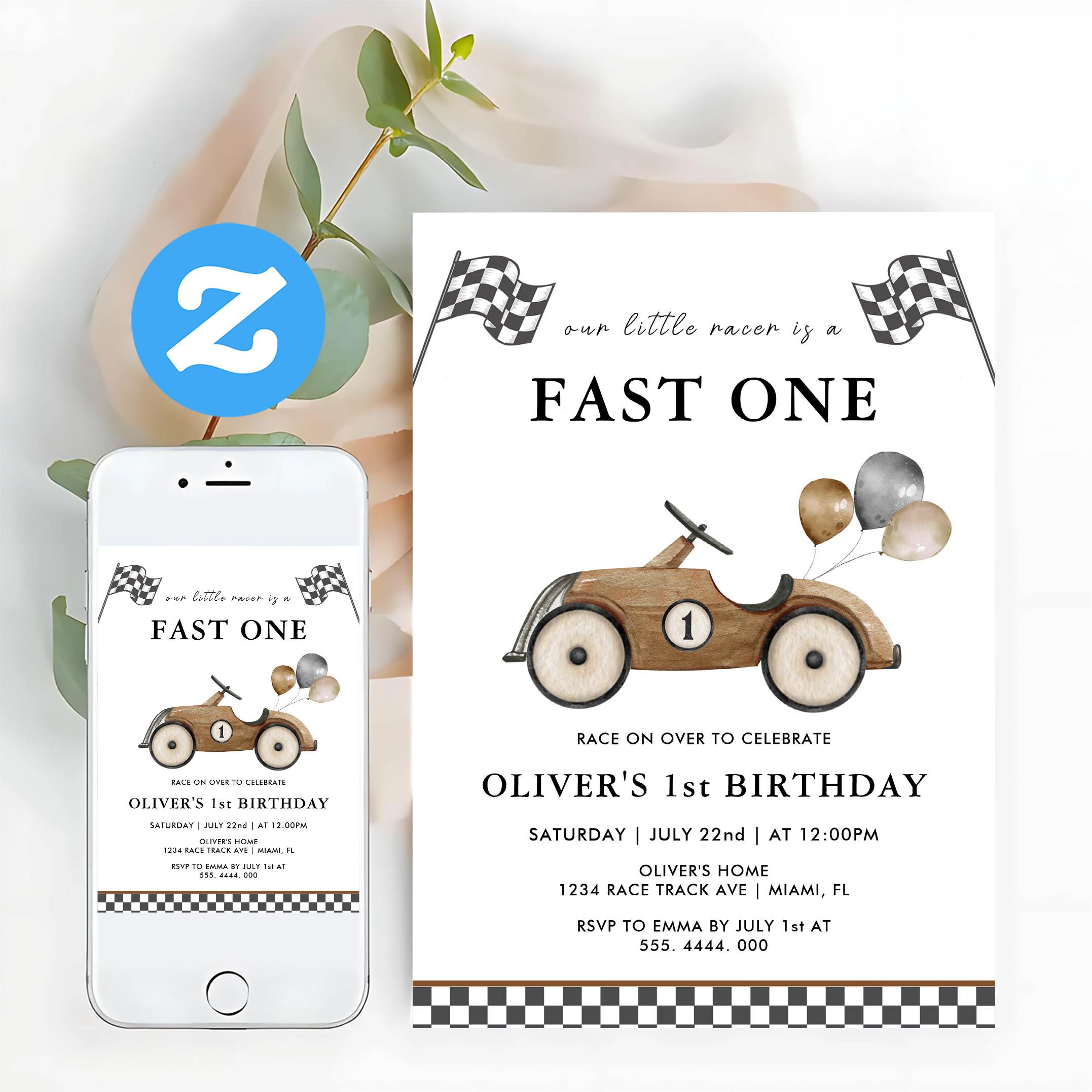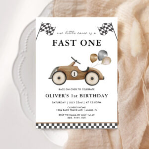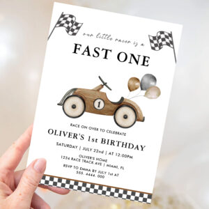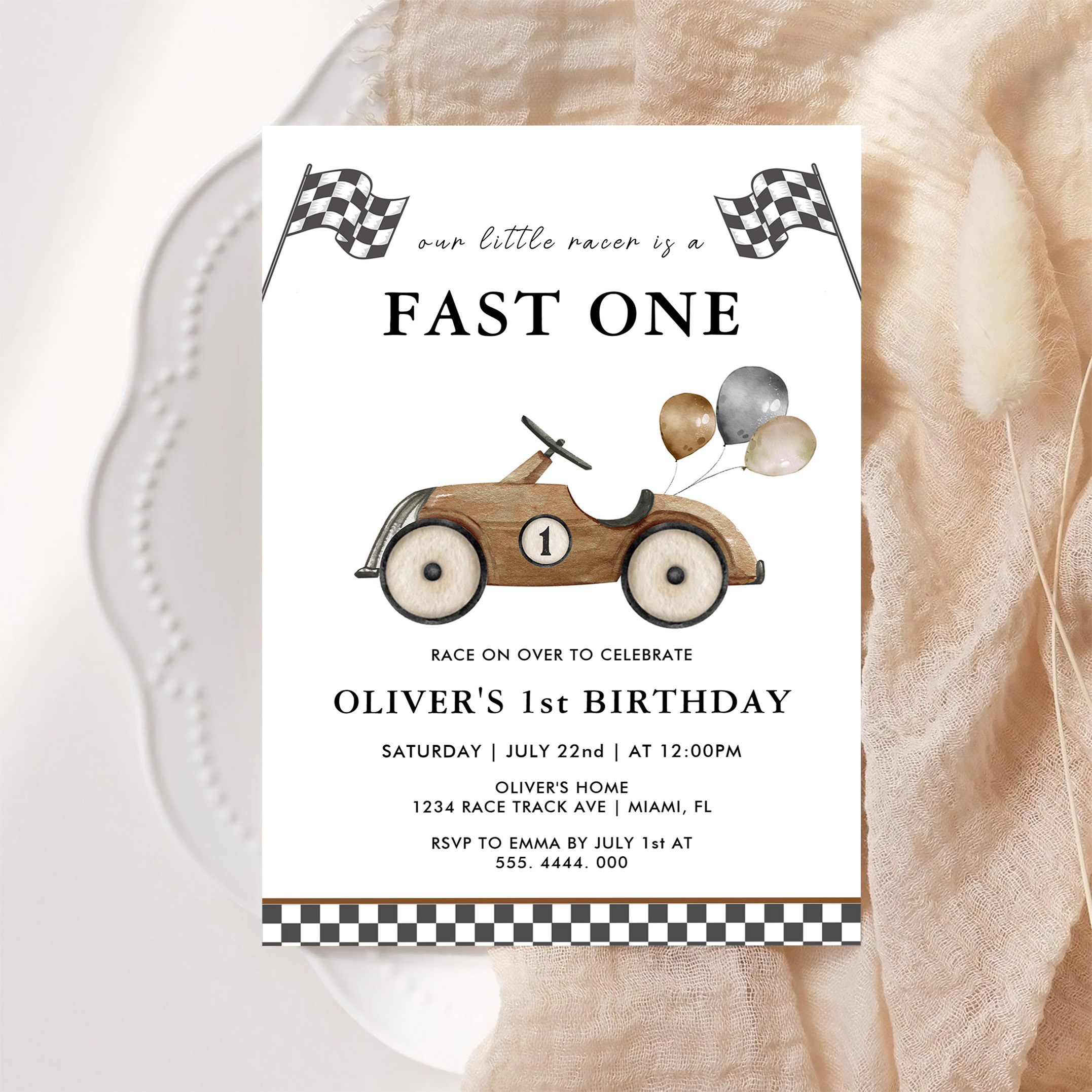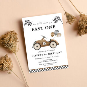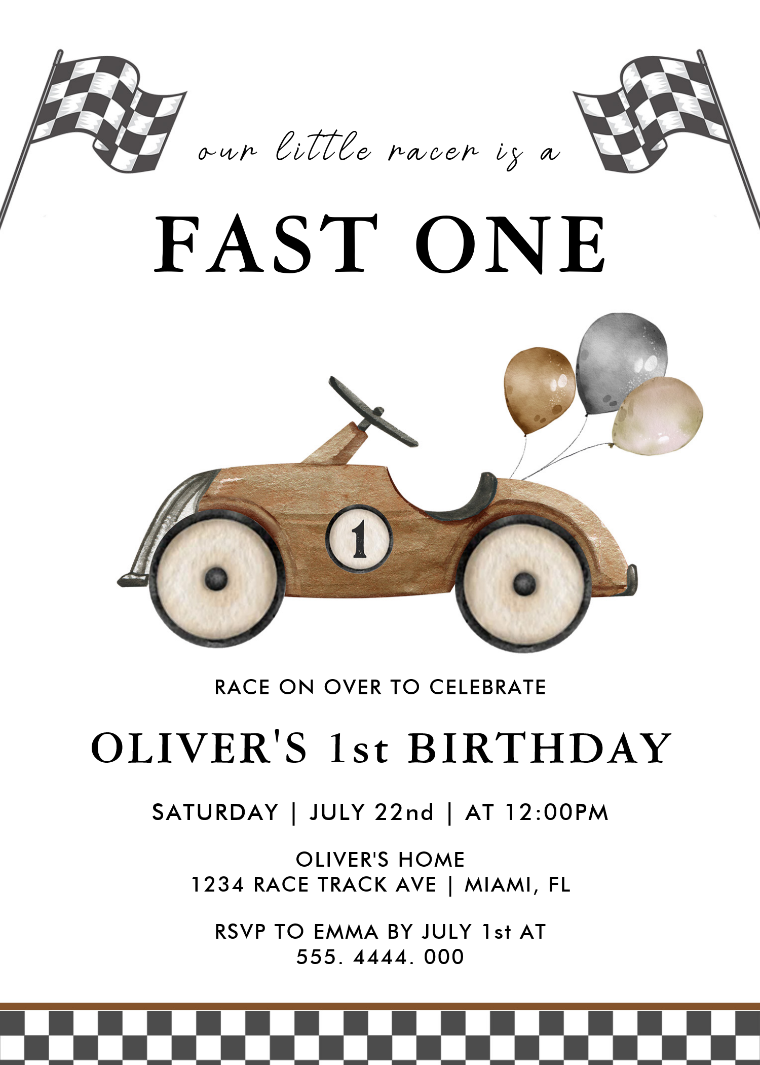 Fast One Brown Race Car Boys 1st Birthday Invitation