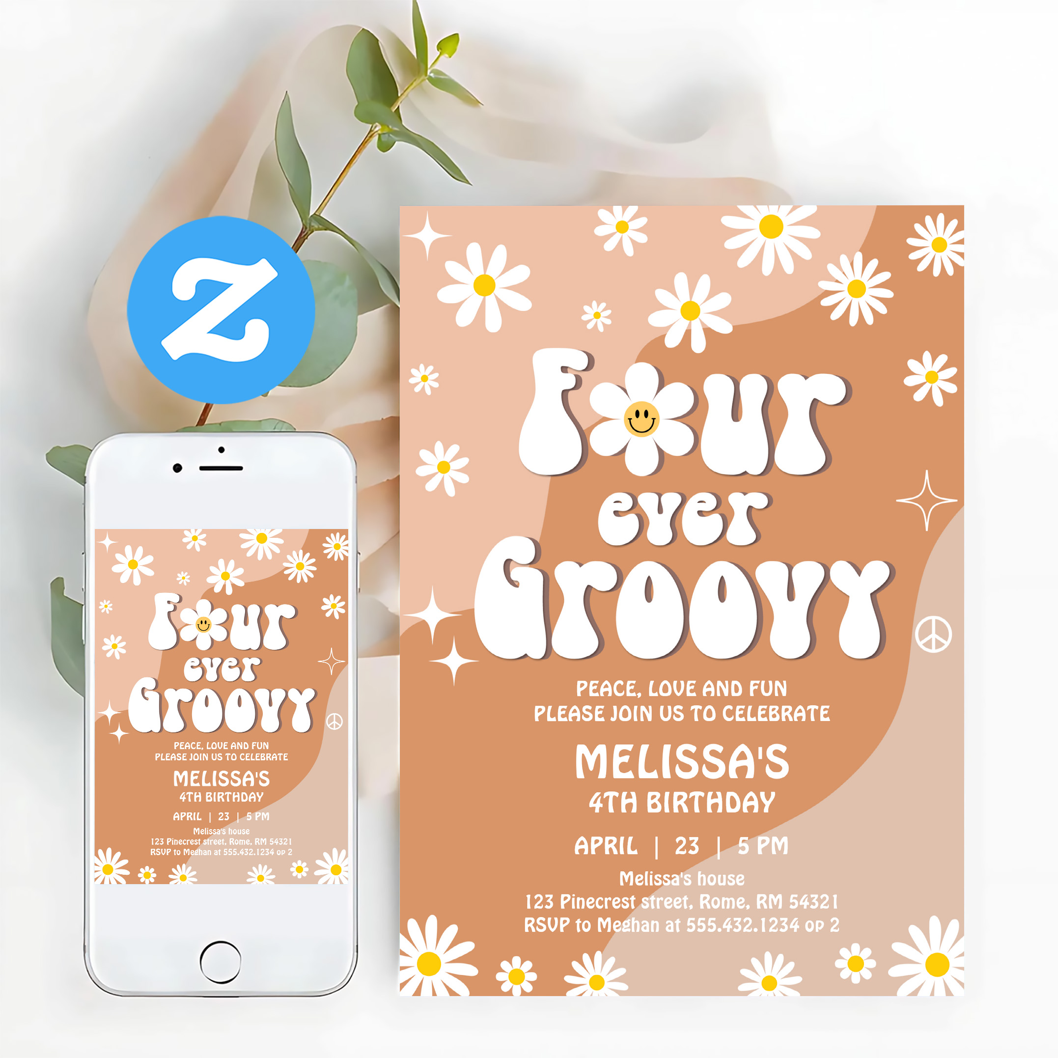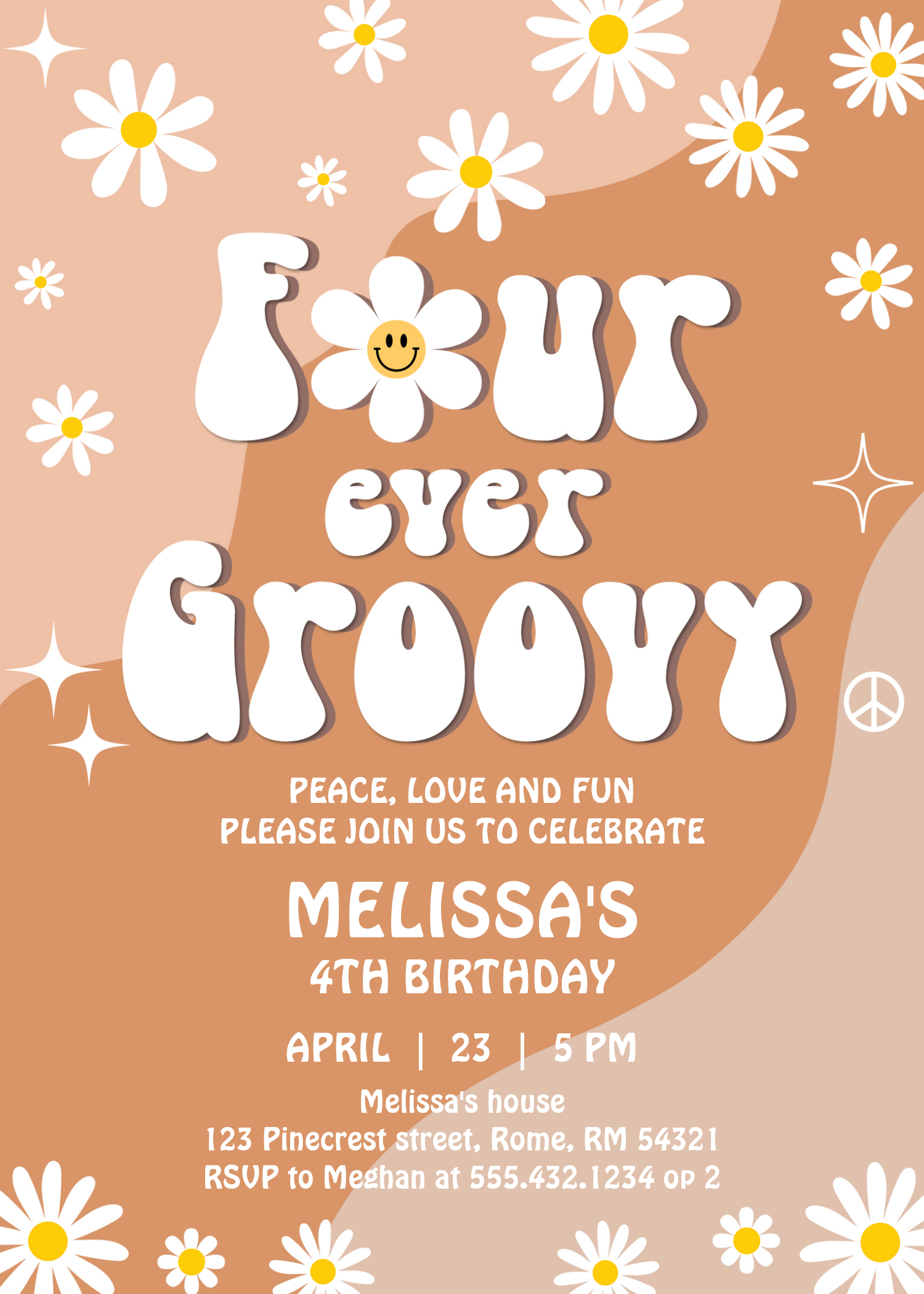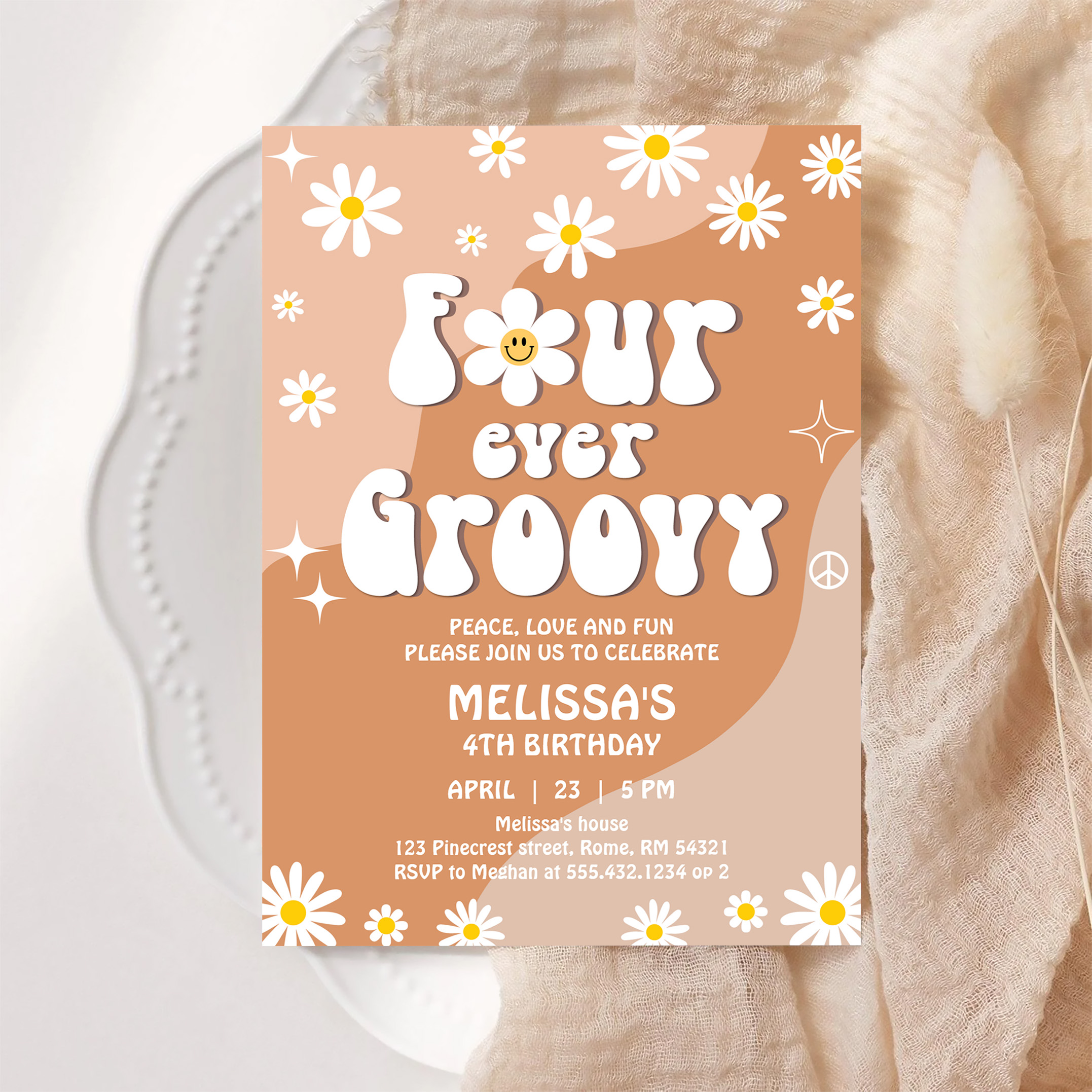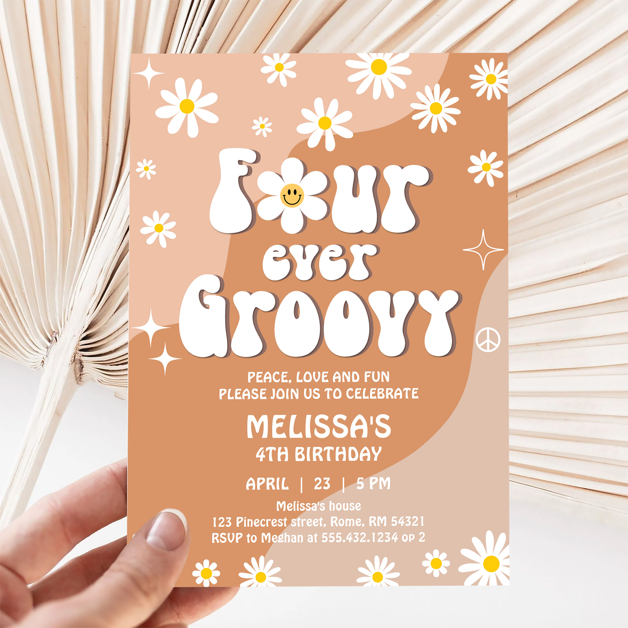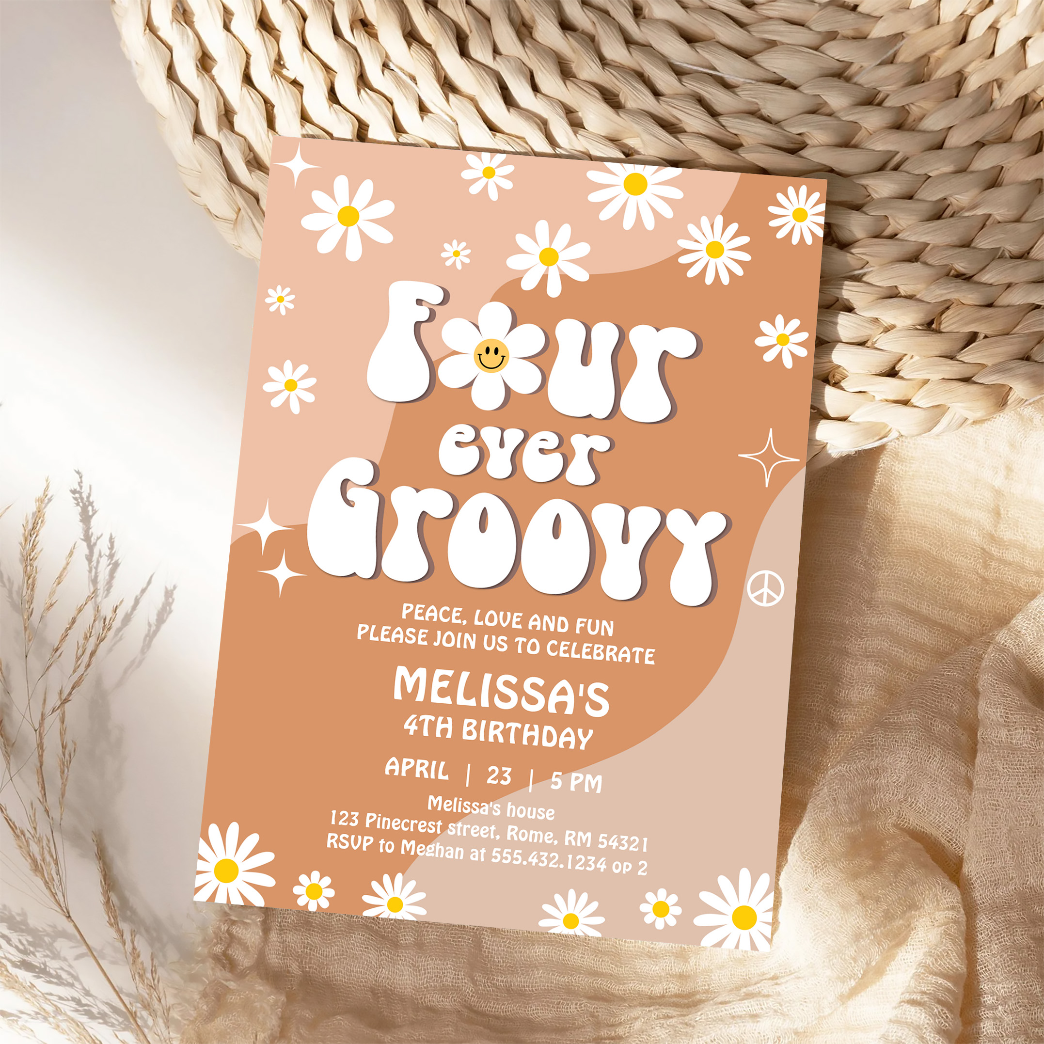 Four Ever Groovy Daisy Retro 70S 4th Birthday Invitation