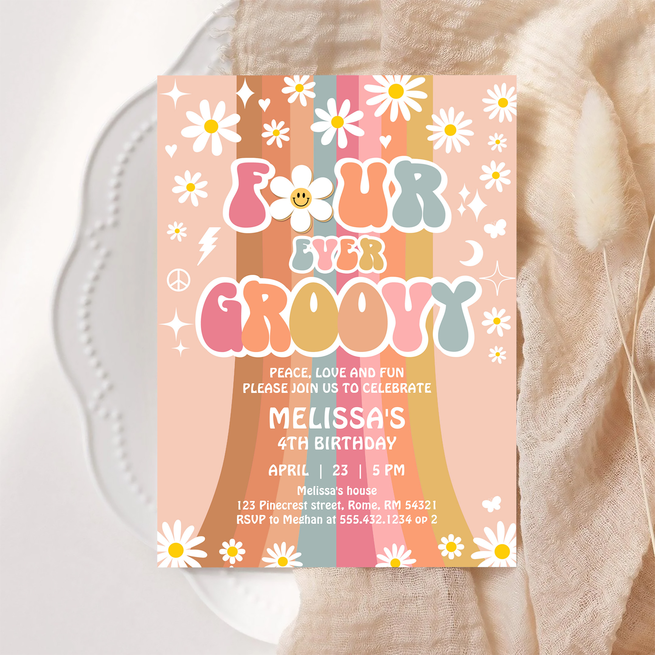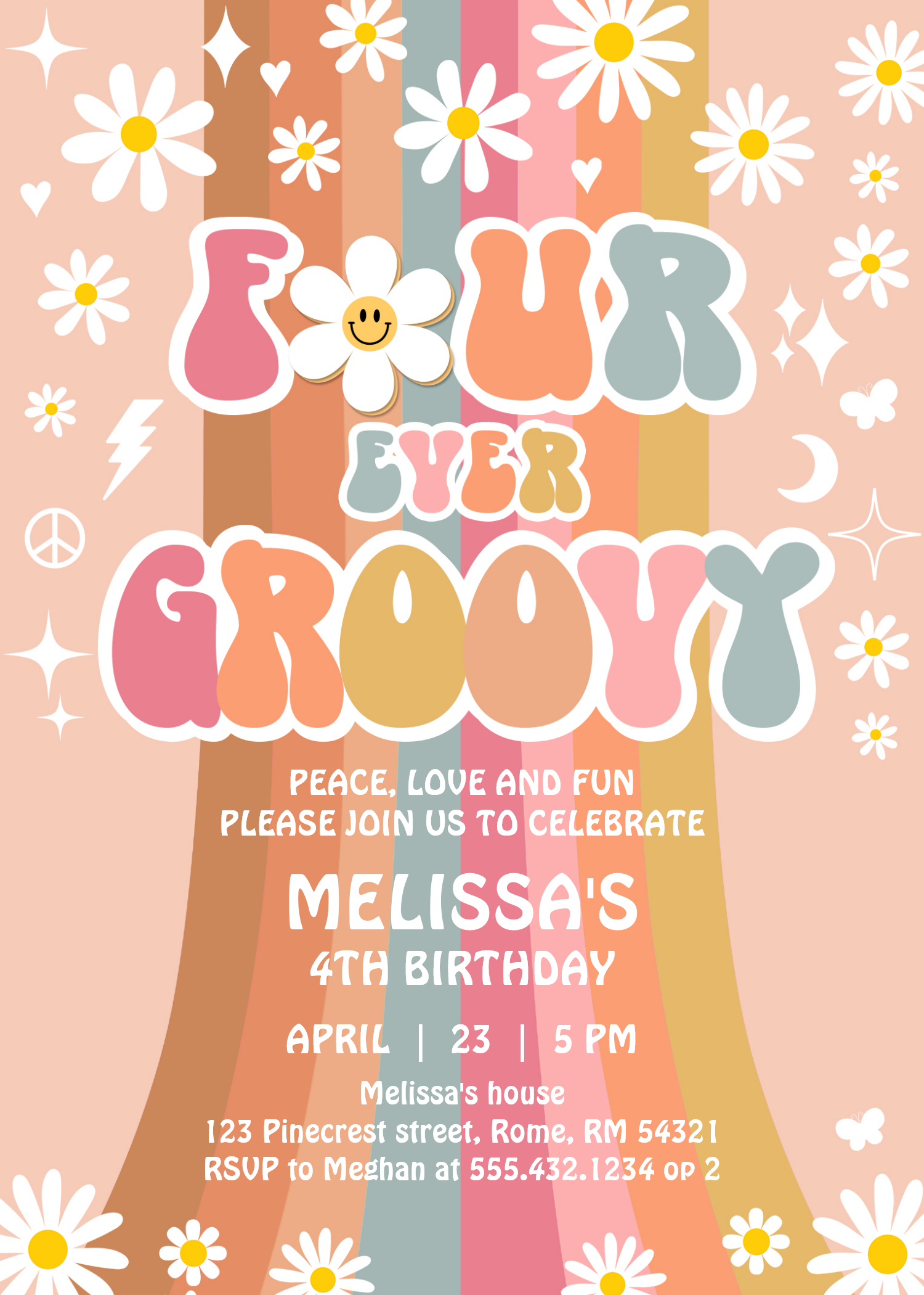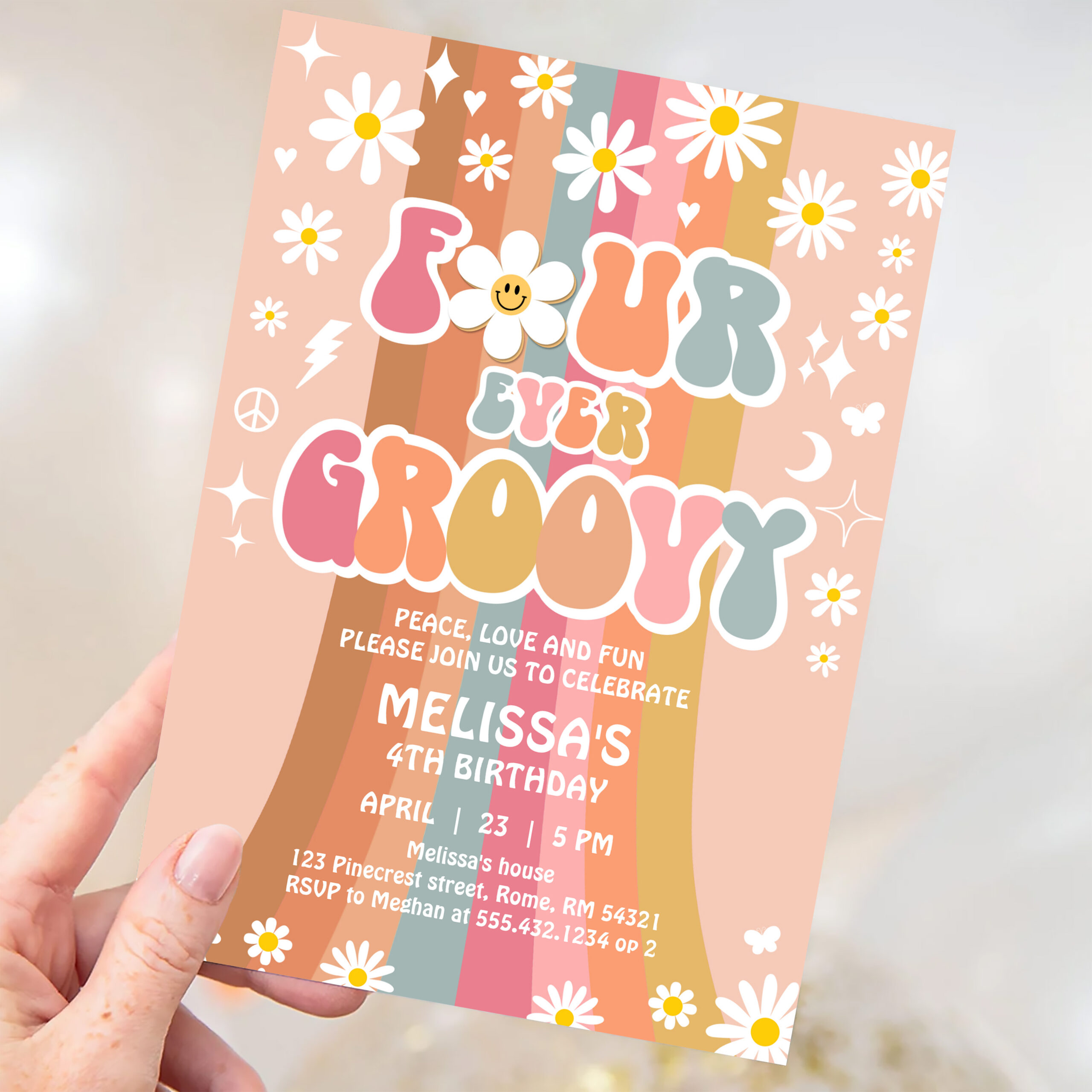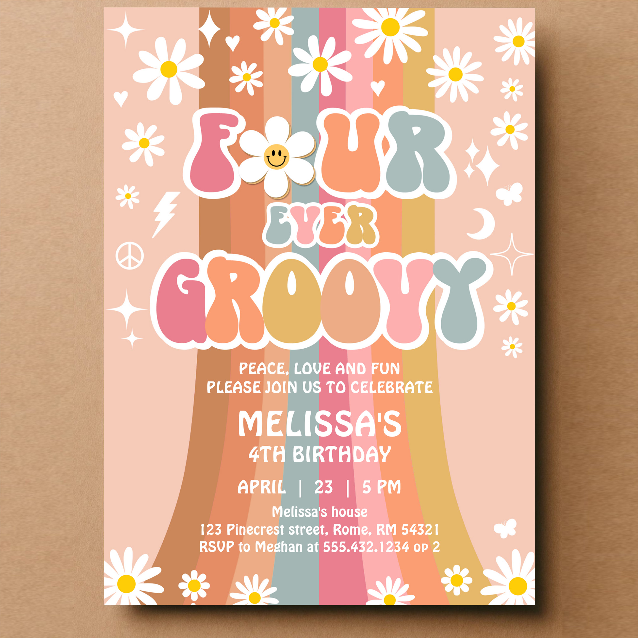 Four Ever Groovy Rainbow Groovy 4th Birthday Invitation