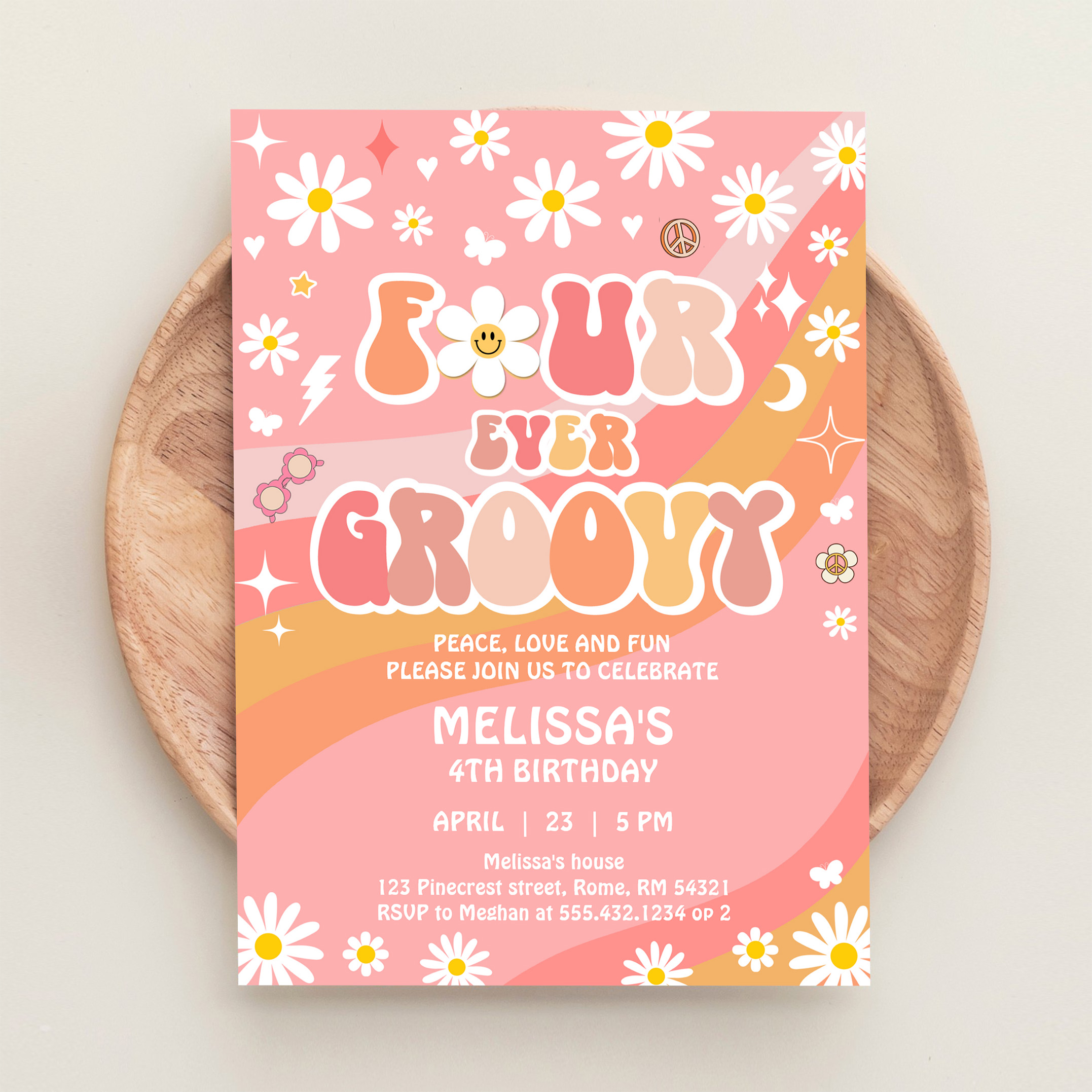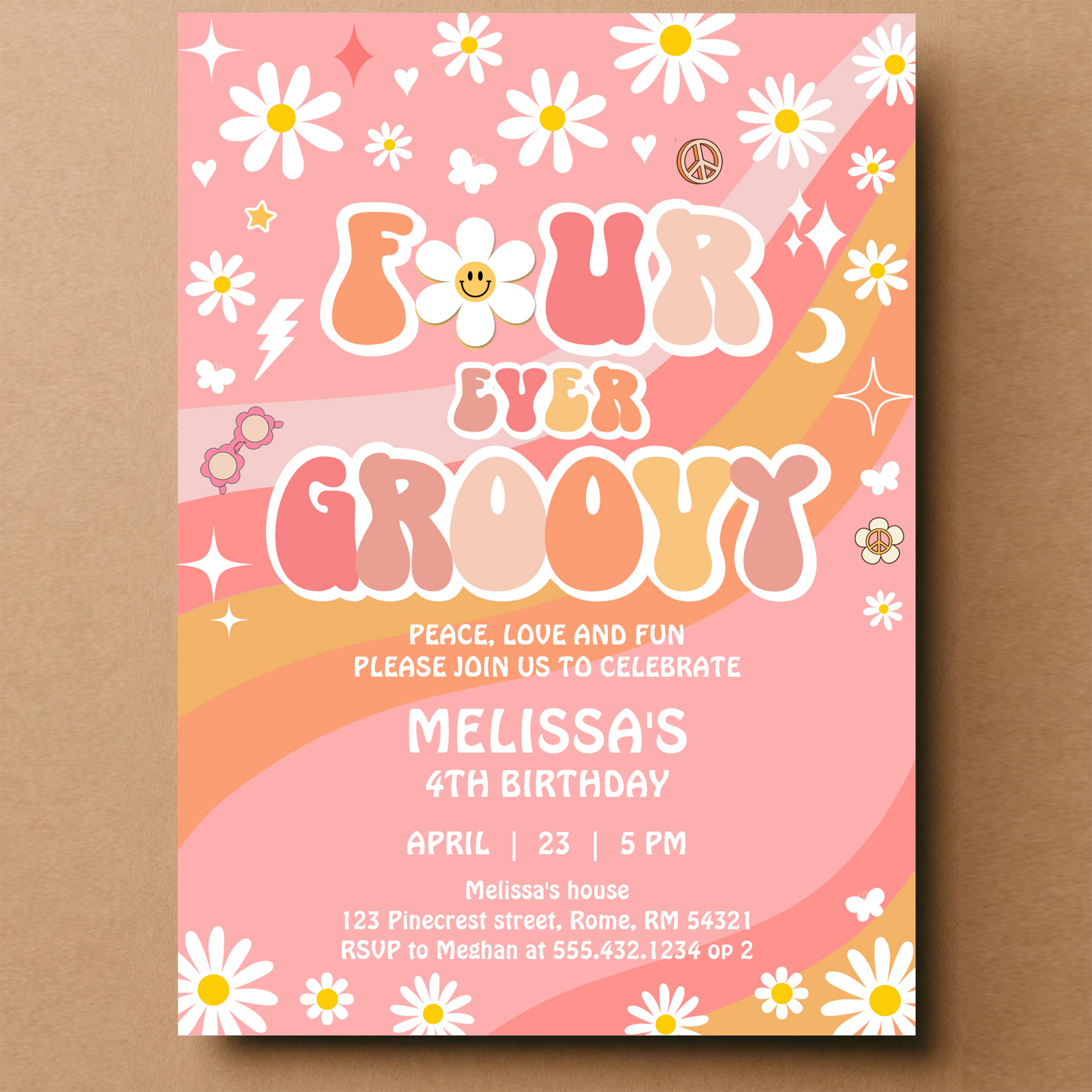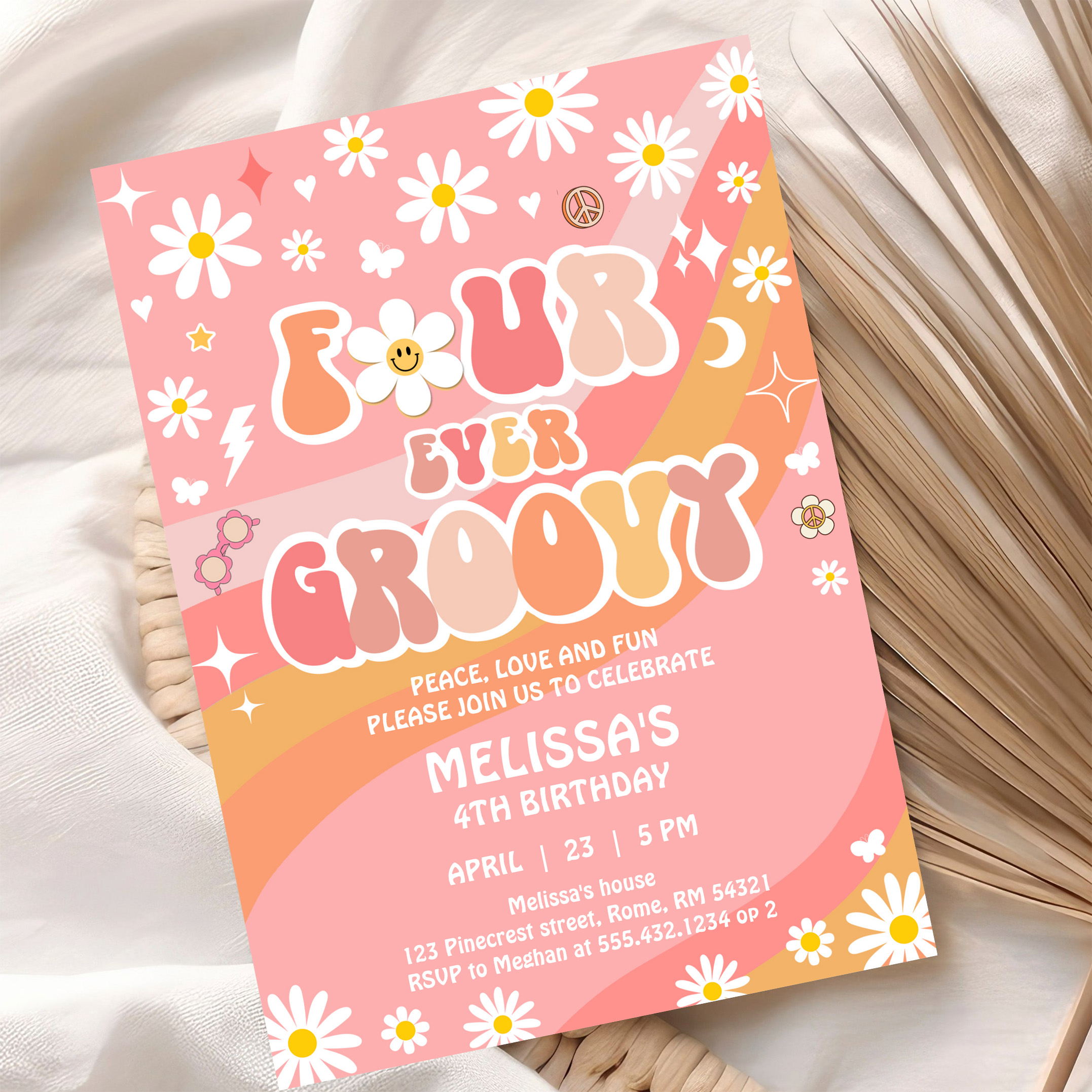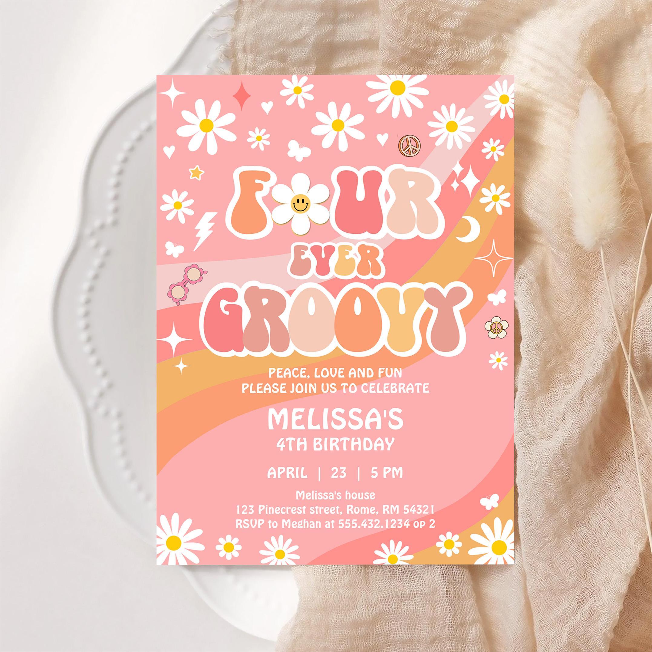 Four Ever Groovy Rainbow Hippie 70S 4th Birthday Invitation