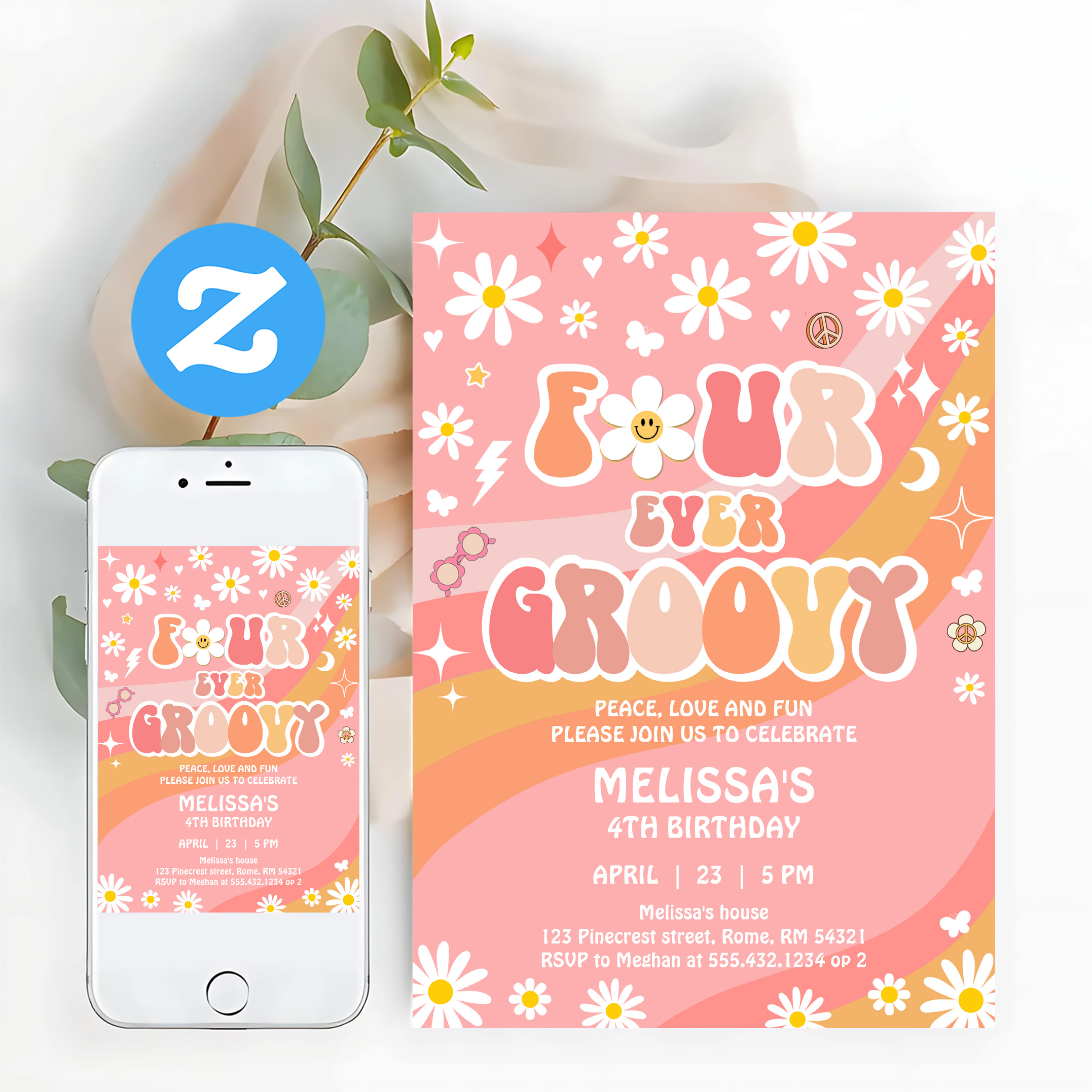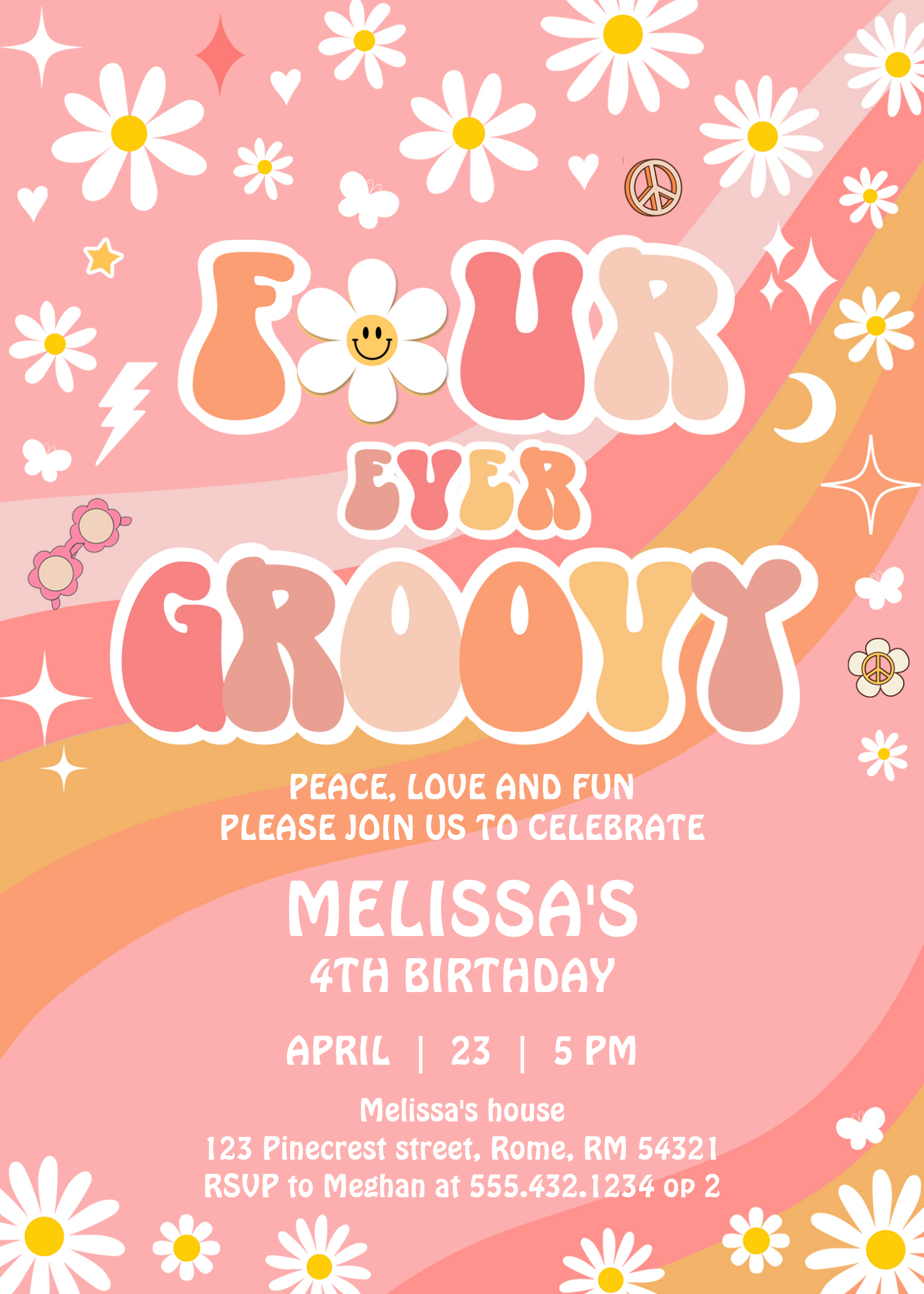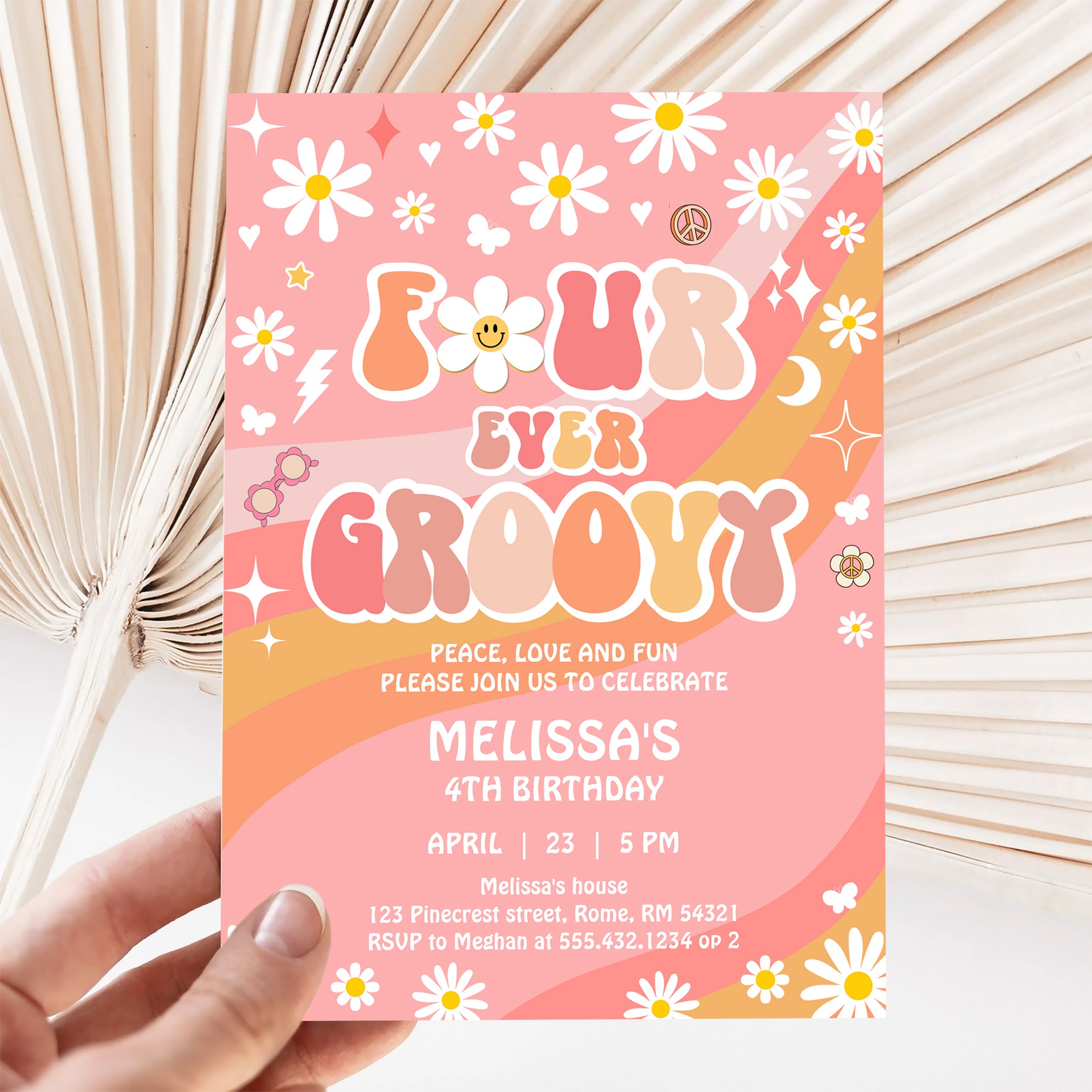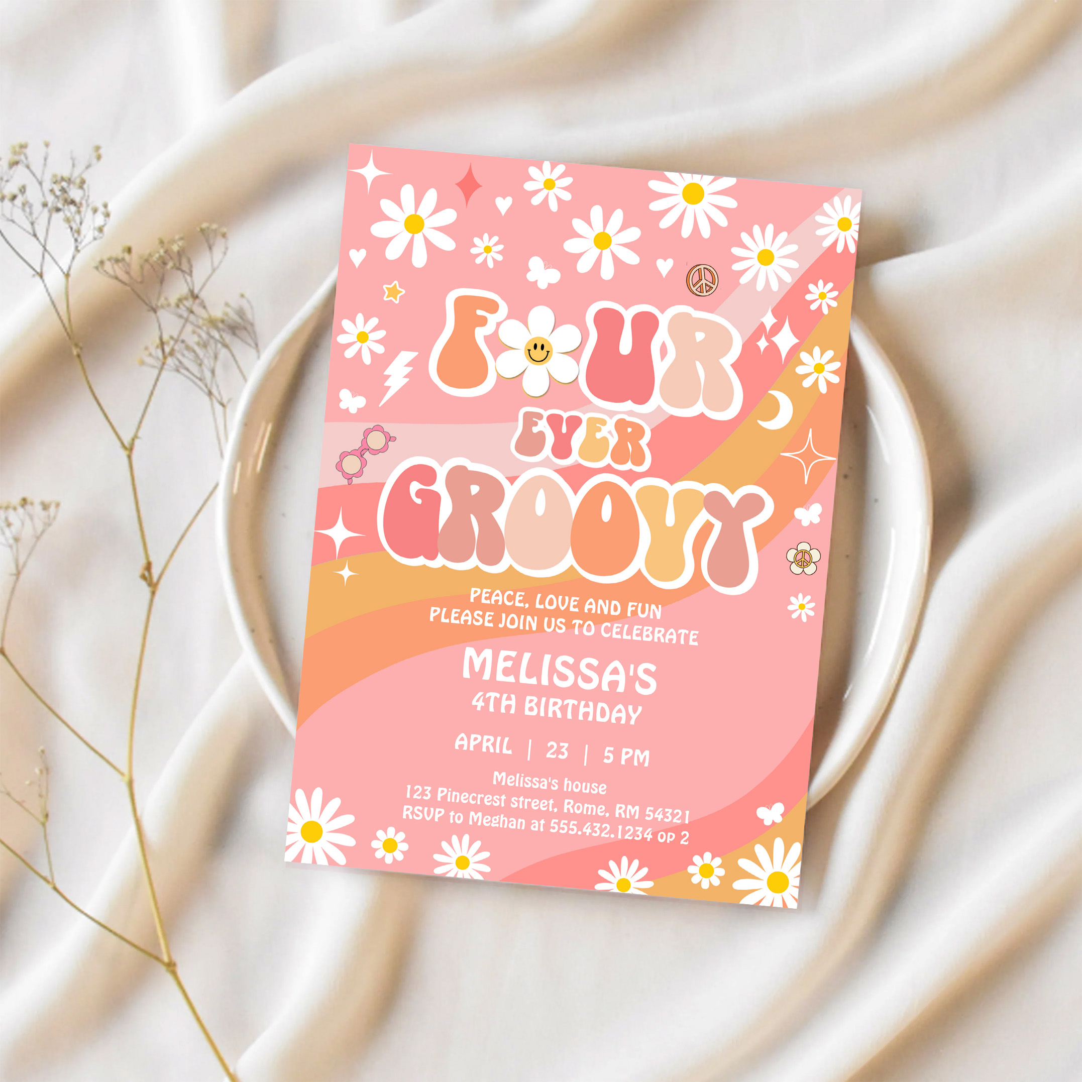 Four Ever Groovy Rainbow Hippie 70S 4th Birthday Invitation