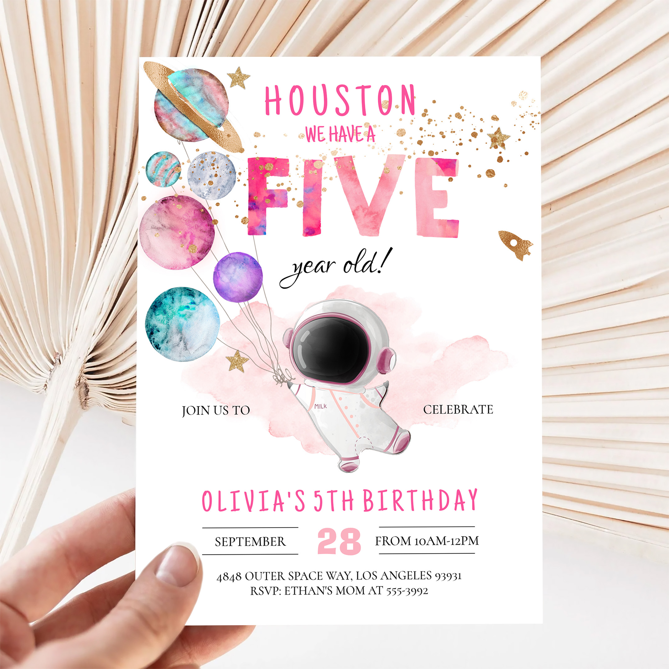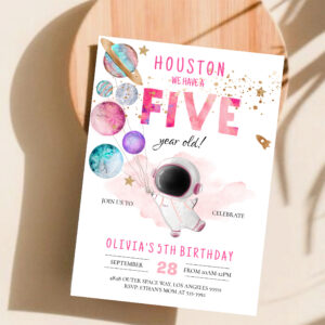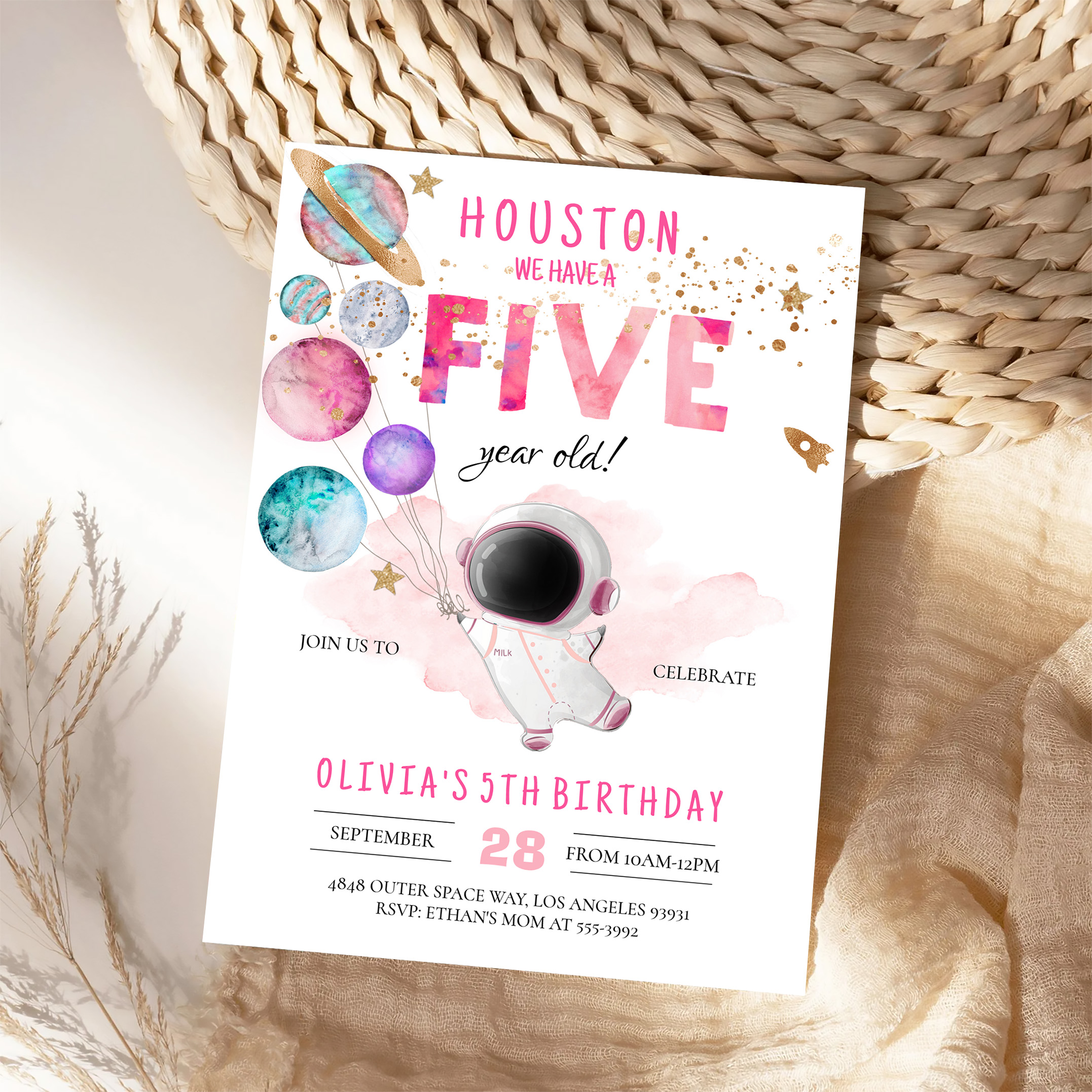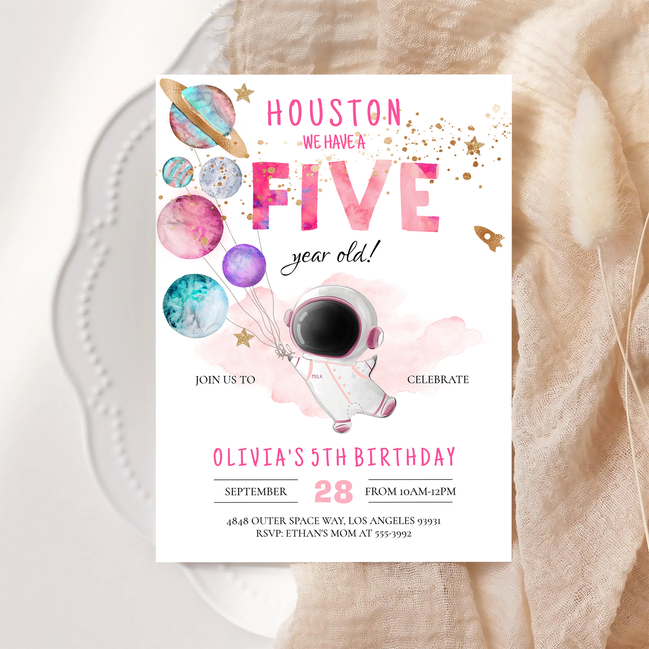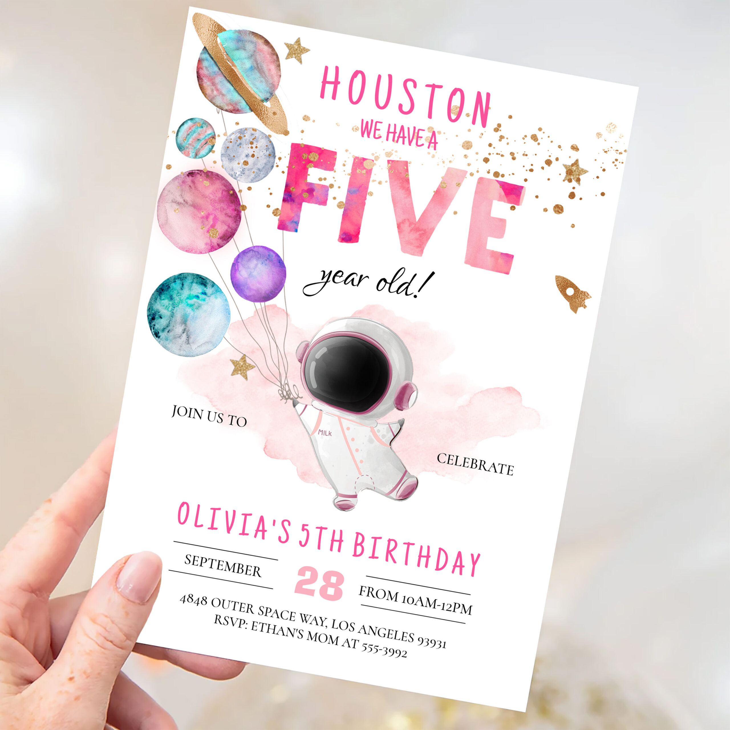 Girl Pink Astronaut Outer Space 5th Birthday Invitation