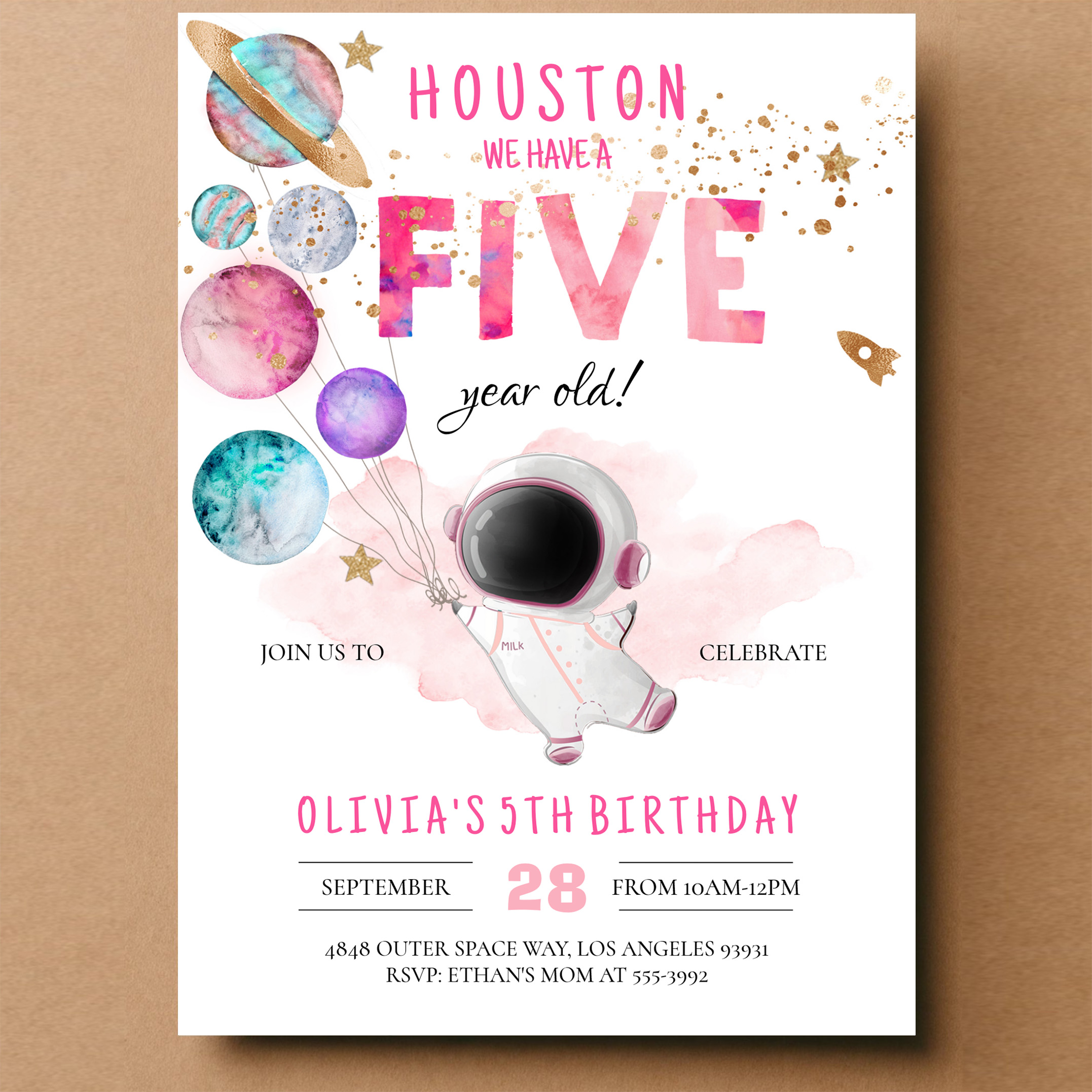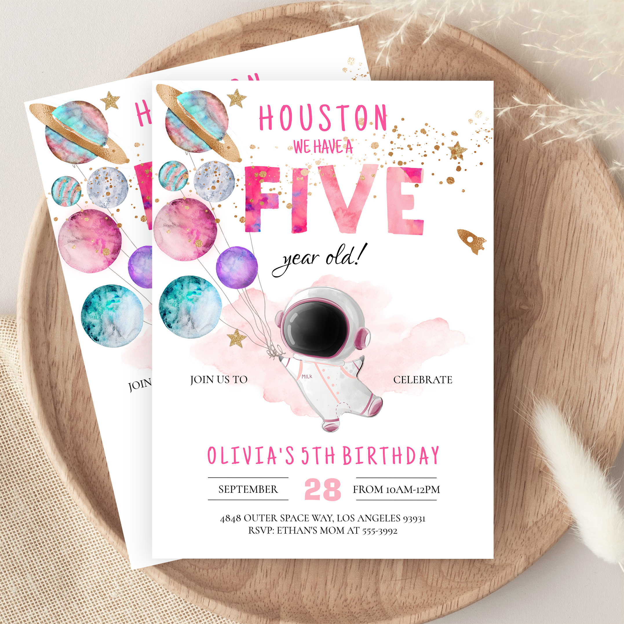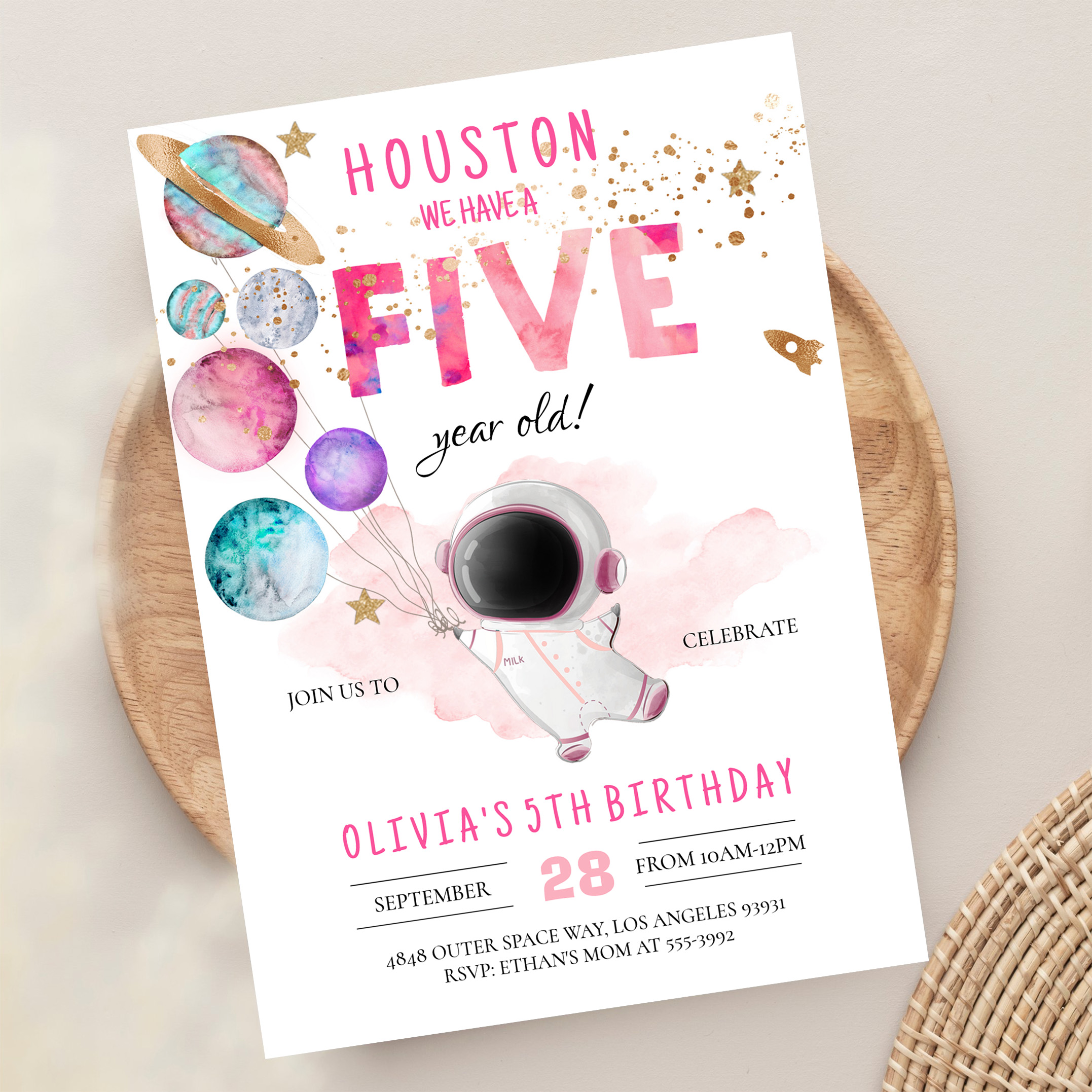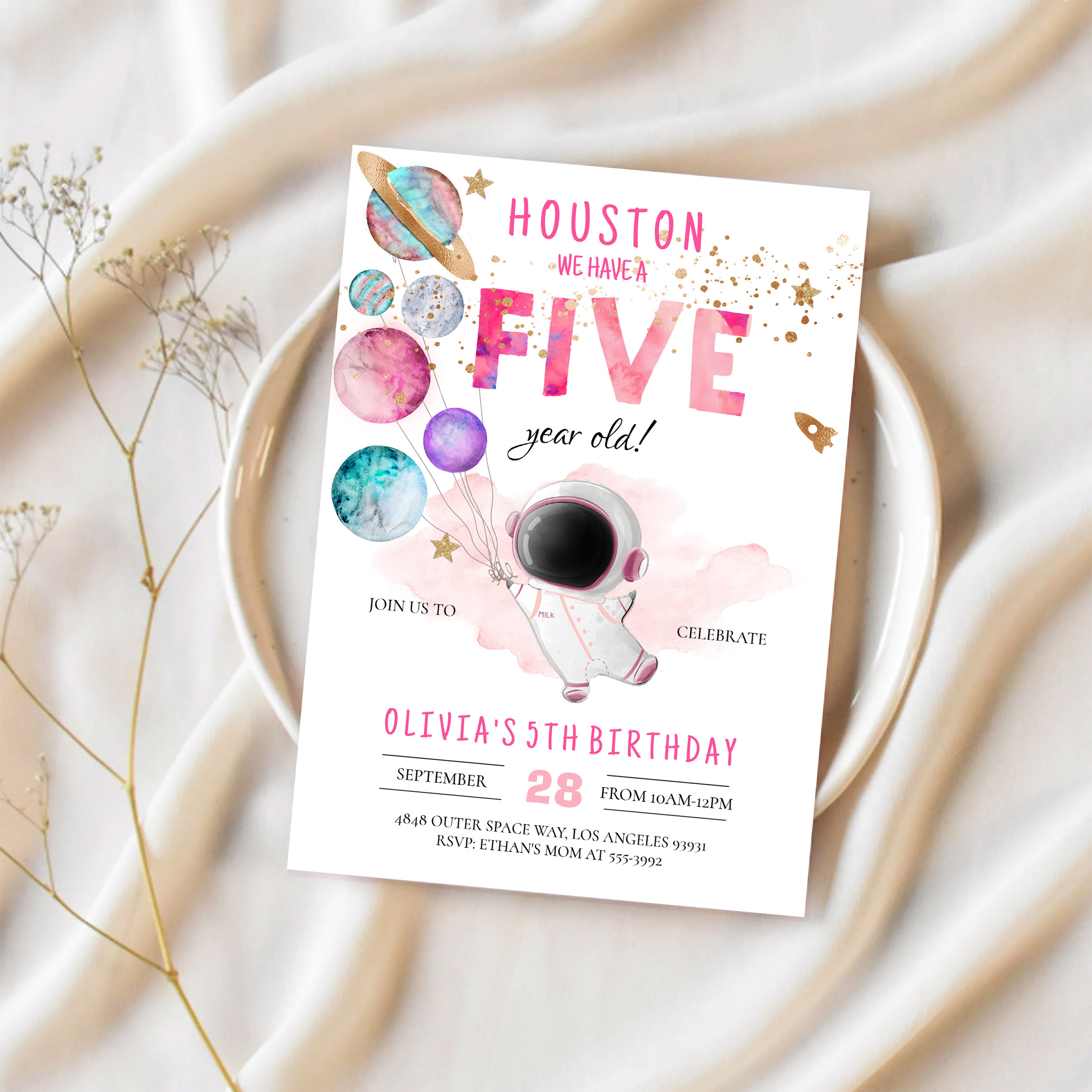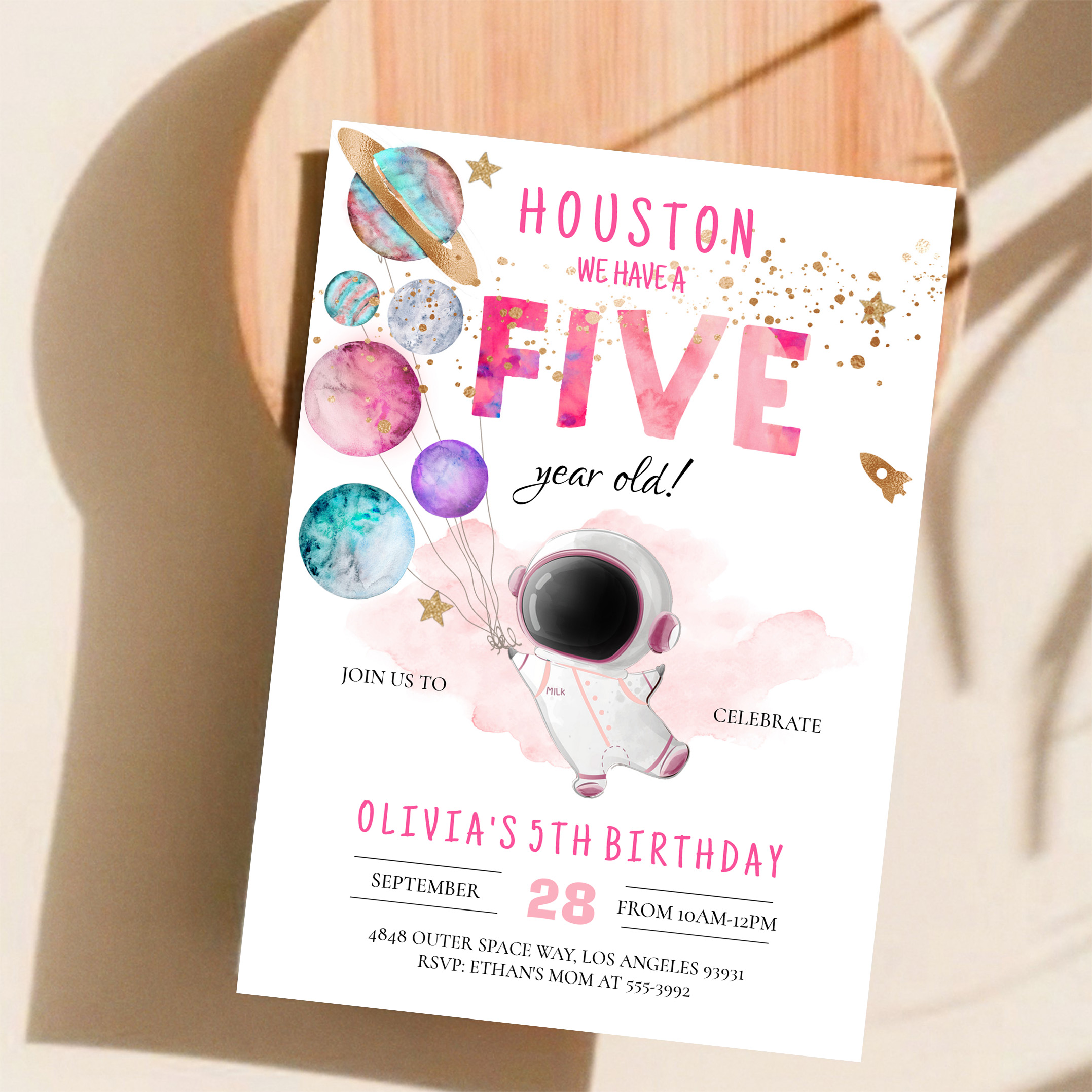 Girl Pink Astronaut Outer Space 5th Birthday Invitation