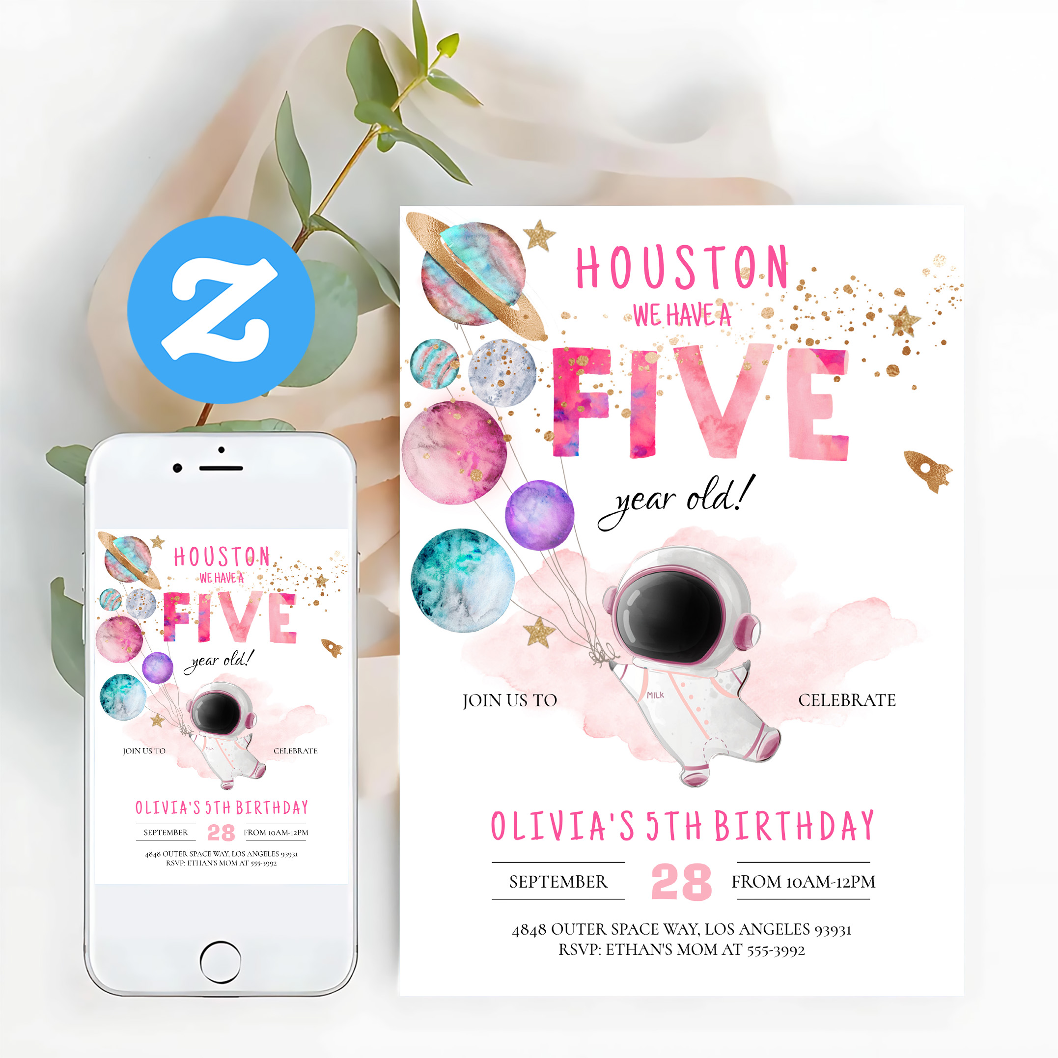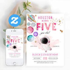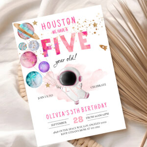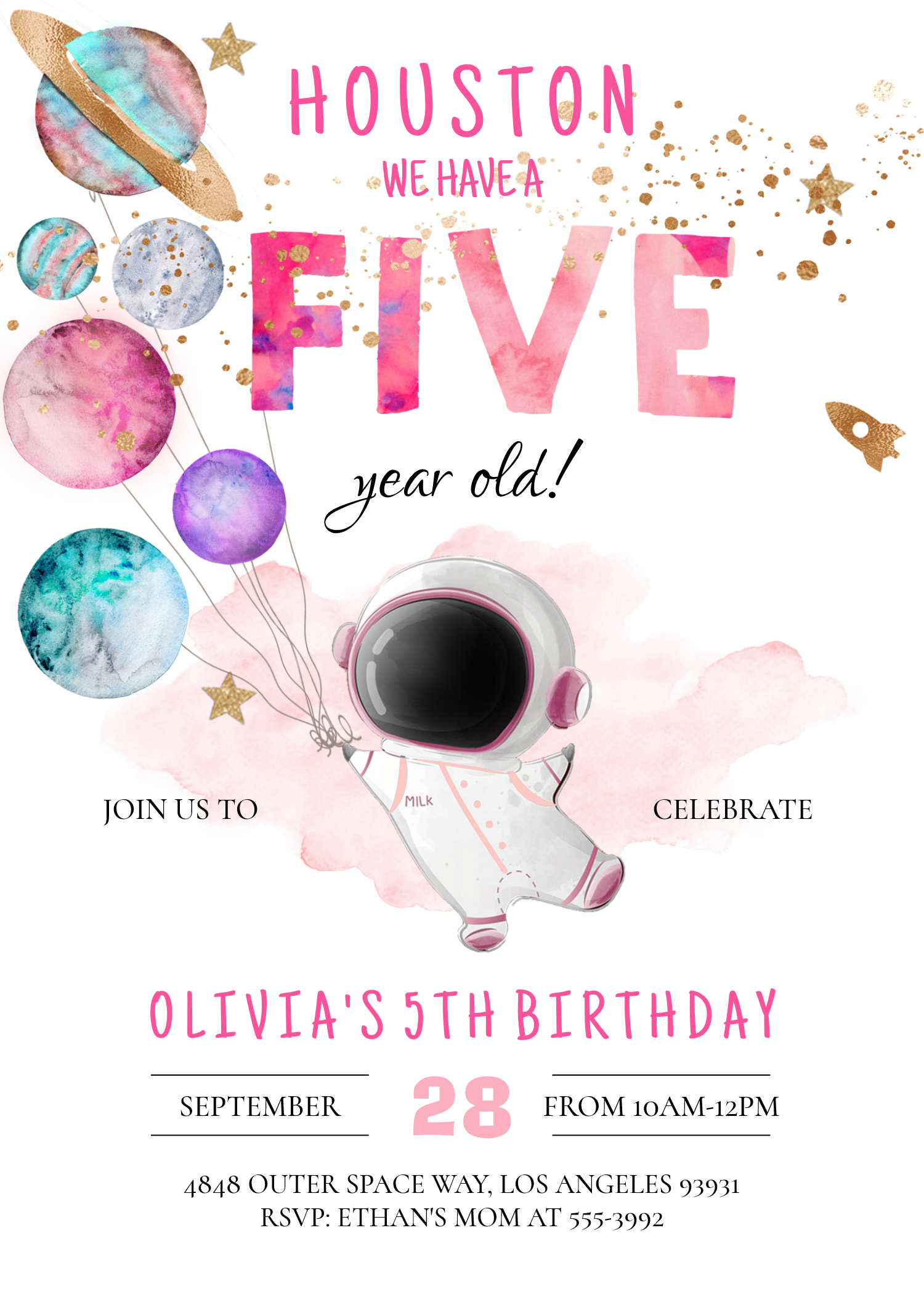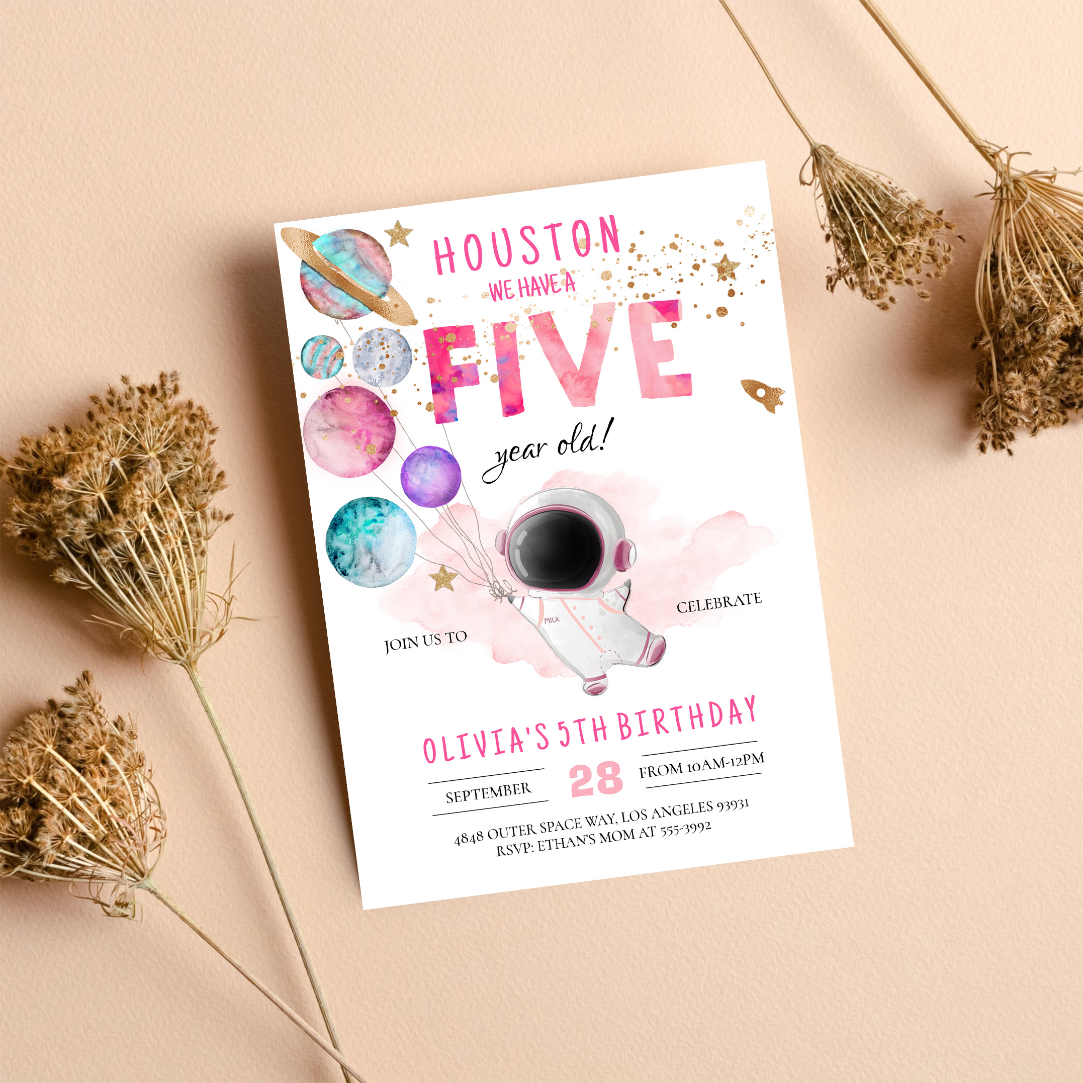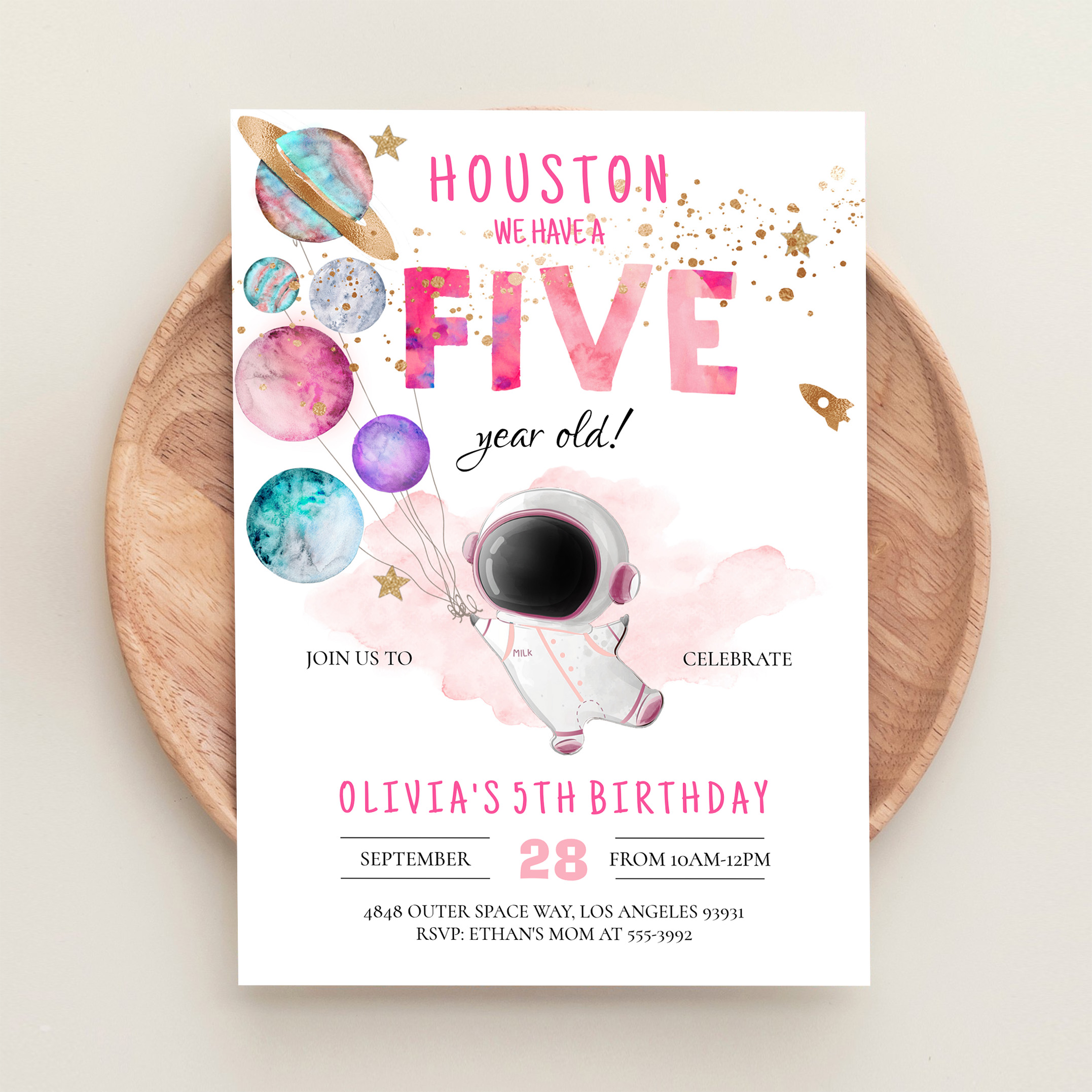 Girl Pink Astronaut Outer Space 5th Birthday Invitation