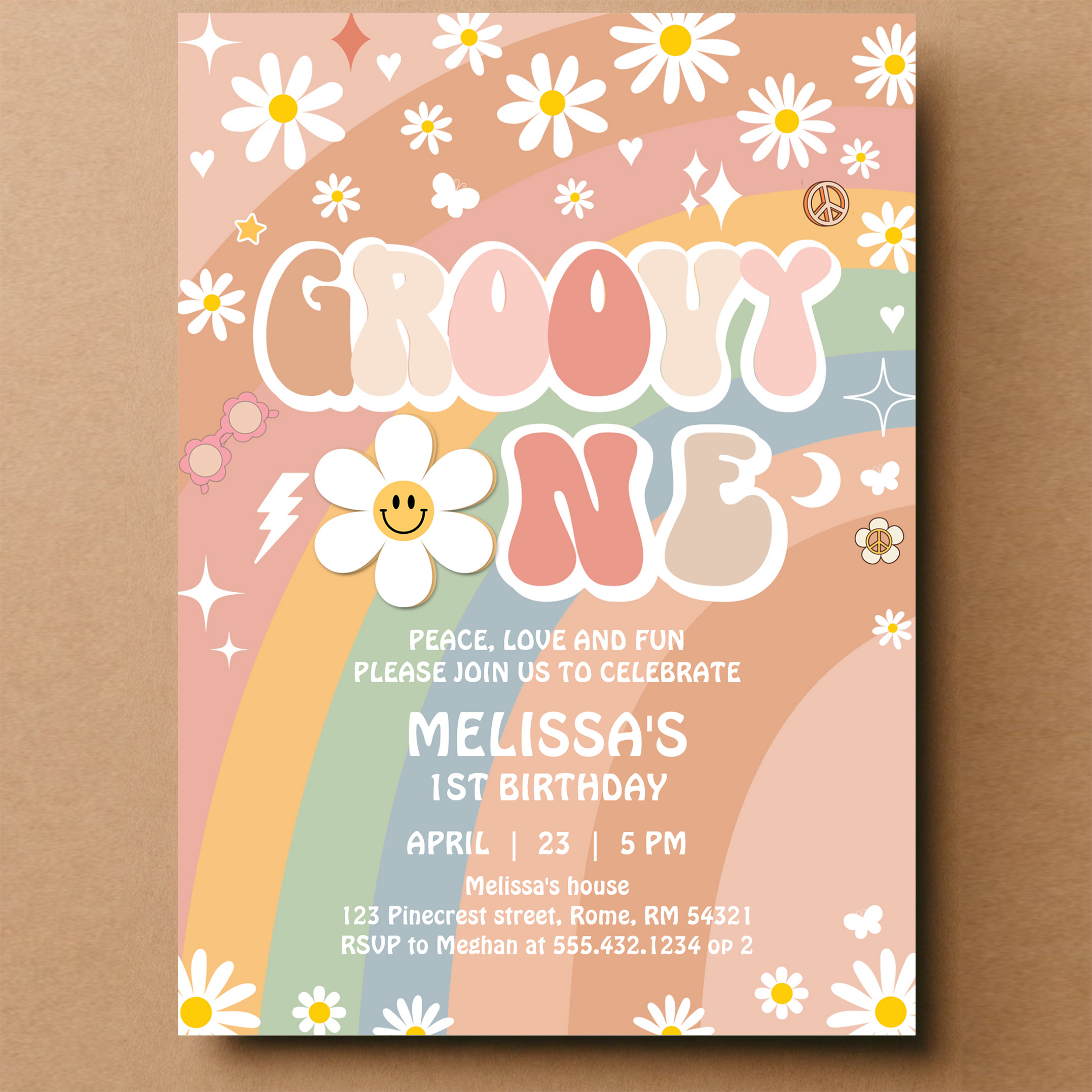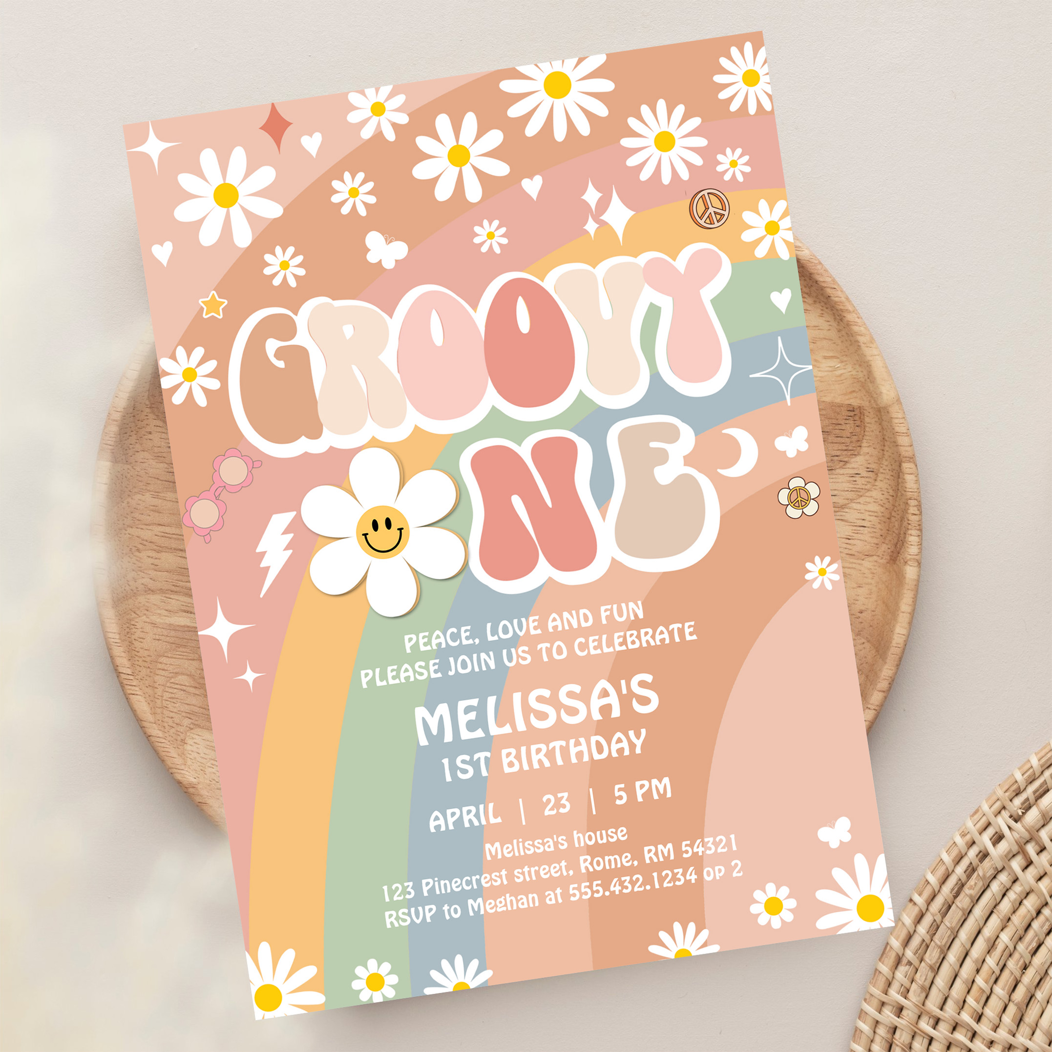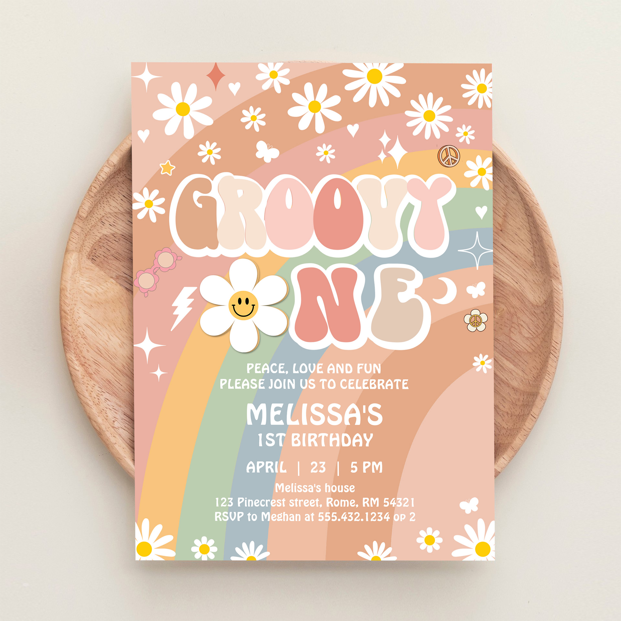 Groovy One Daisy Groovy Rainbow 1st Birthday Invitation