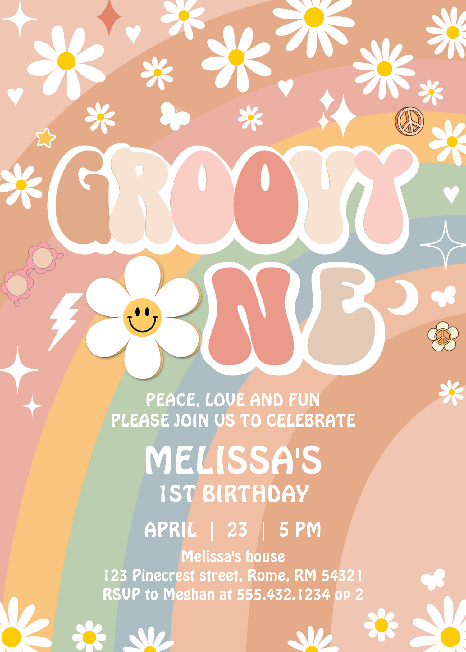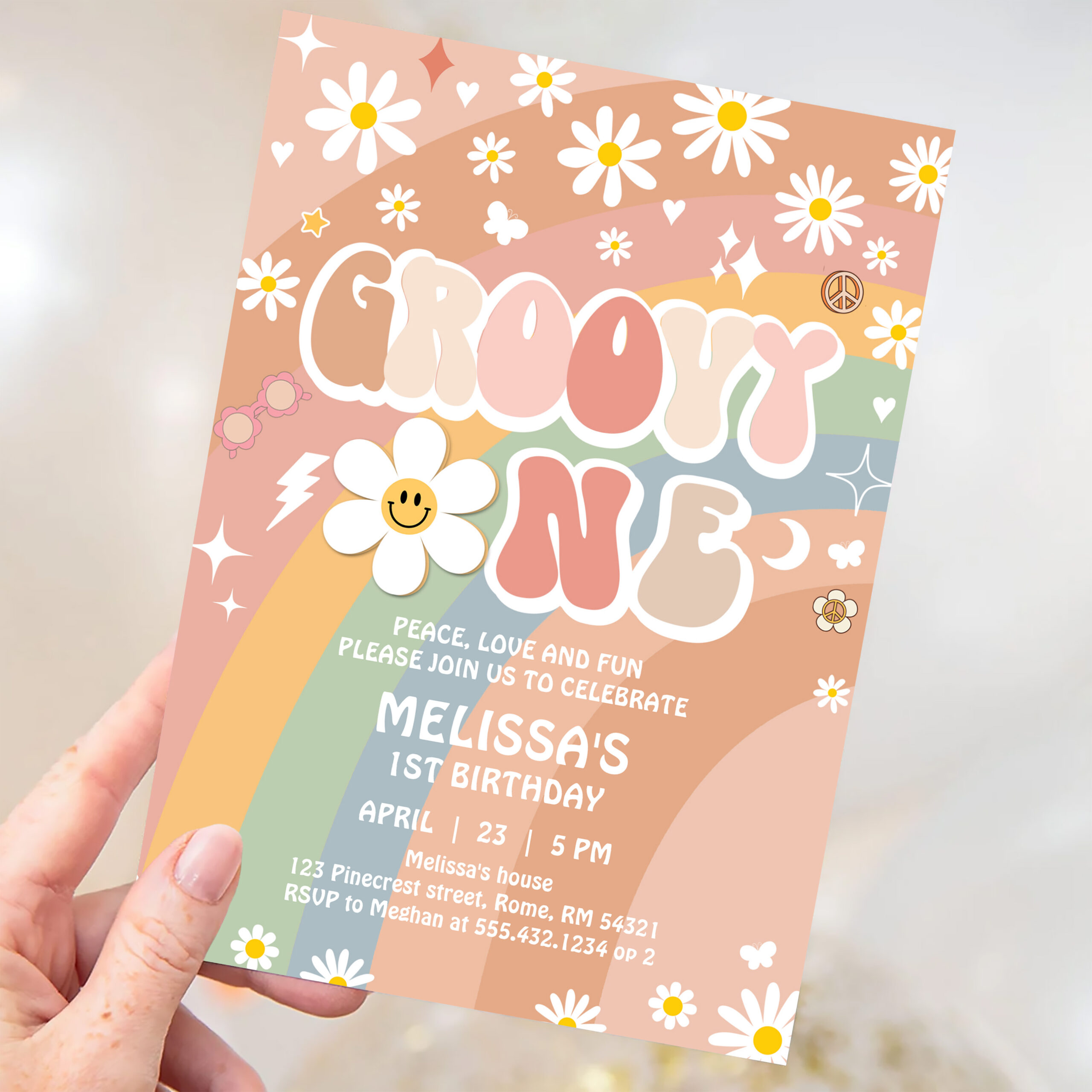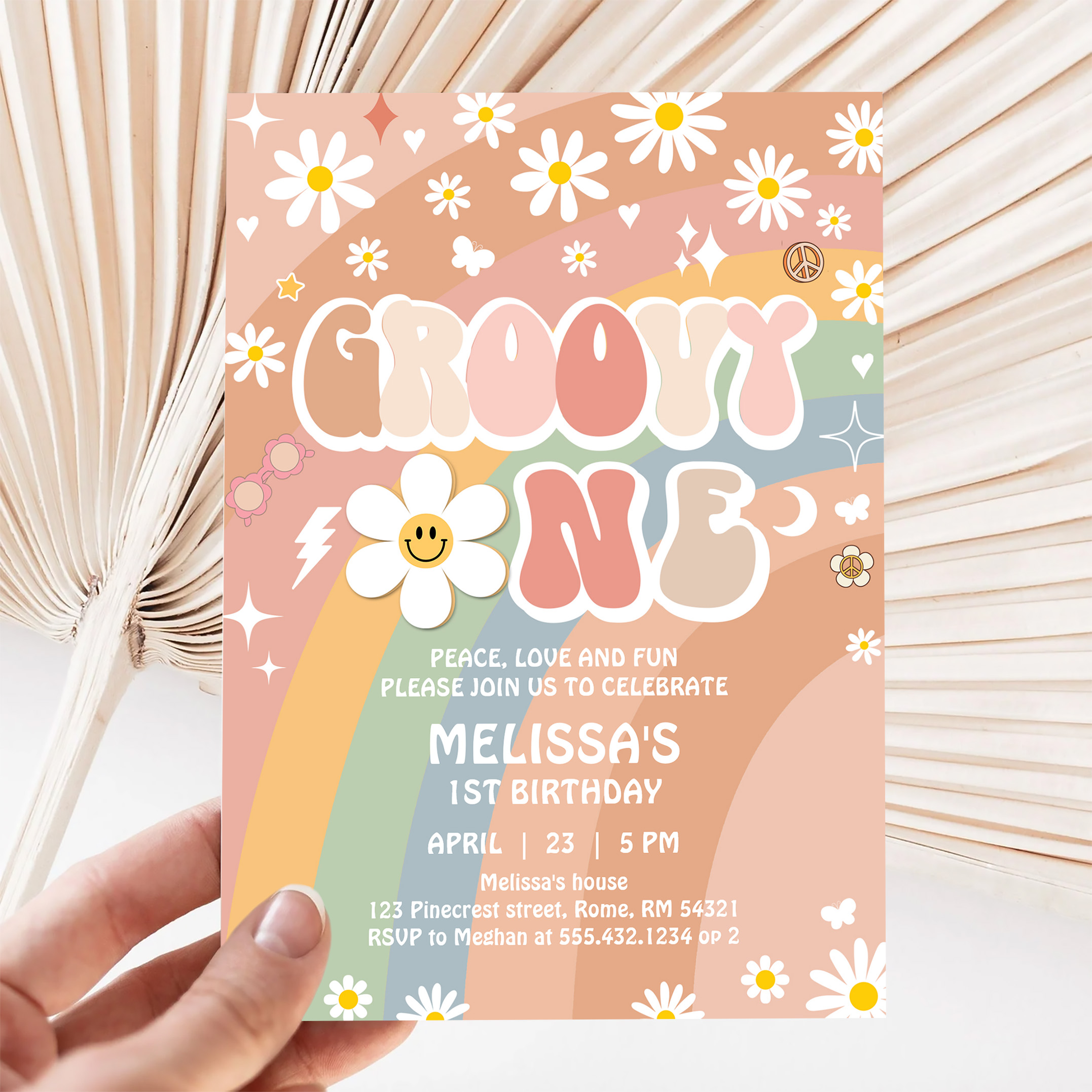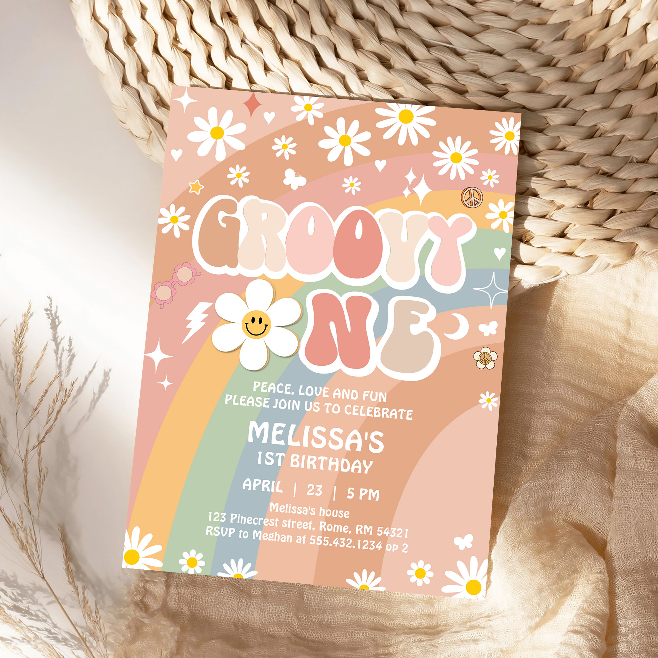 Groovy One Daisy Groovy Rainbow 1st Birthday Invitation