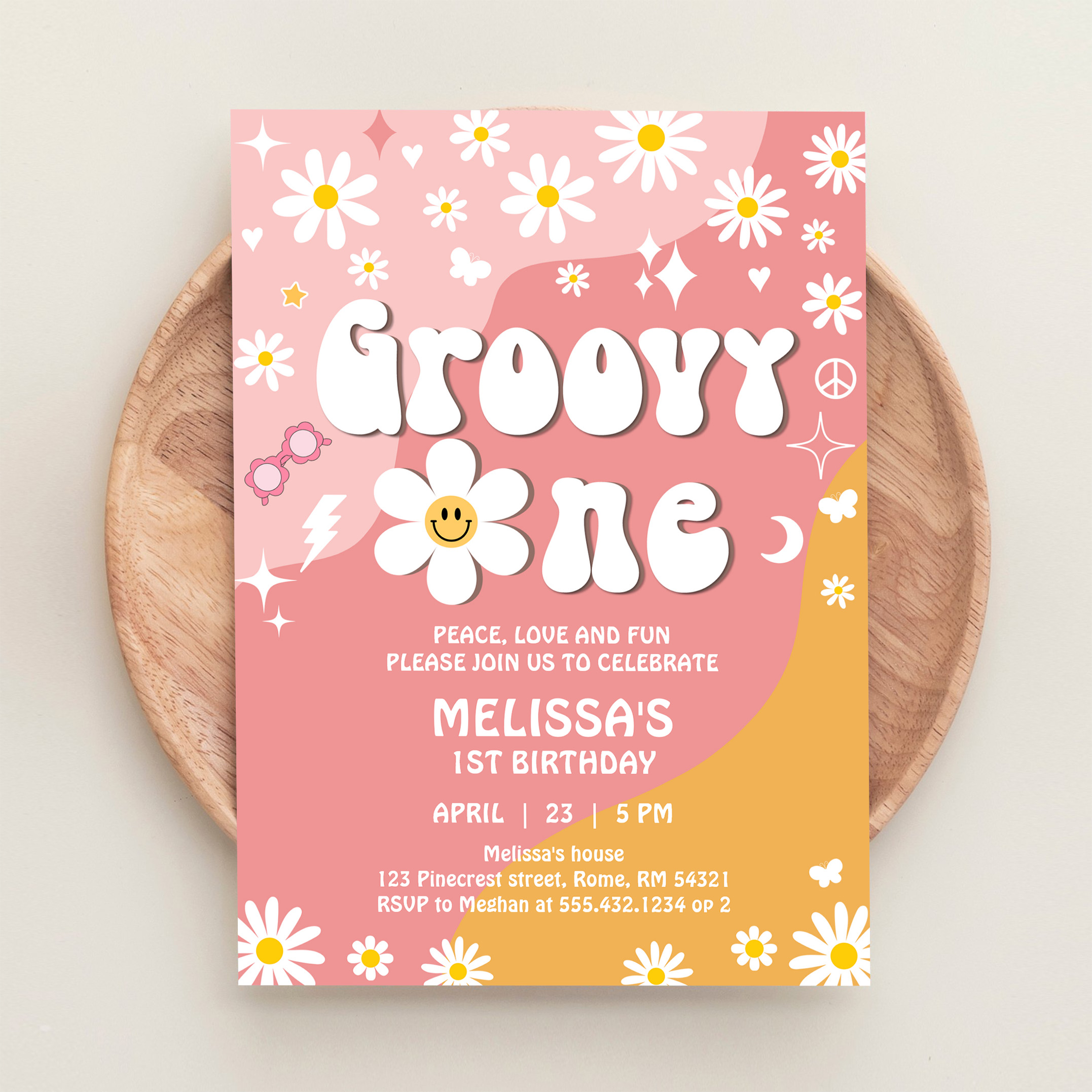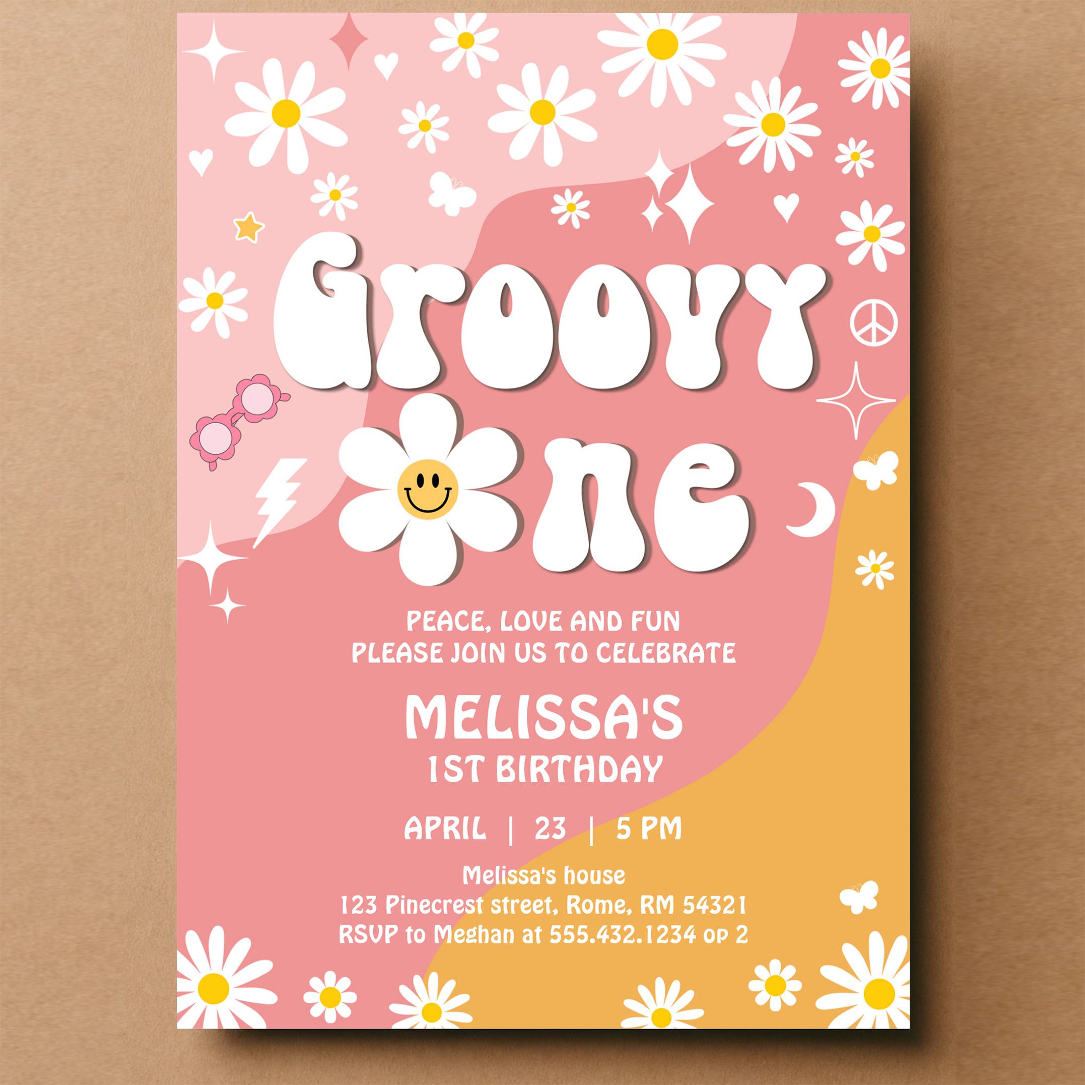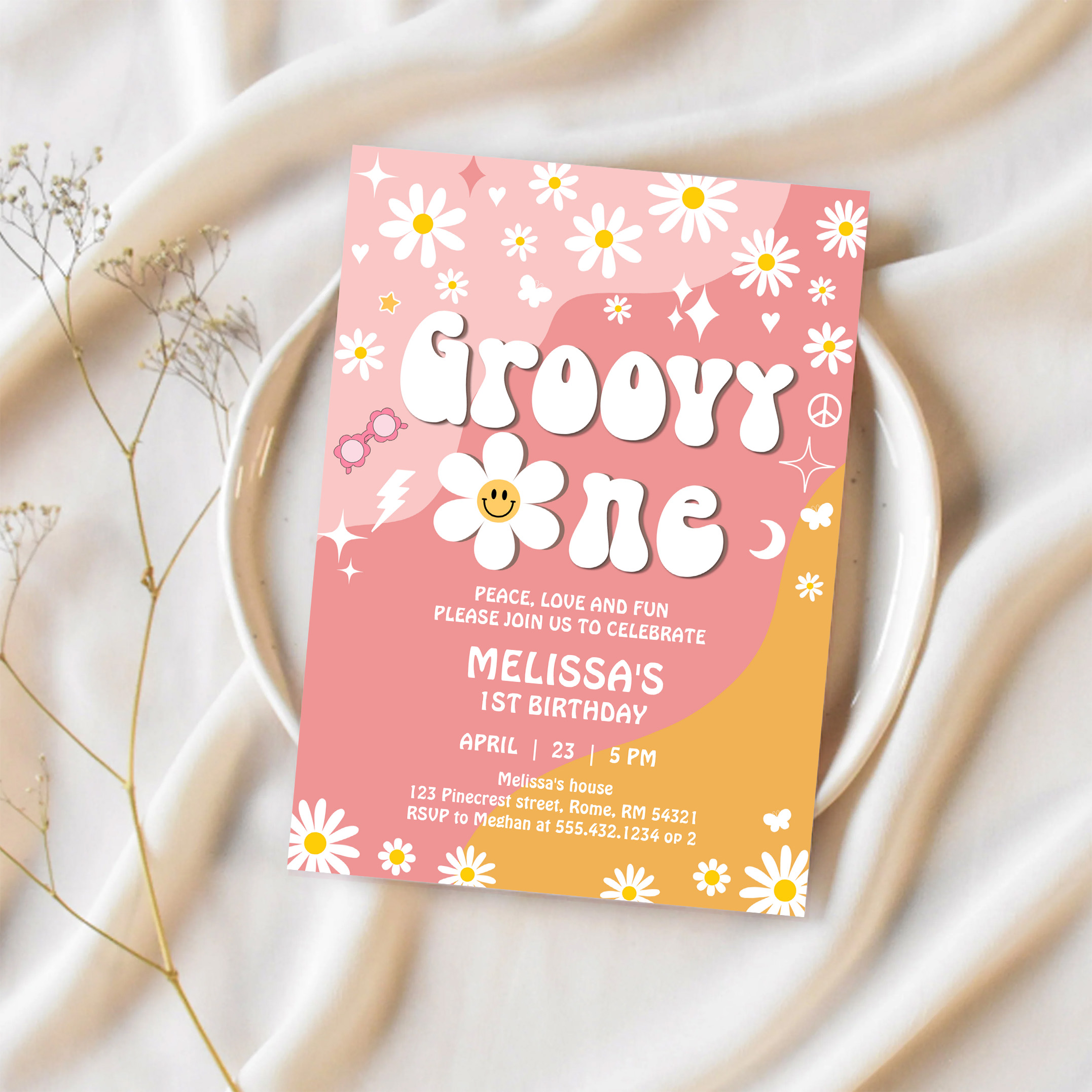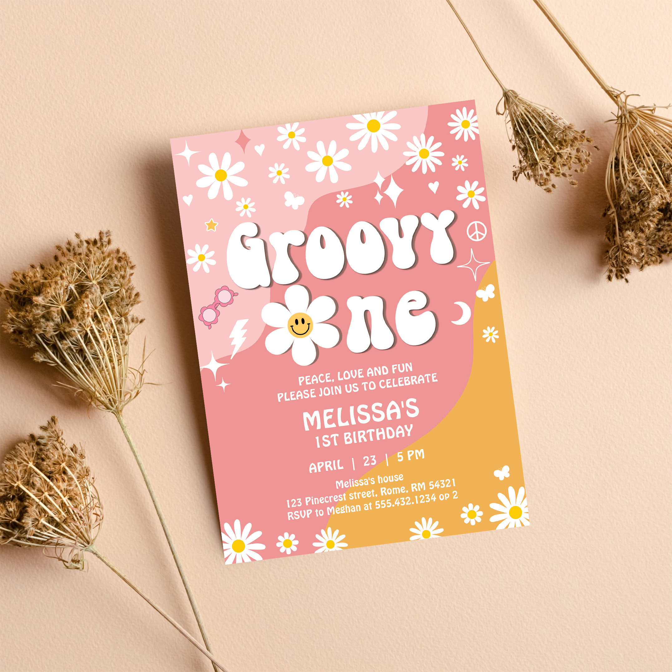 Groovy One Pink Yellow Daisy Groovy 1st Birthday Invitation