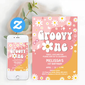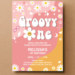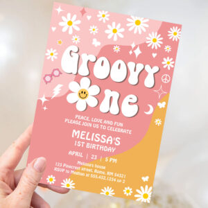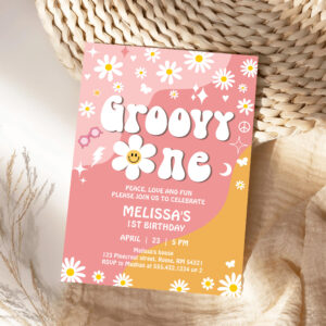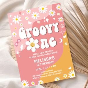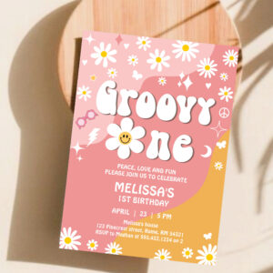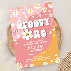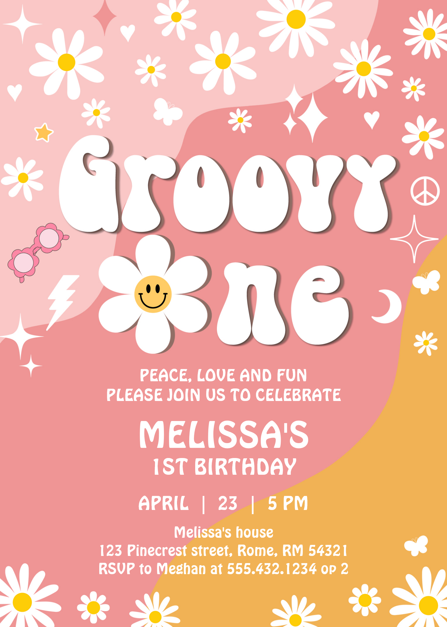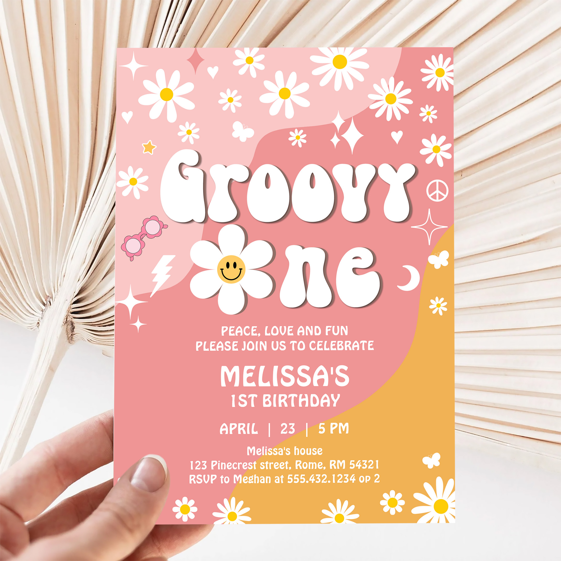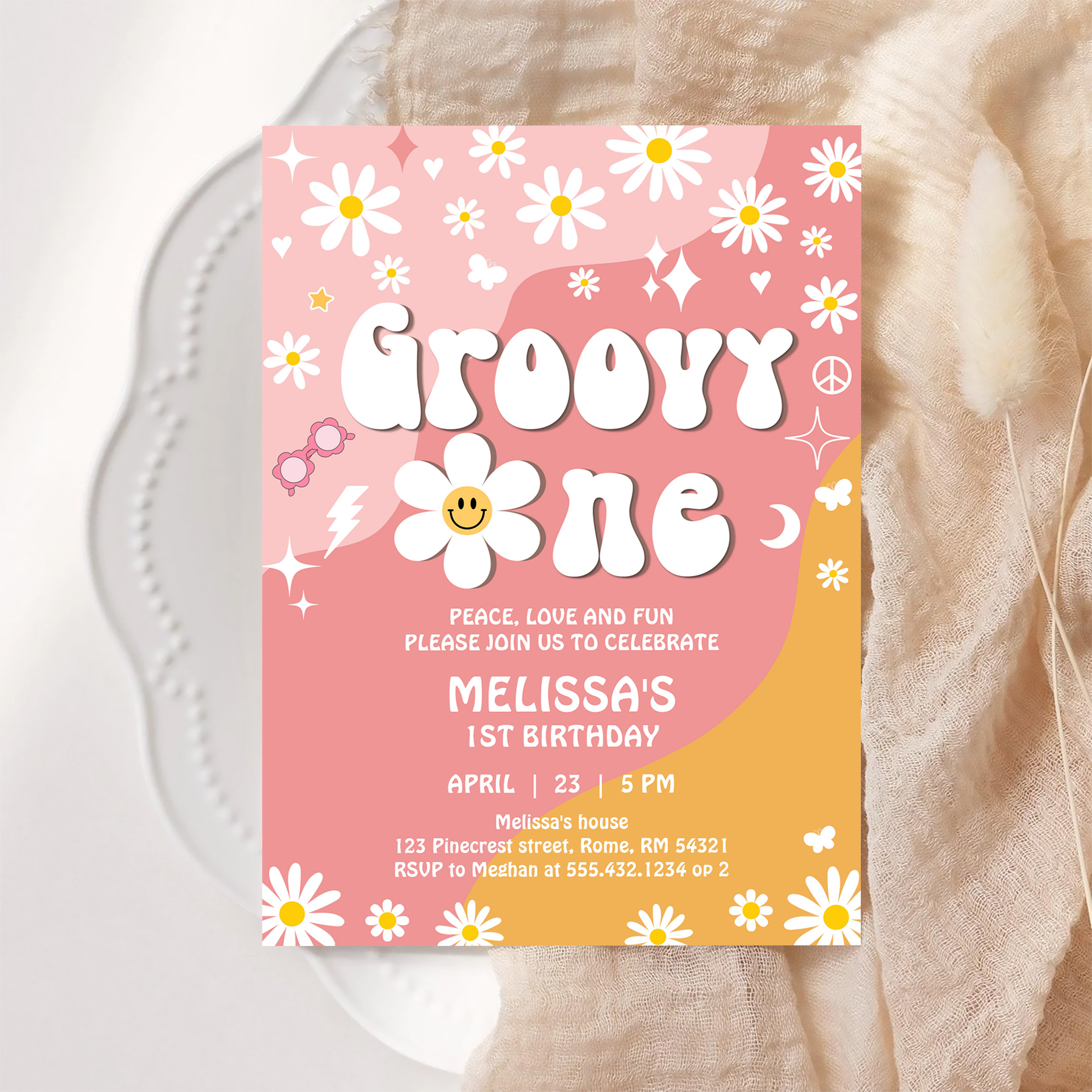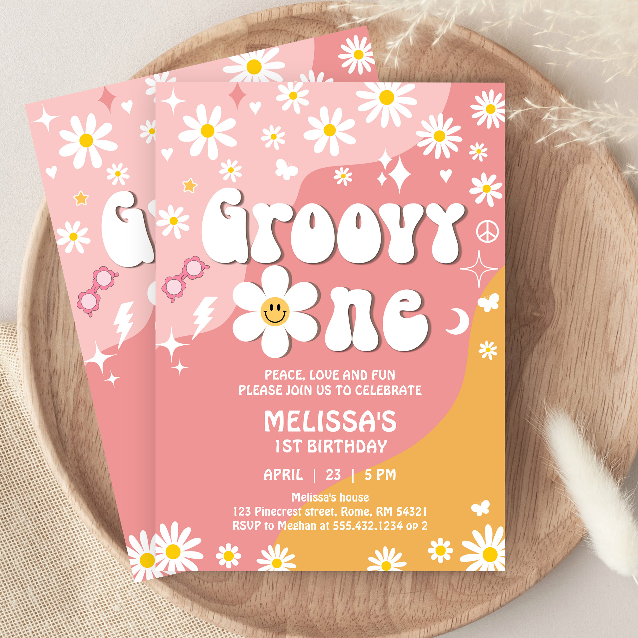 Groovy One Pink Yellow Daisy Groovy 1st Birthday Invitation