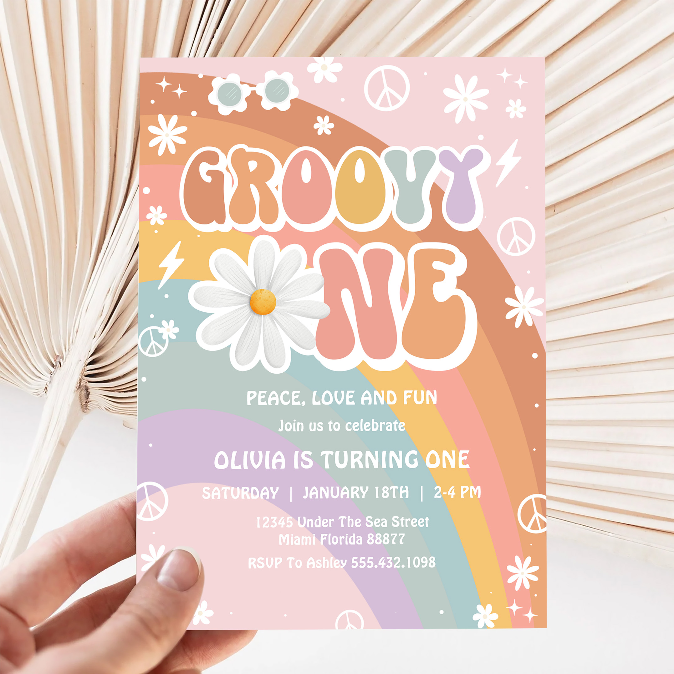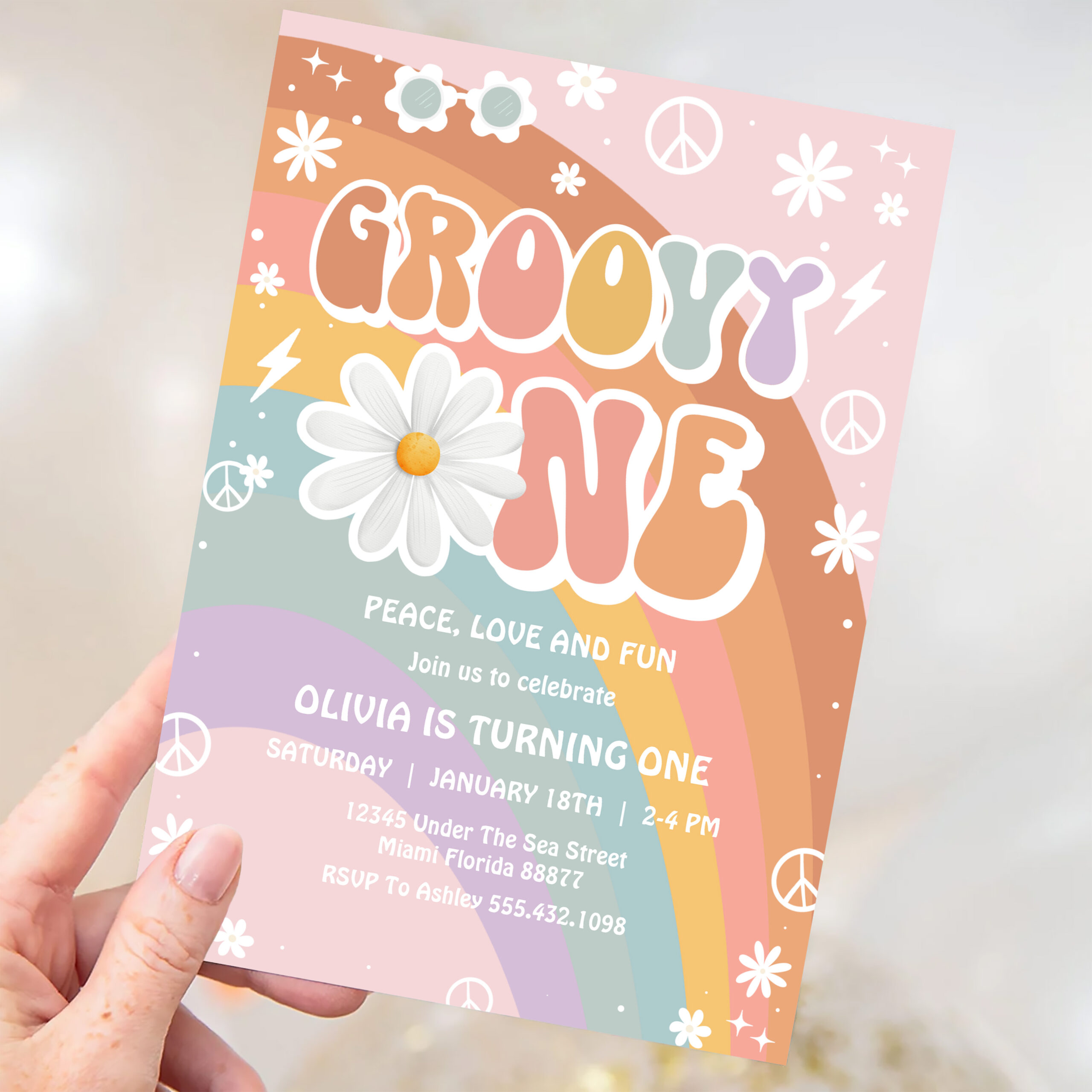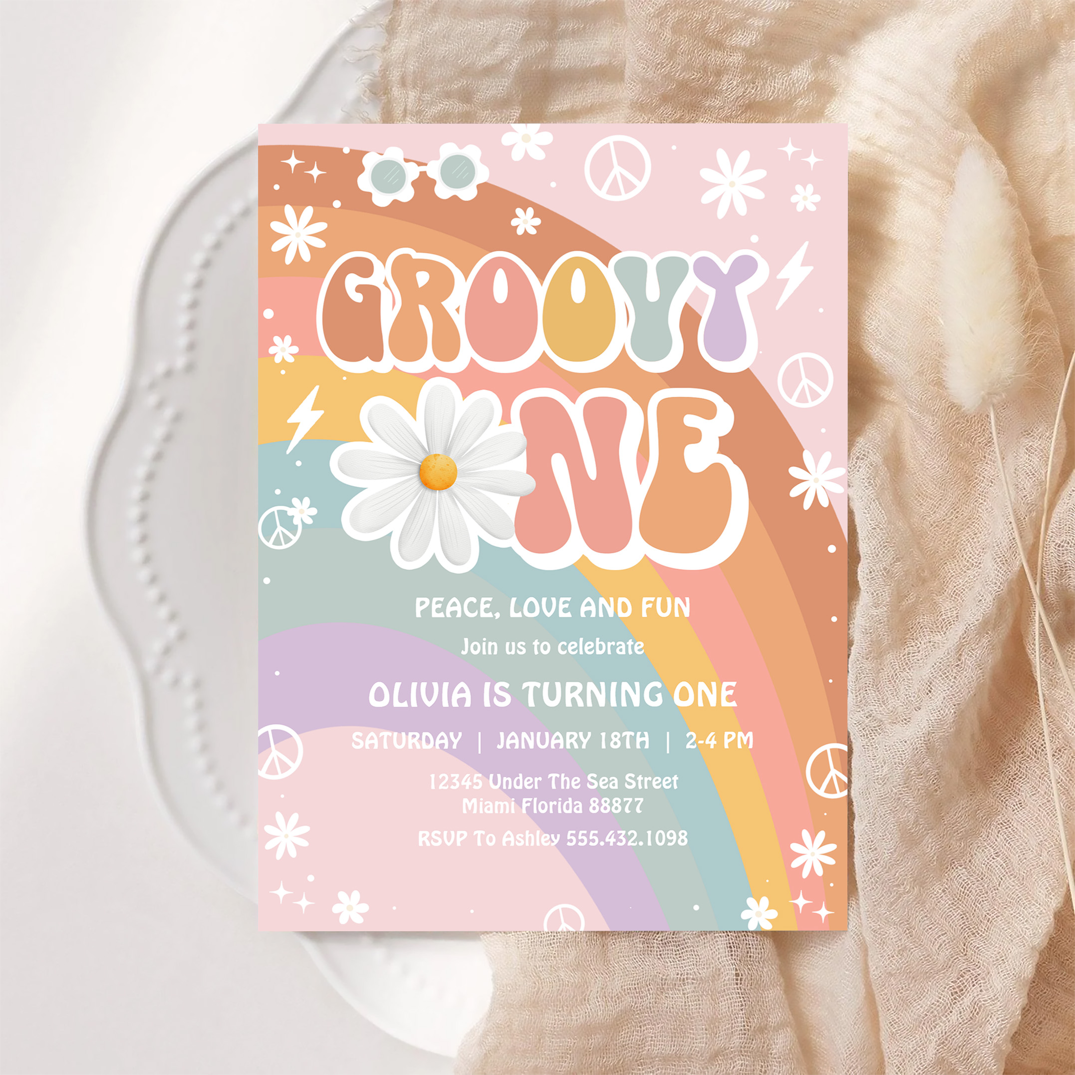 Groovy One Retro Hippie Rainbow 1st Birthday Invitation