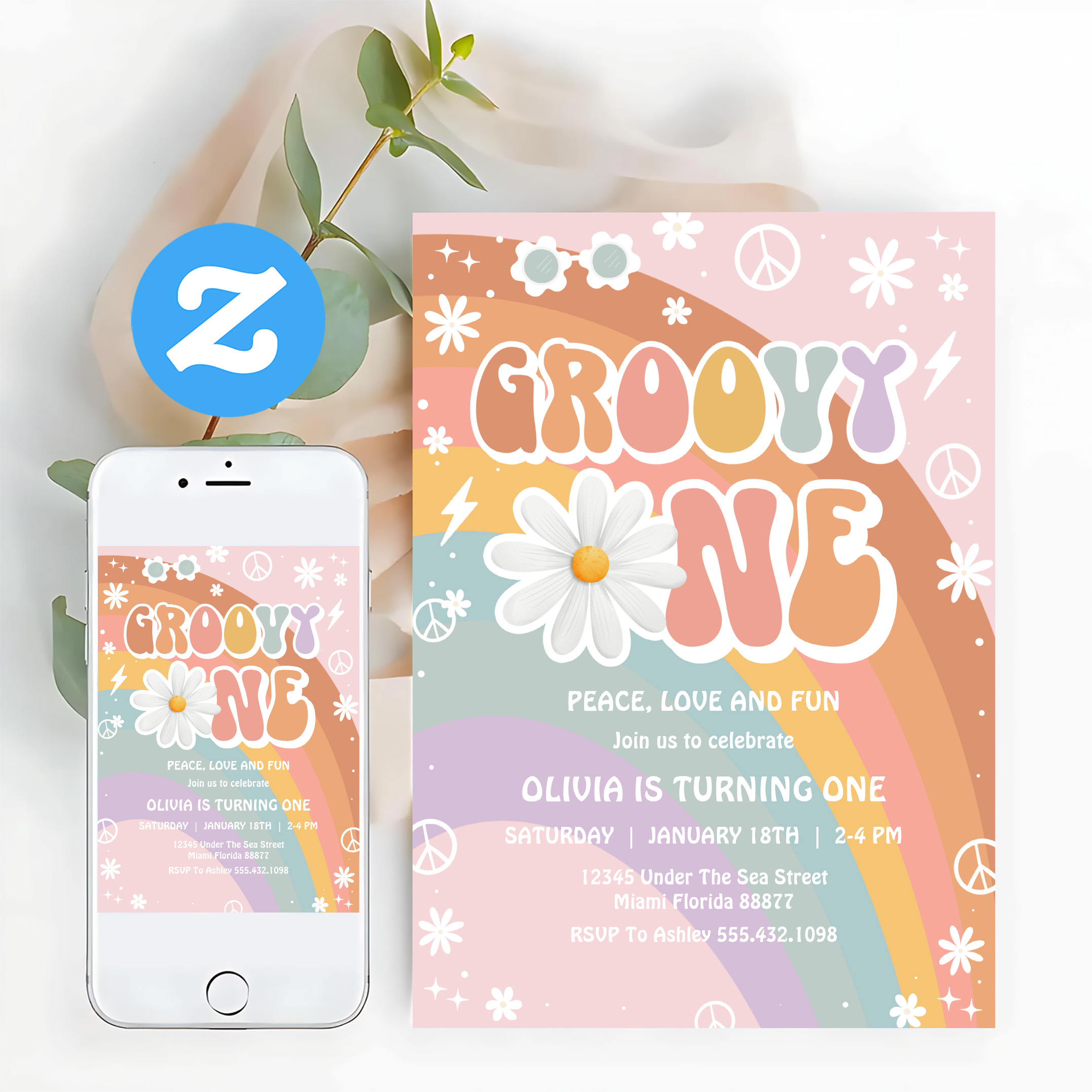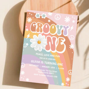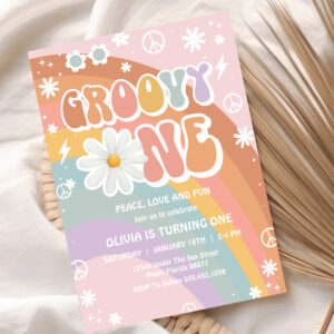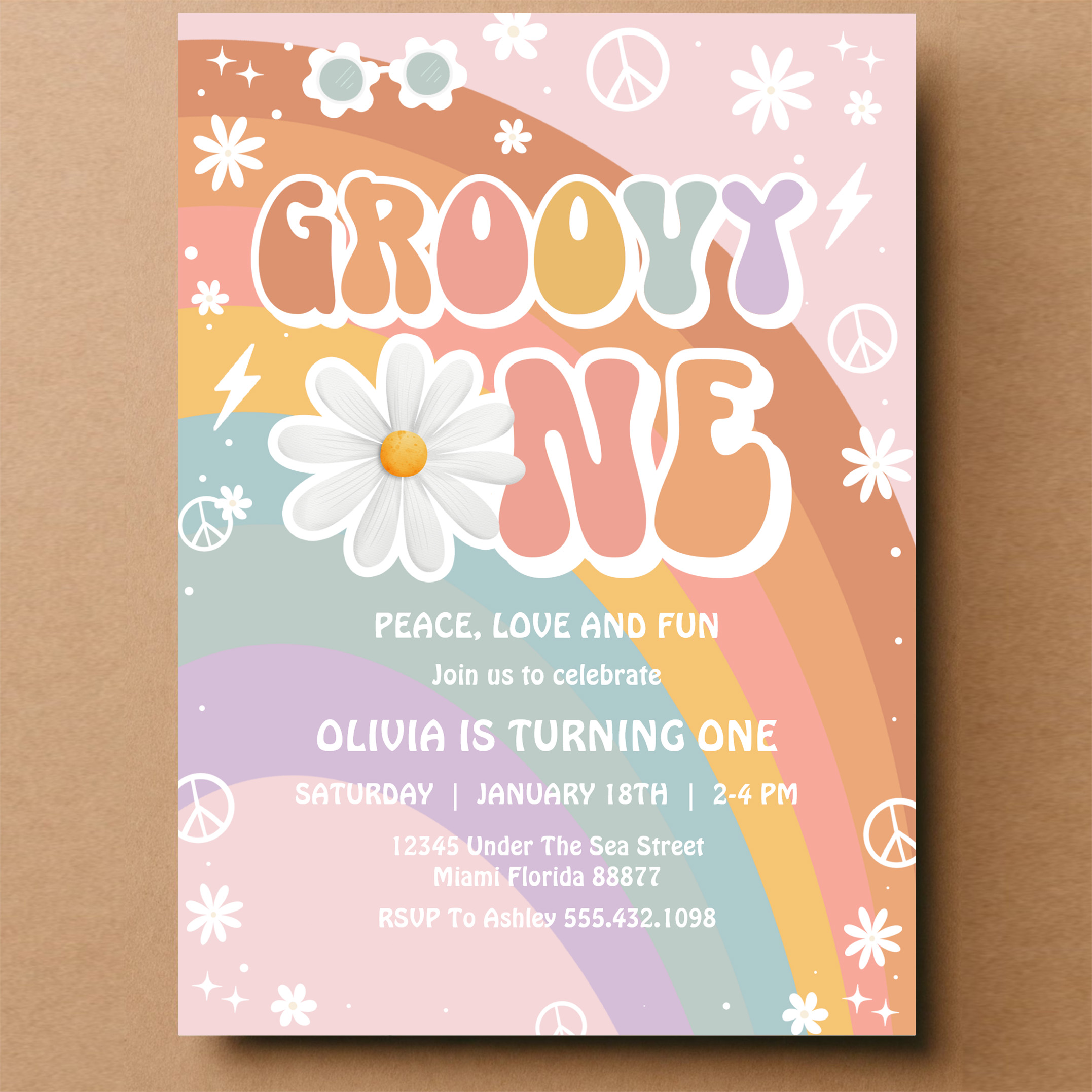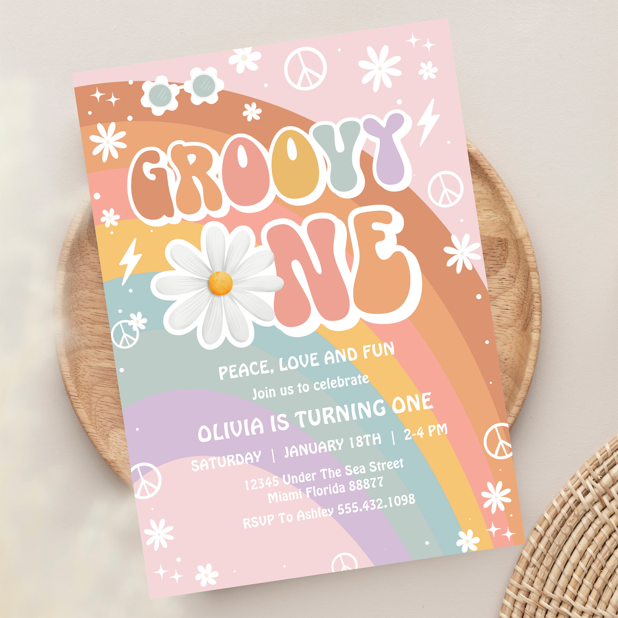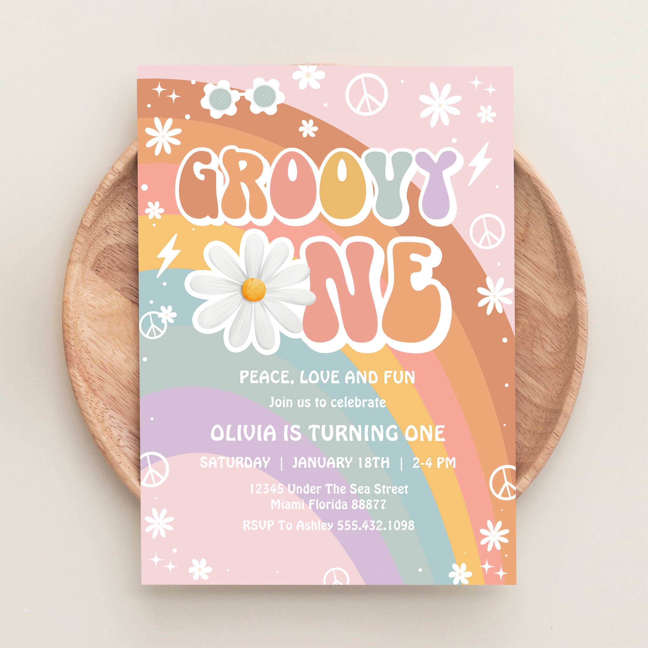 Groovy One Retro Hippie Rainbow 1st Birthday Invitation
