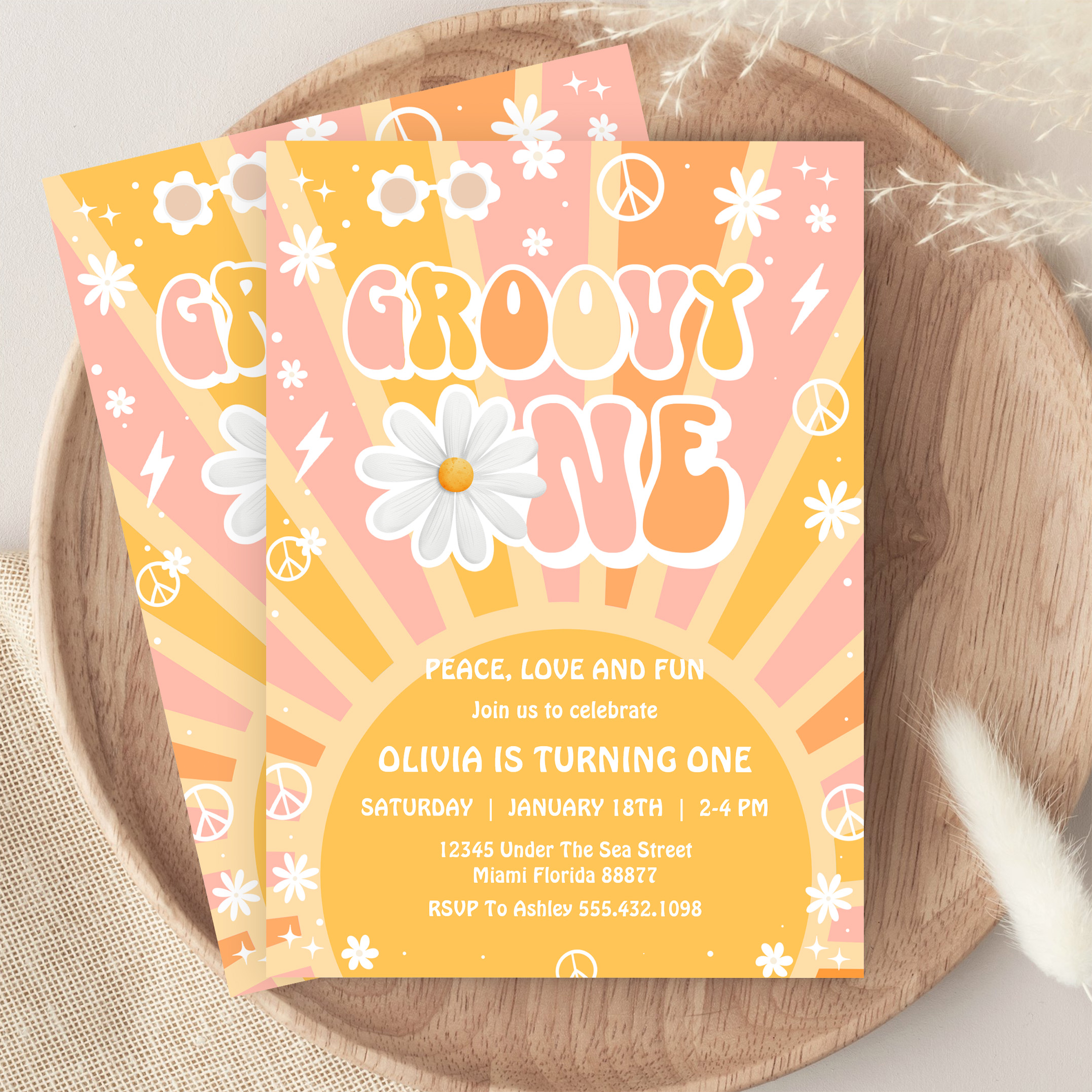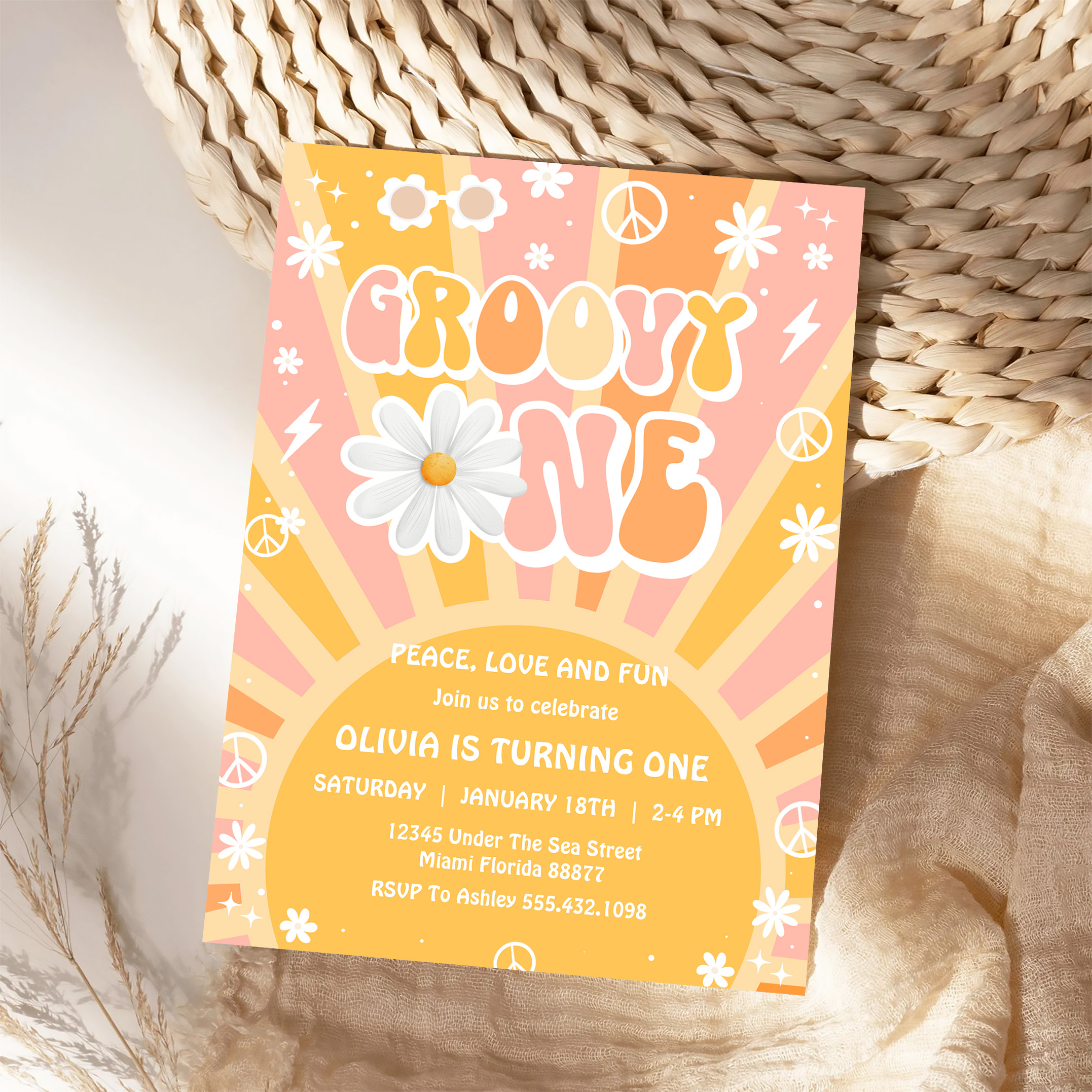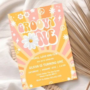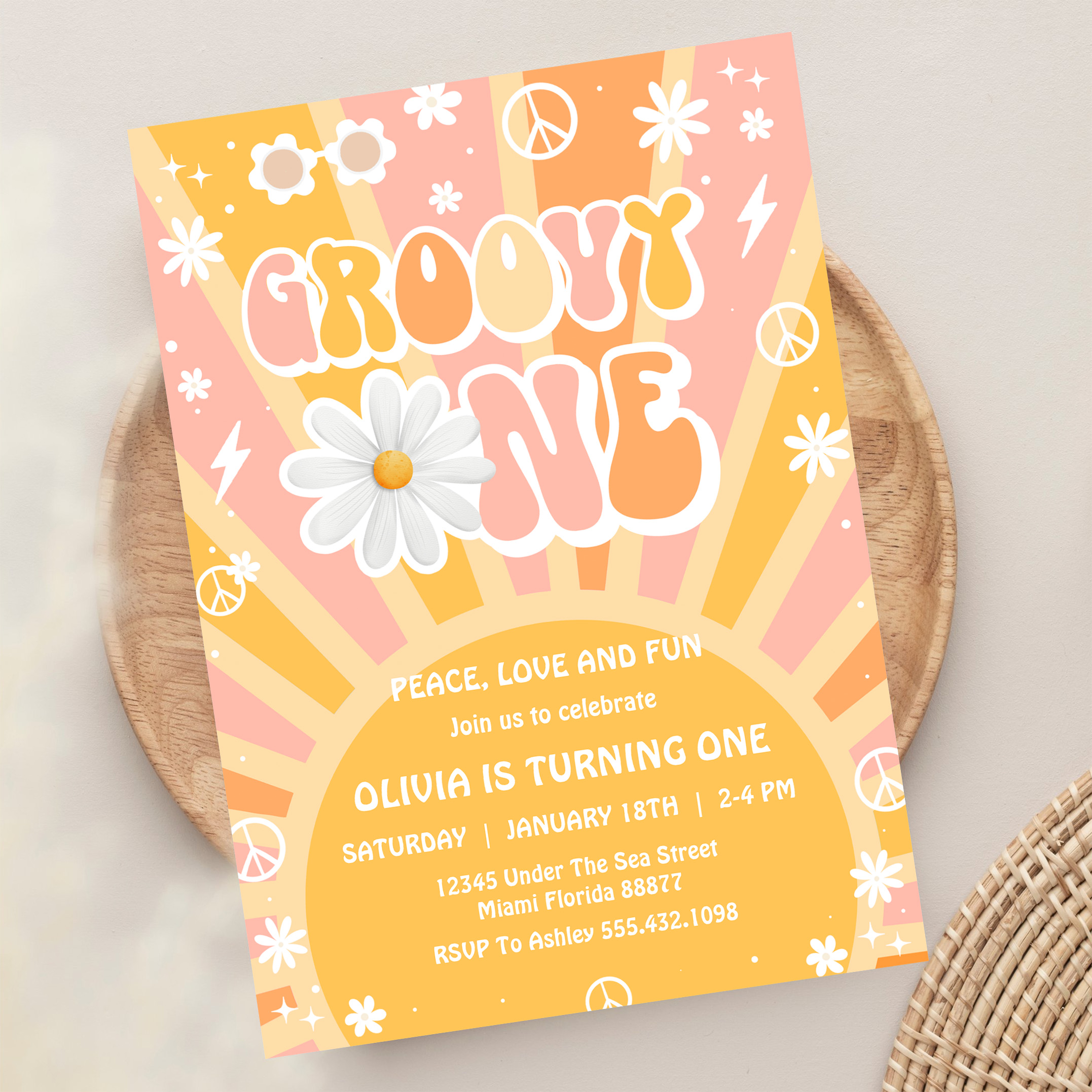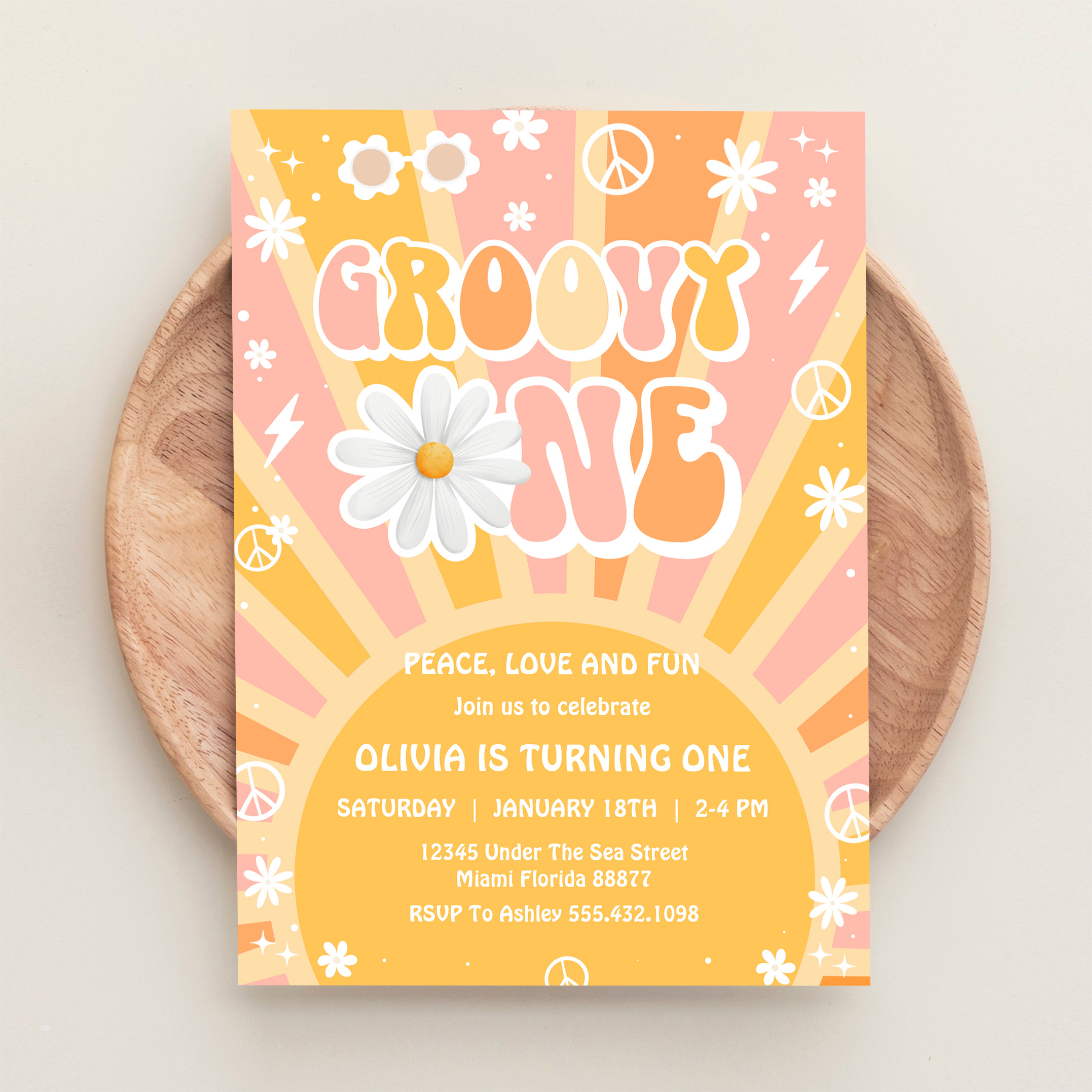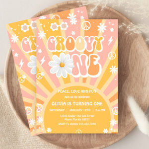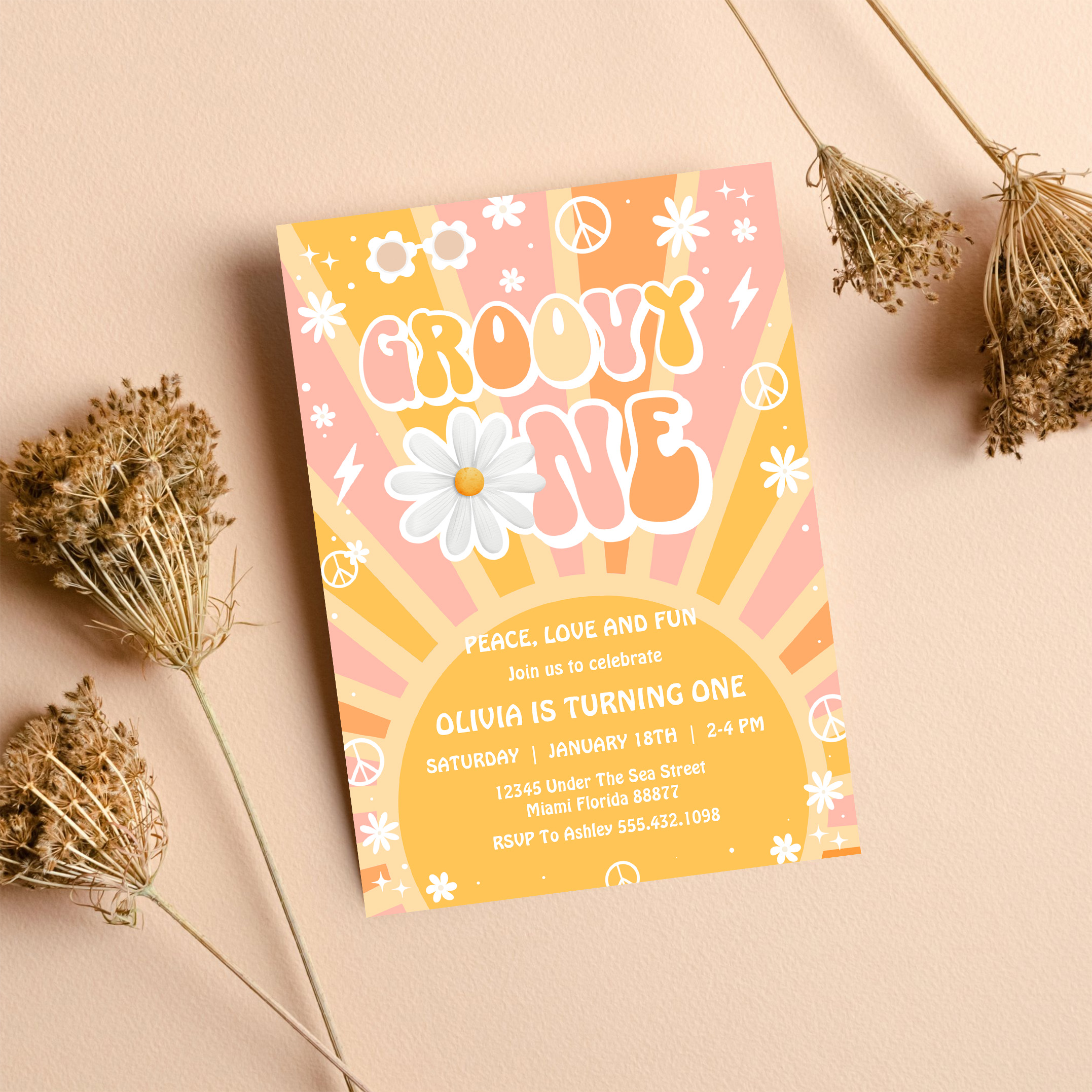 Groovy One Retro Hippie Rainbow Van 1st Birthday Invitation