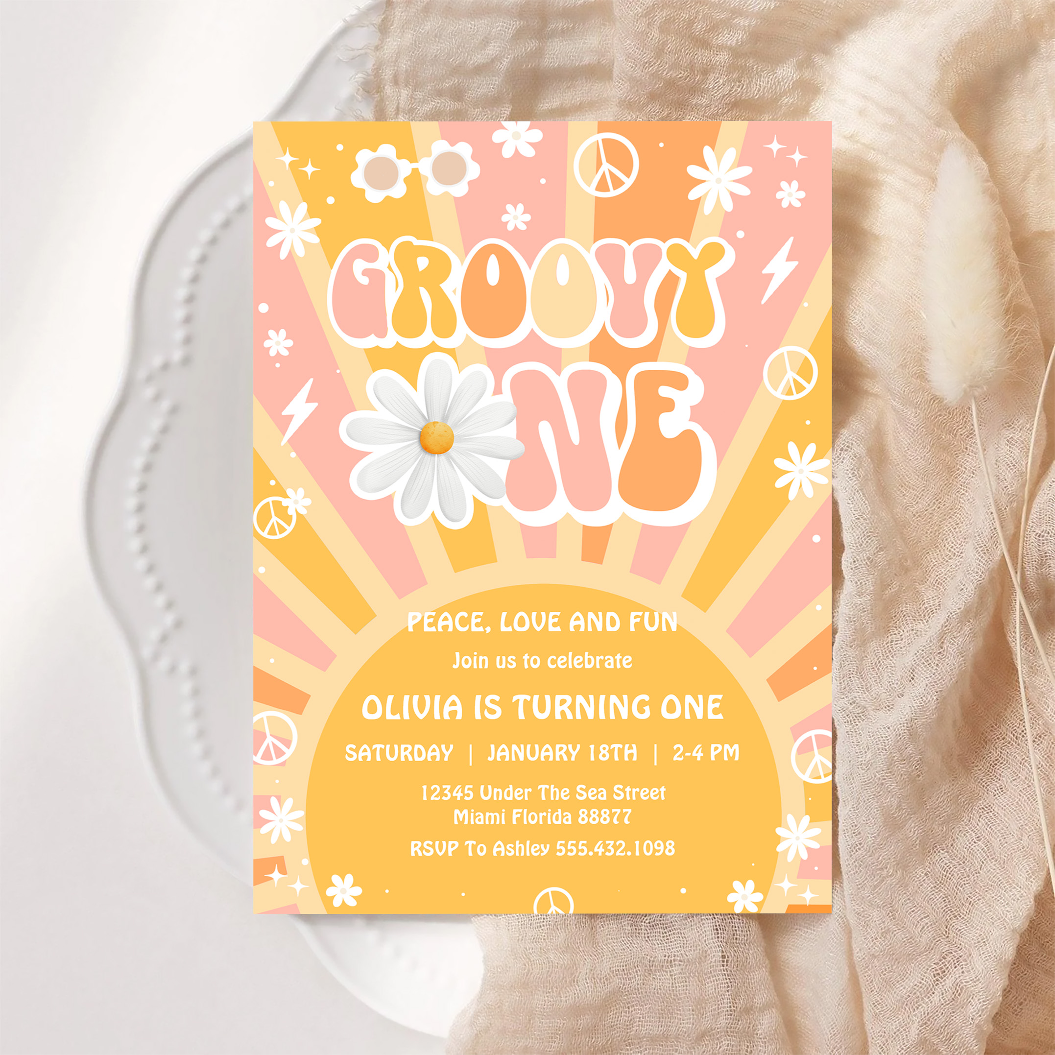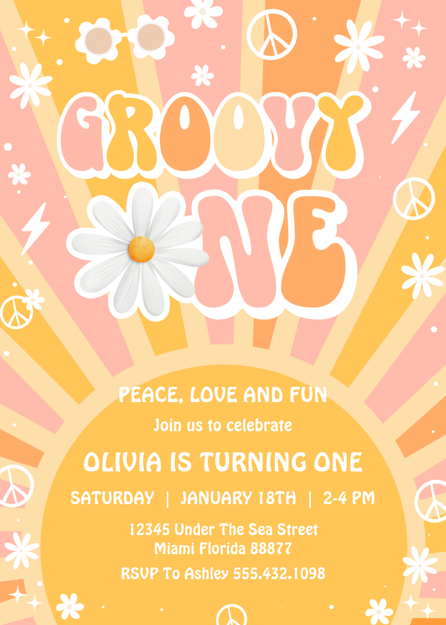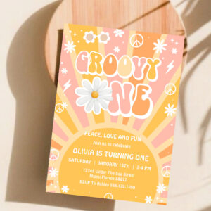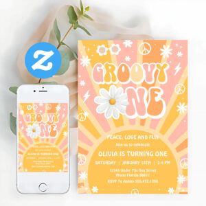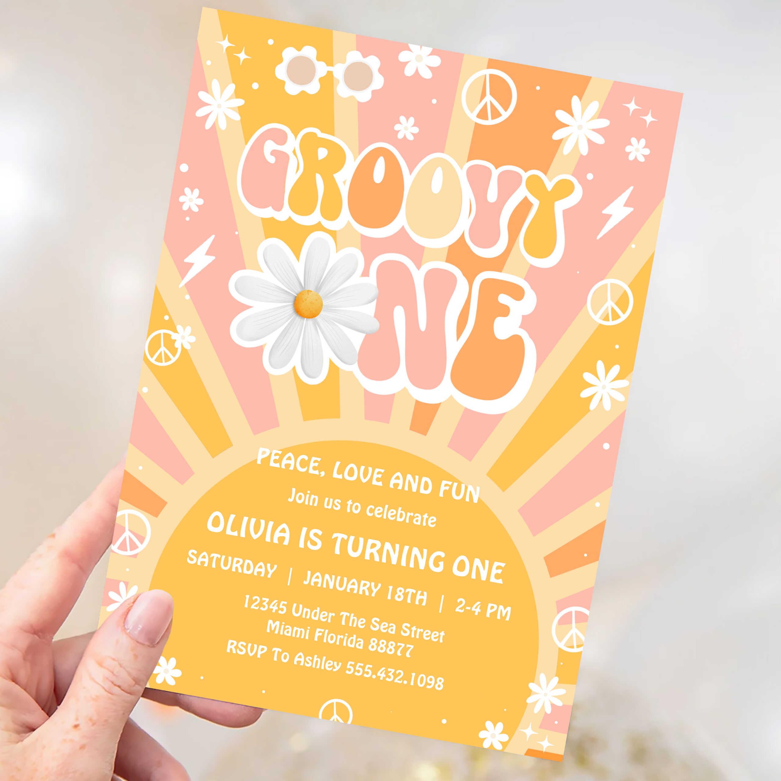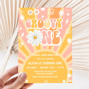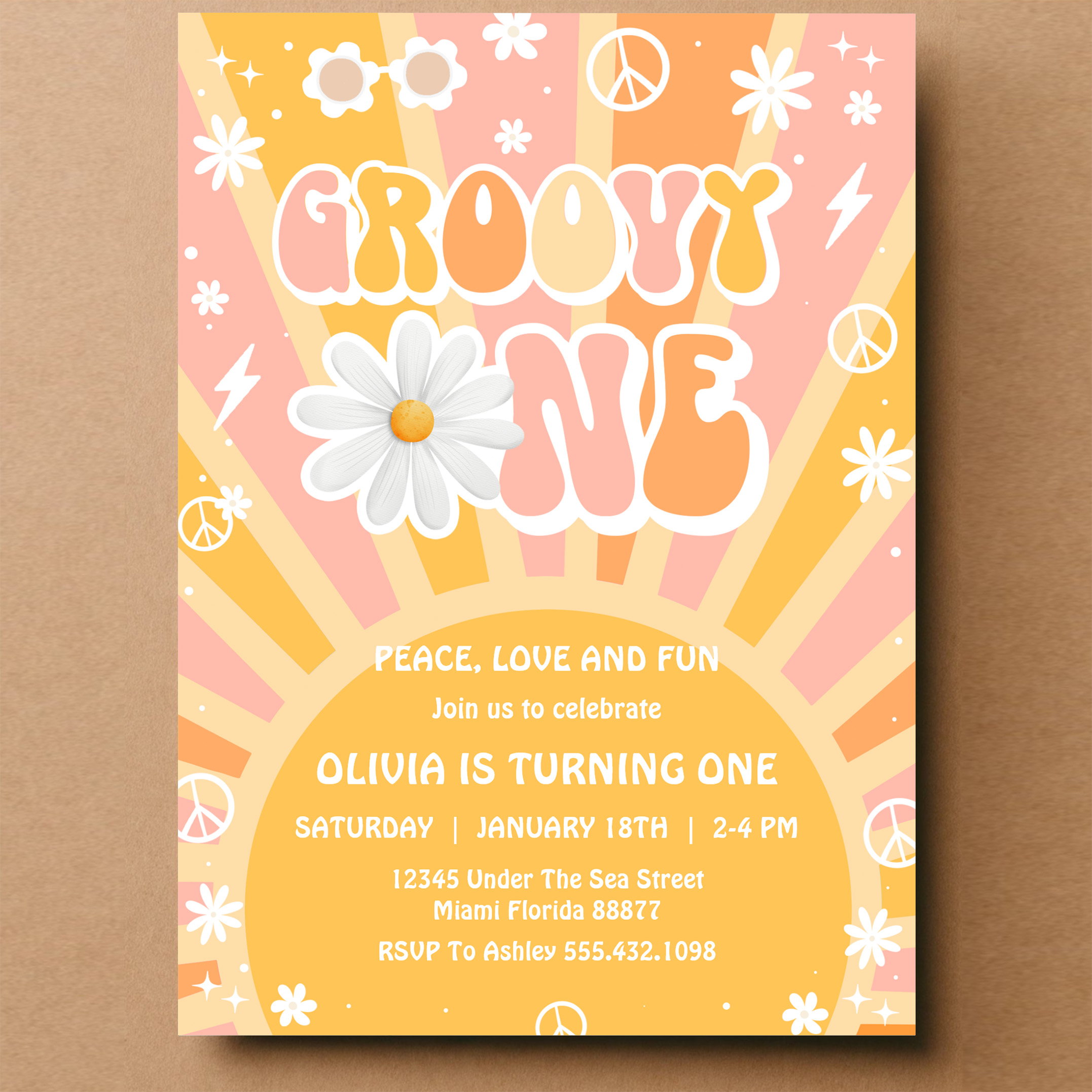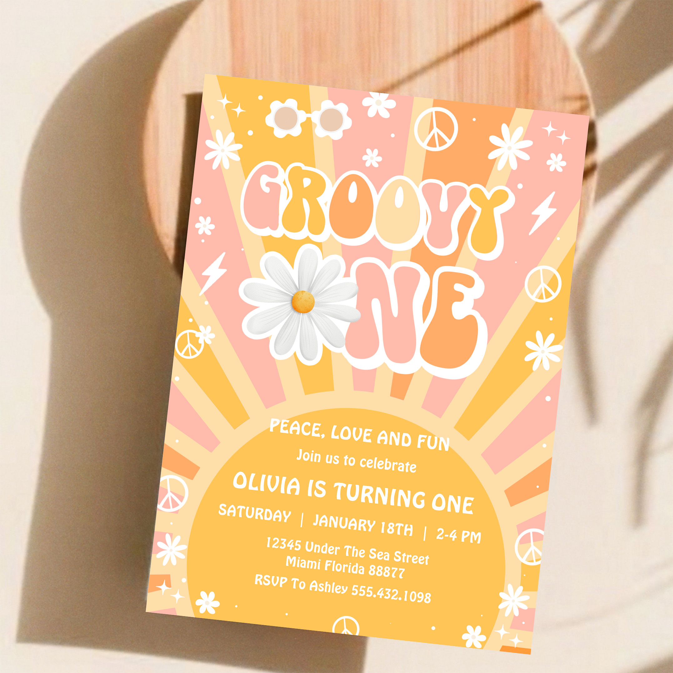Groovy One Retro Hippie Rainbow Van 1st Birthday Invitation