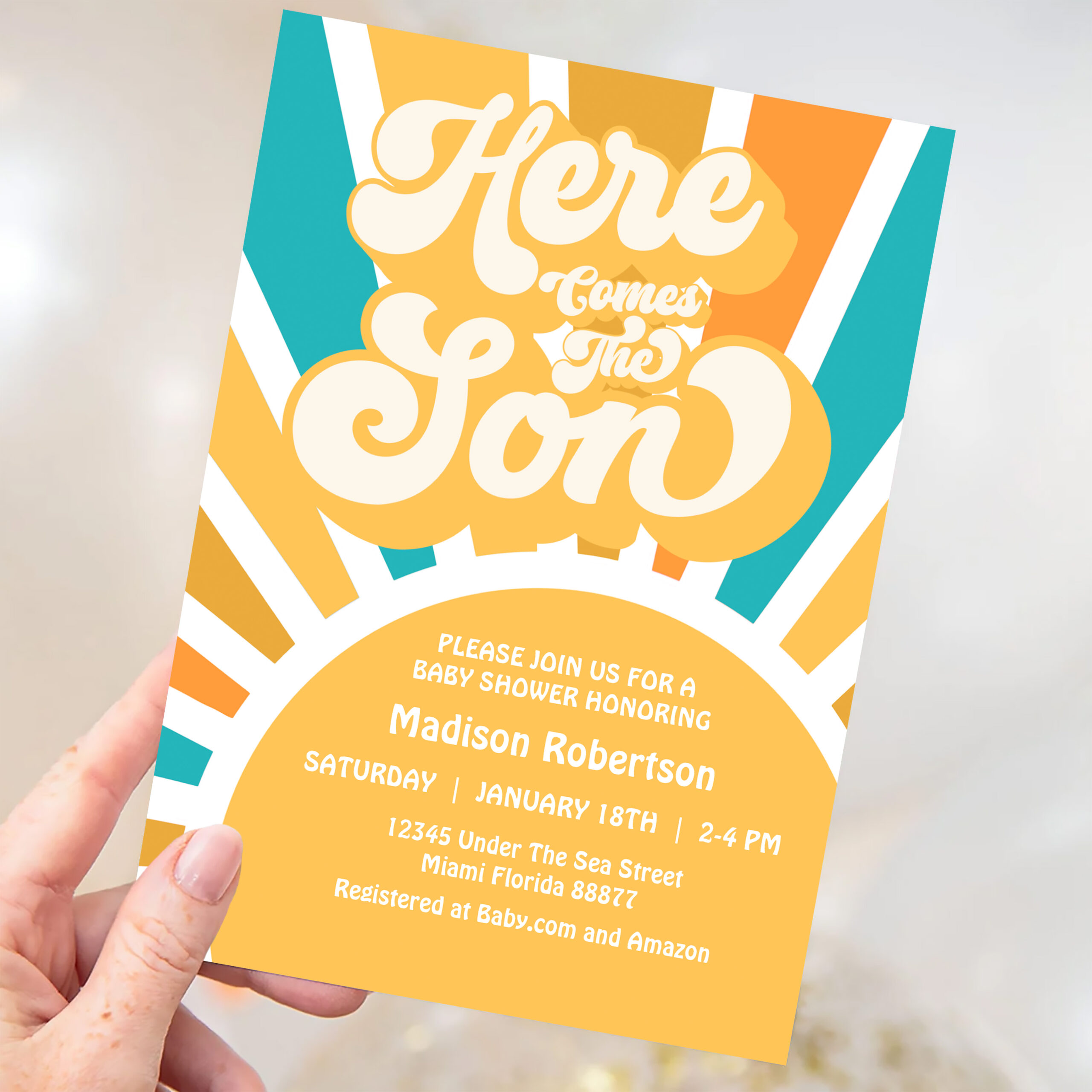 Here Come The Son Retro Sunshine Baby Shower Invitation