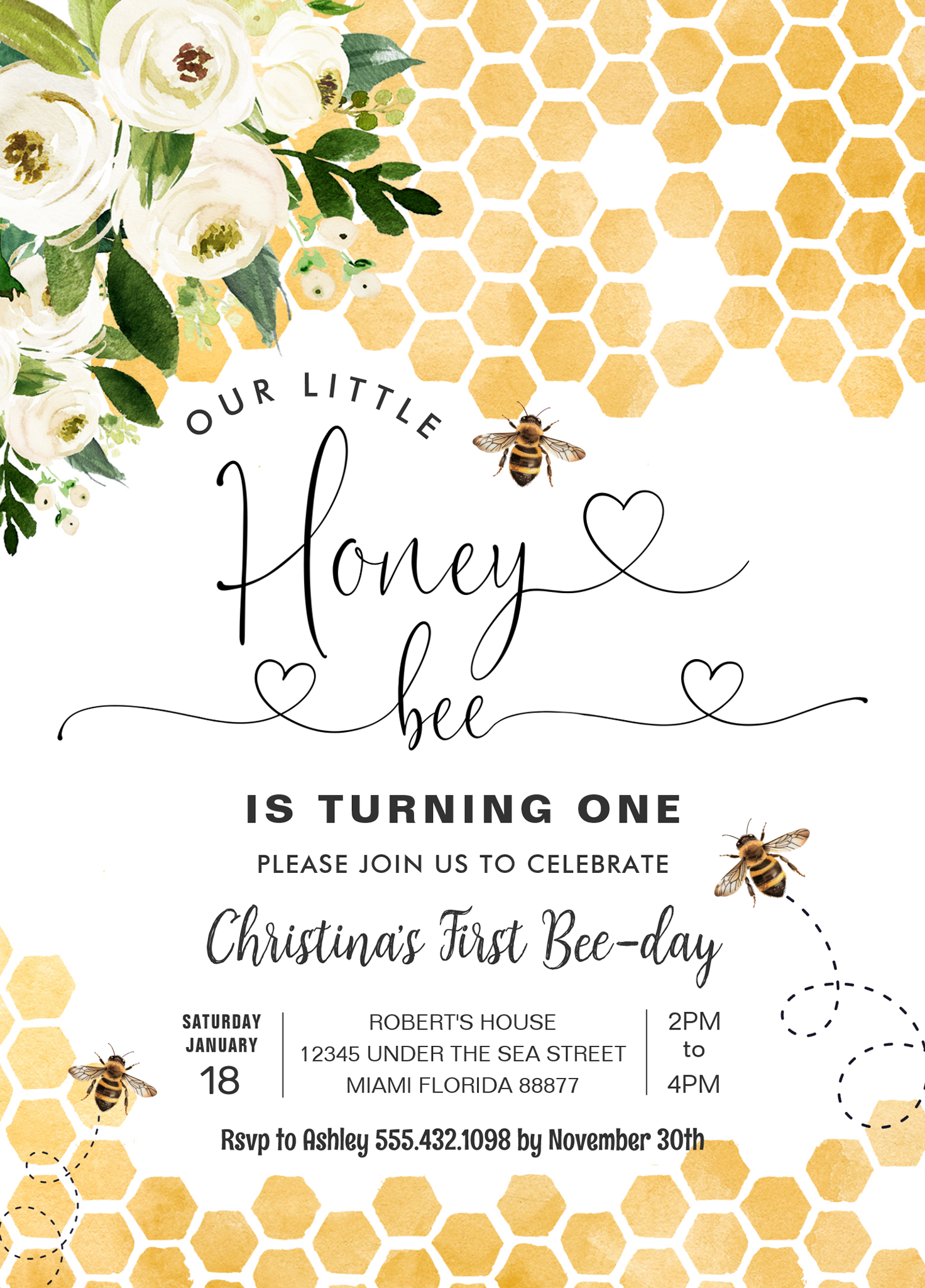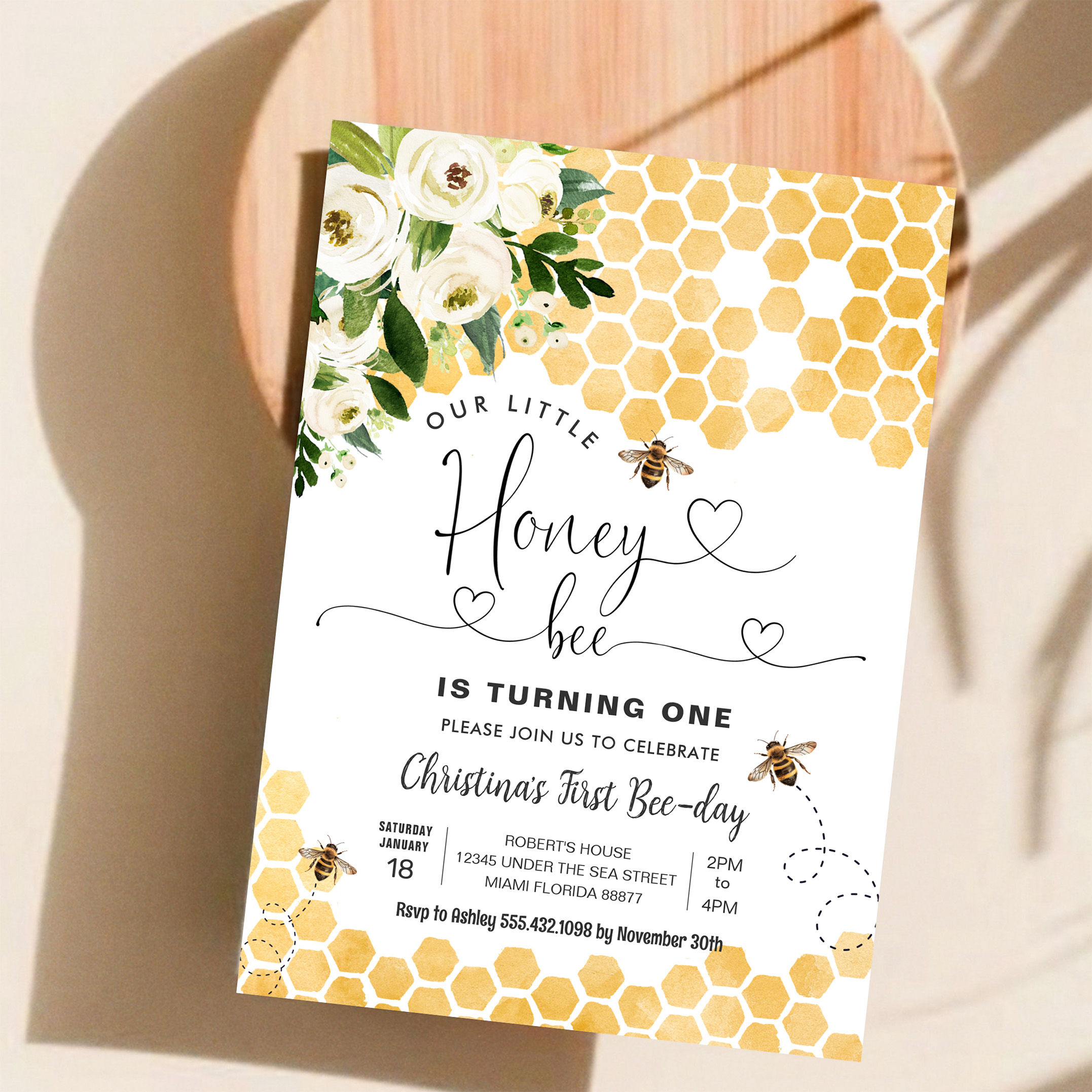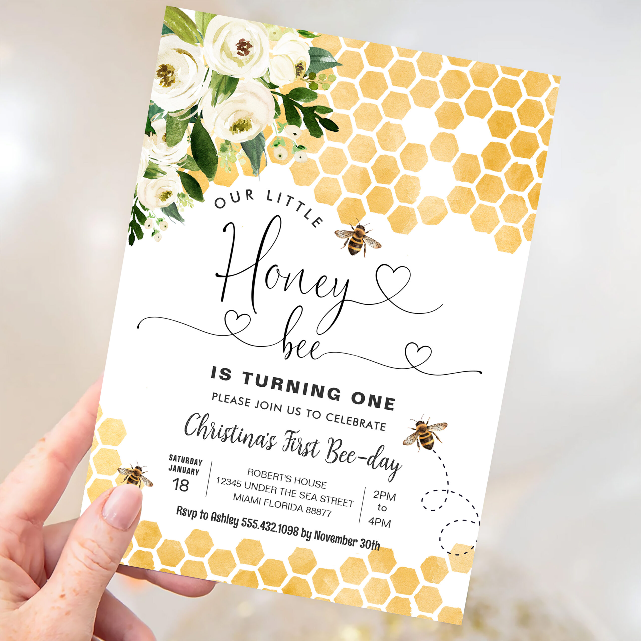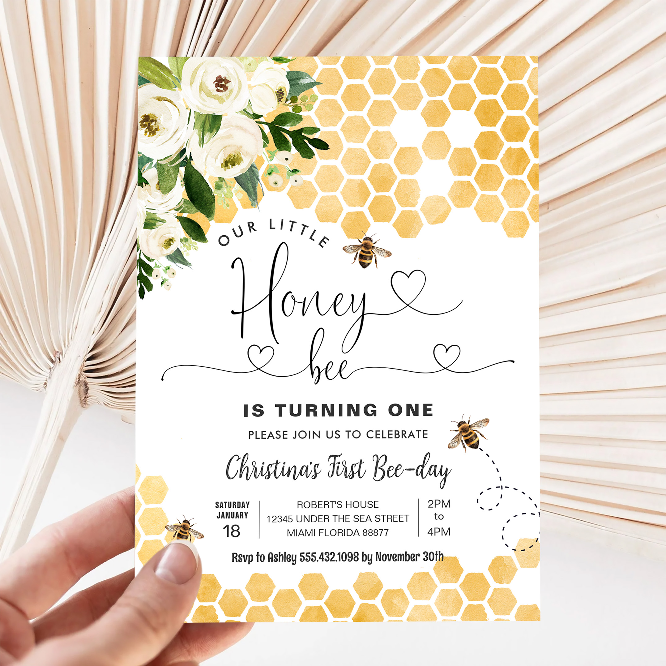 Honey Bee 1st Bee Party Birthday Invitation