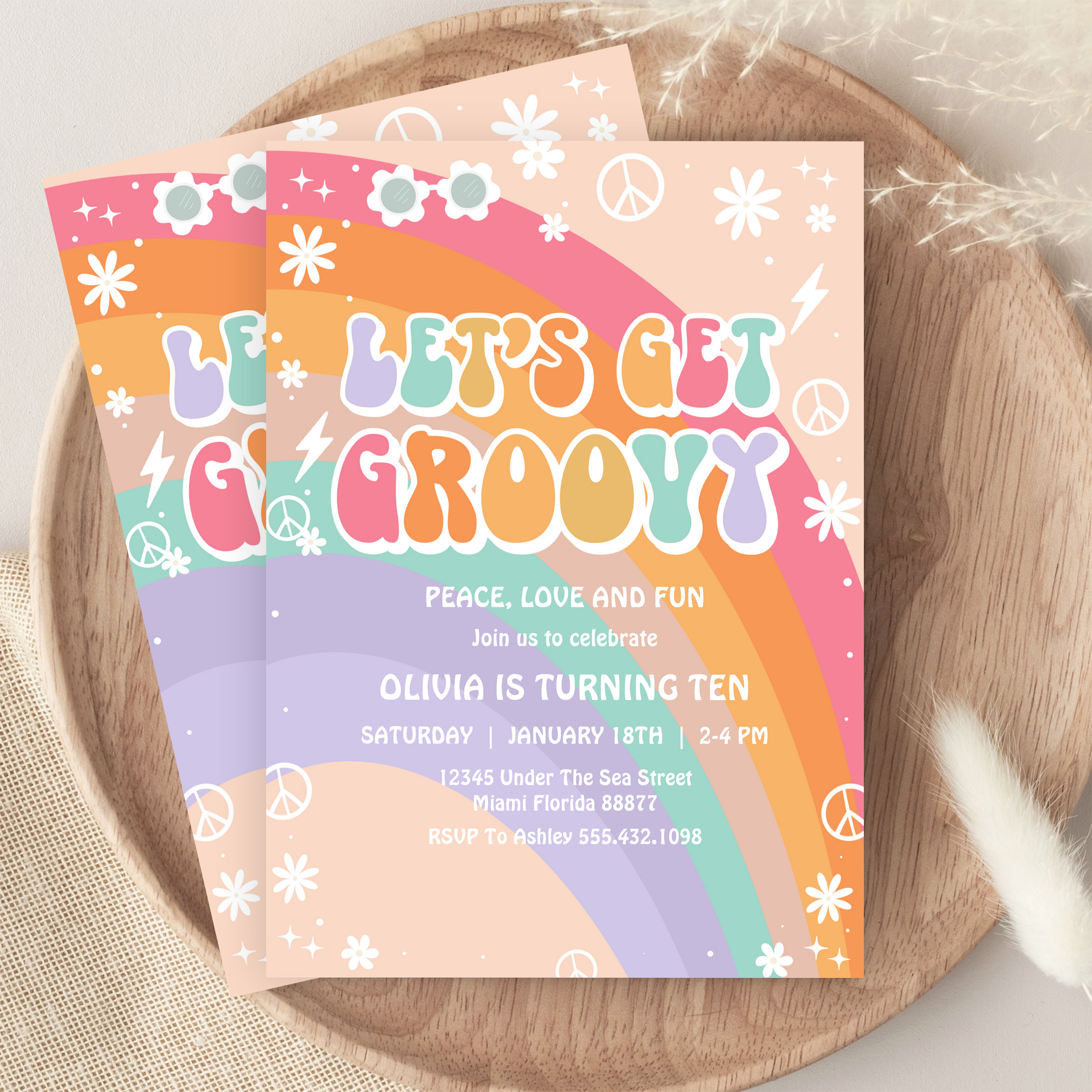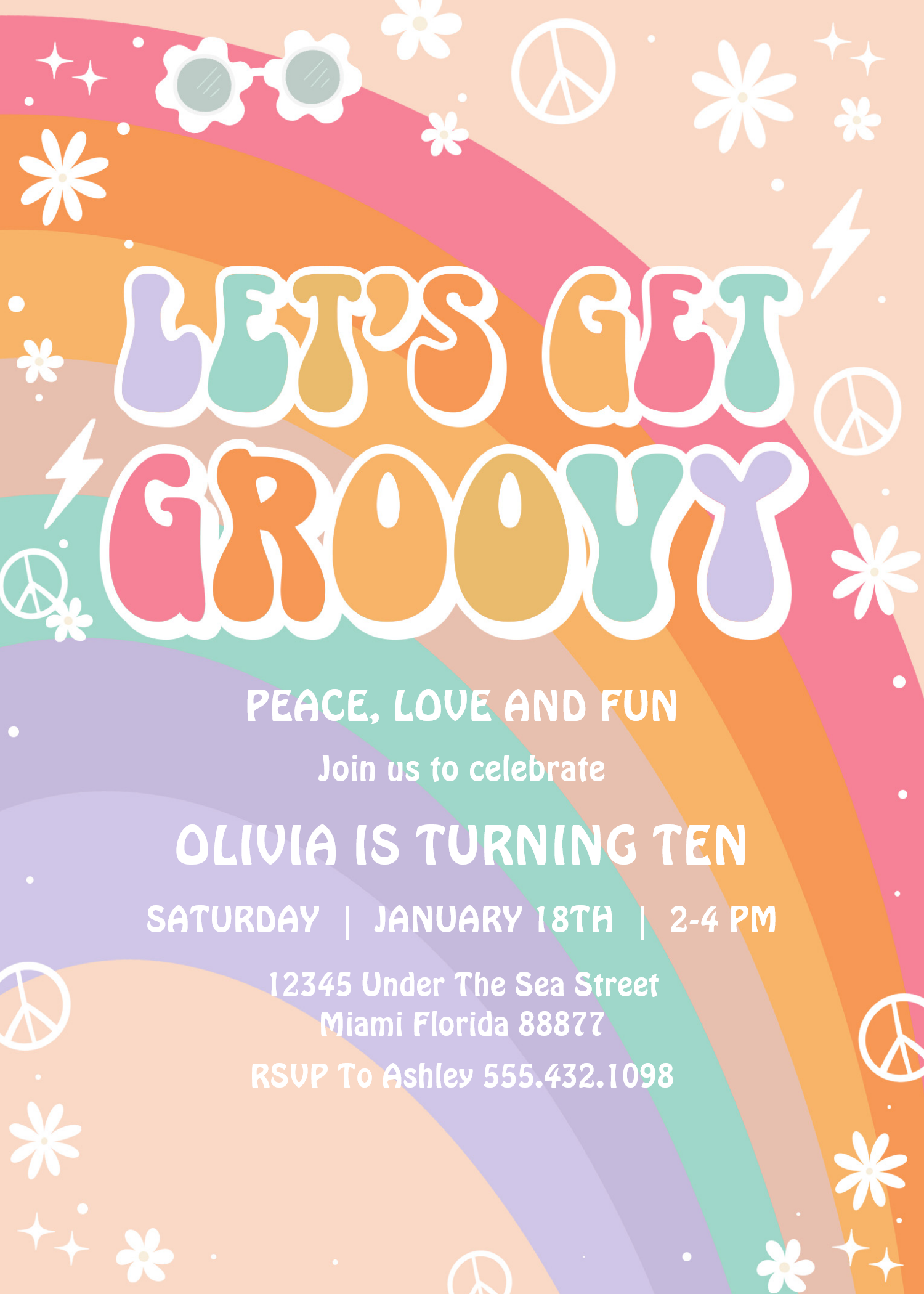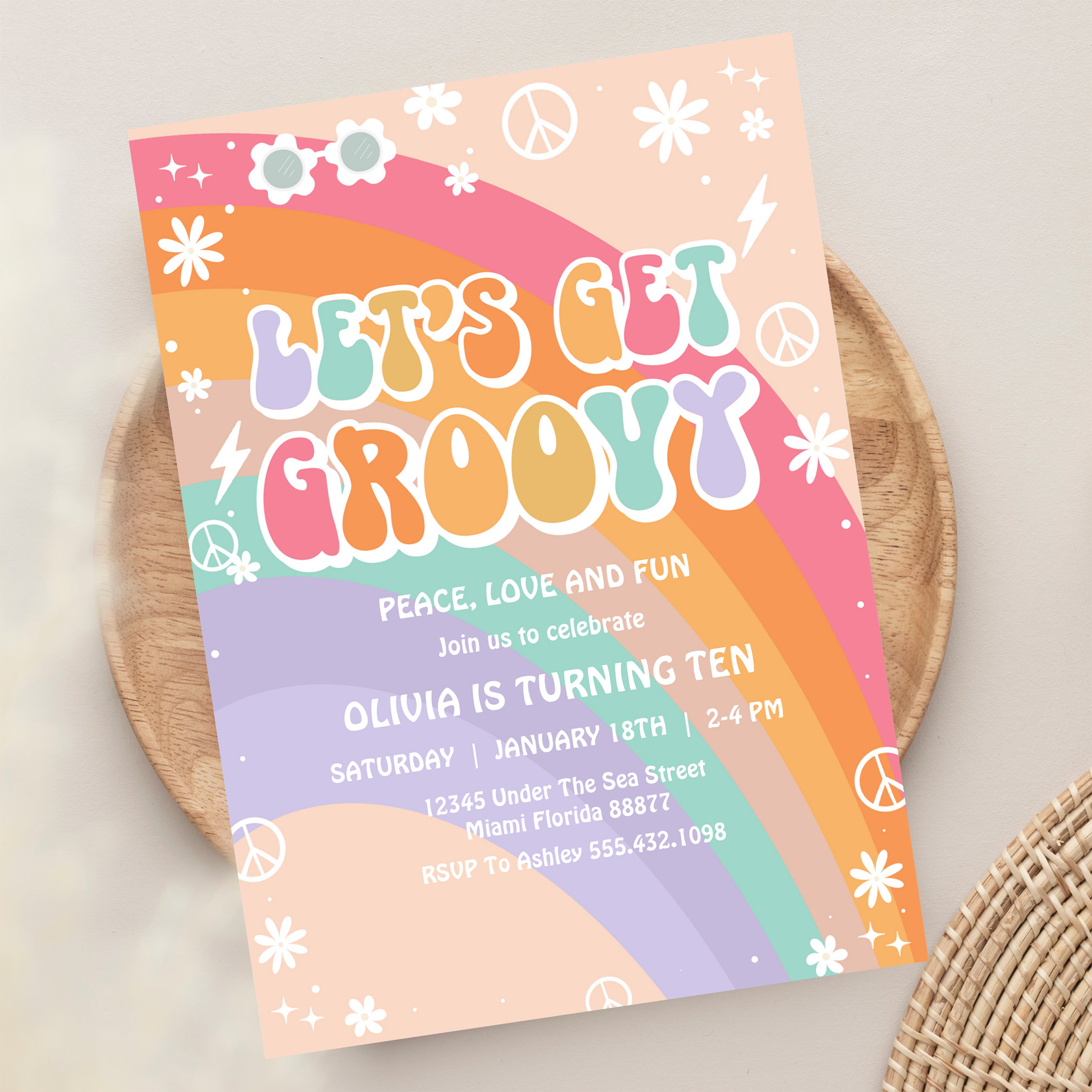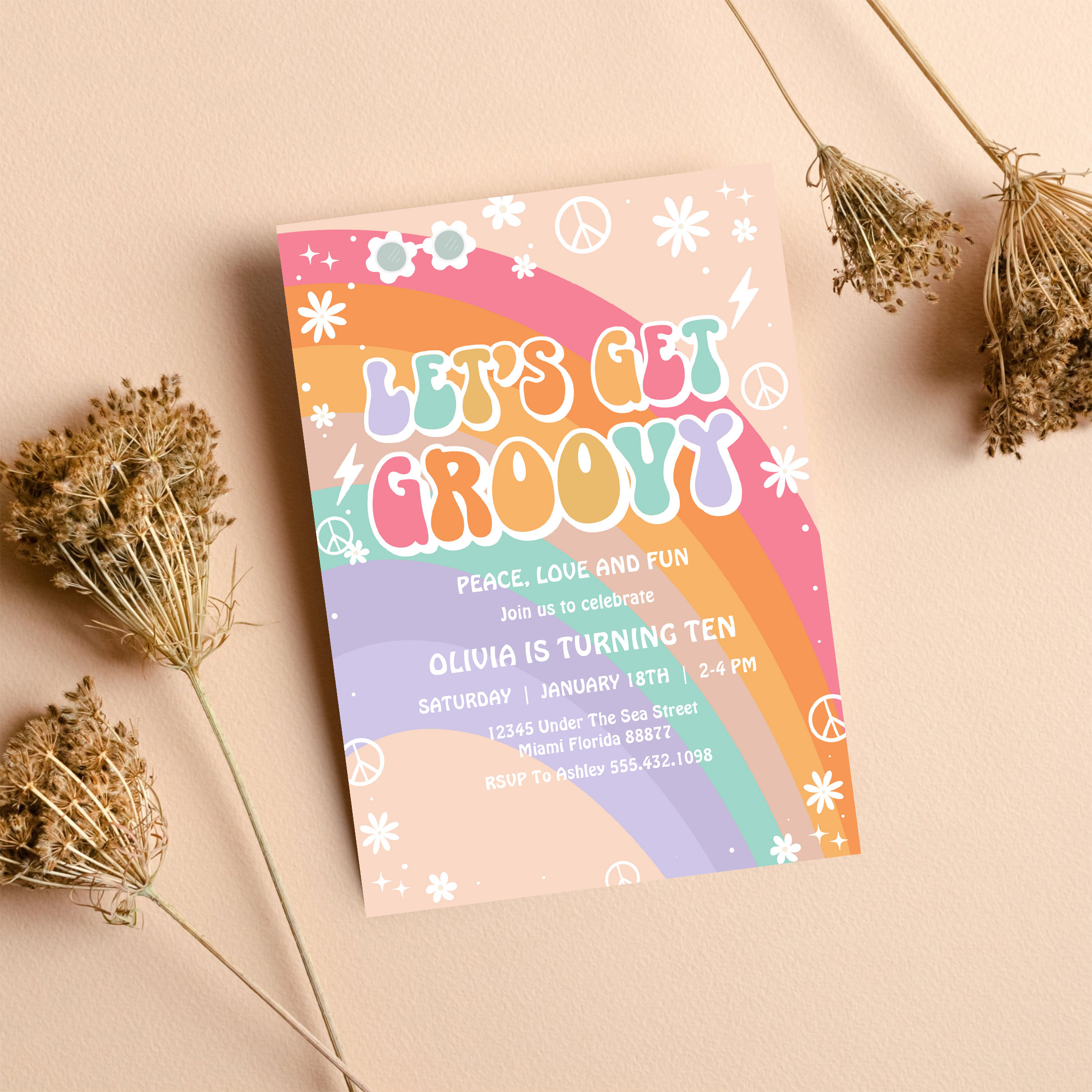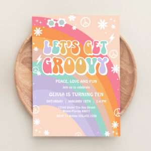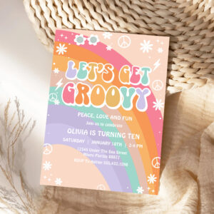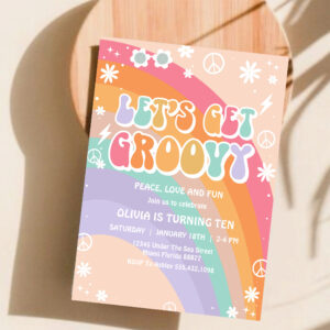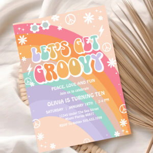 Lets Get Groovy Pink Rainbow Daisy Birthday Invitation
