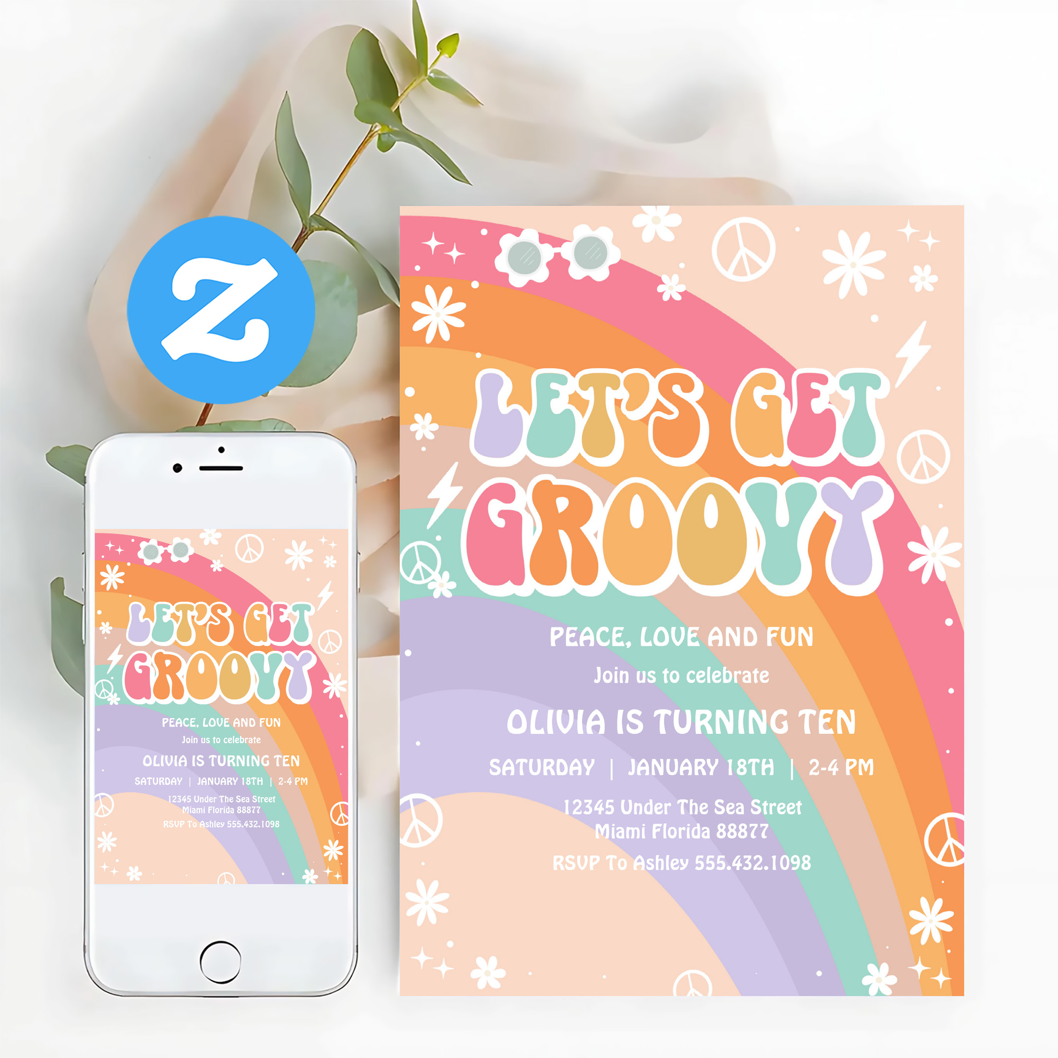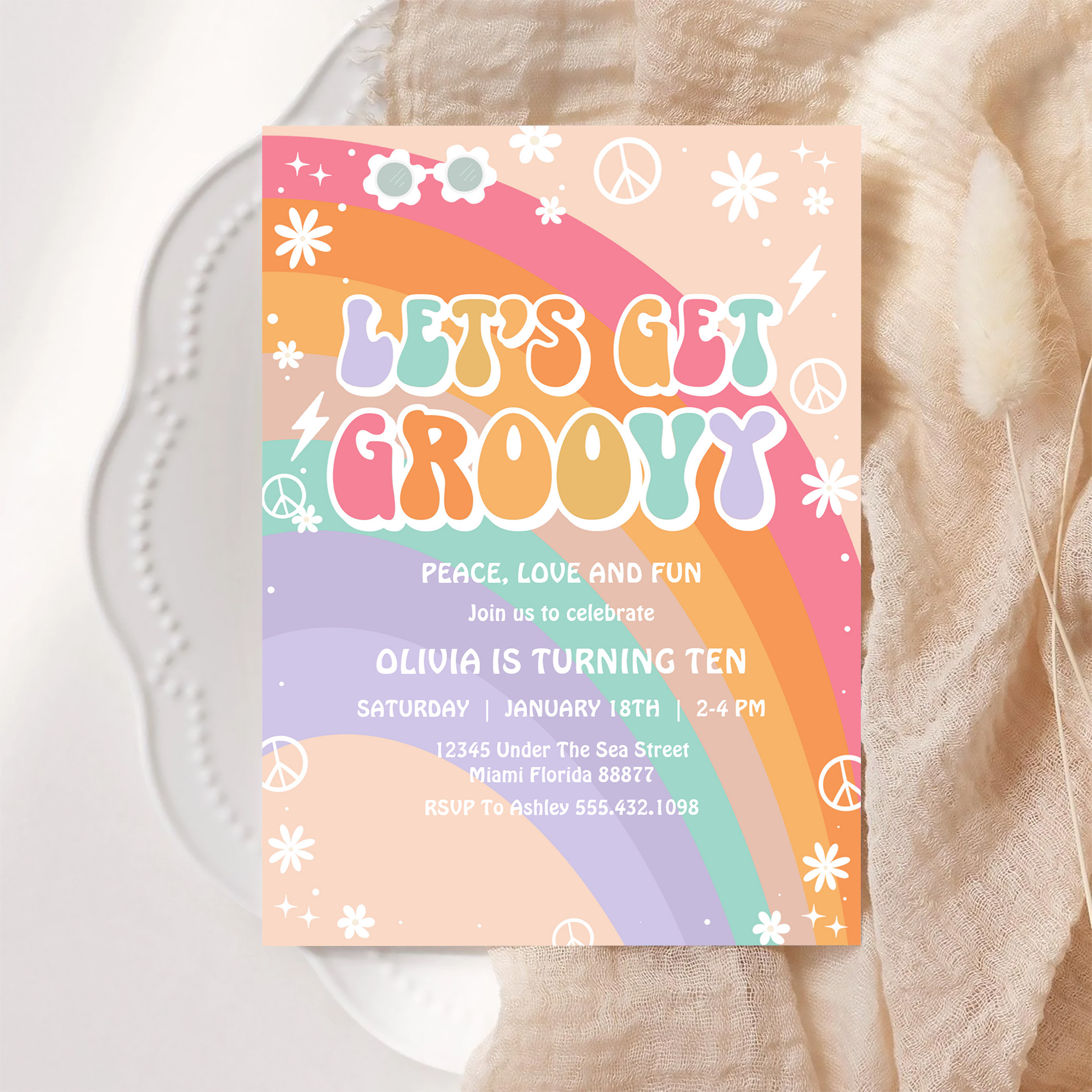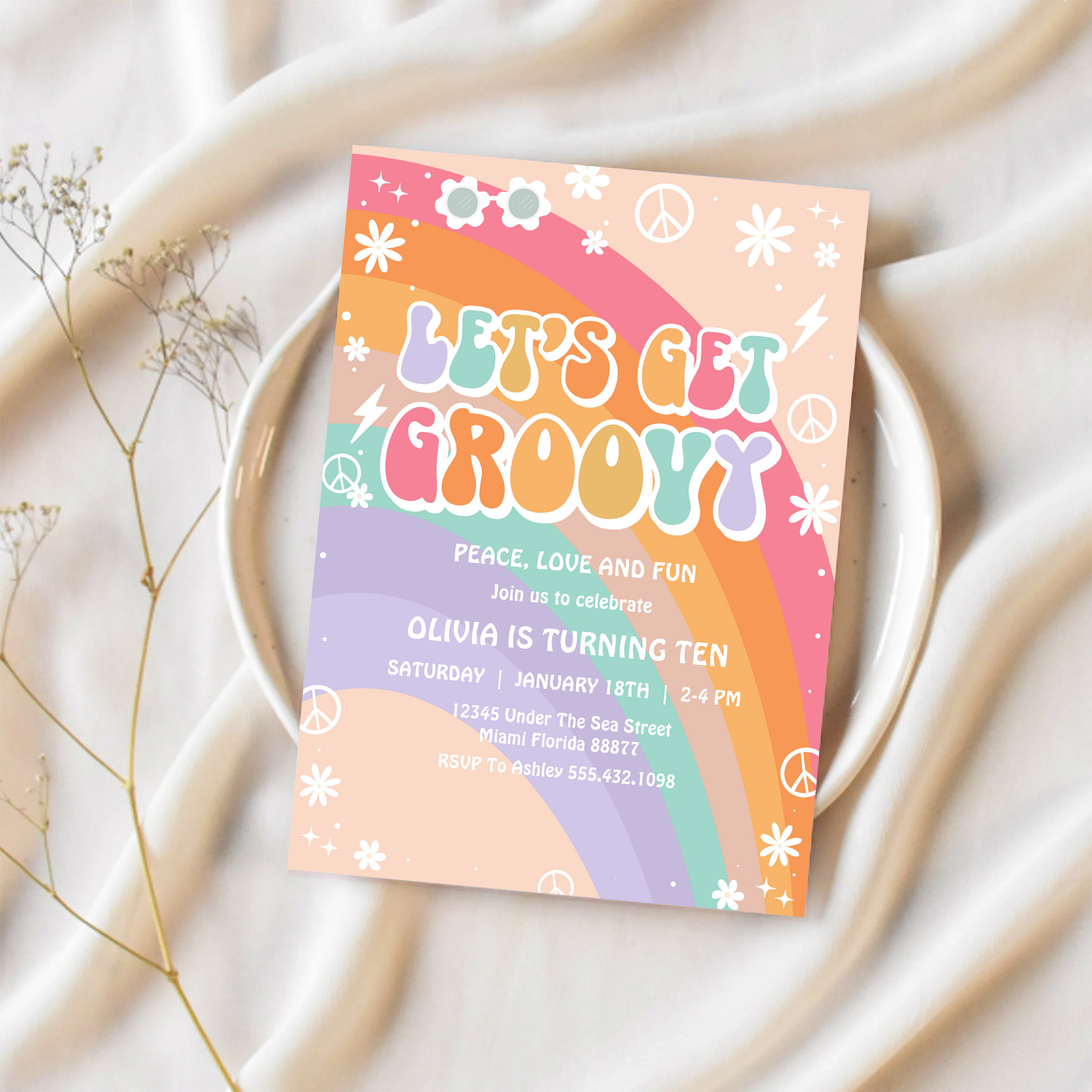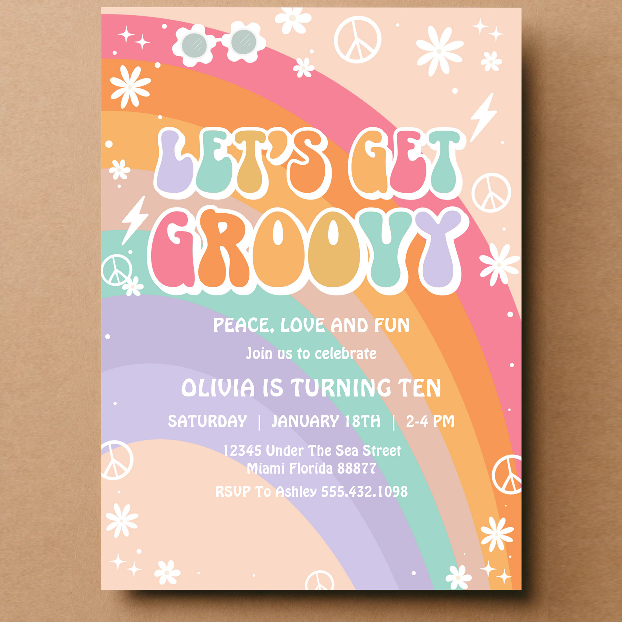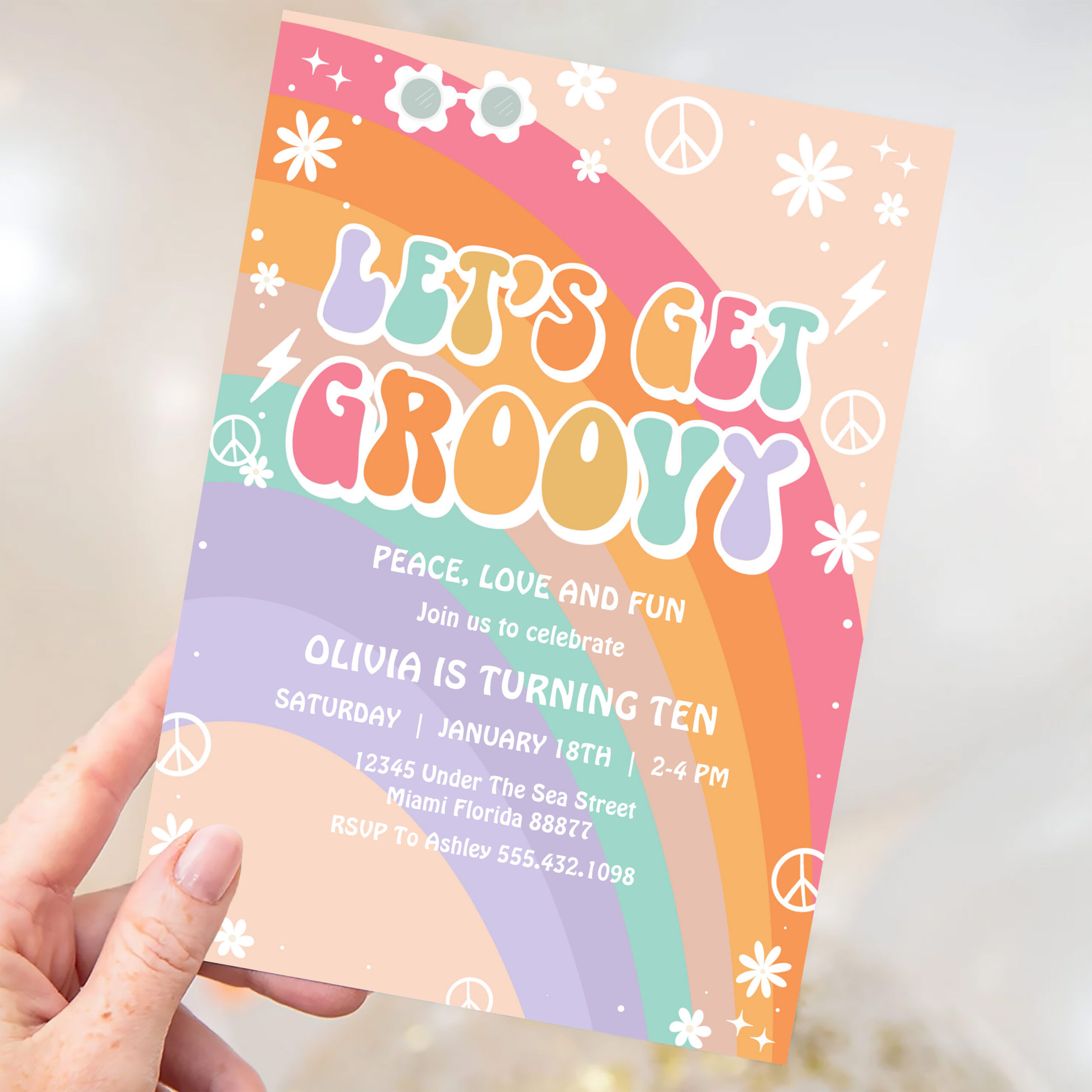 Lets Get Groovy Pink Rainbow Daisy Birthday Invitation