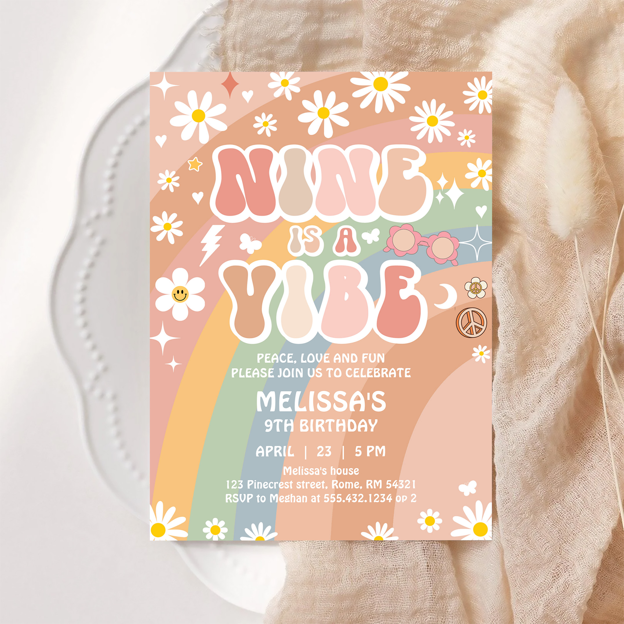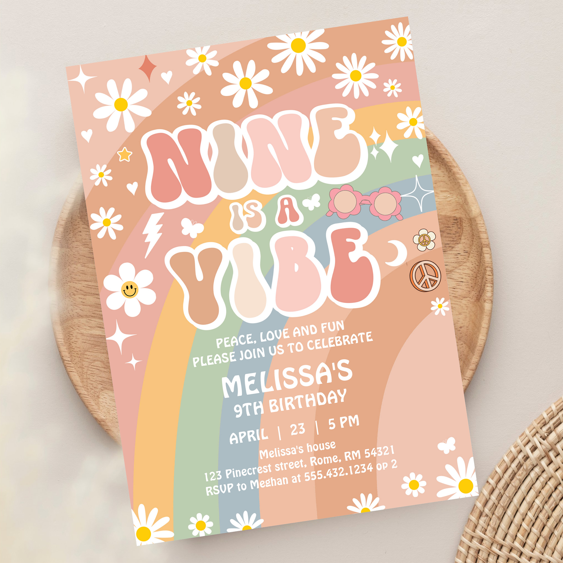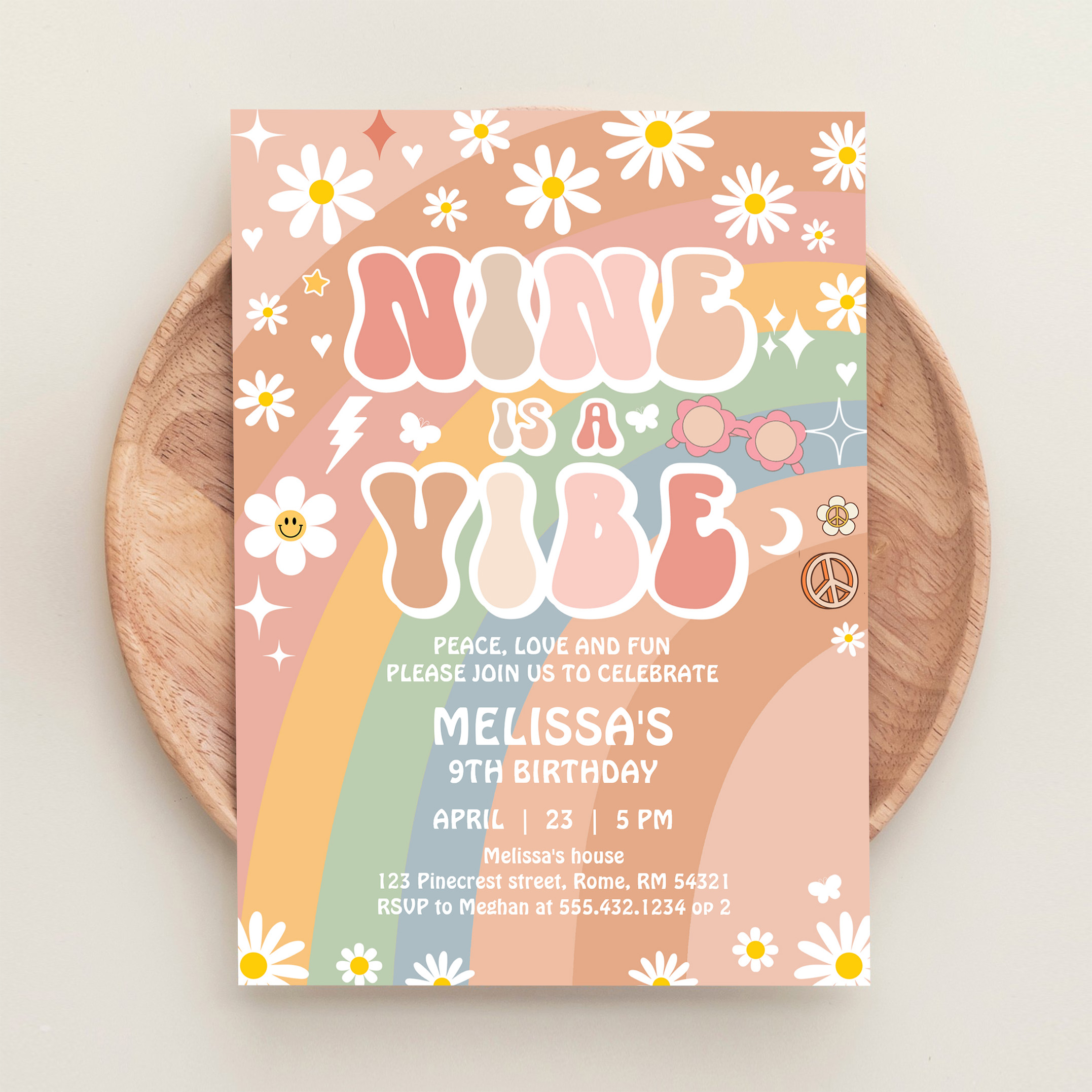 Nine Is A Vibe Groovy Retro 70S 9th Birthday Invitation