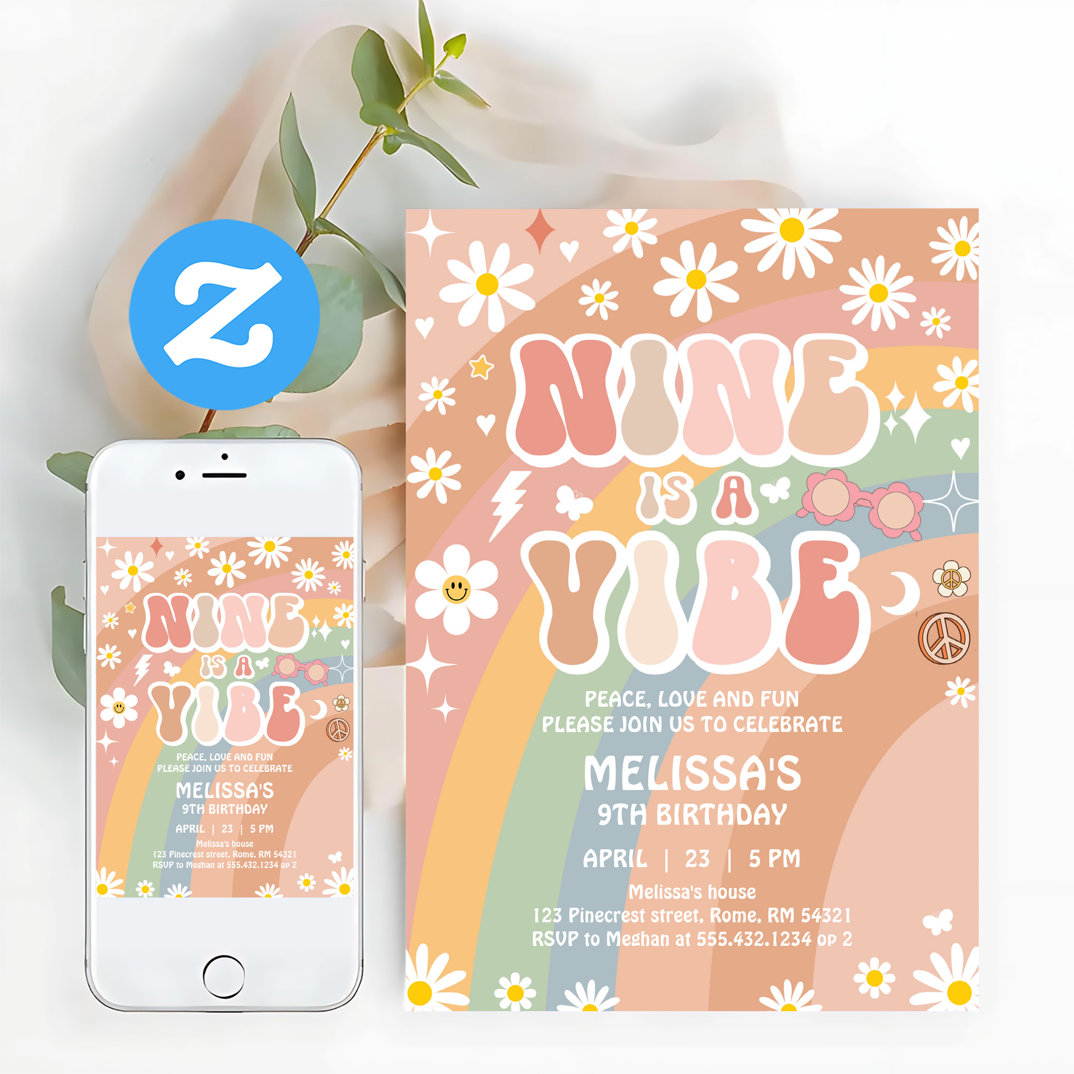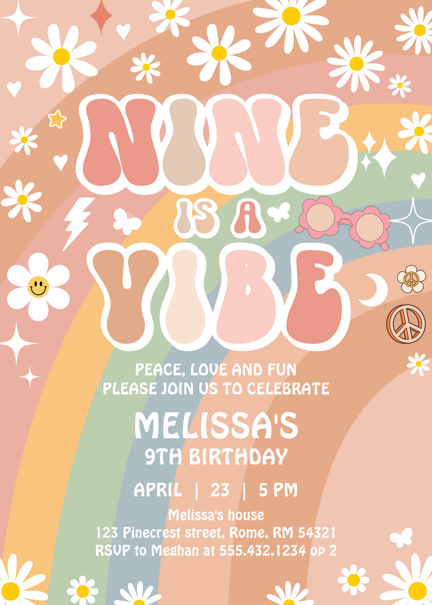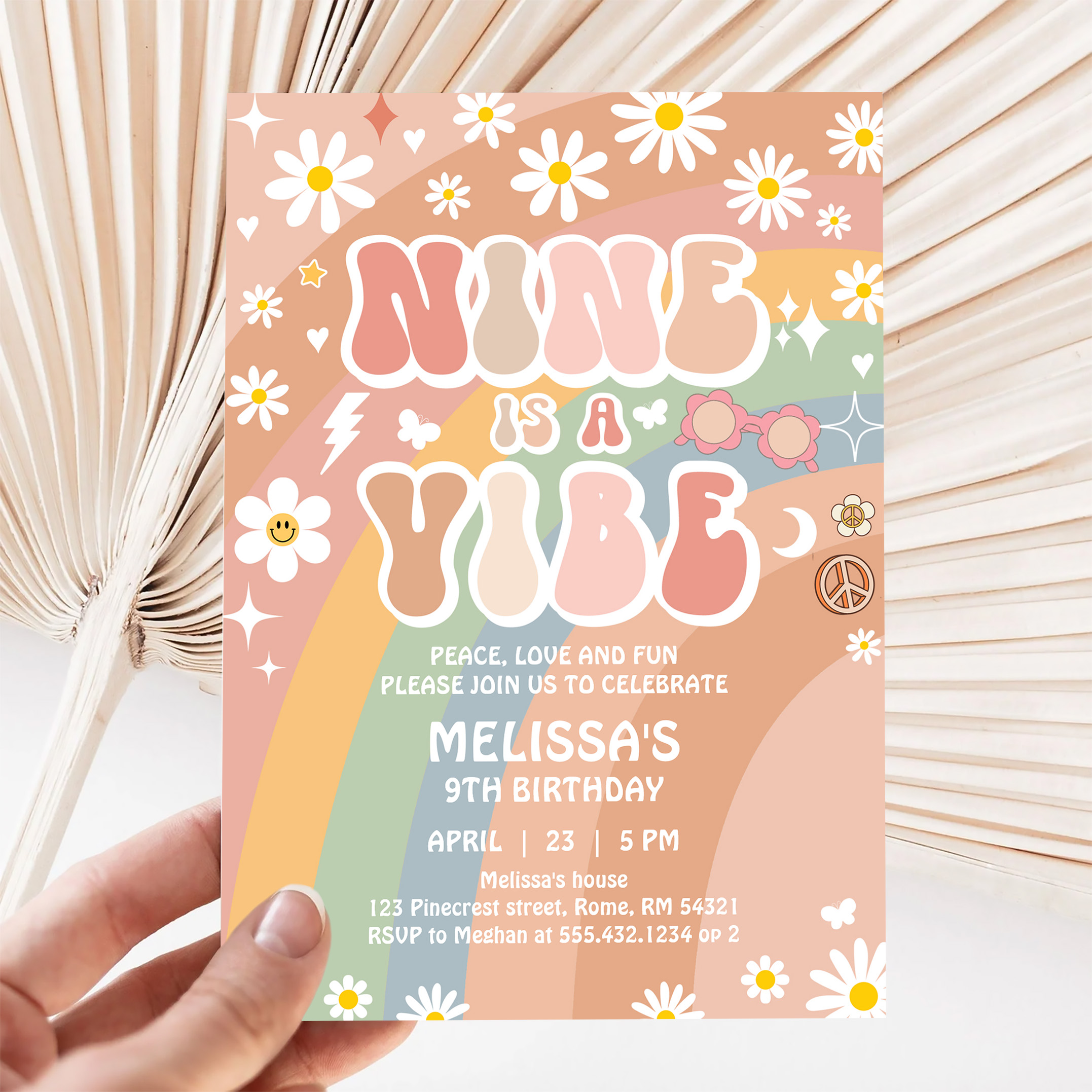 Nine Is A Vibe Groovy Retro 70S 9th Birthday Invitation