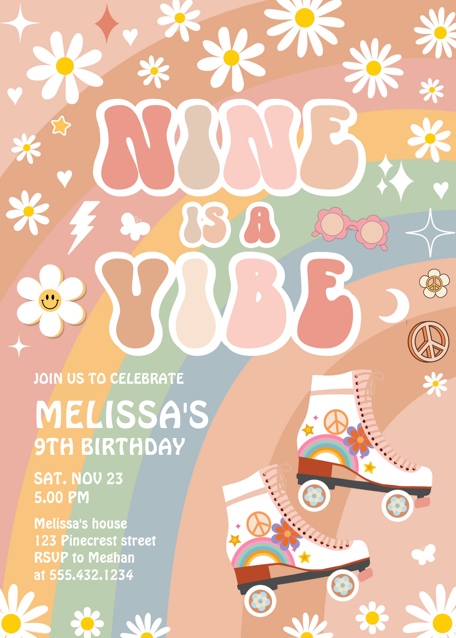 Nine Is A Vibe Groovy Roller Skate 9th Birthday Invitation