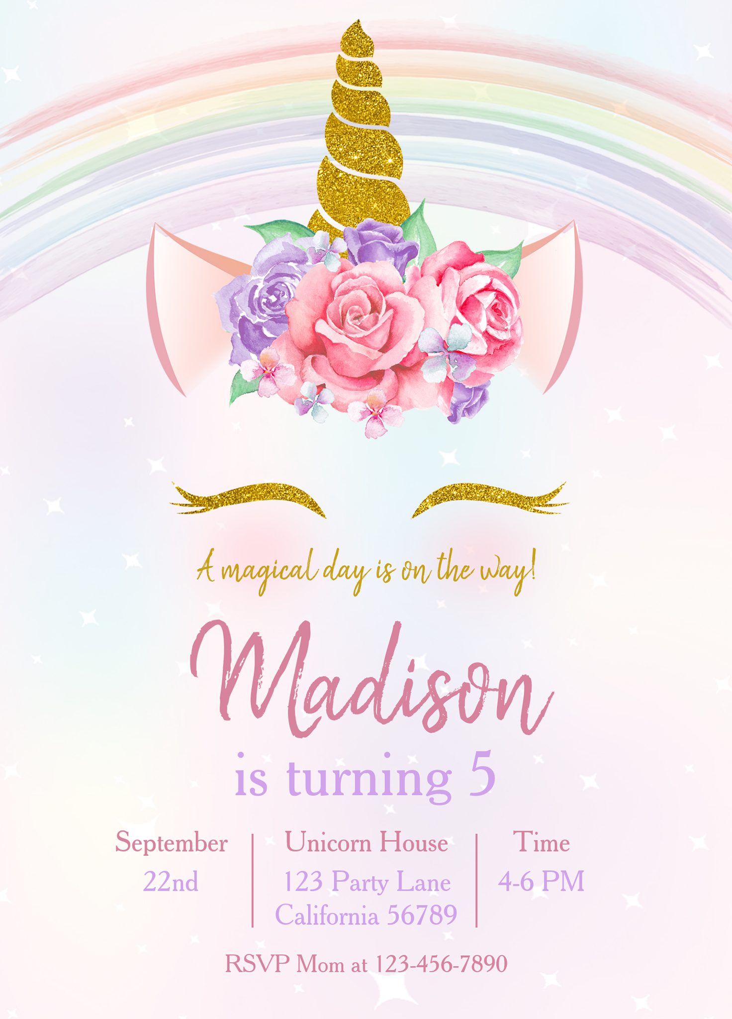 Rainbow Unicorn Party Girl Birthday Invitation