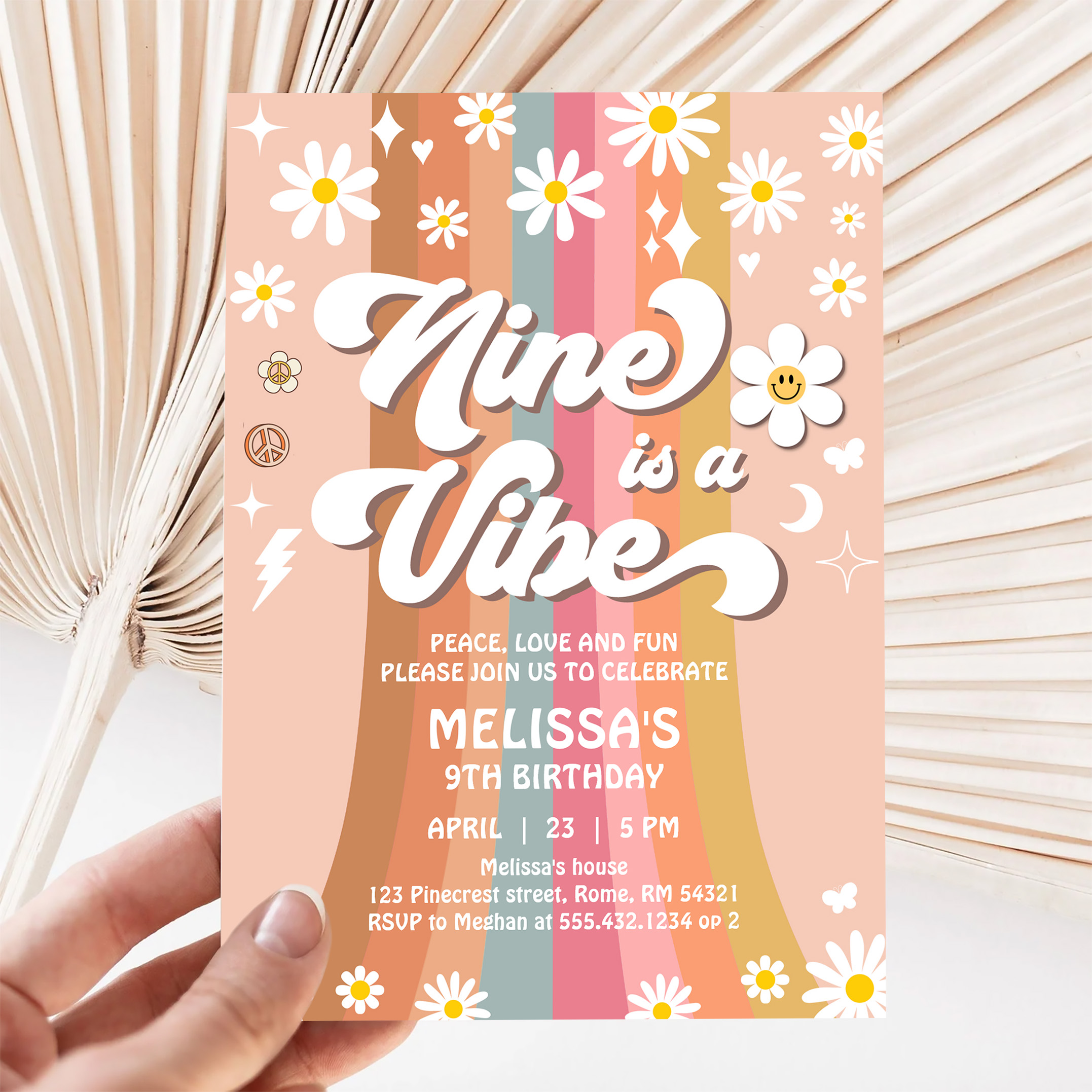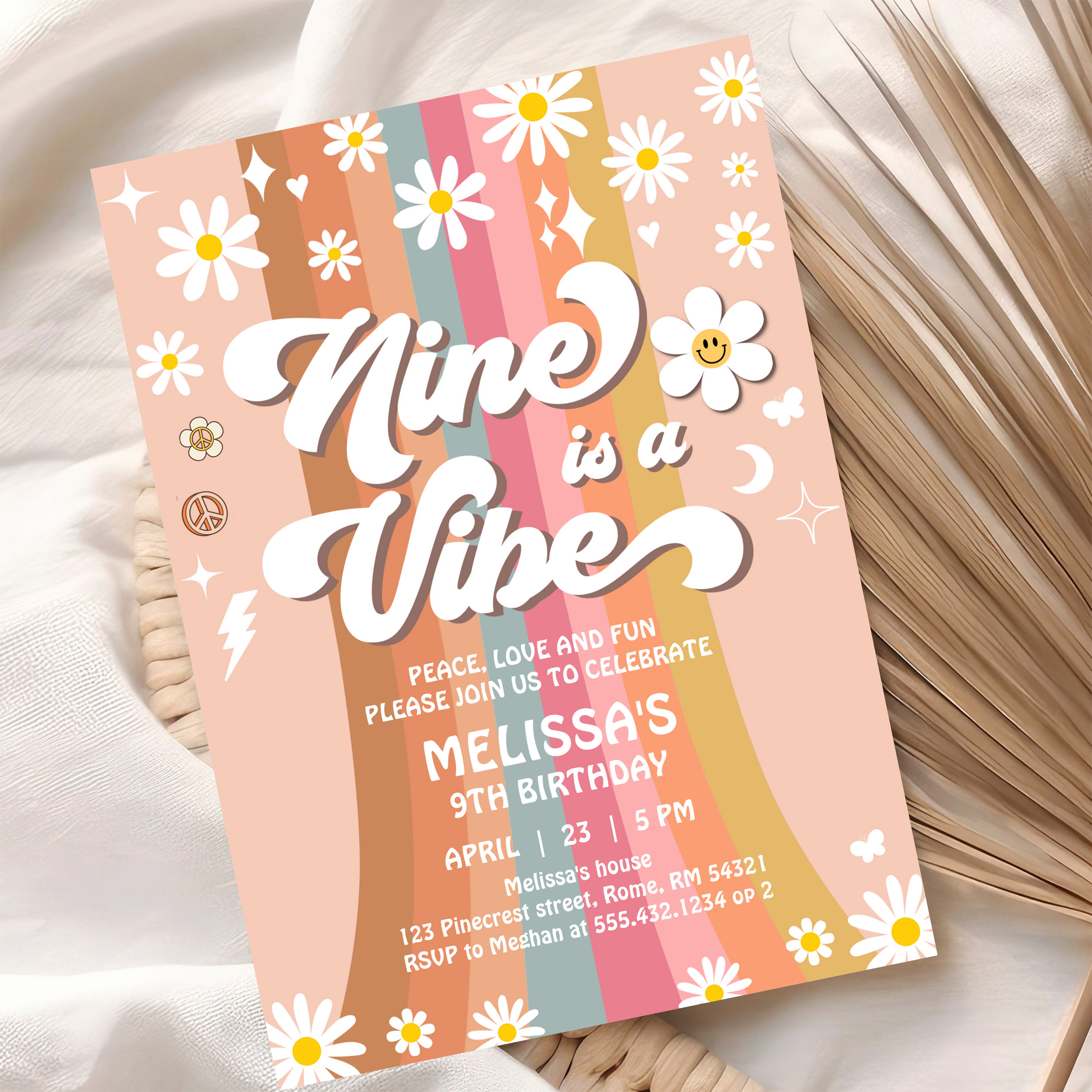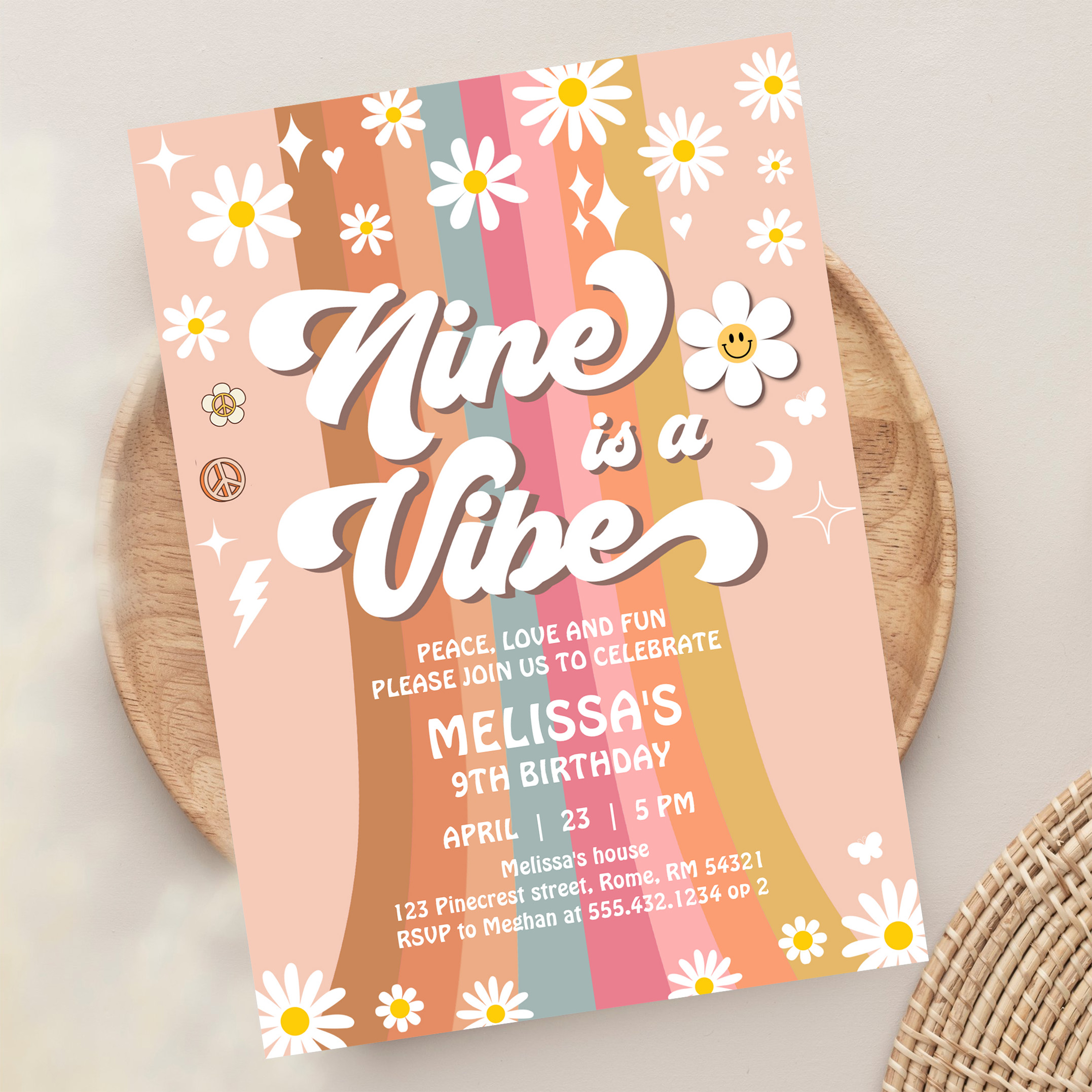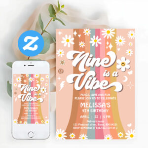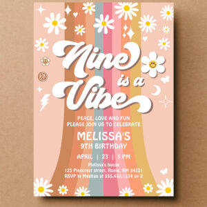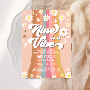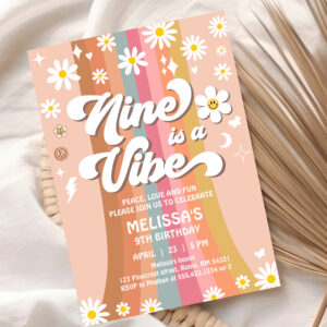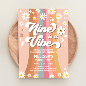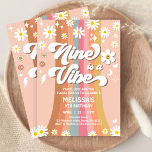Retro Nine Is A Vibe Groovy Rainbow 9th Birthday Invitation