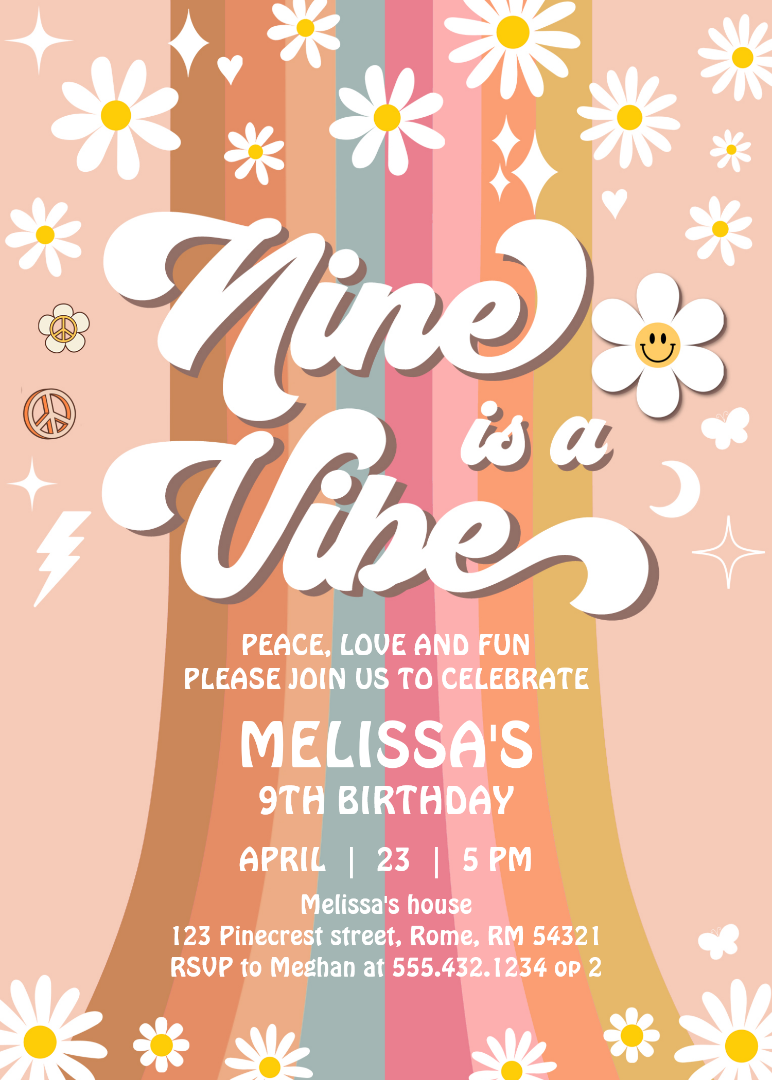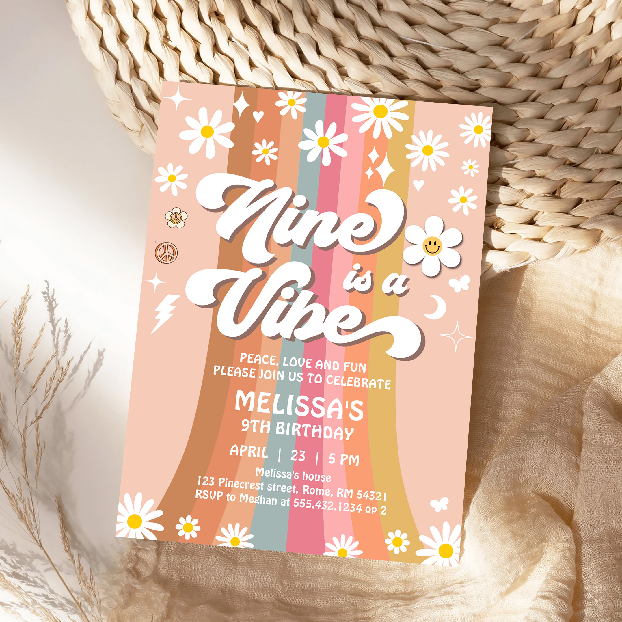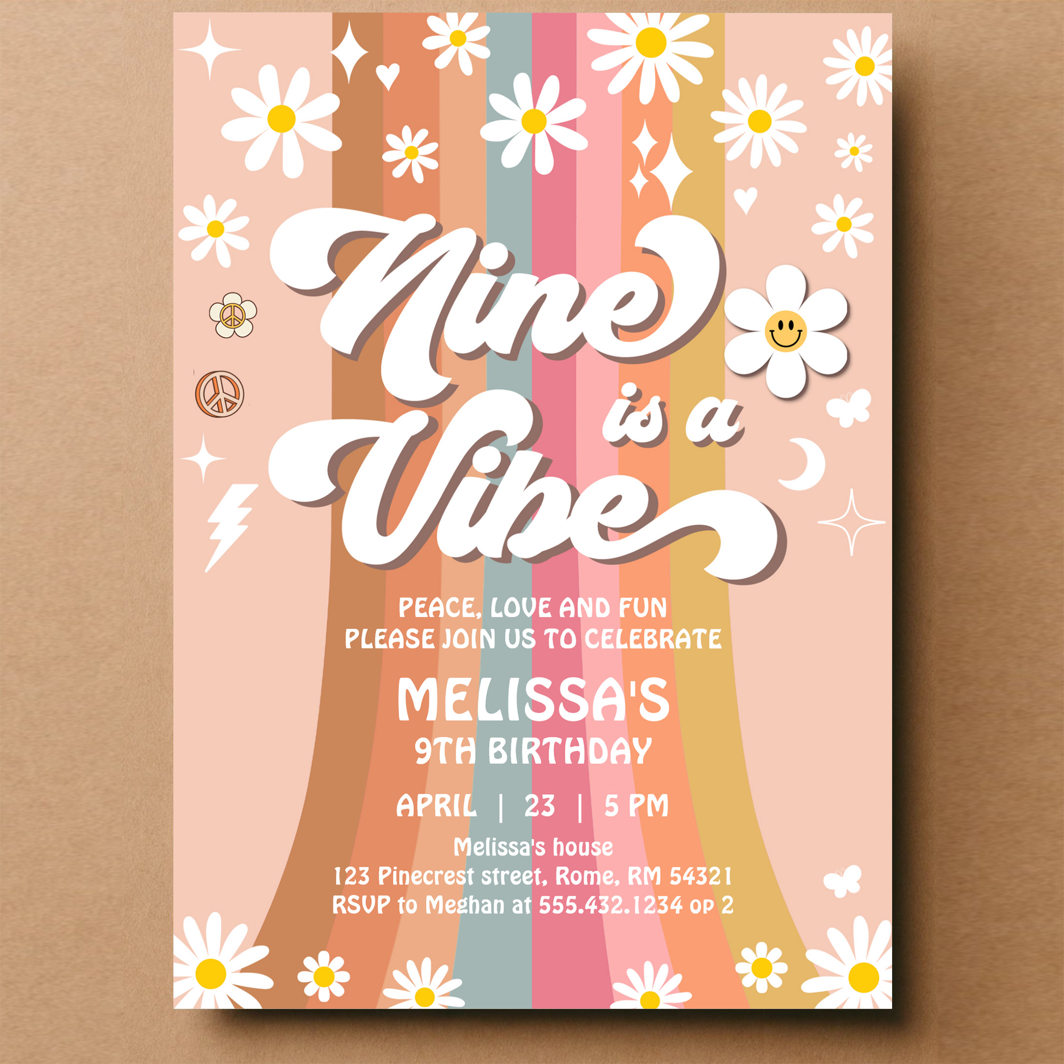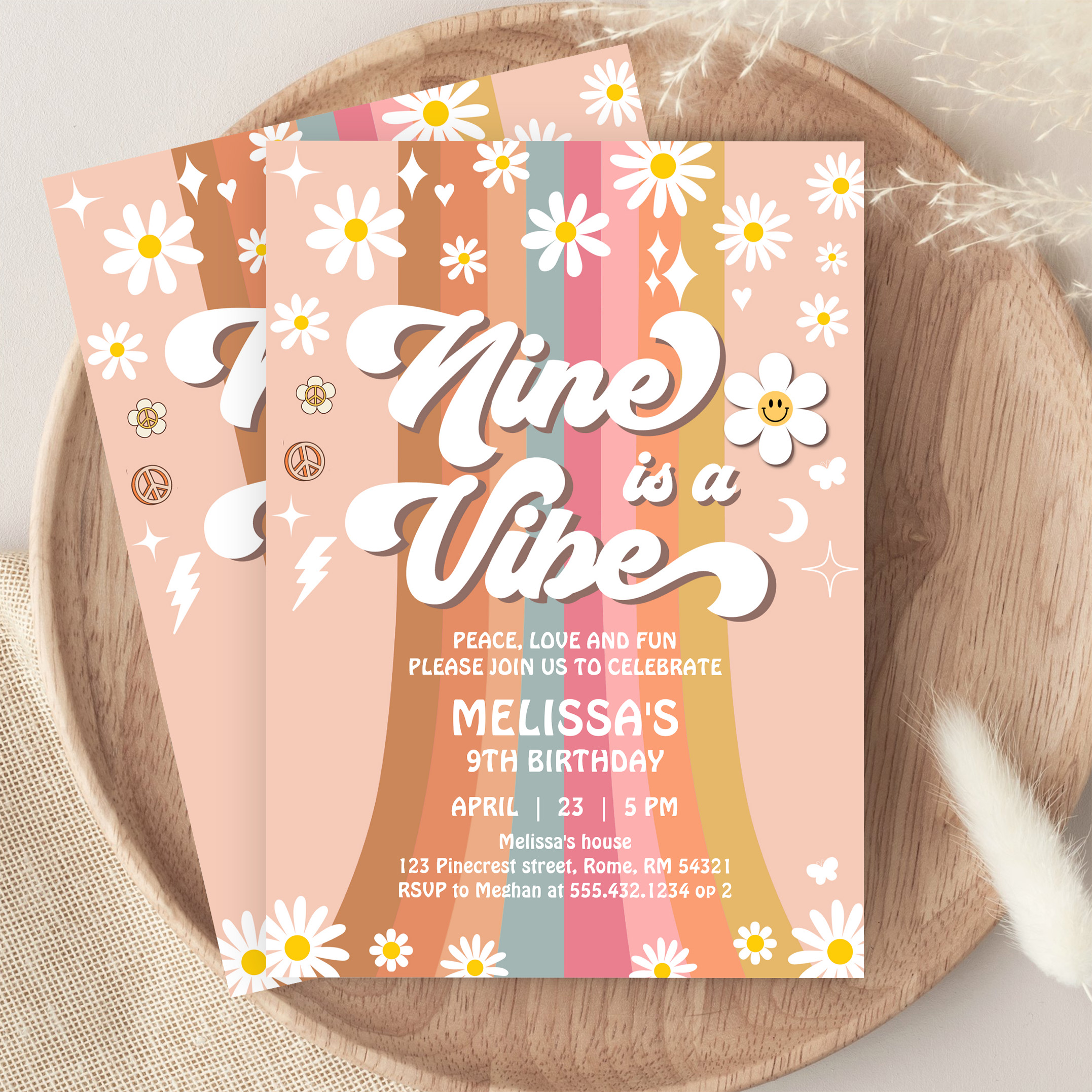 Retro Nine Is A Vibe Groovy Rainbow 9th Birthday Invitation