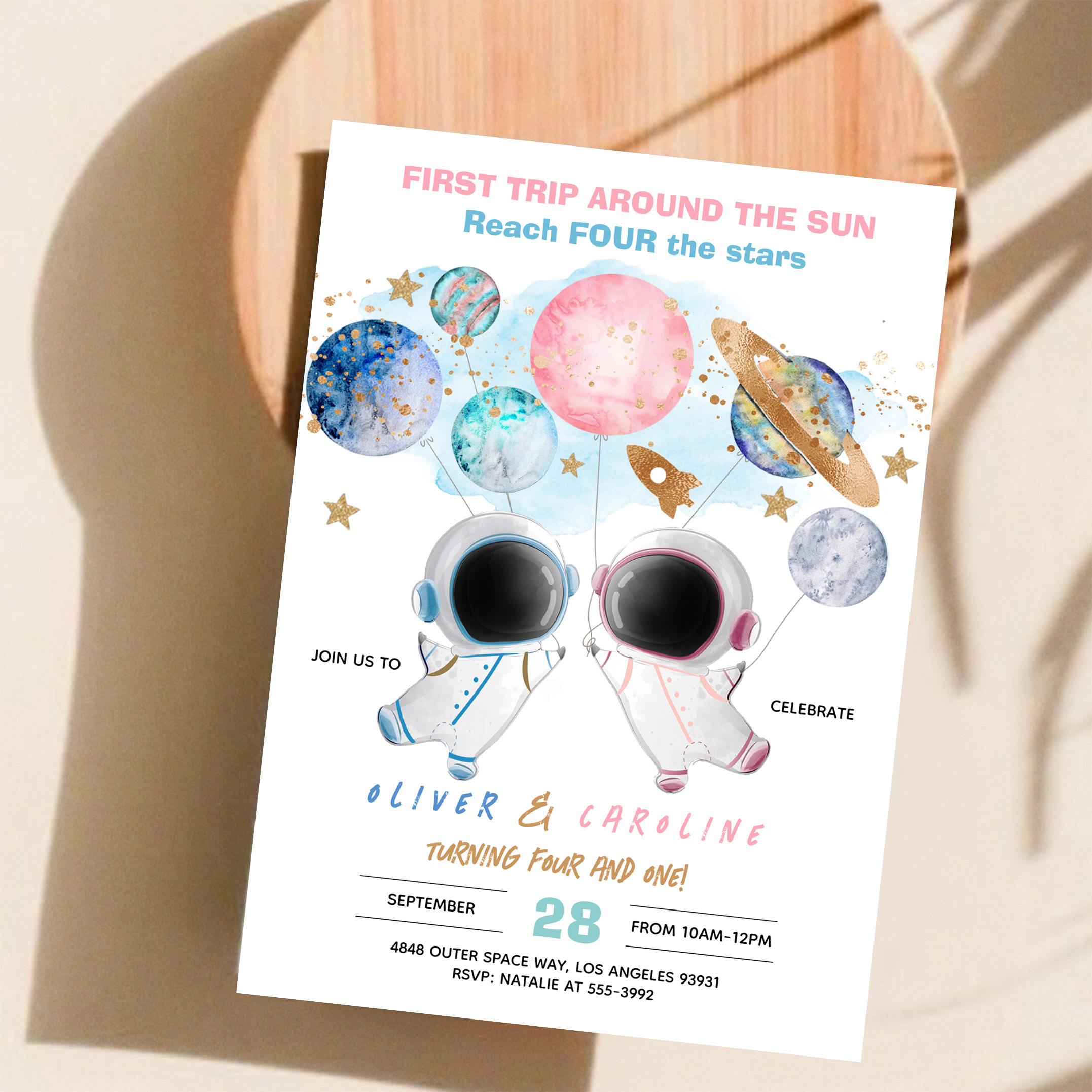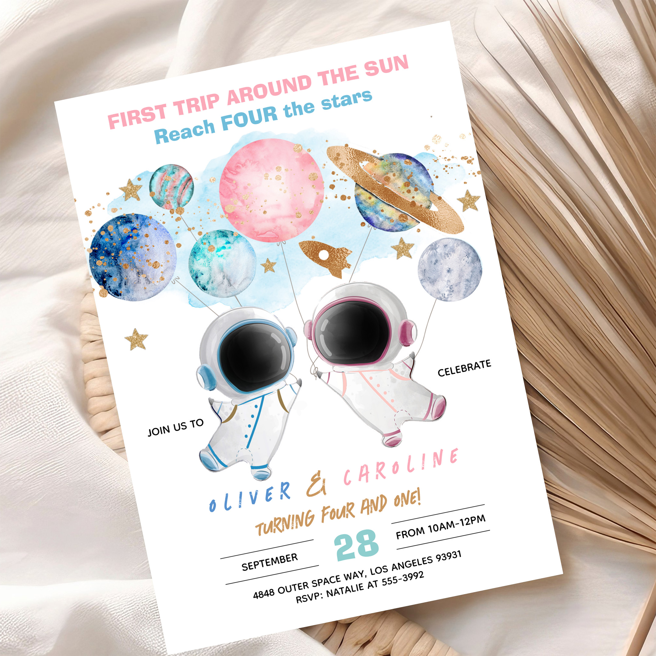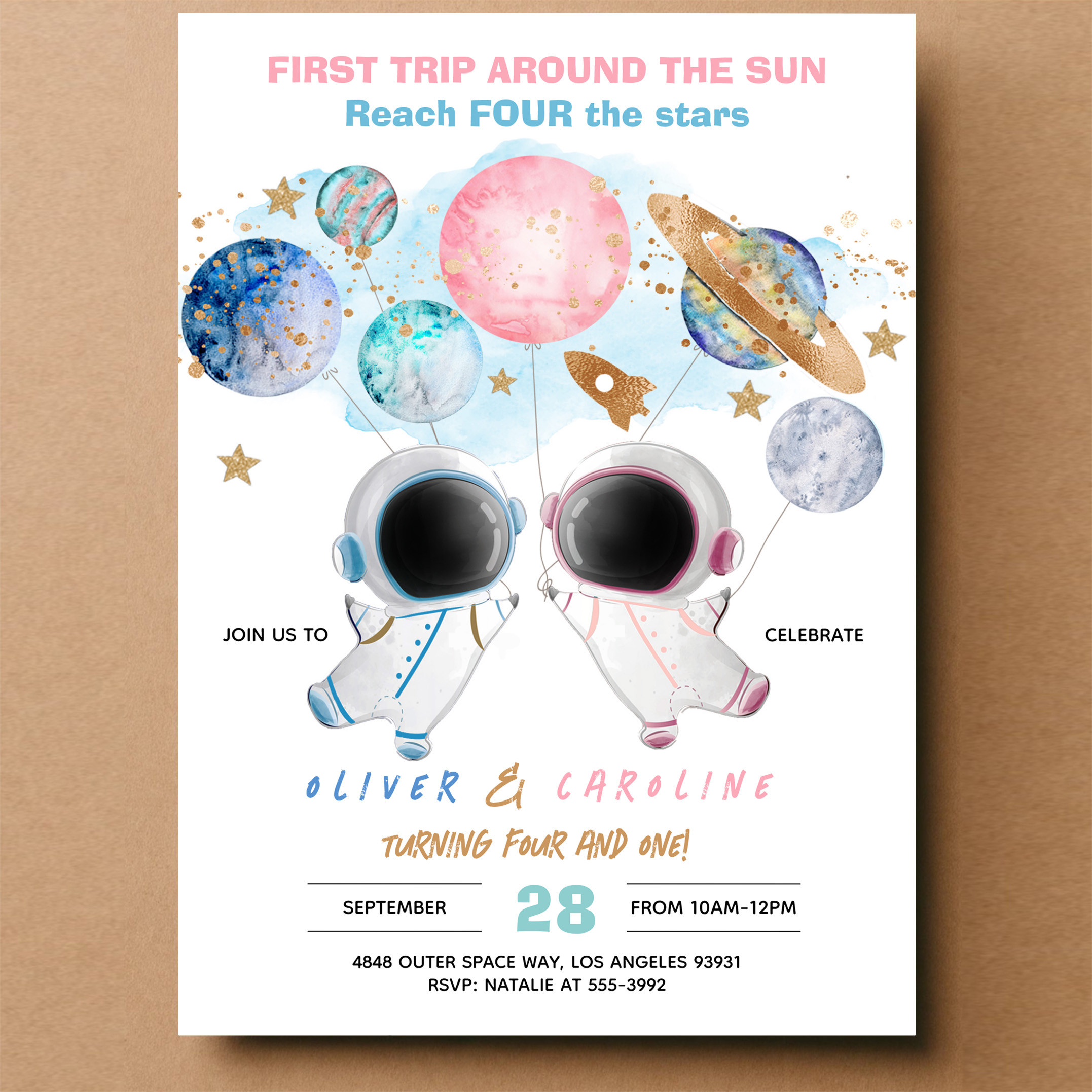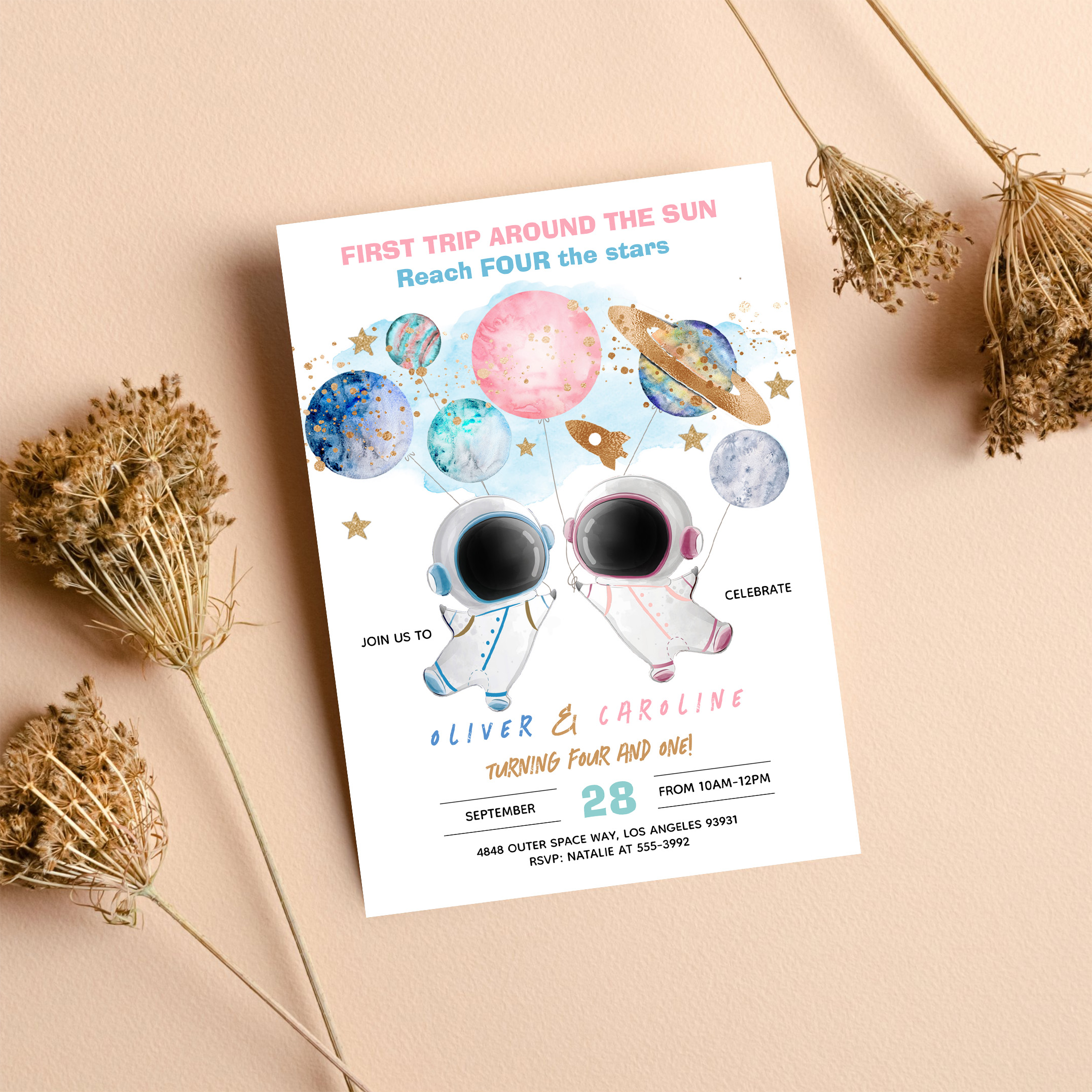 Siblings Dual Party Boy Girl Astronaut Birthday Invitation