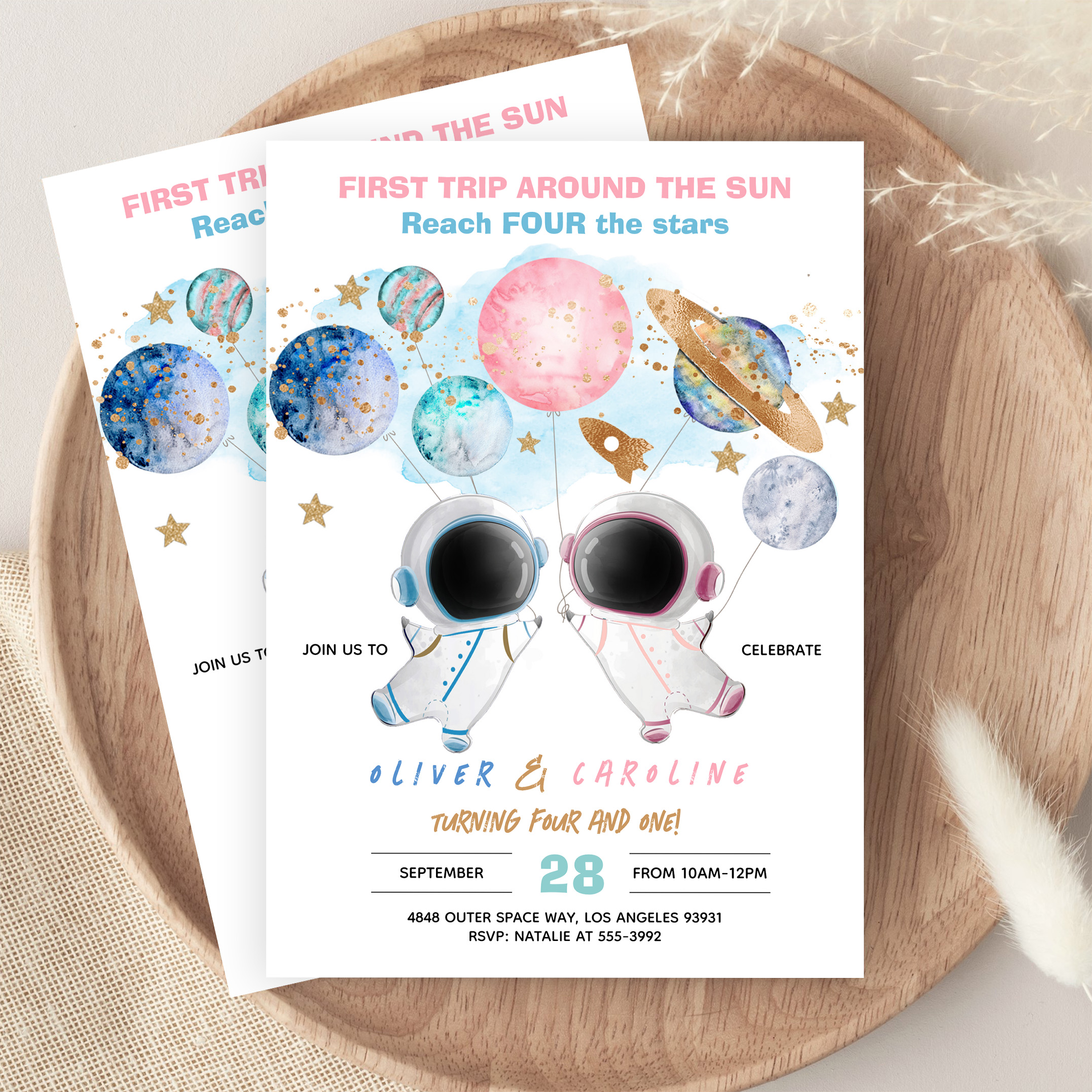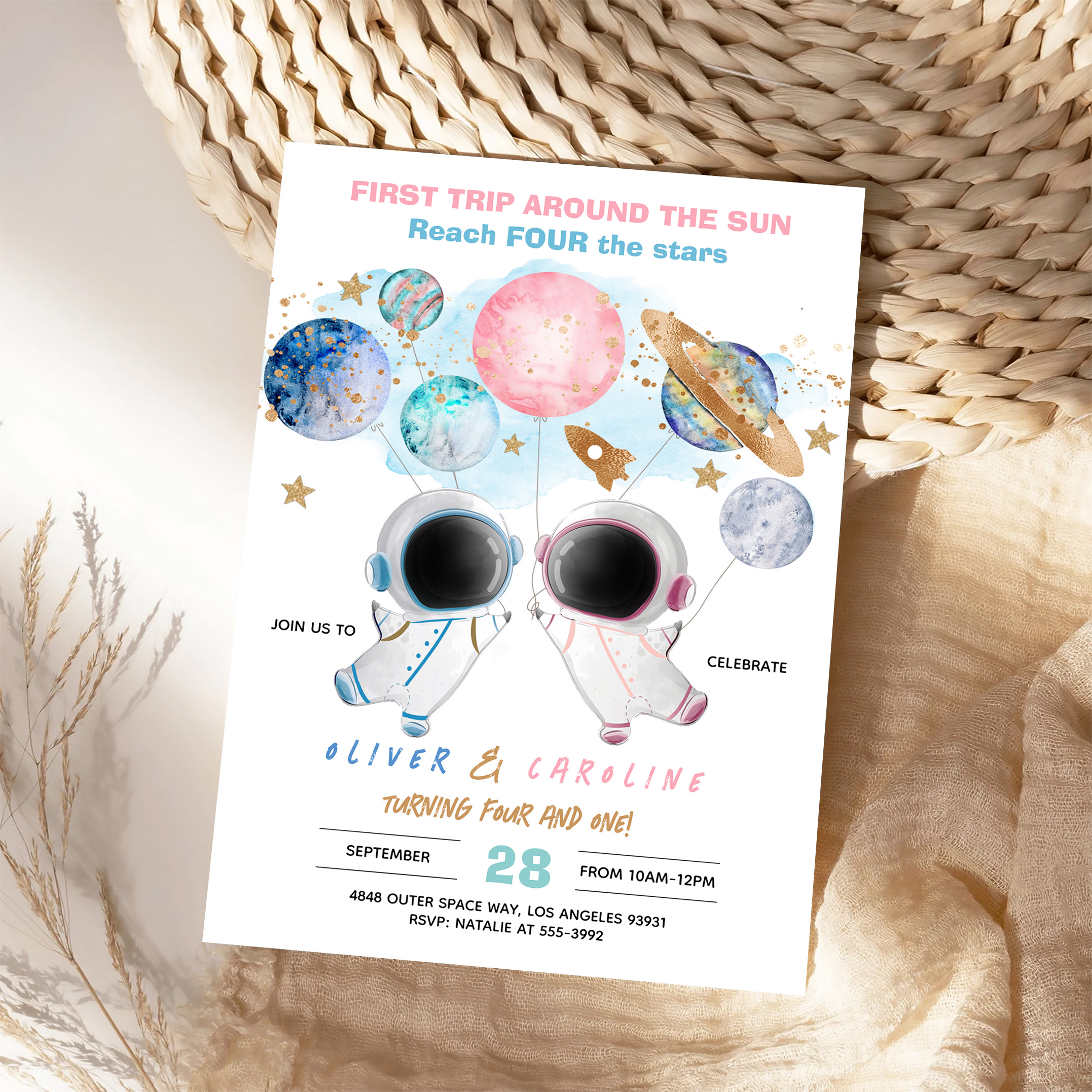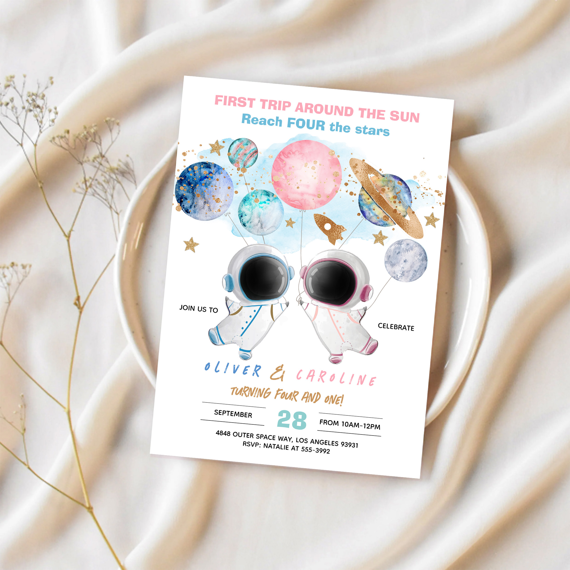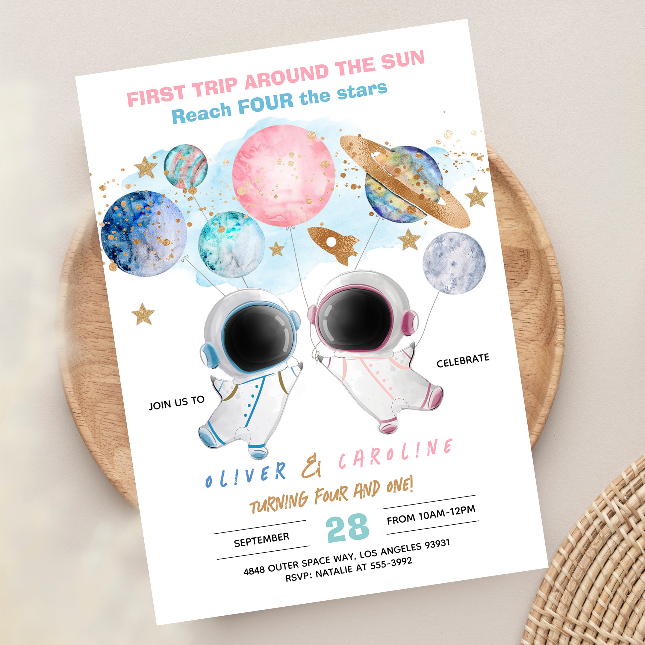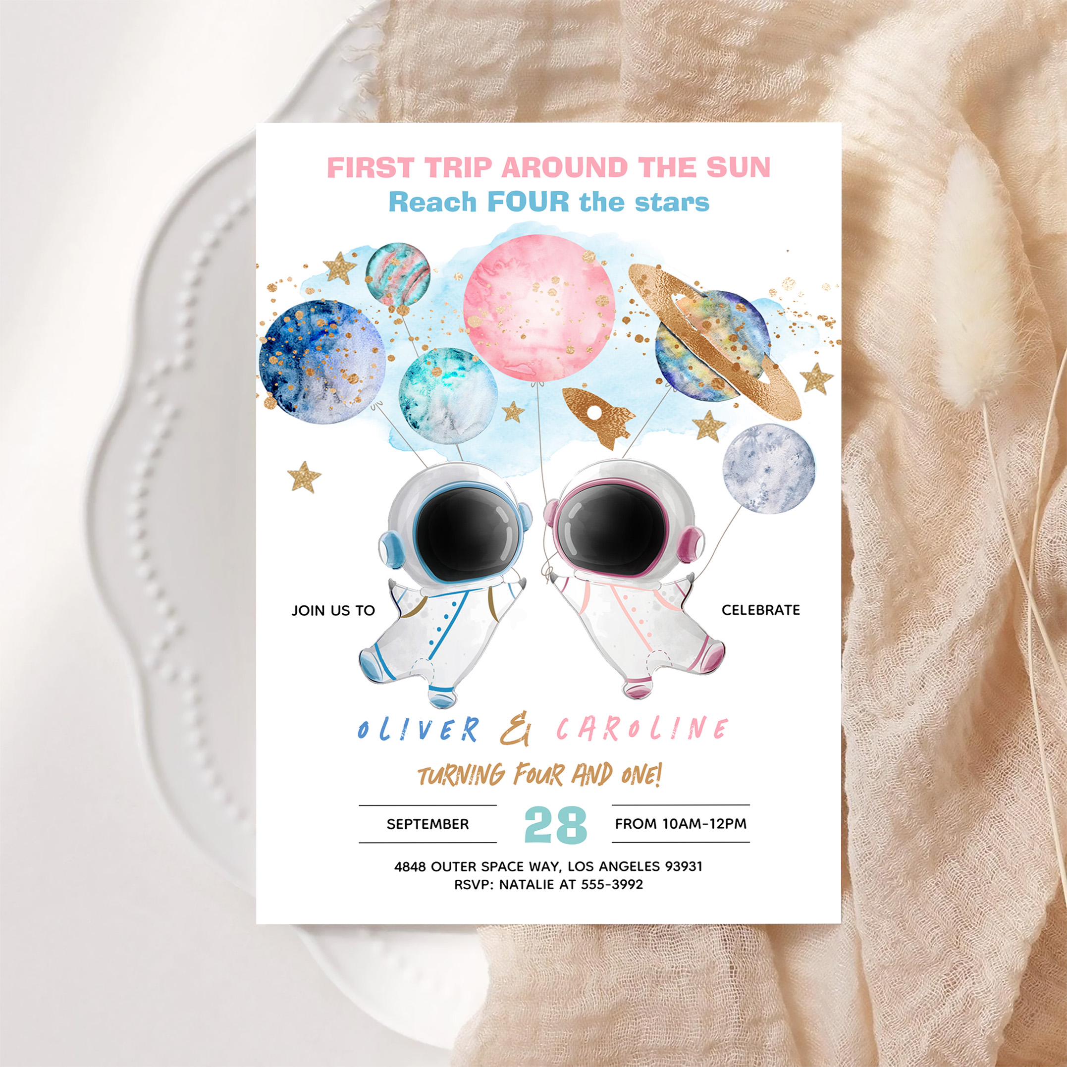 Siblings Dual Party Boy Girl Astronaut Birthday Invitation