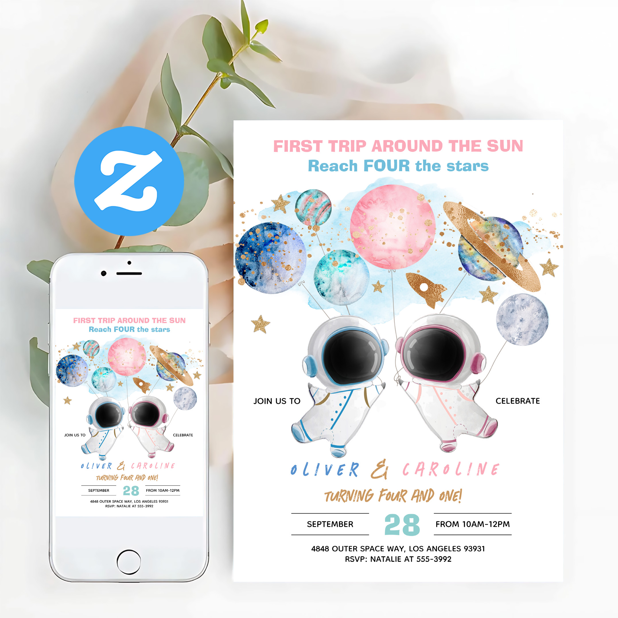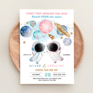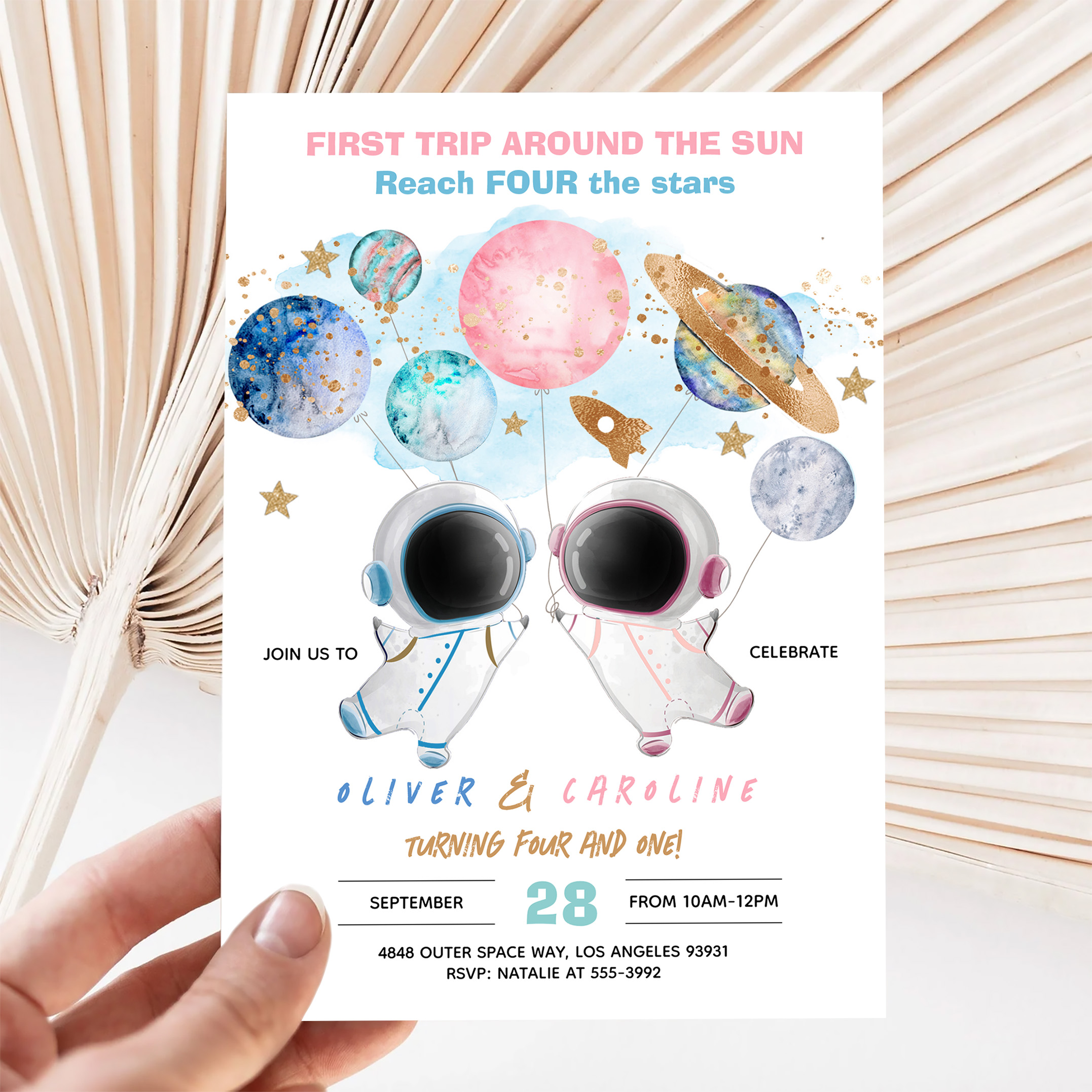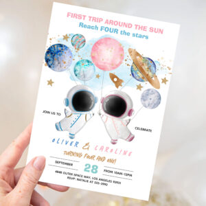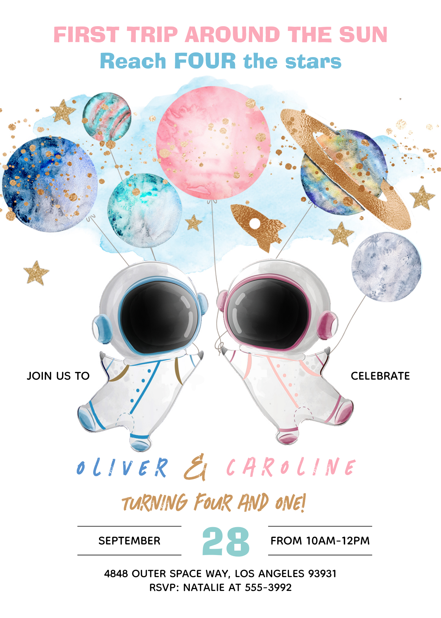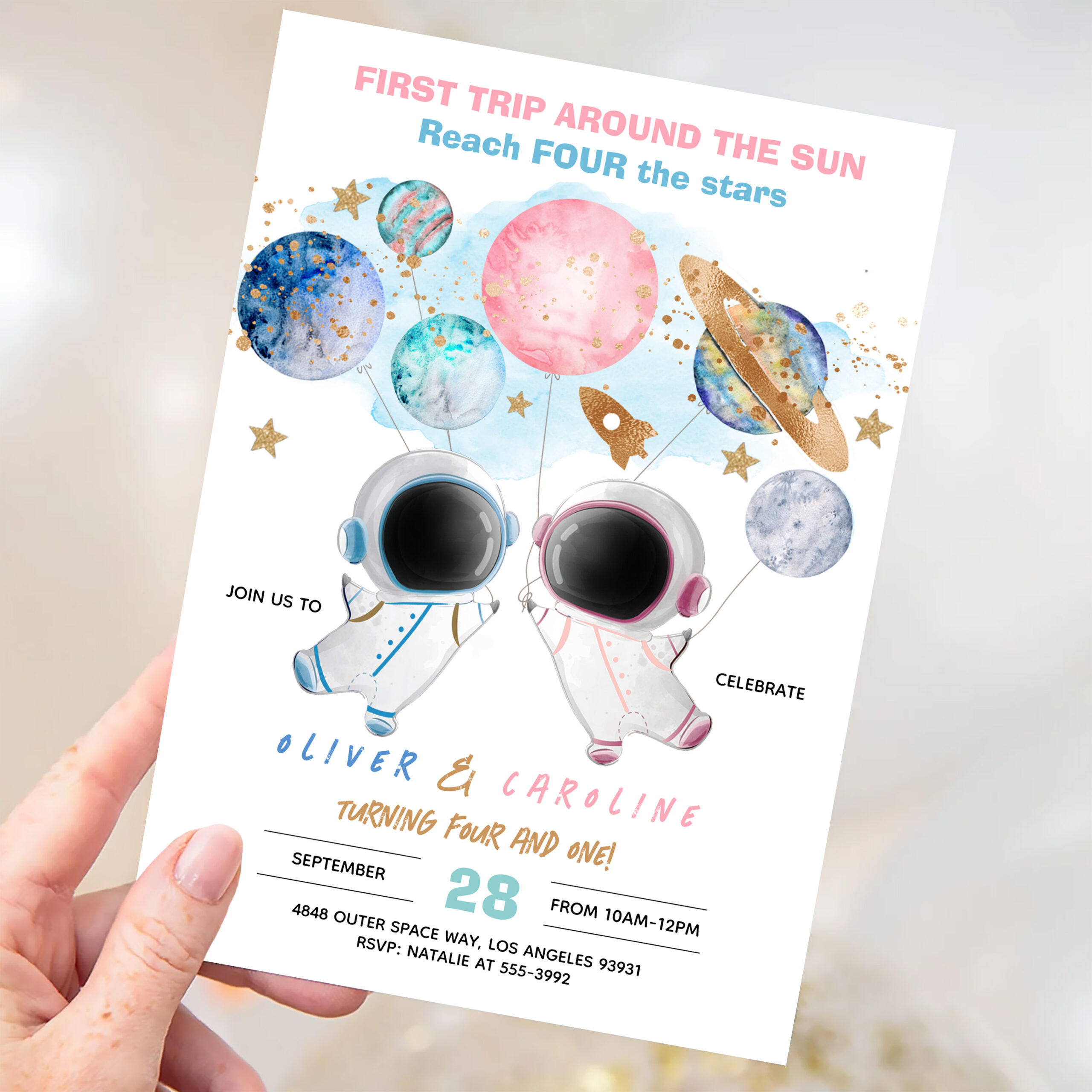 Siblings Dual Party Boy Girl Astronaut Birthday Invitation