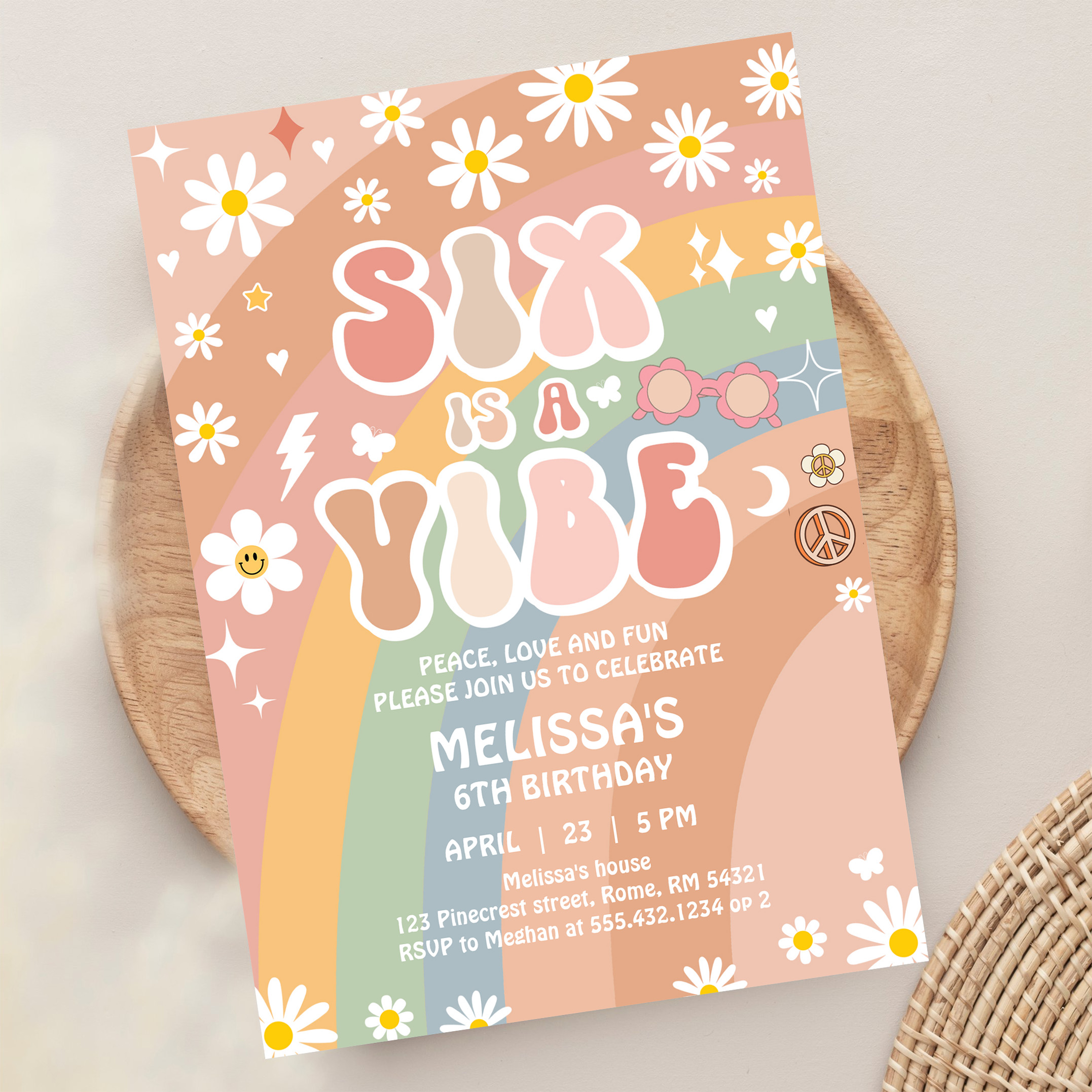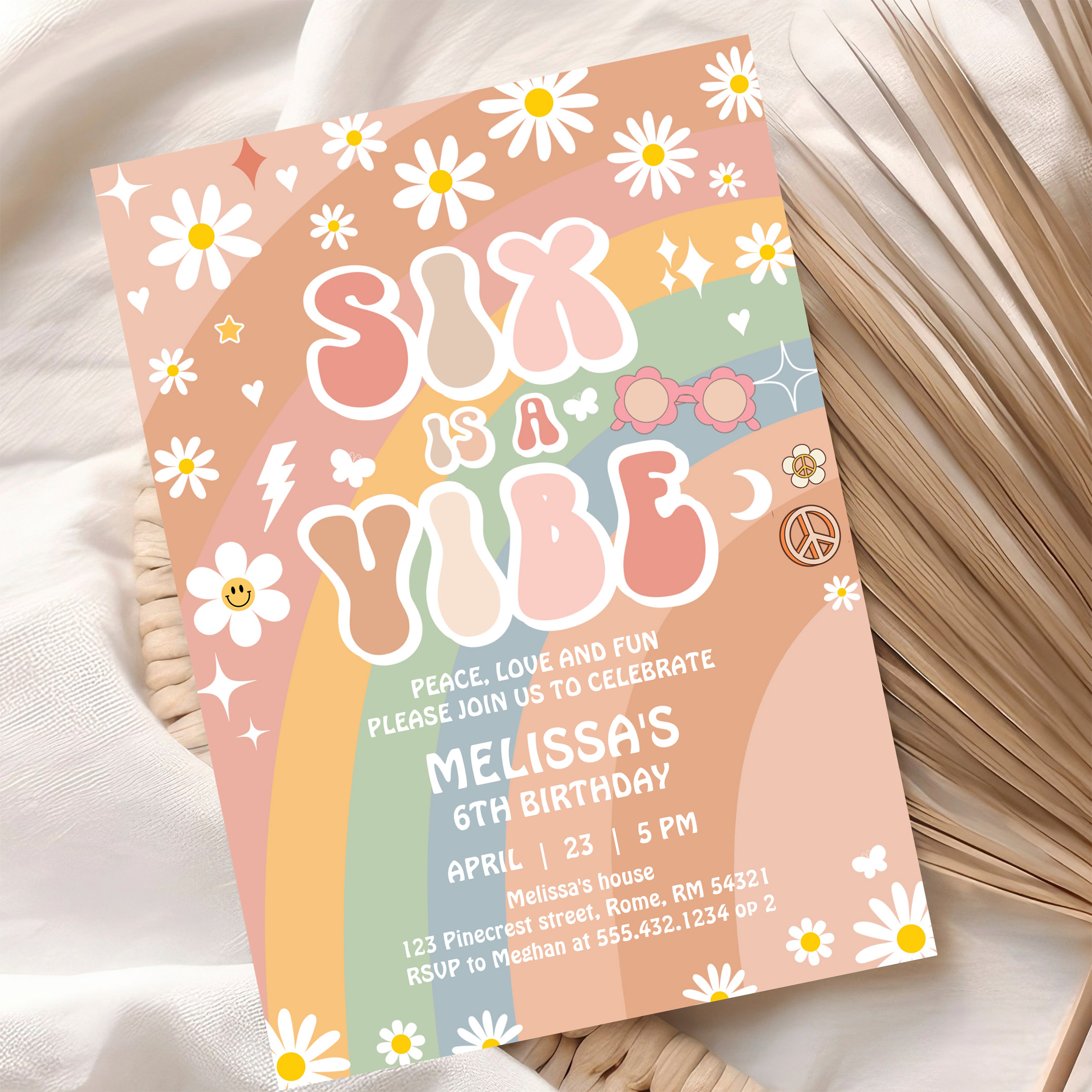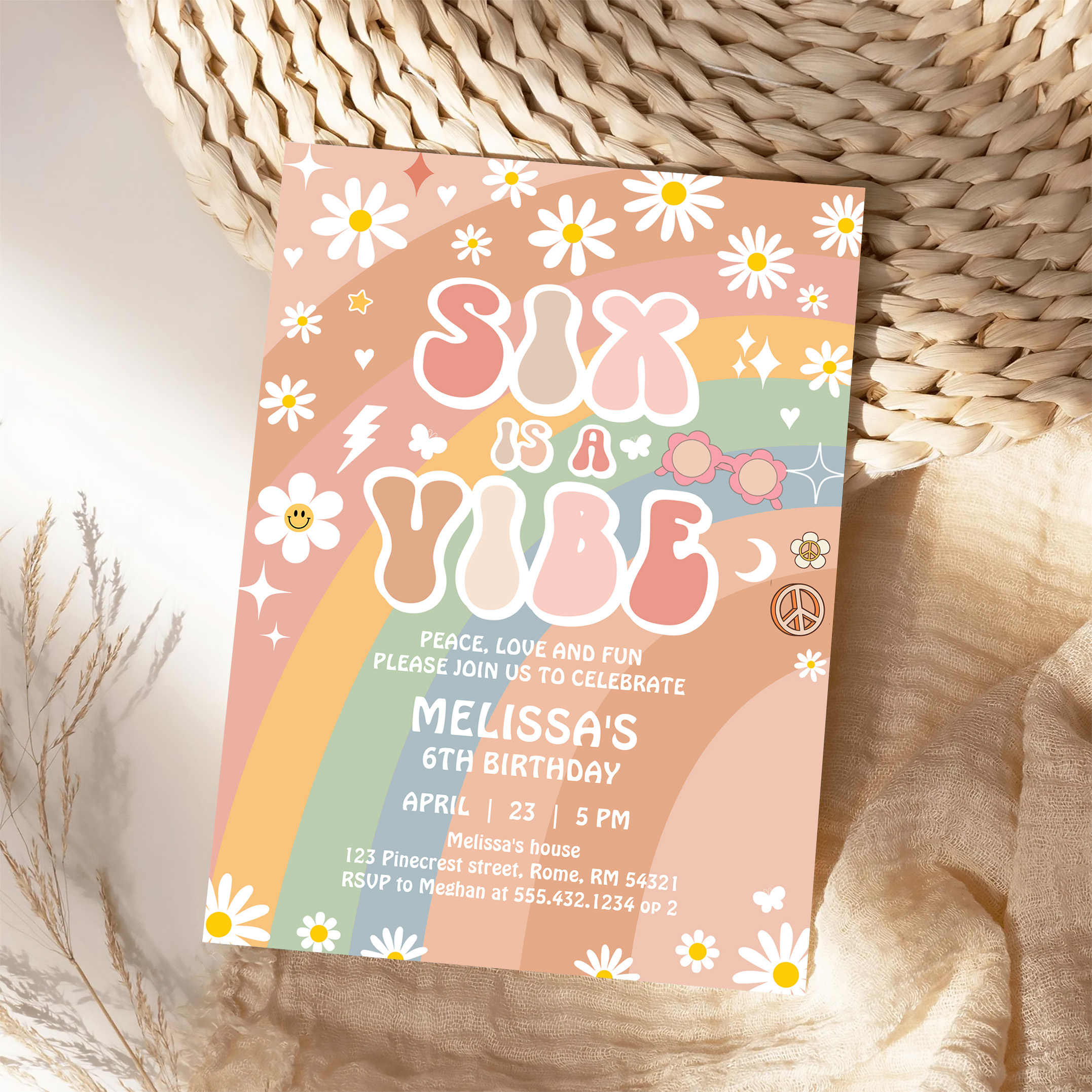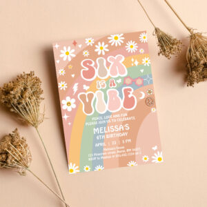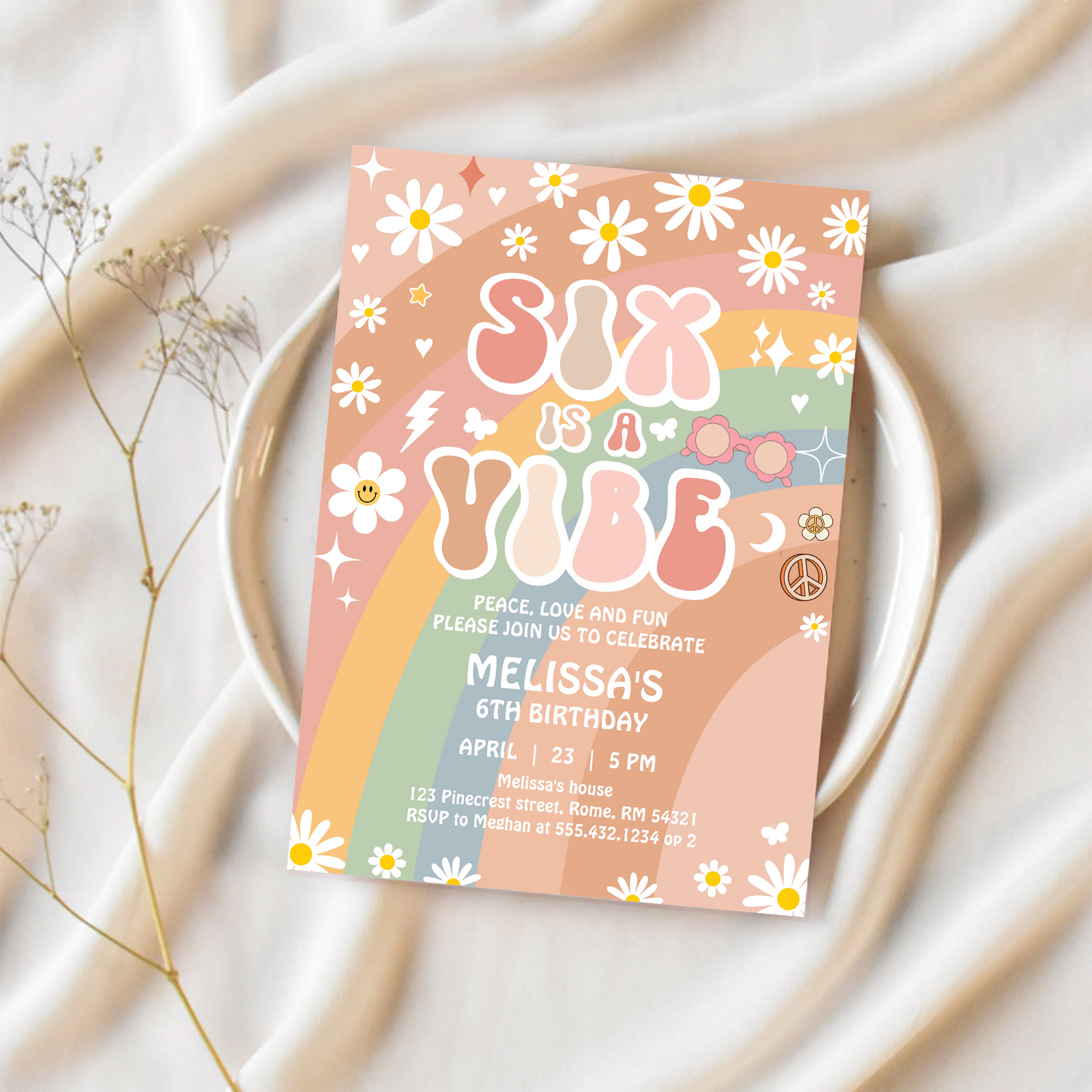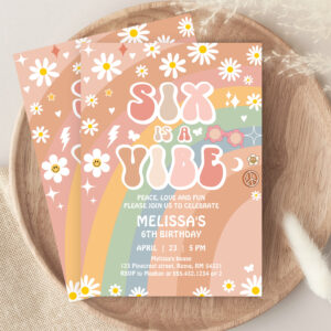 Six Is A Vibe Groovy Retro 70S 6th Birthday Invitation