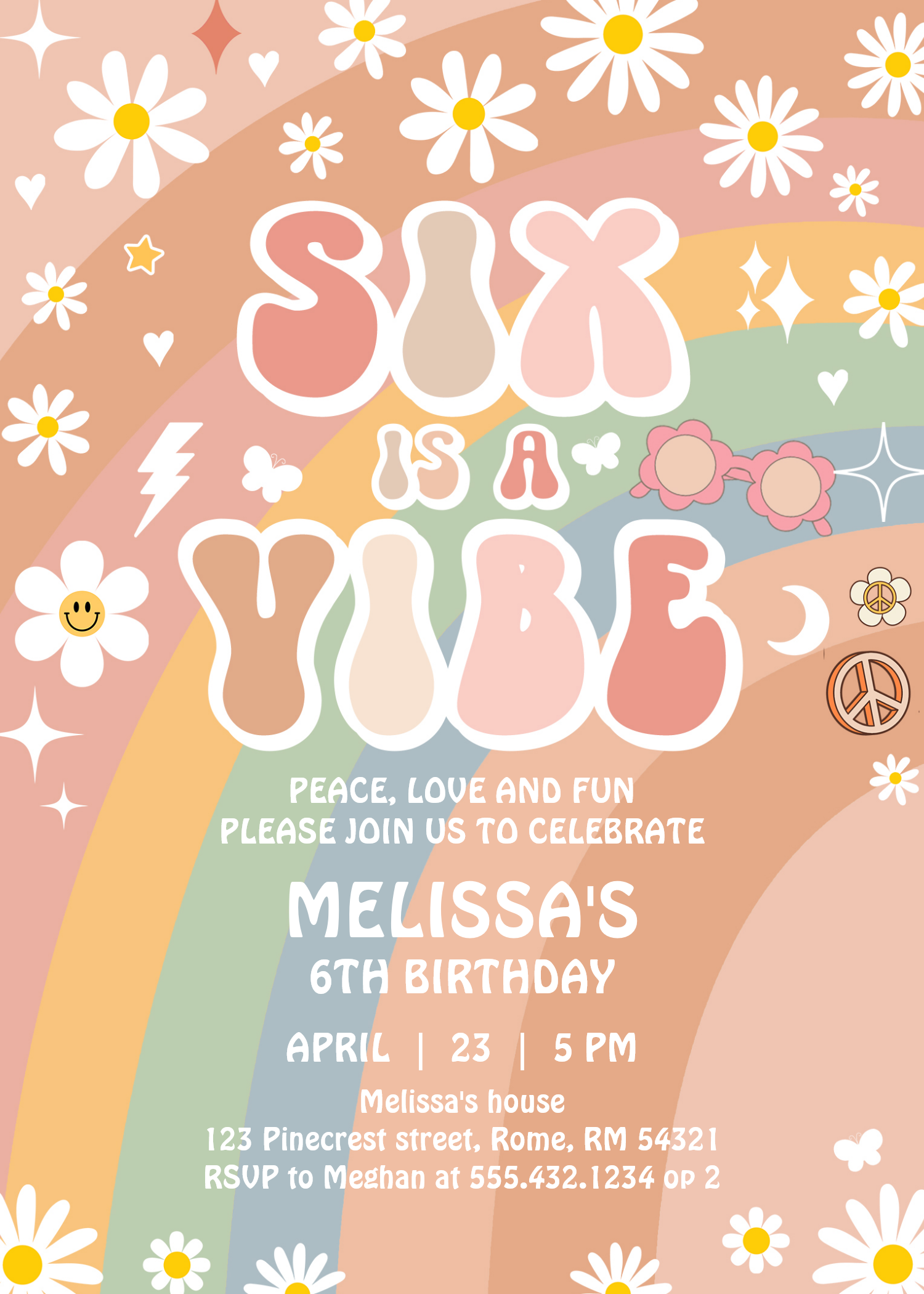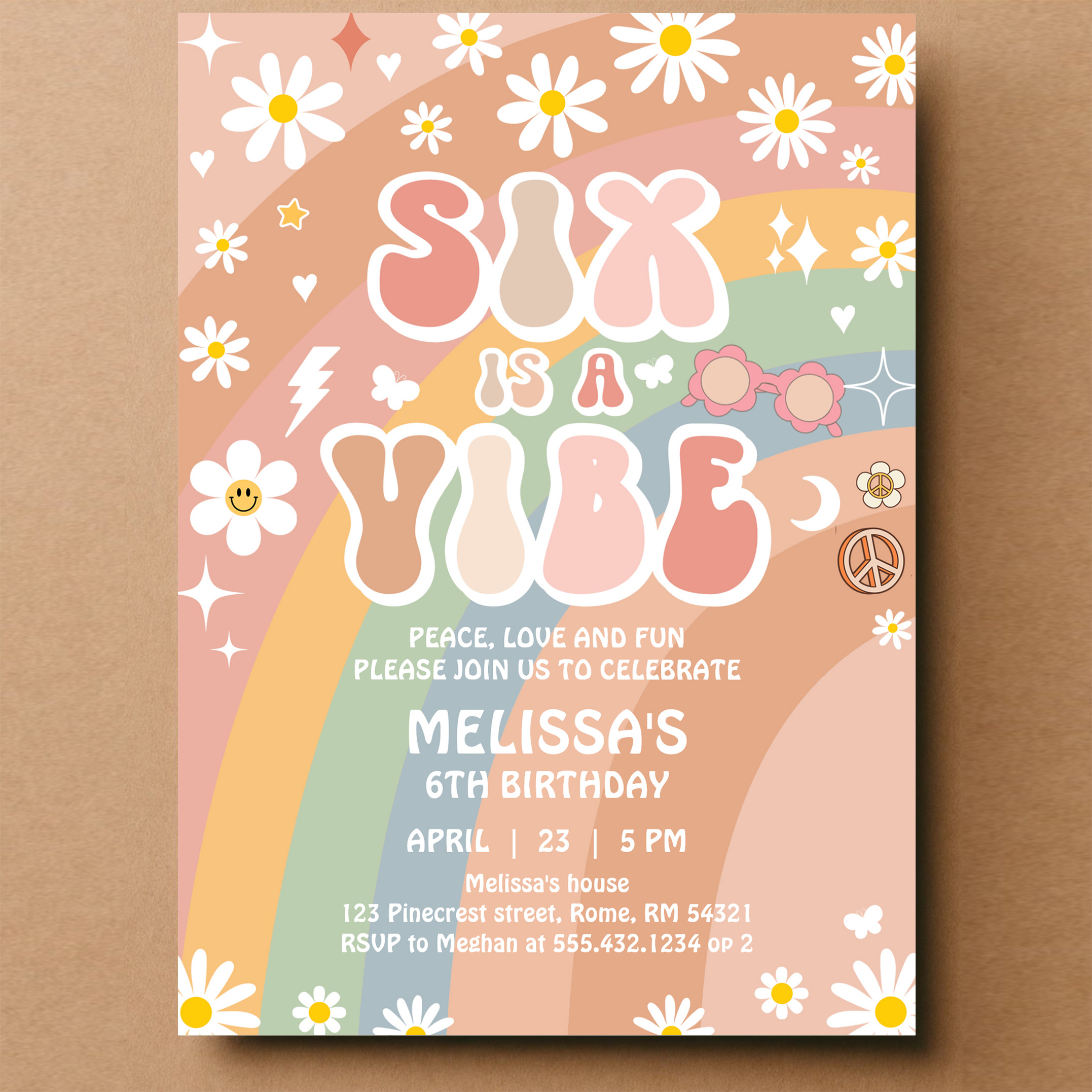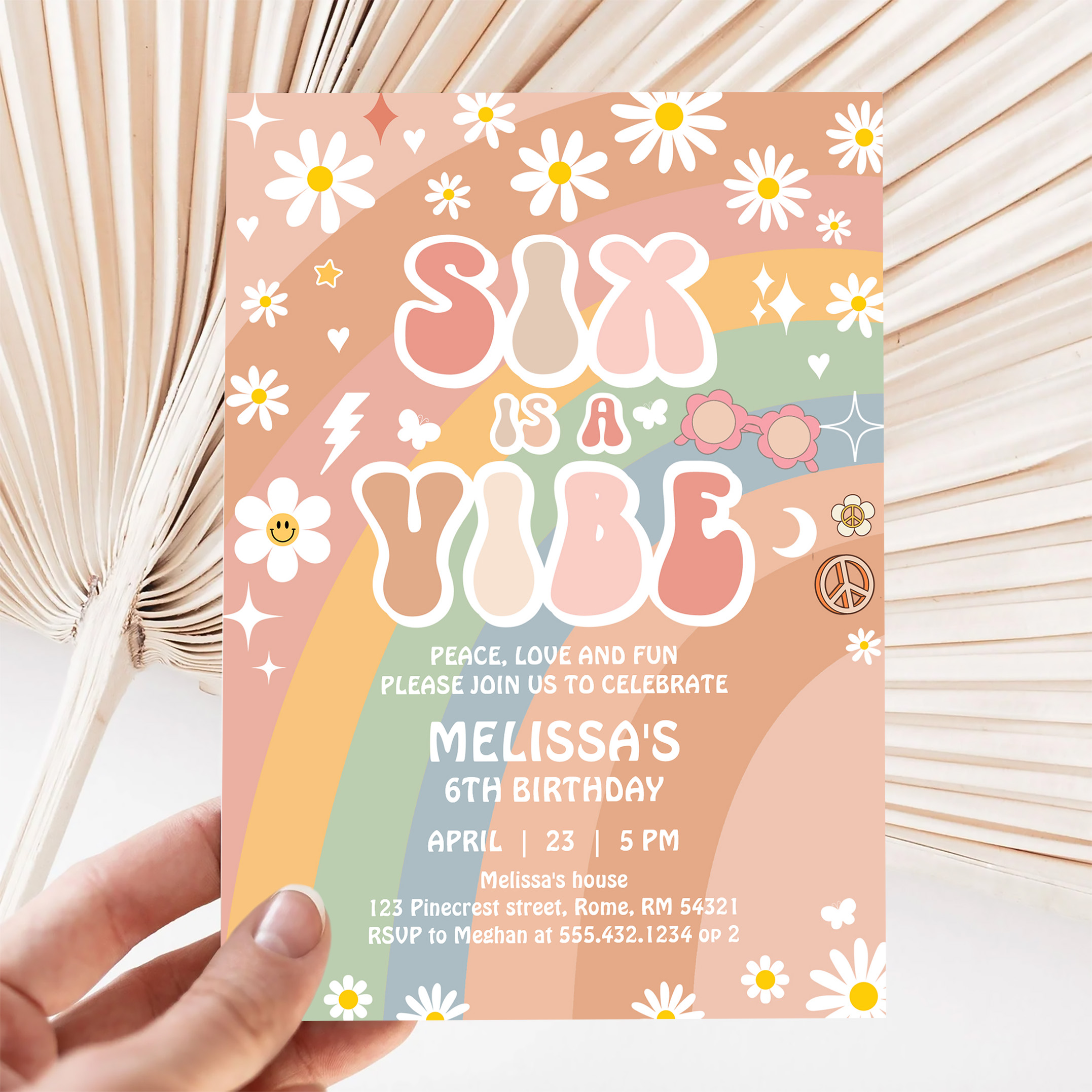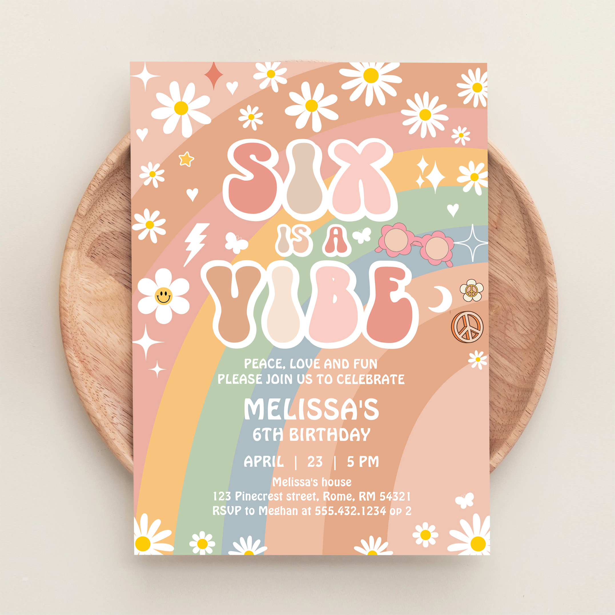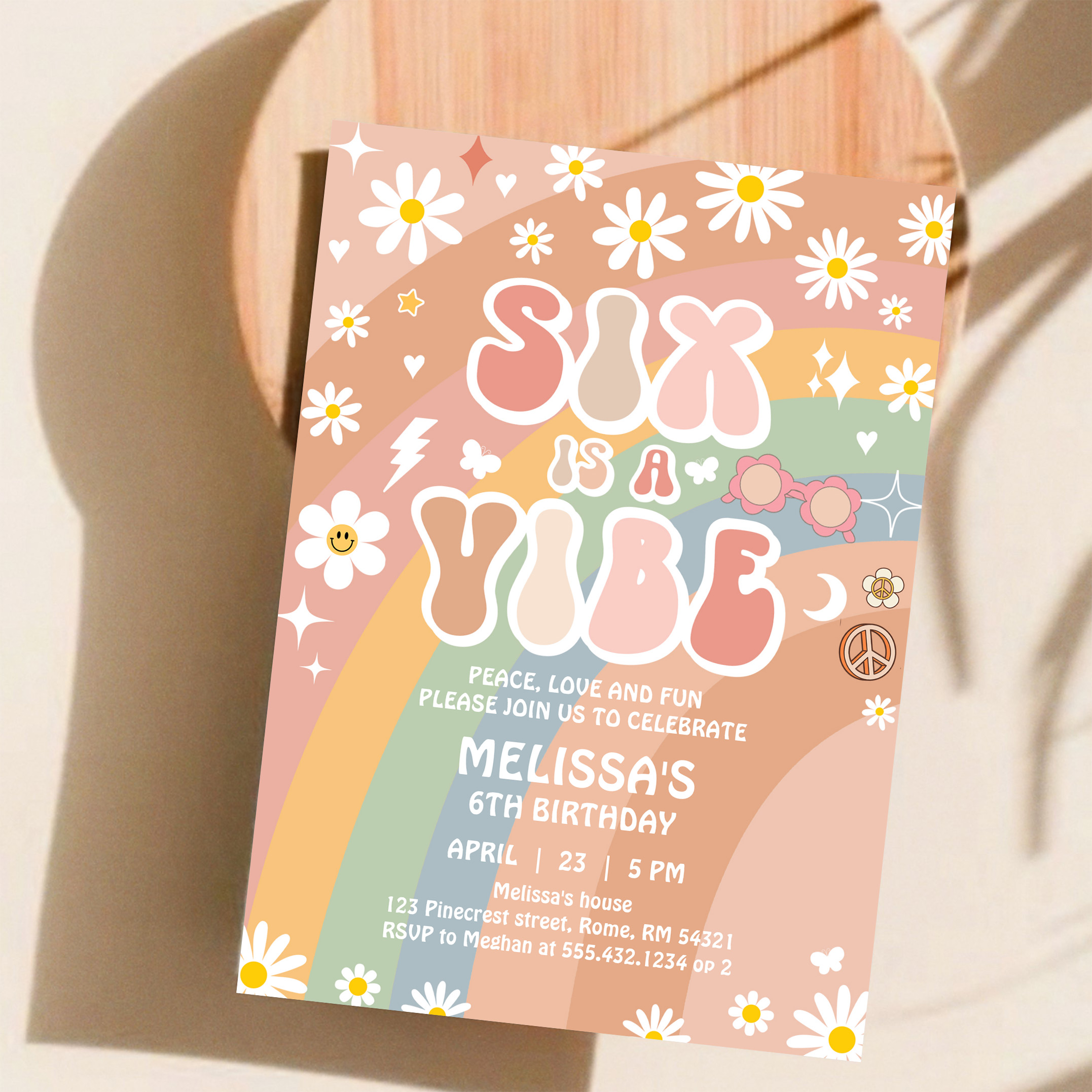 Six Is A Vibe Groovy Retro 70S 6th Birthday Invitation