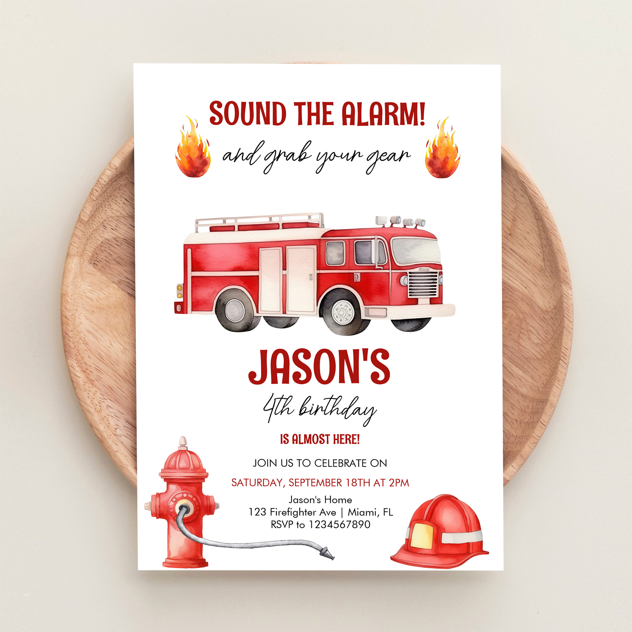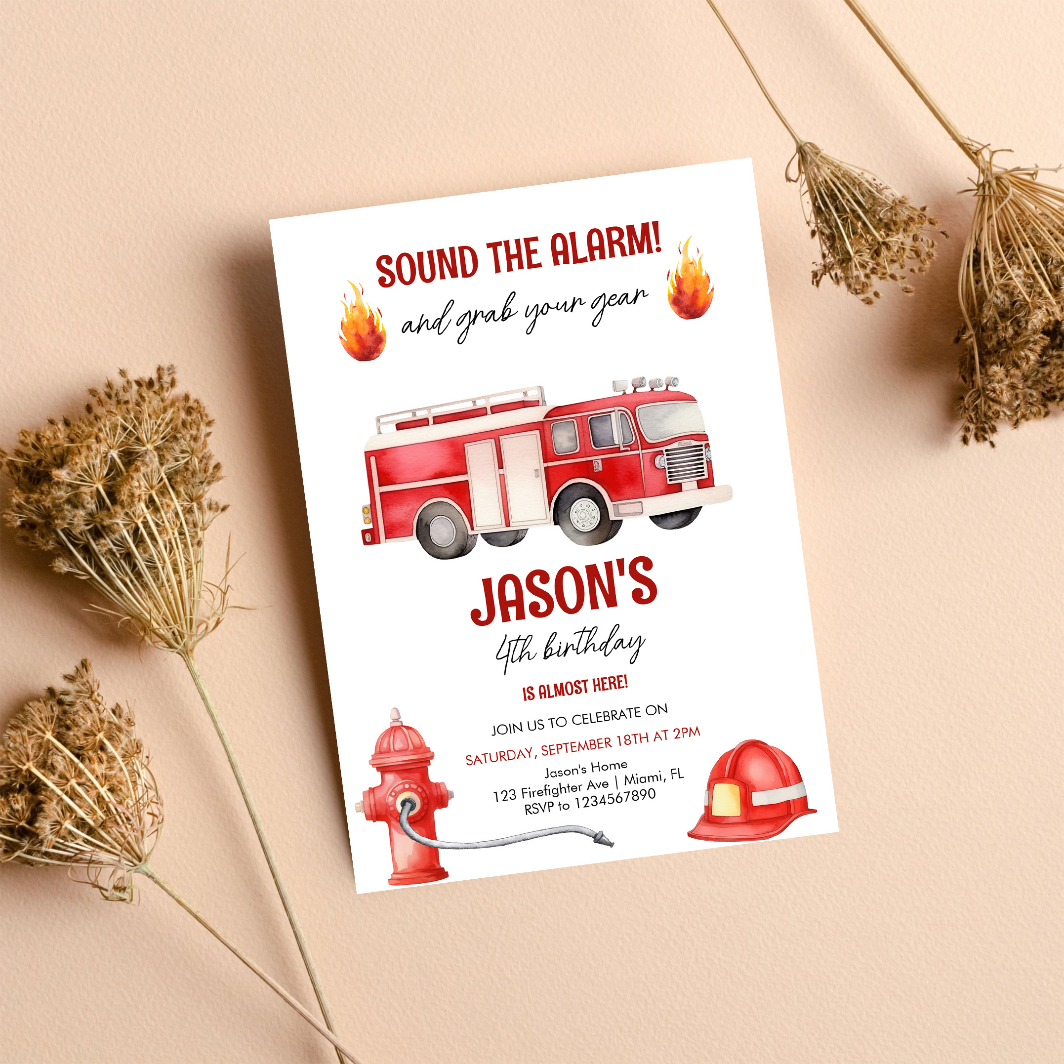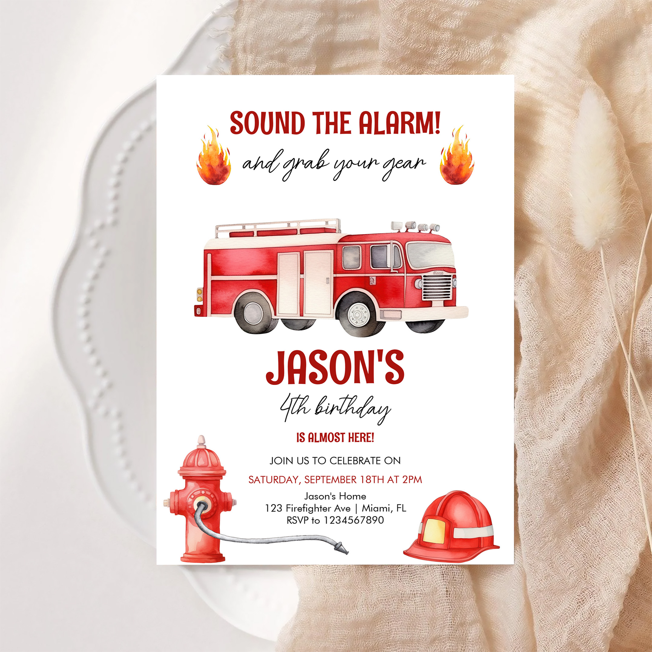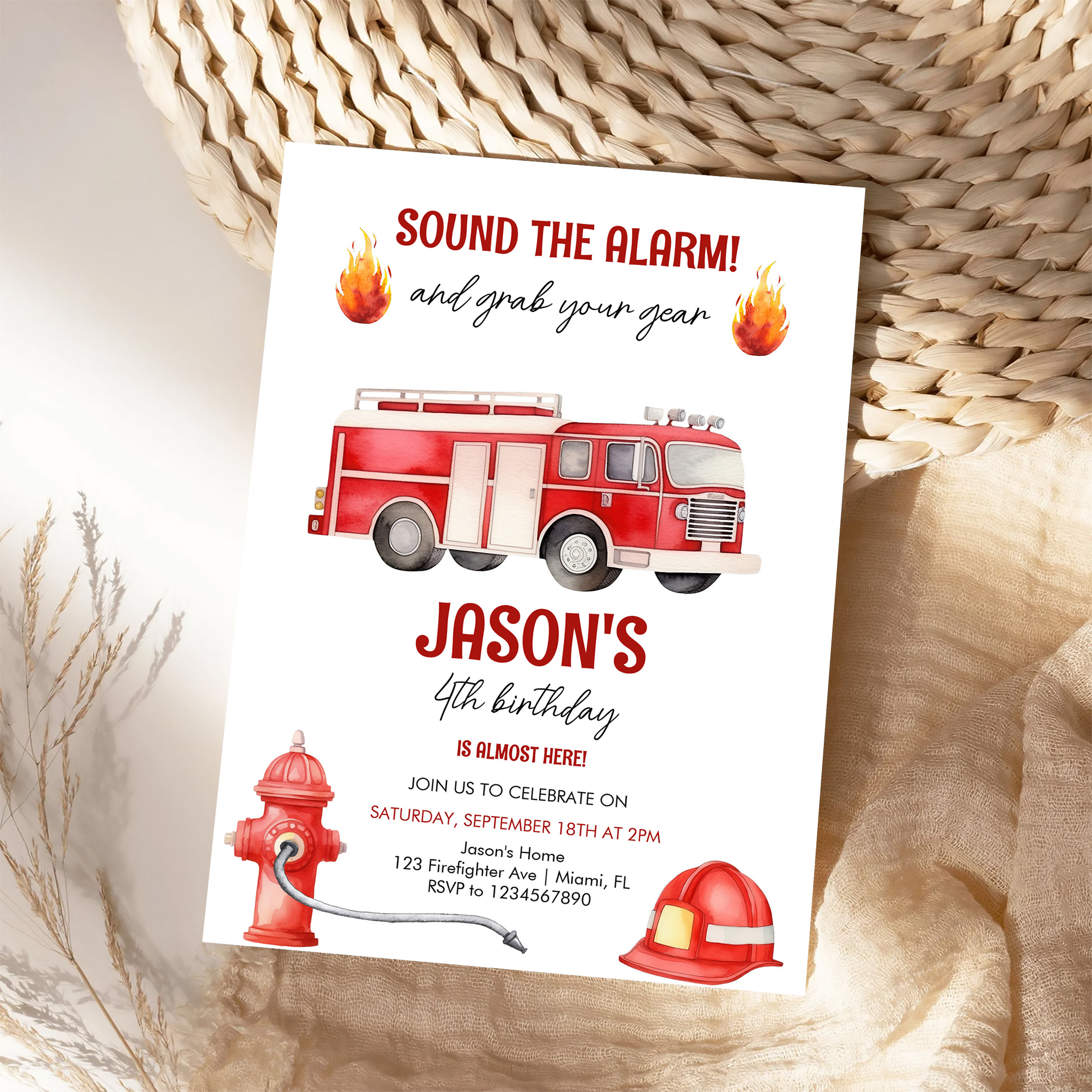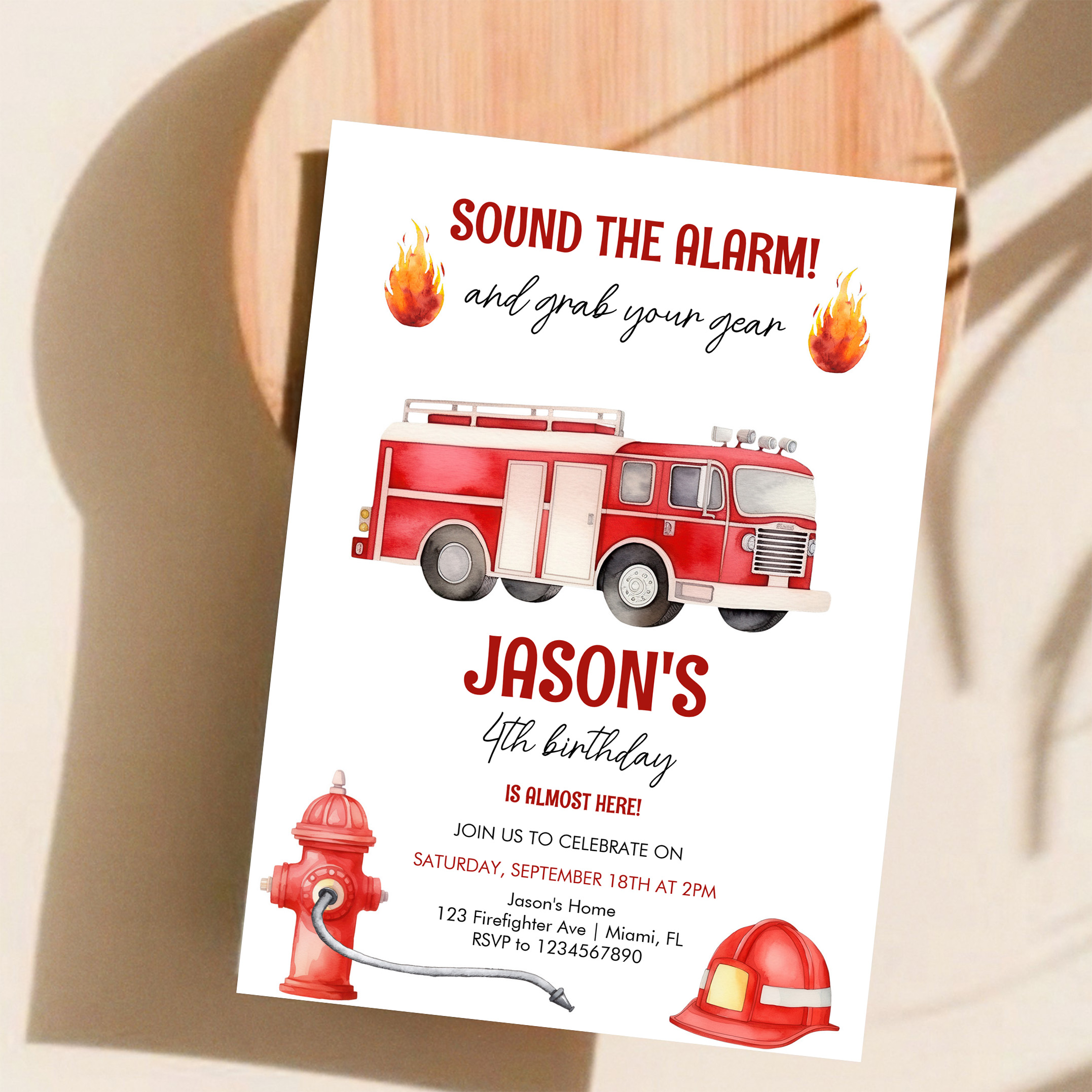 Sound The Alarm Firetruck Boys 4th Birthday Invitation