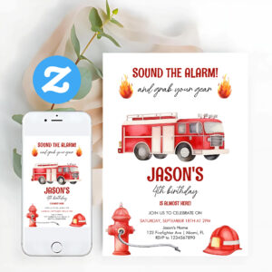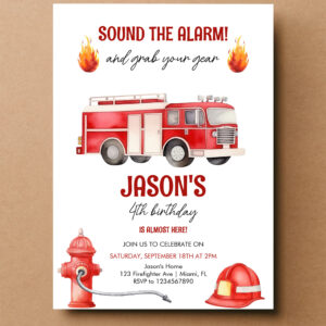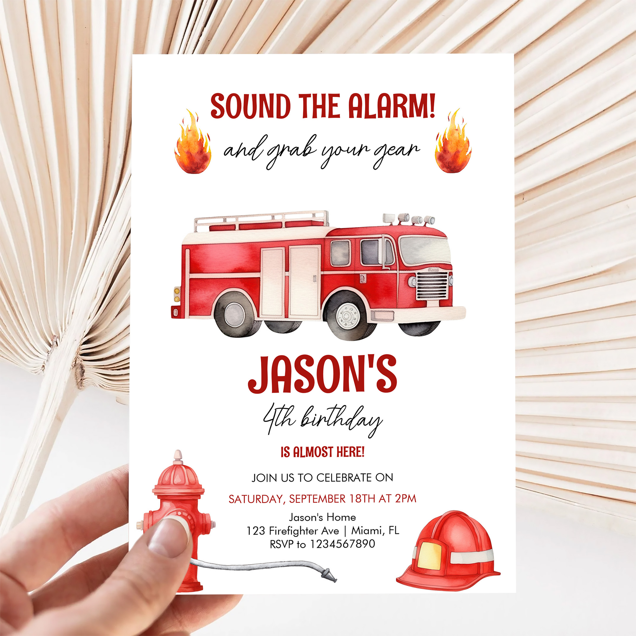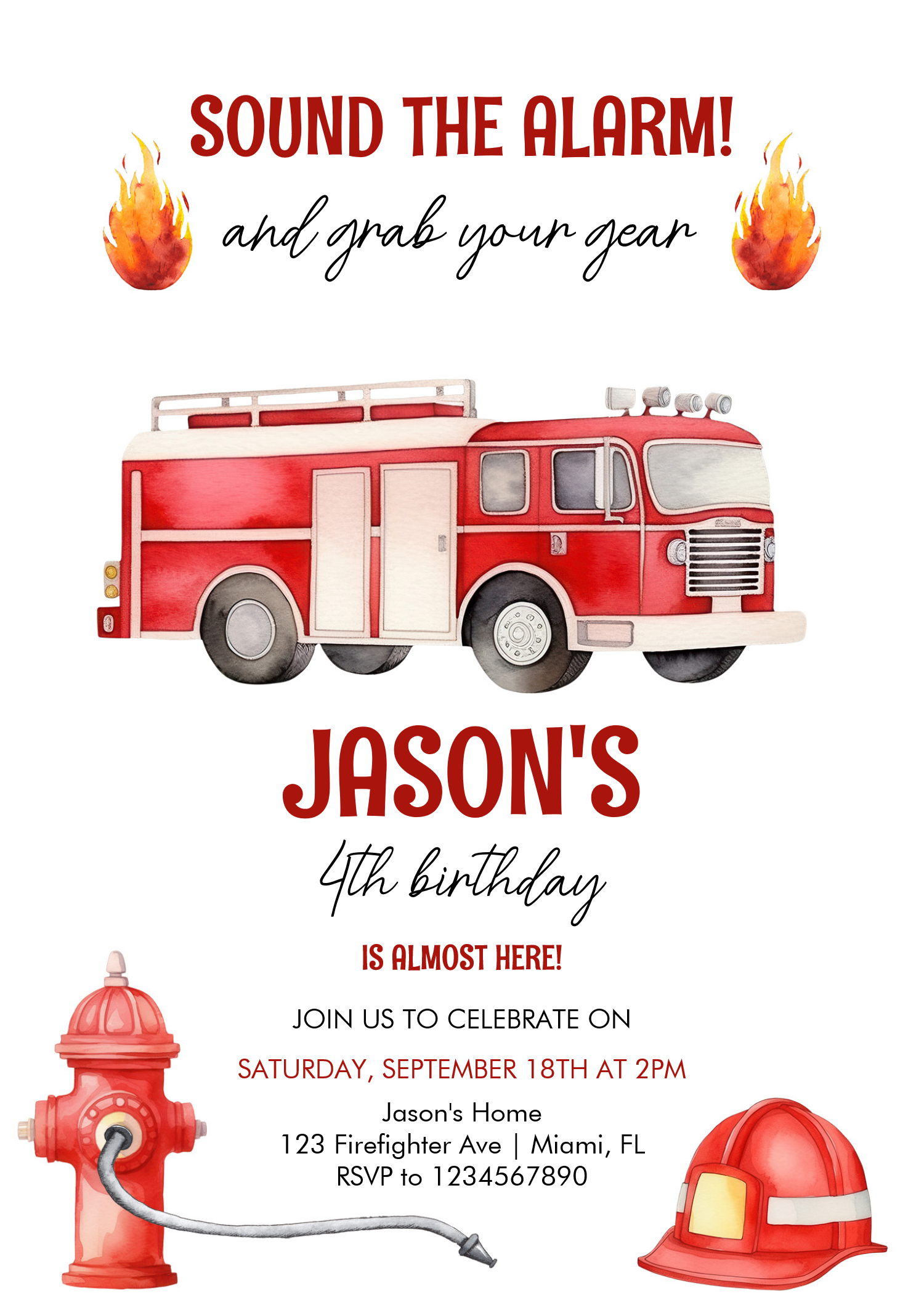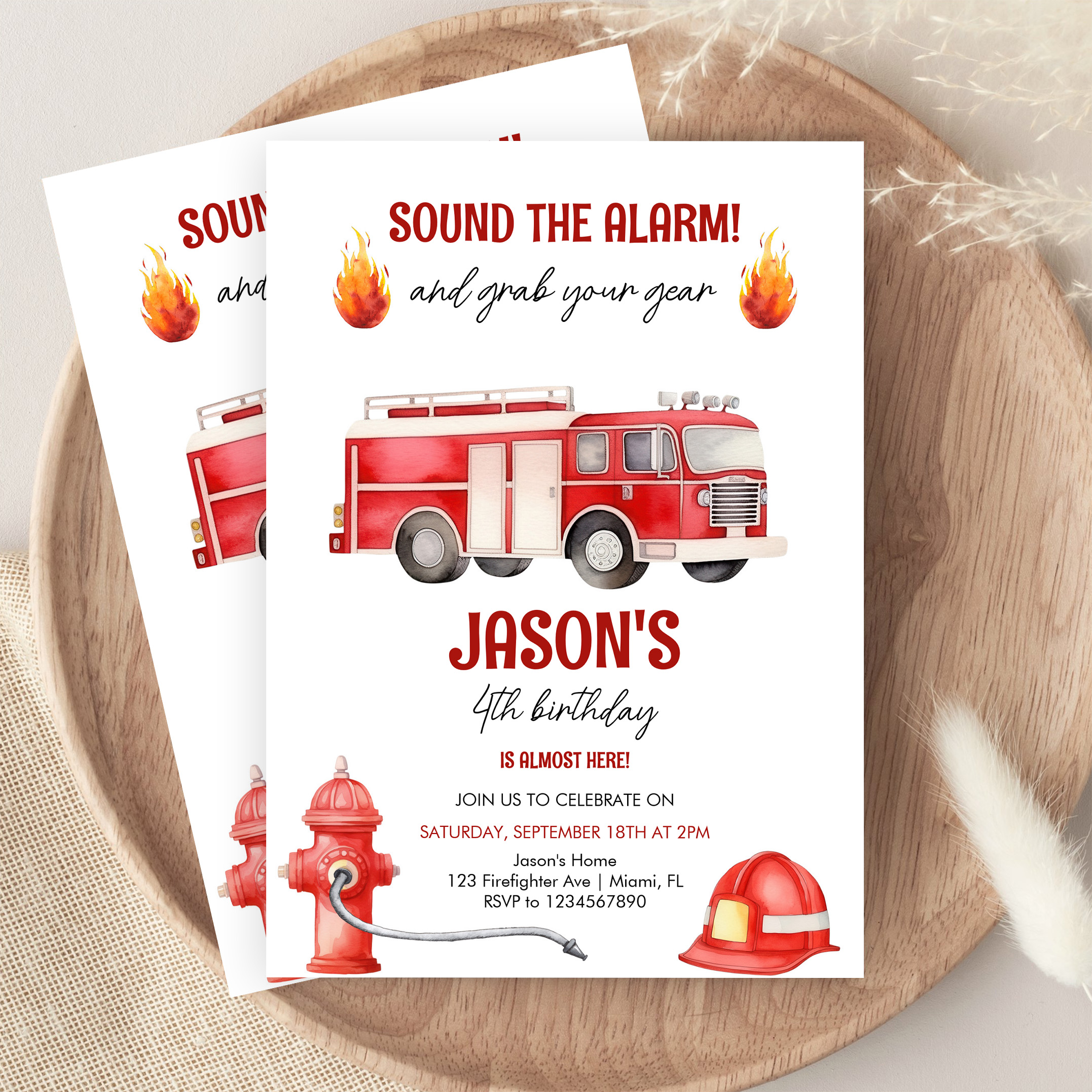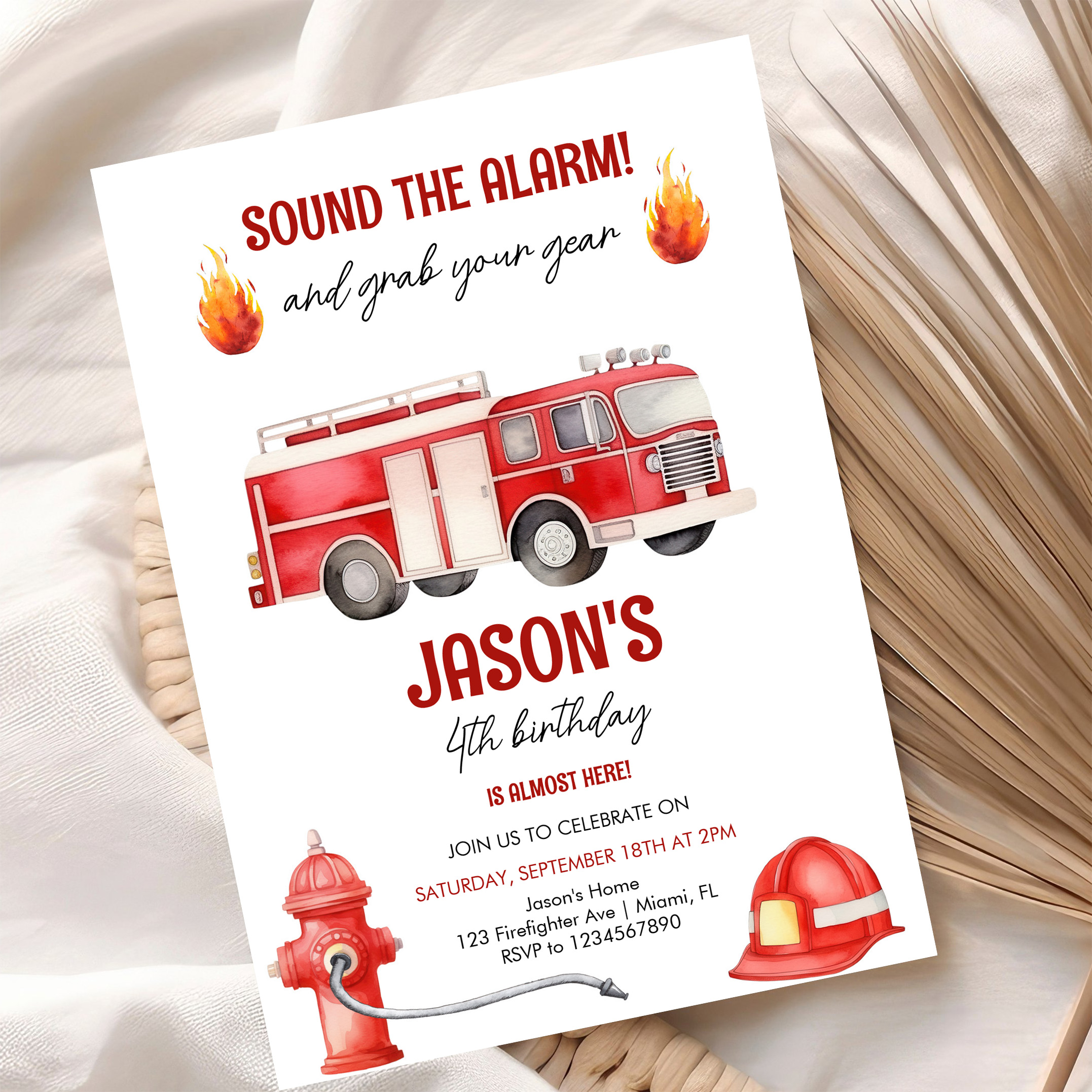 Sound The Alarm Firetruck Boys 4th Birthday Invitation