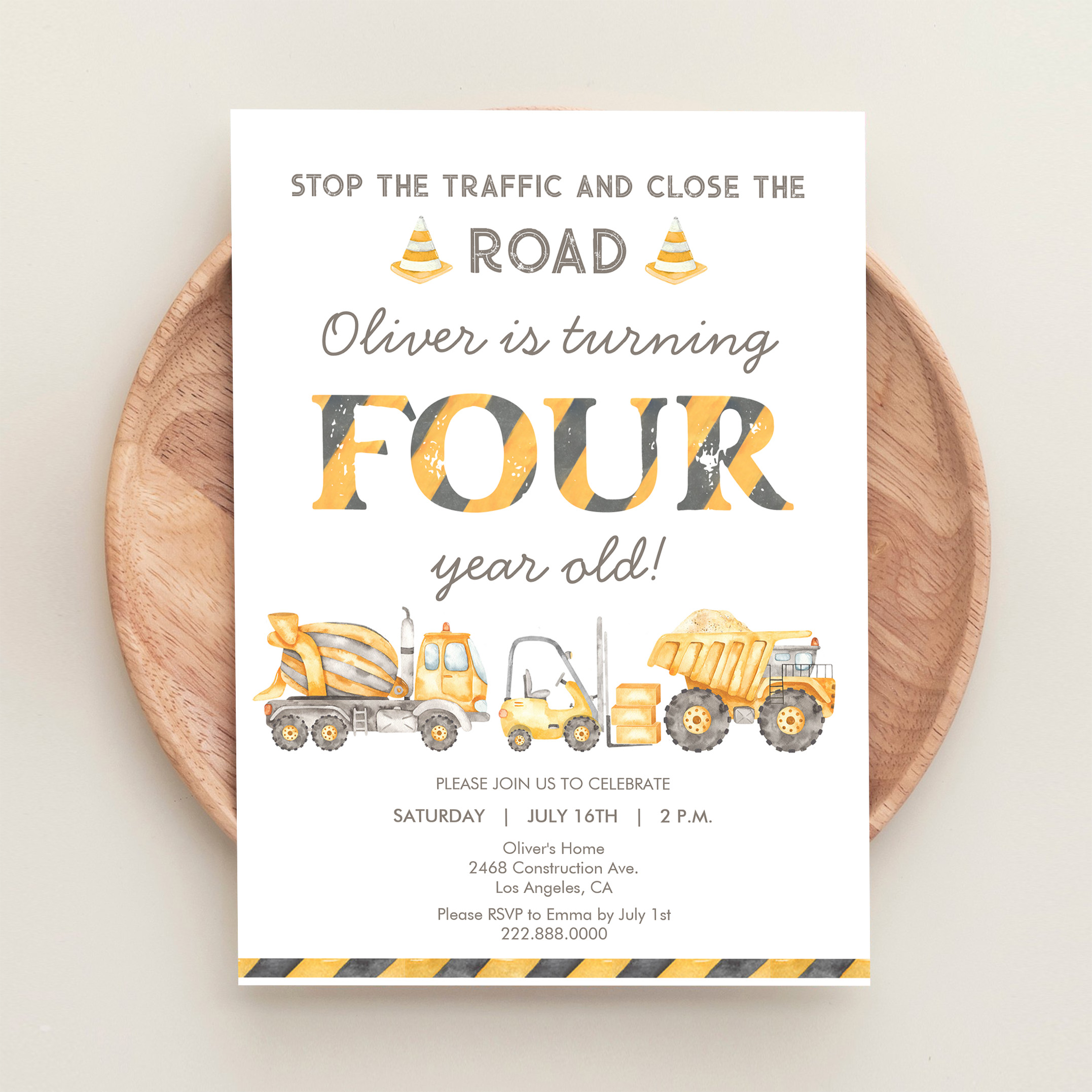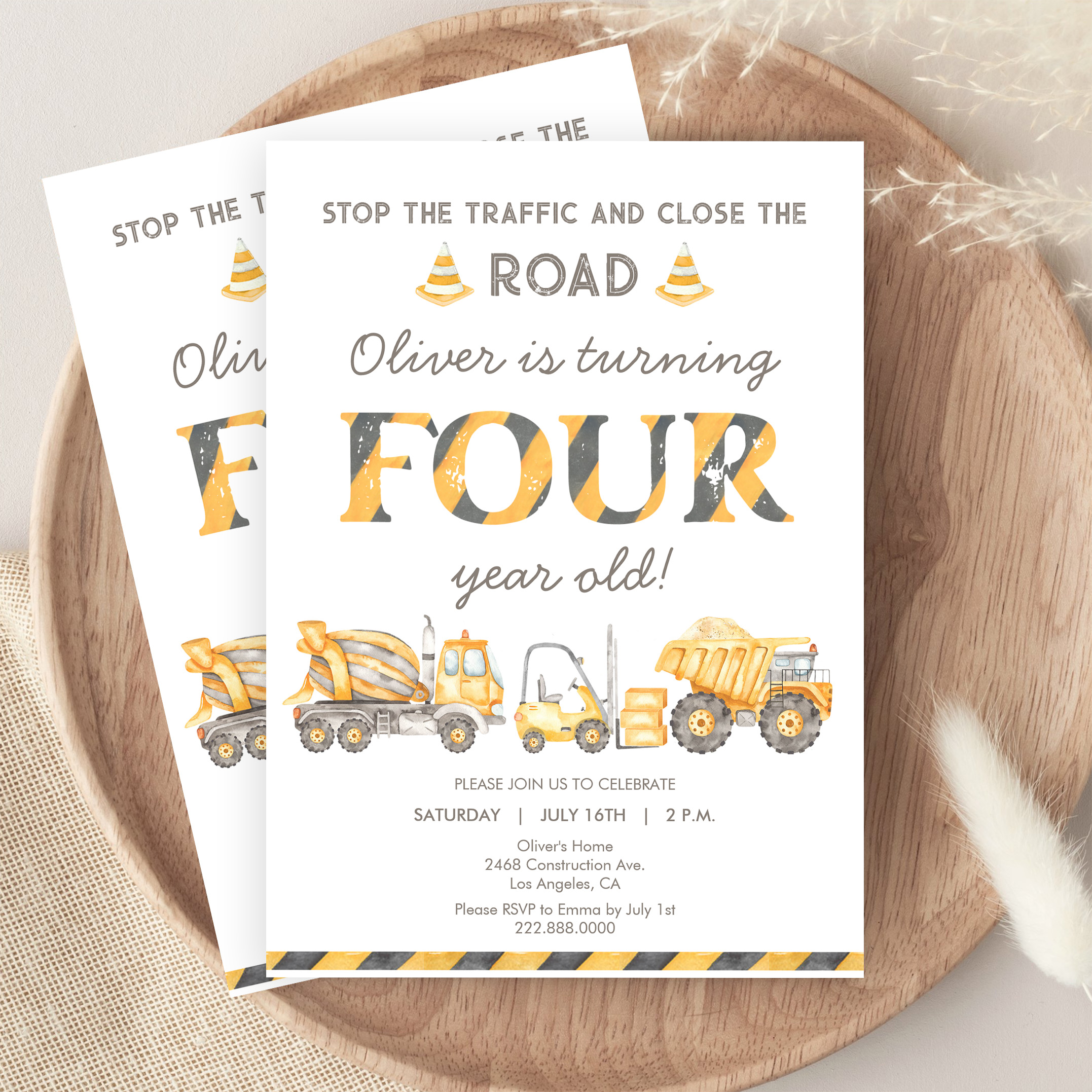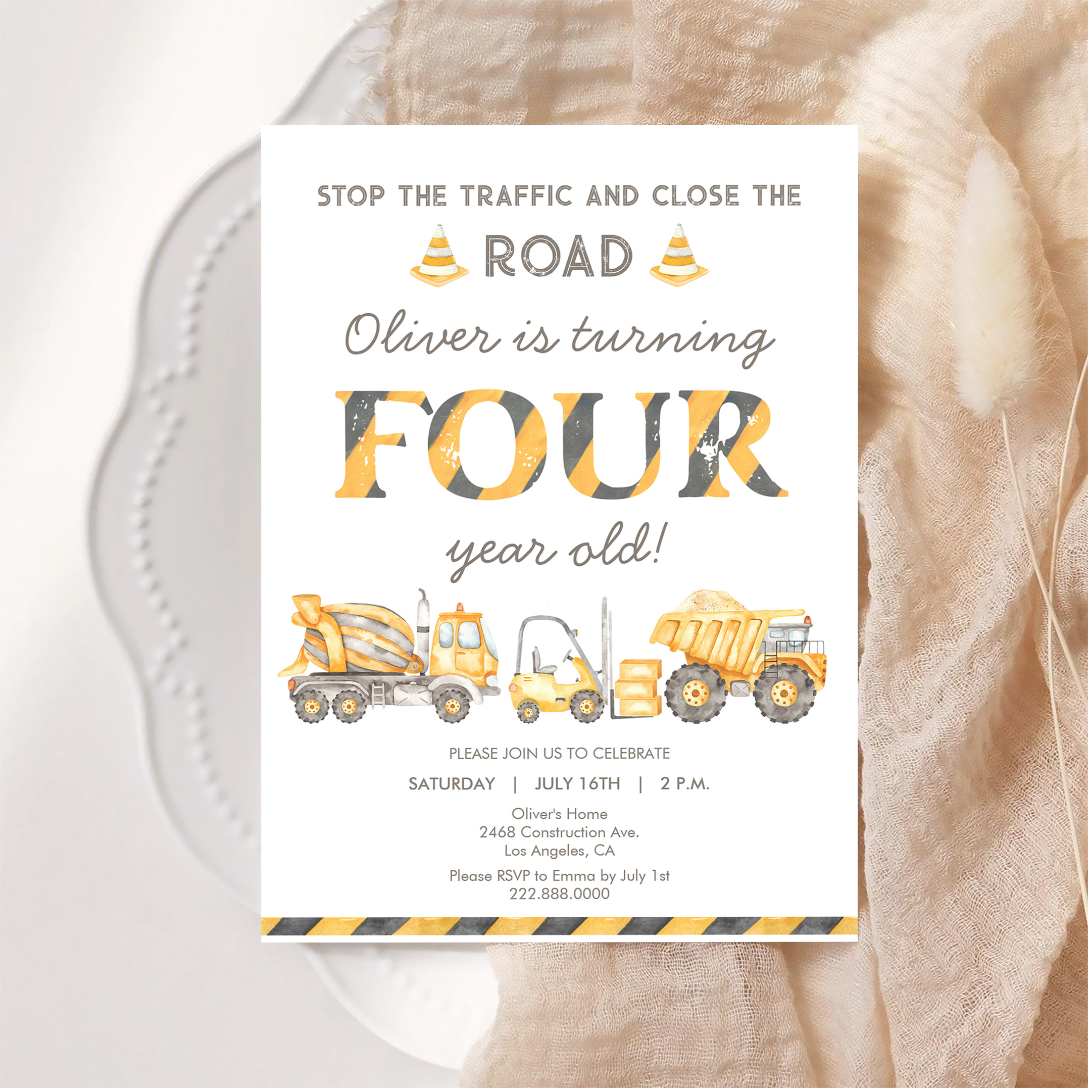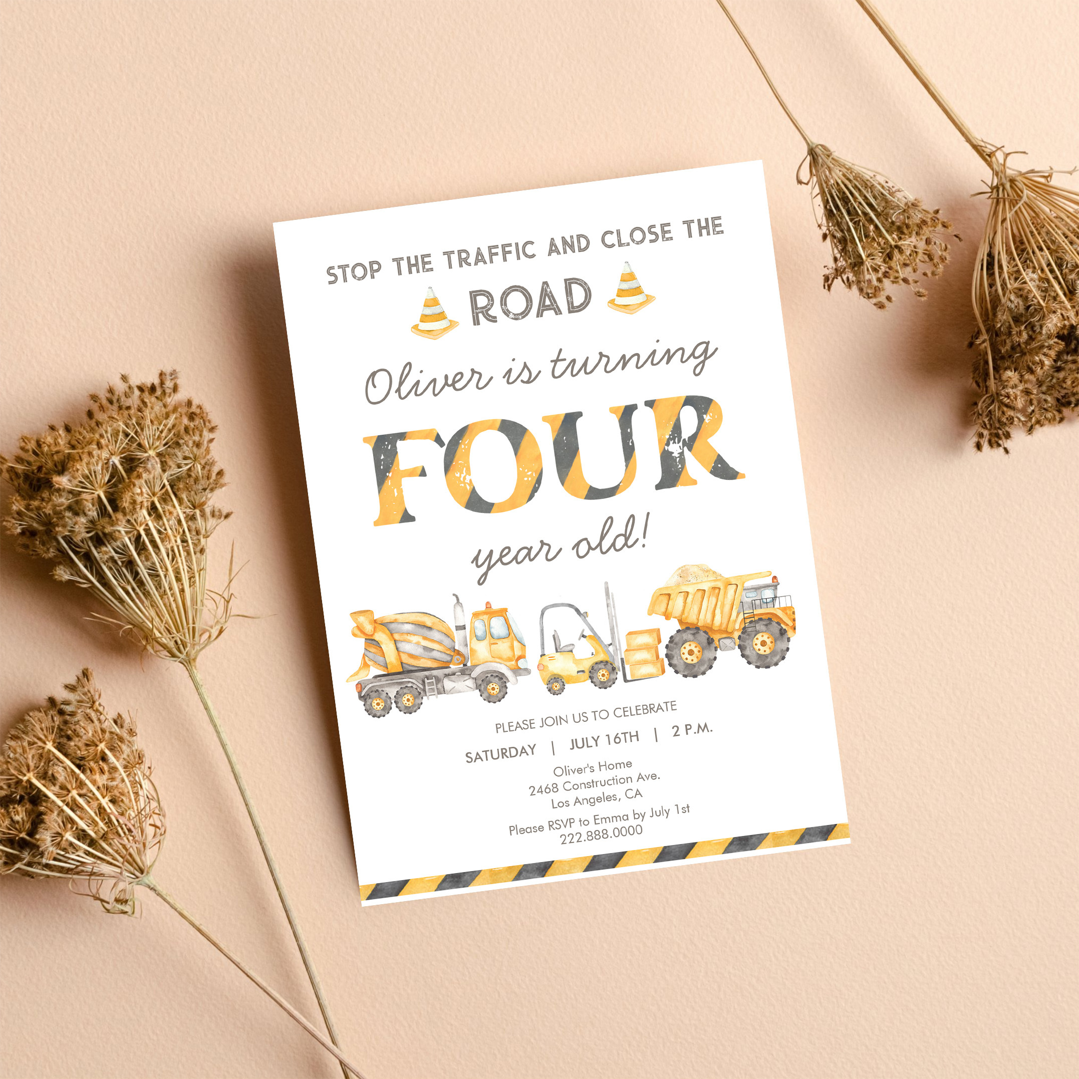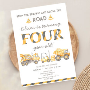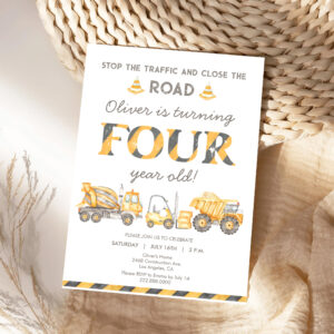 Stop The Traffic Truck Construction 4th Birthday Invitation