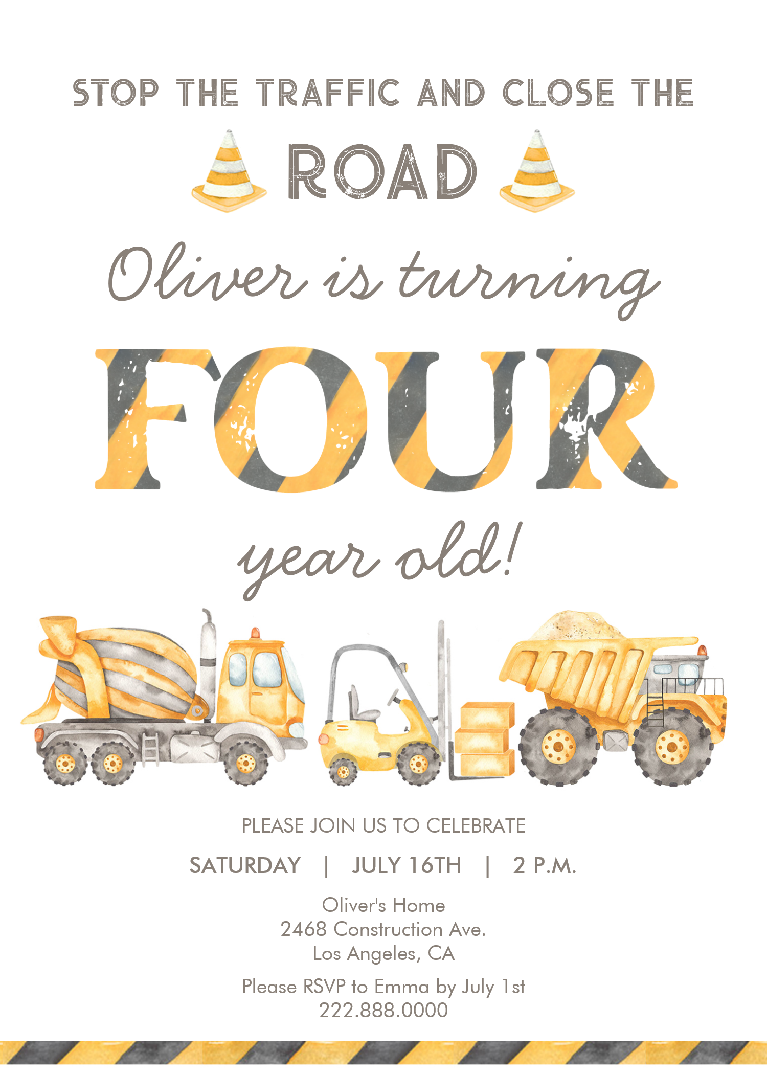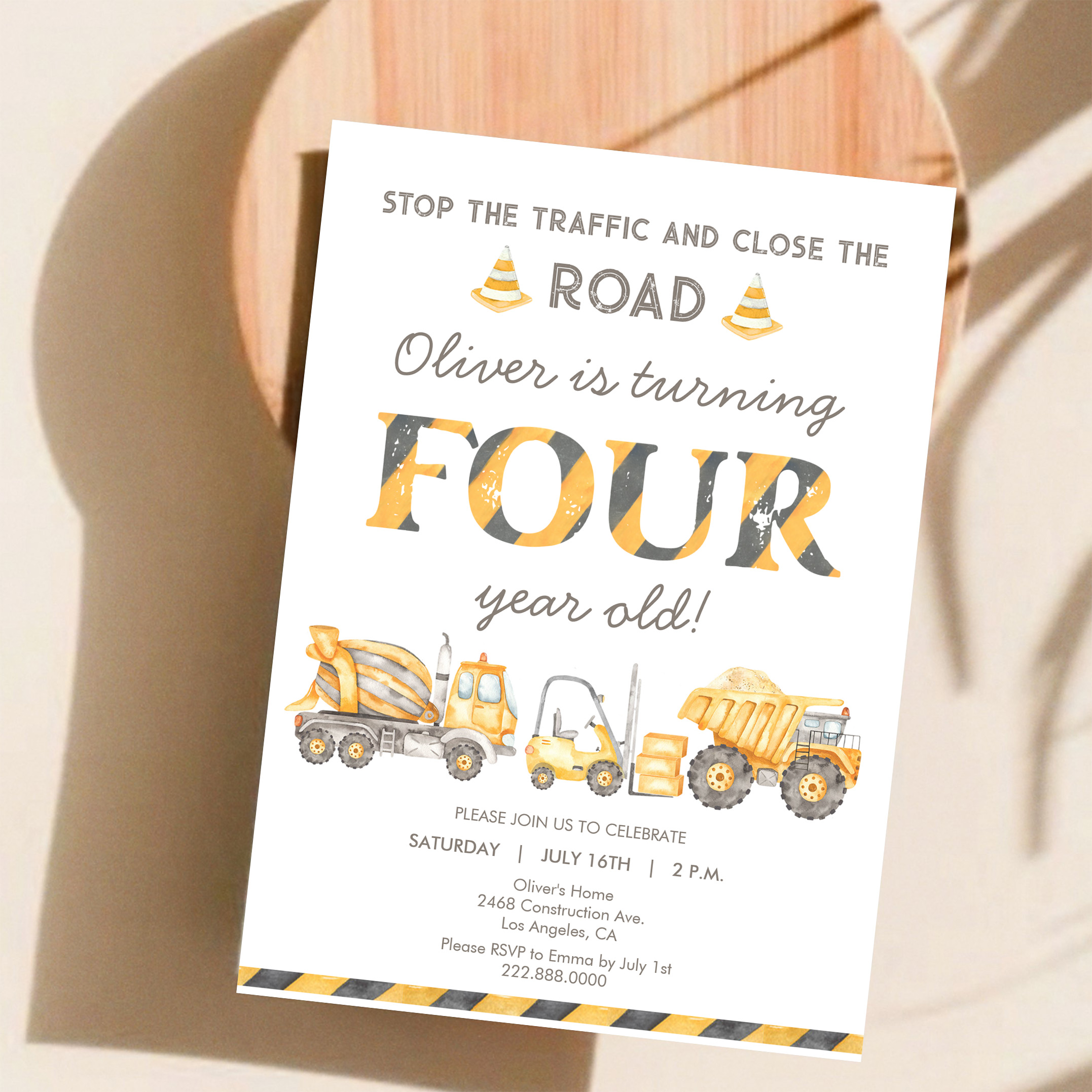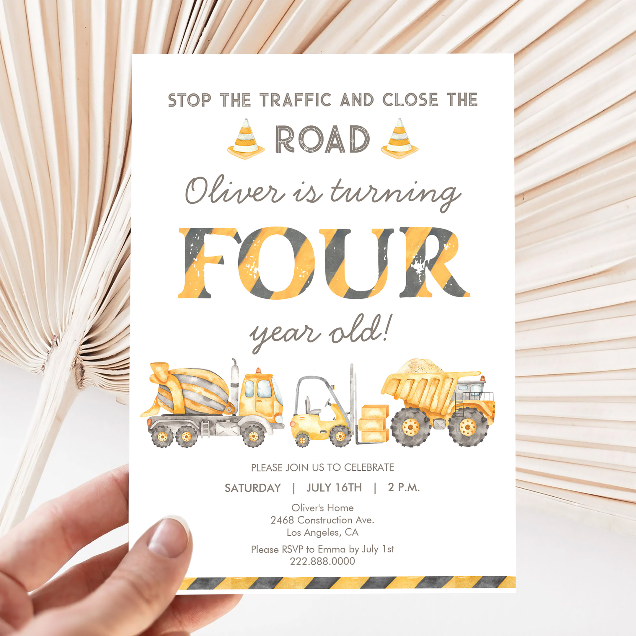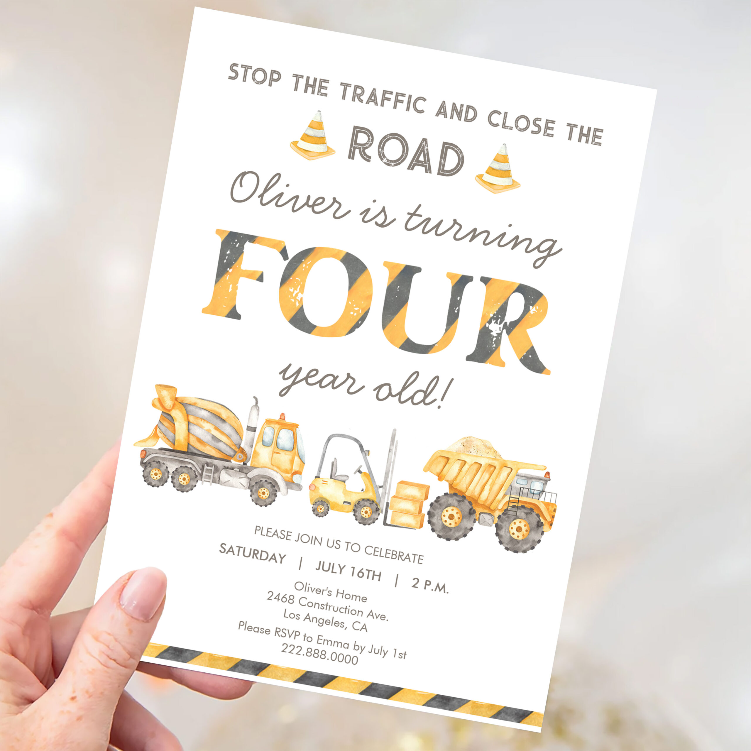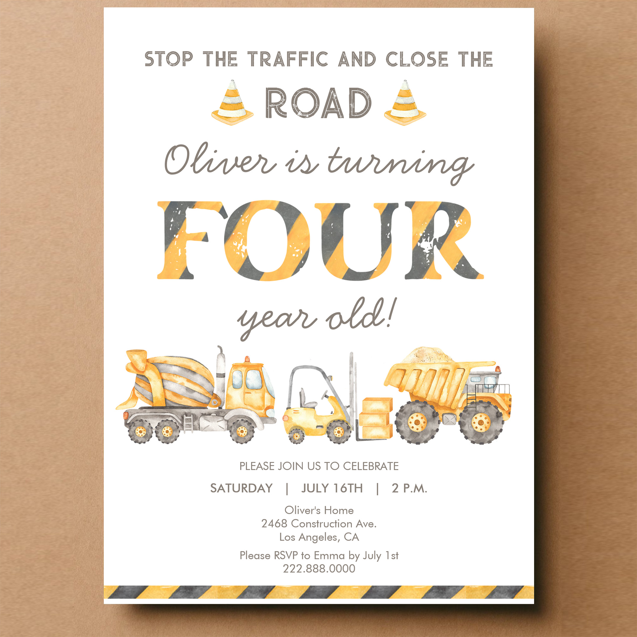 Stop The Traffic Truck Construction 4th Birthday Invitation