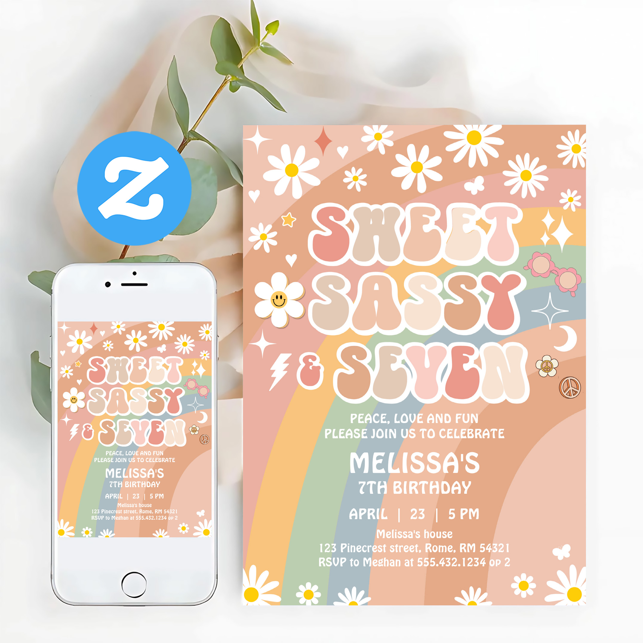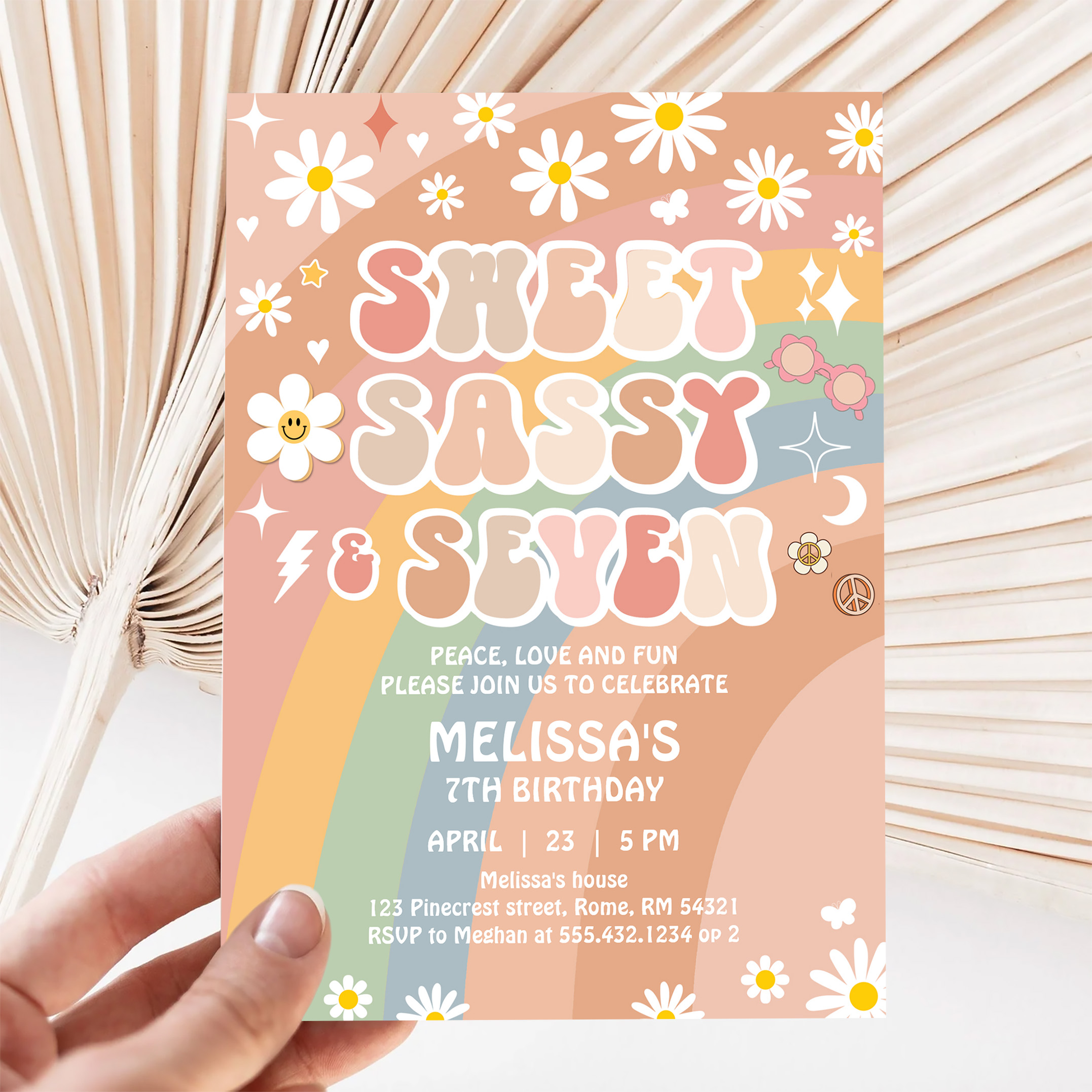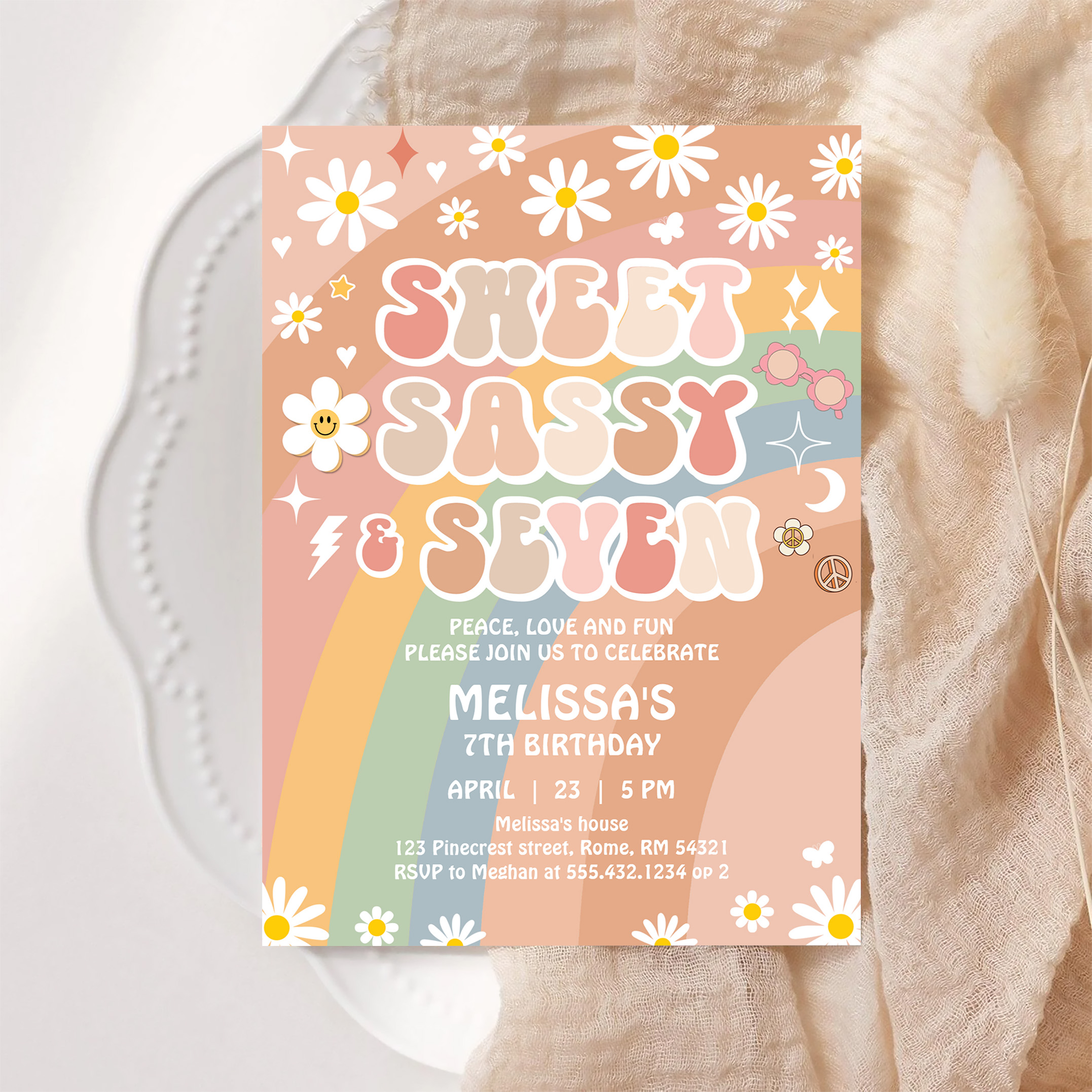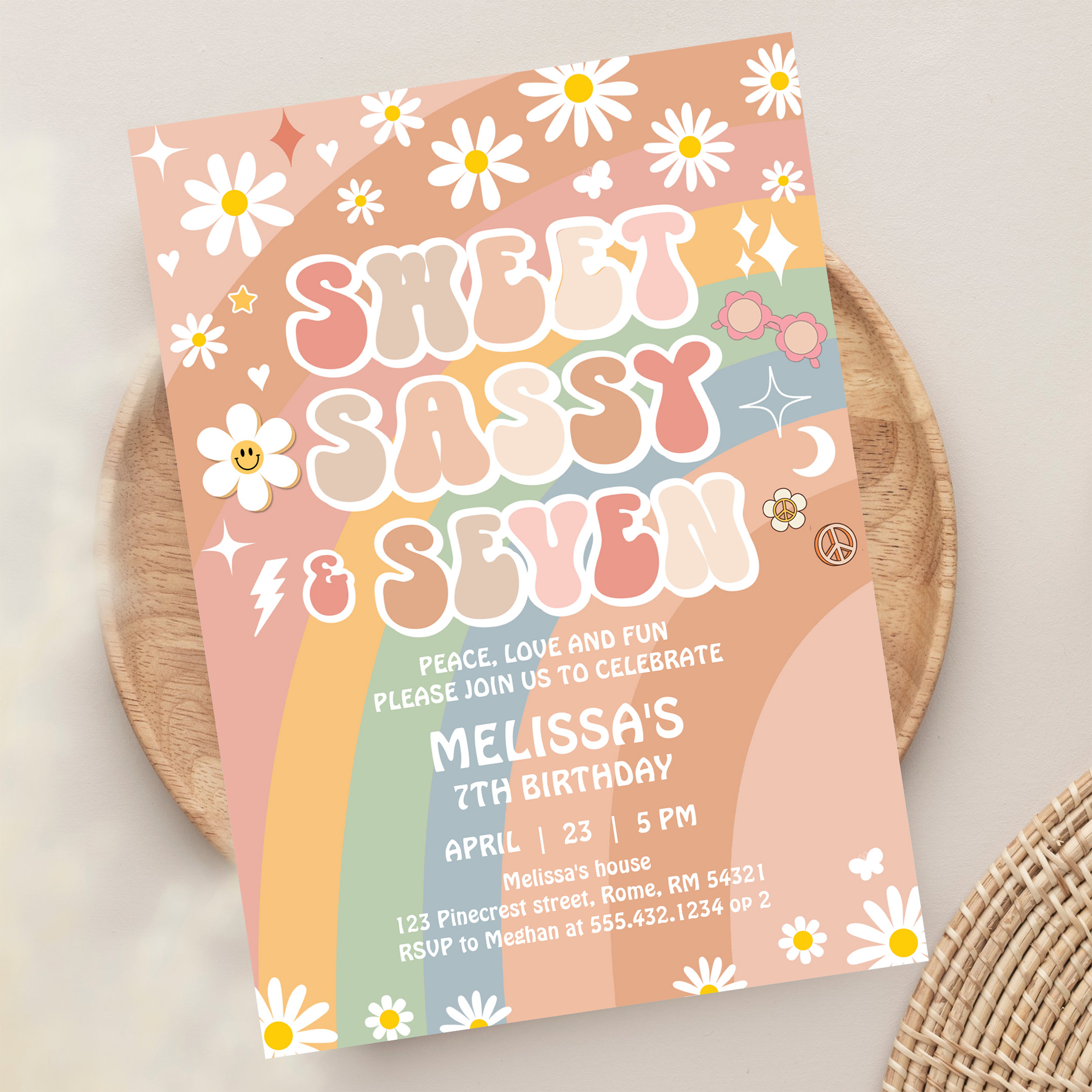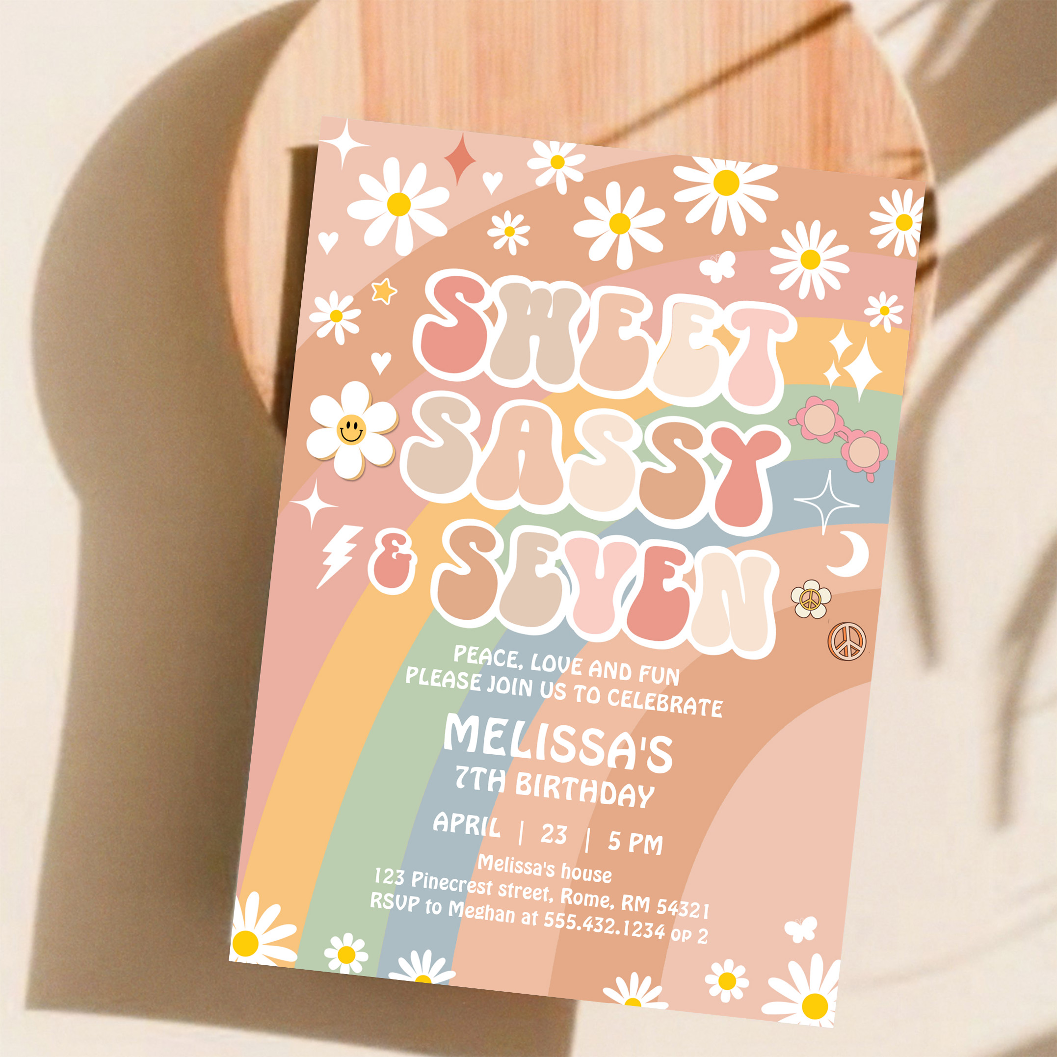 Sweet Sassy And Seven Groovy Rainbow 7th Birthday Invitation