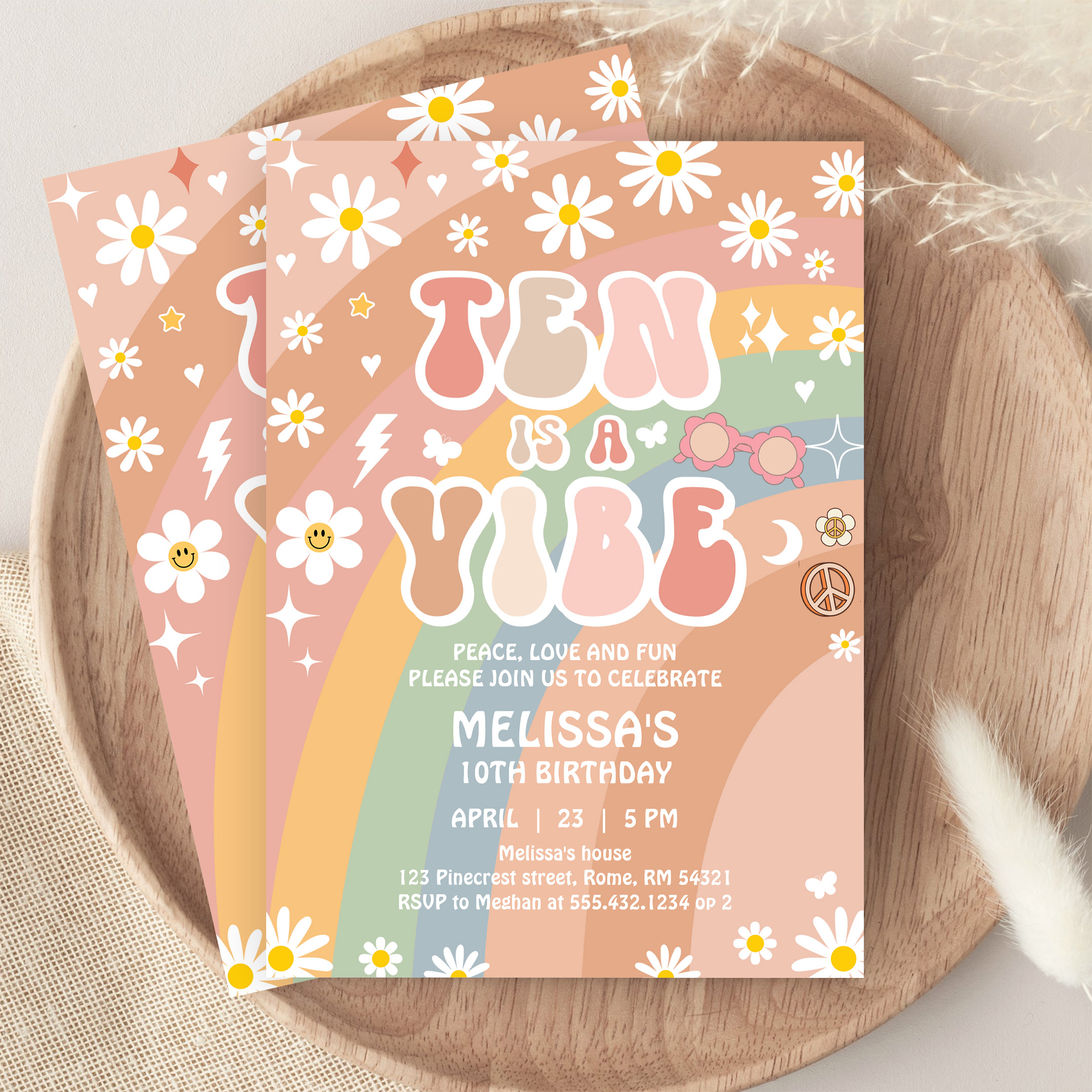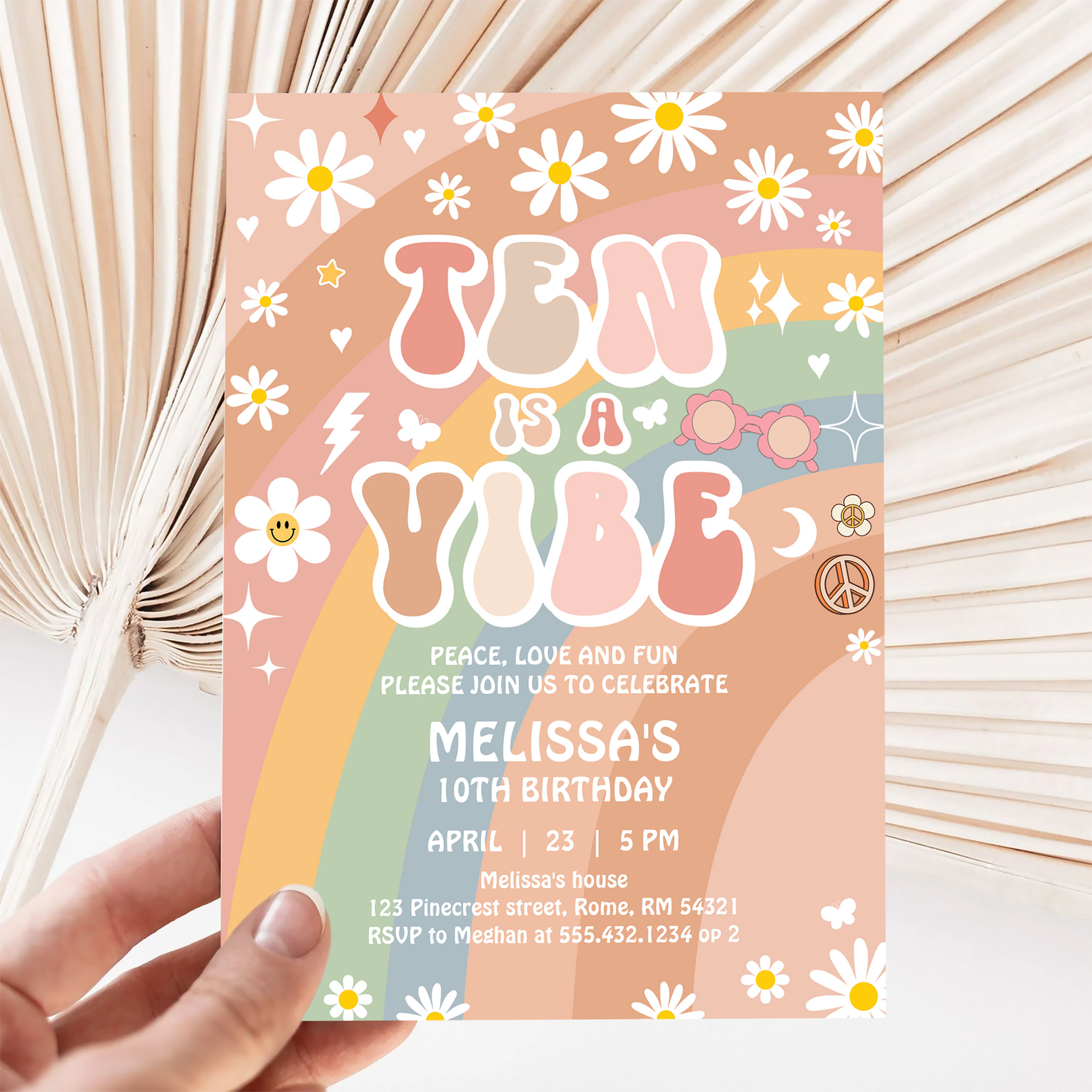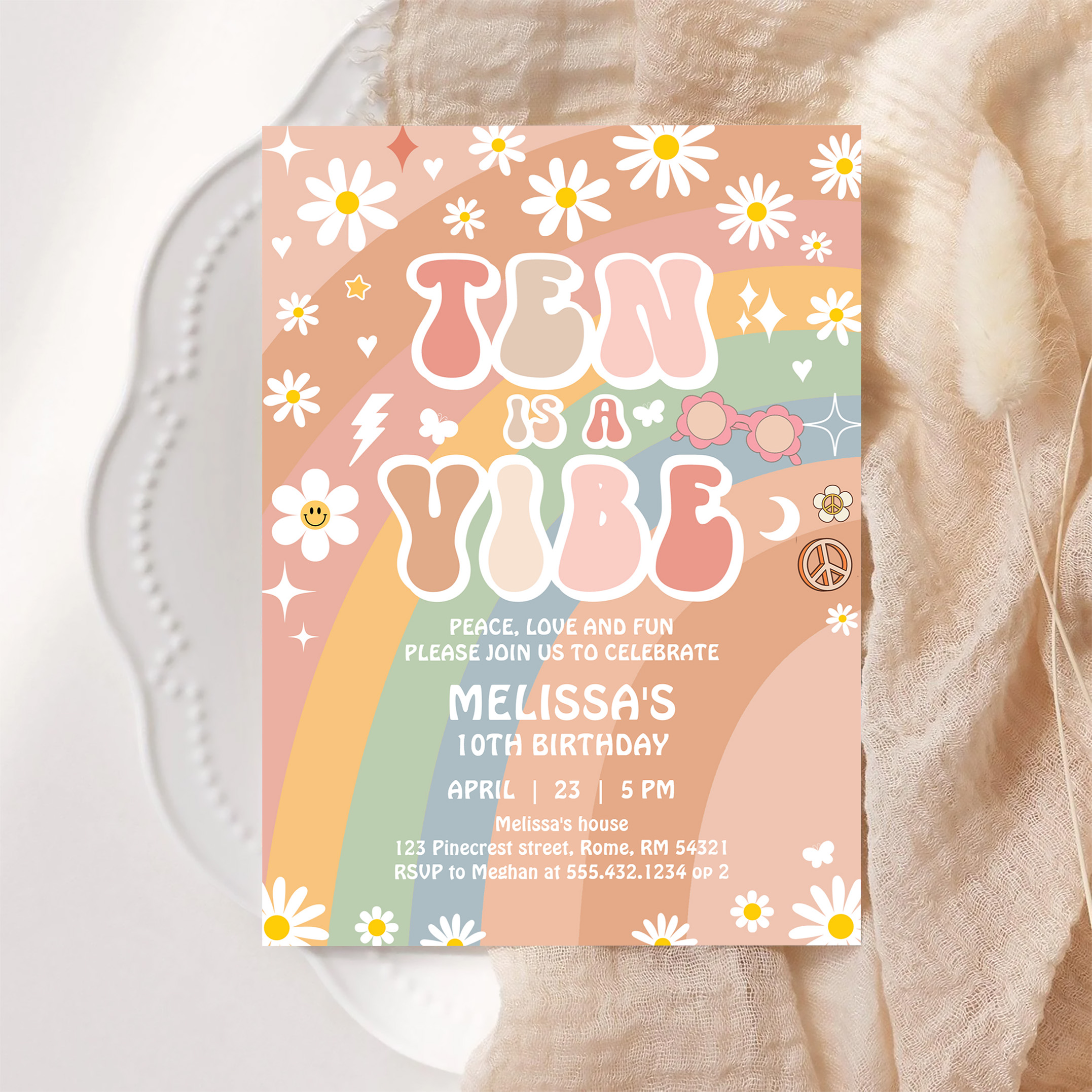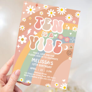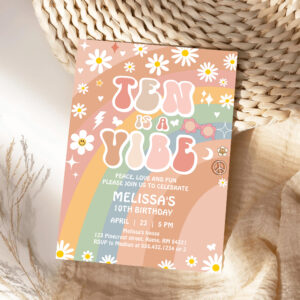 Ten Is A Vibe Groovy Rainbow Daisy 10th Birthday Invitation