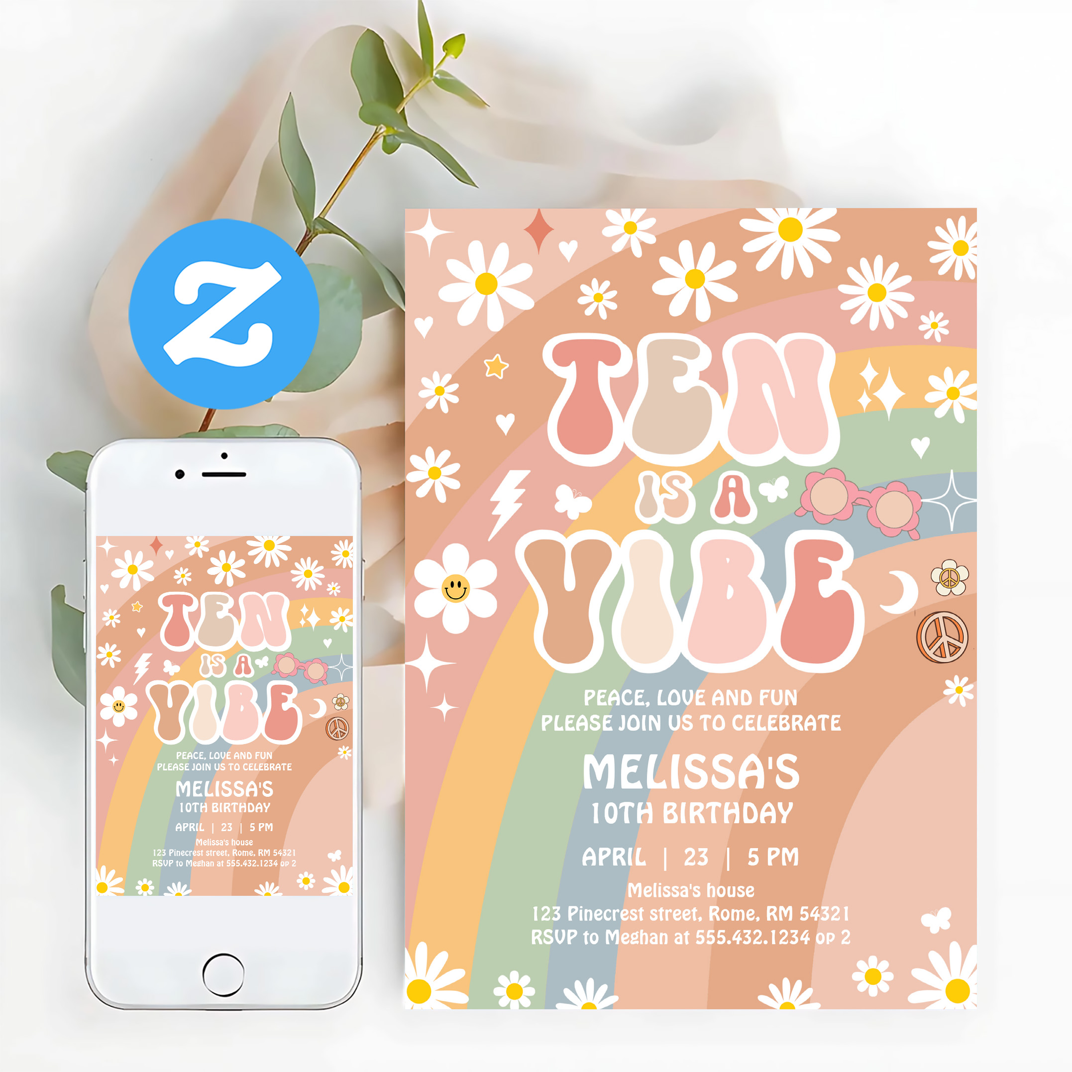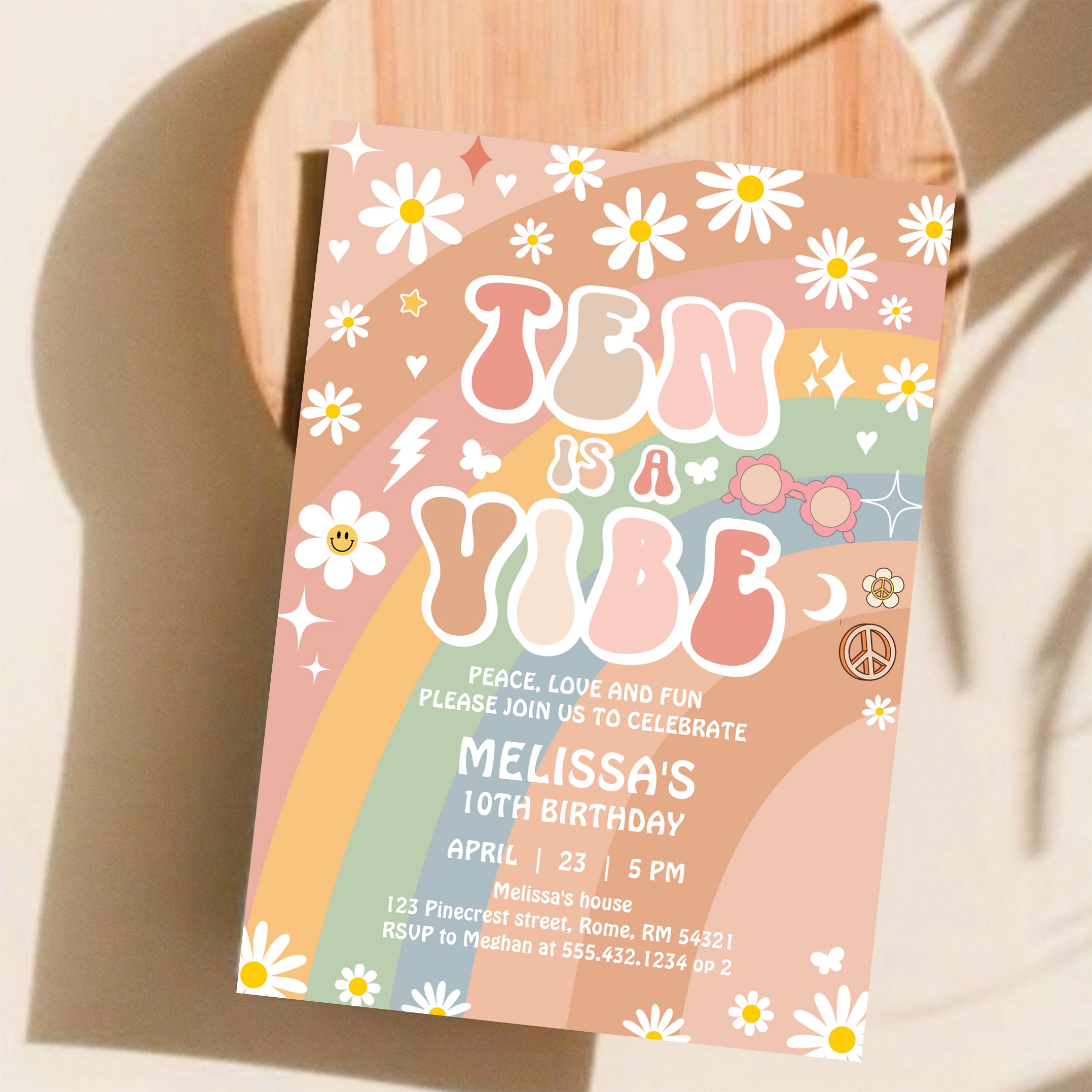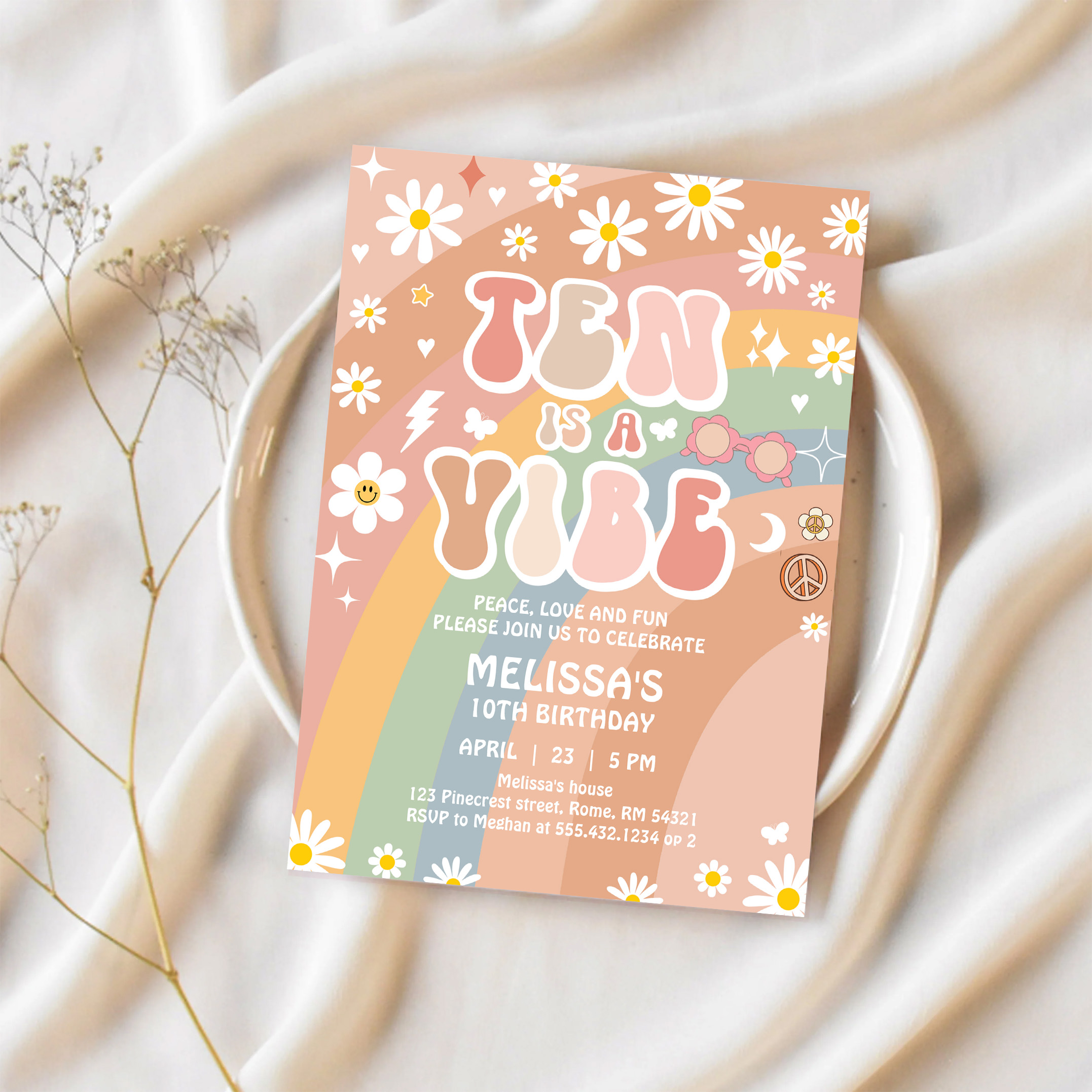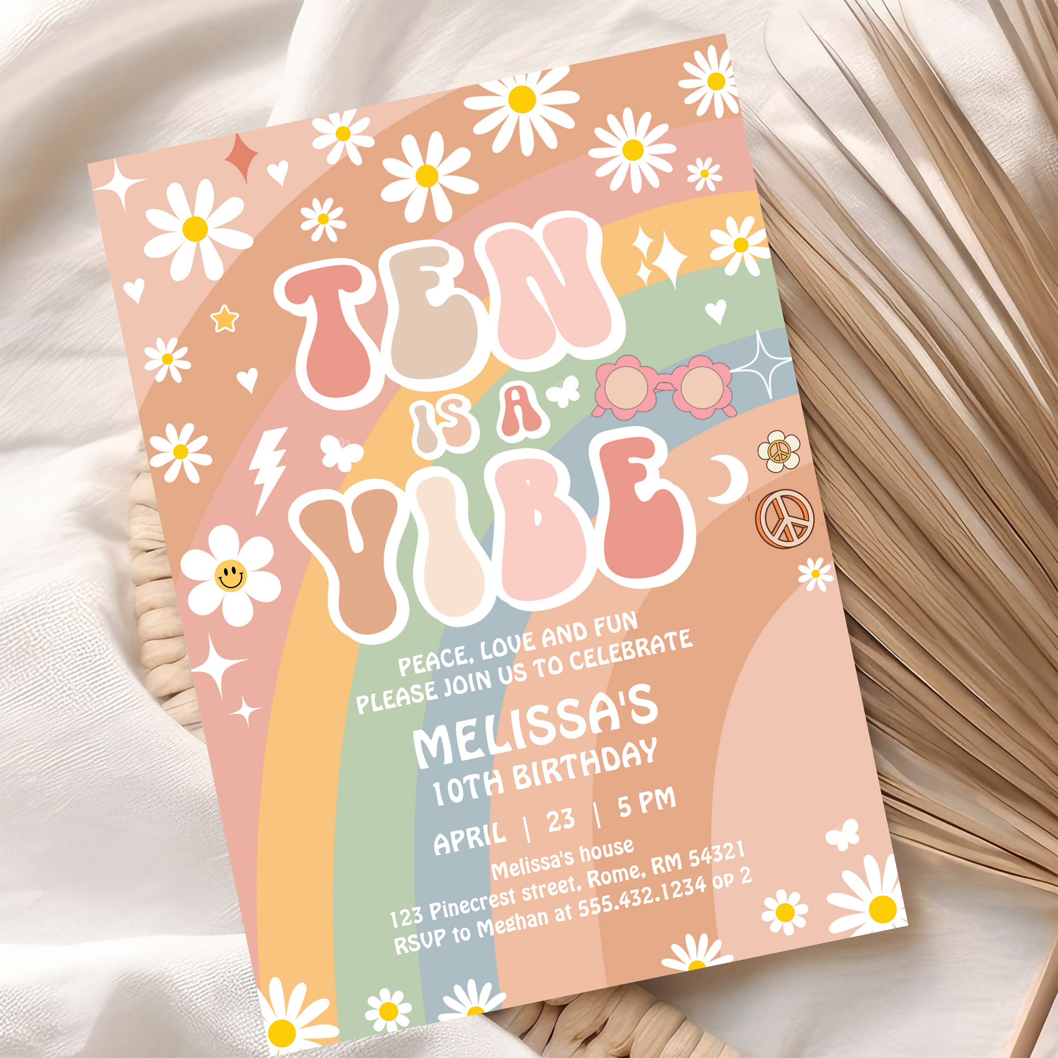 Ten Is A Vibe Groovy Rainbow Daisy 10th Birthday Invitation