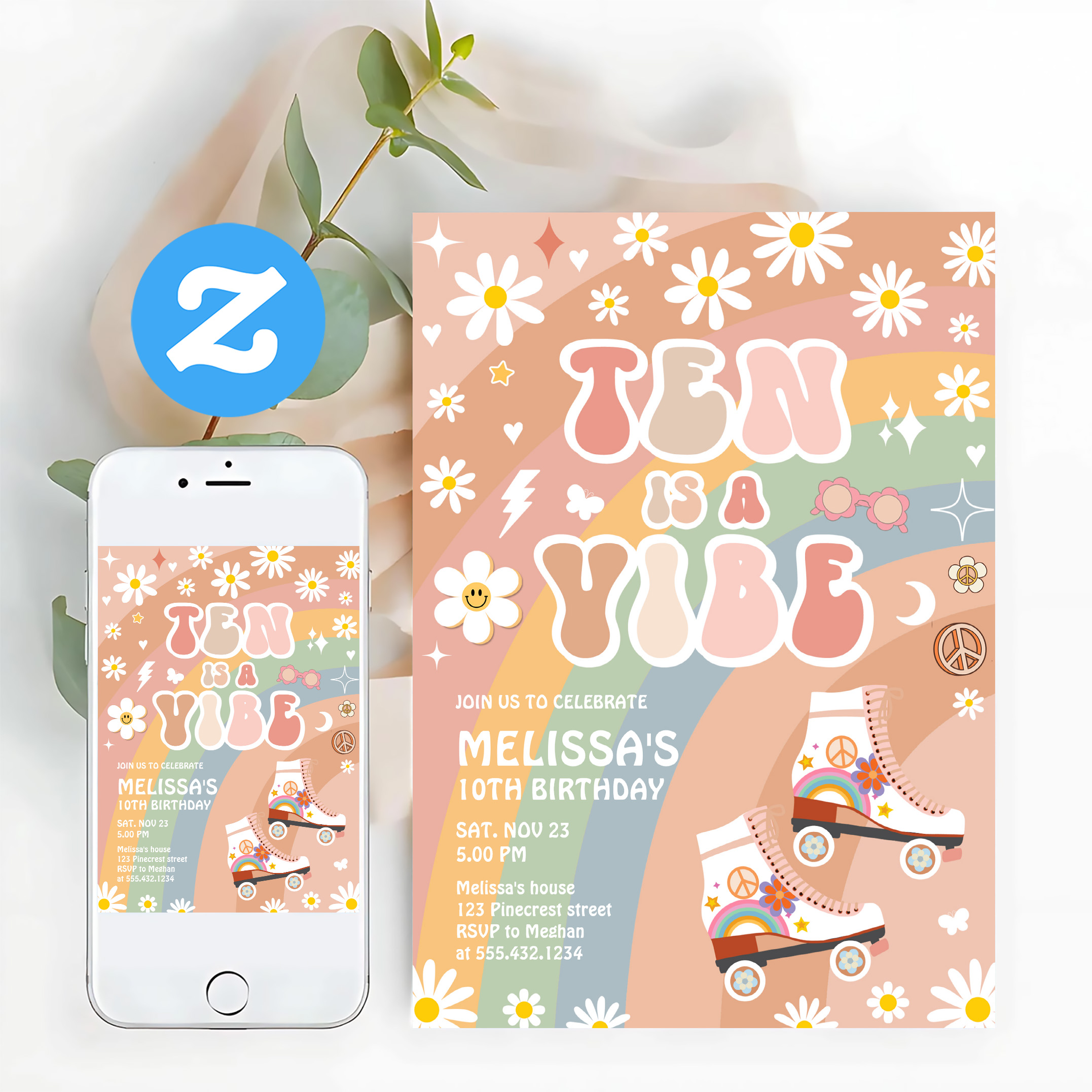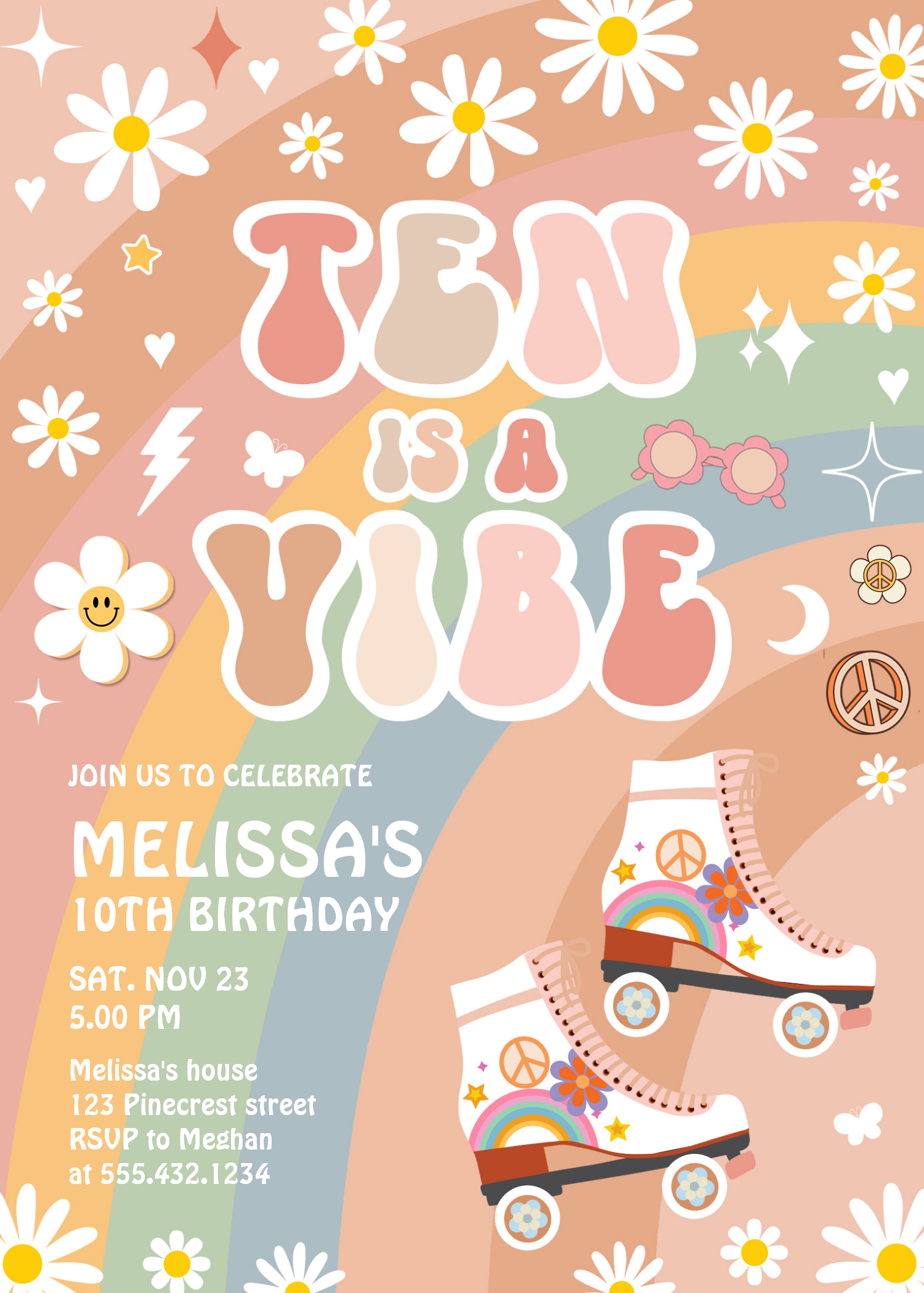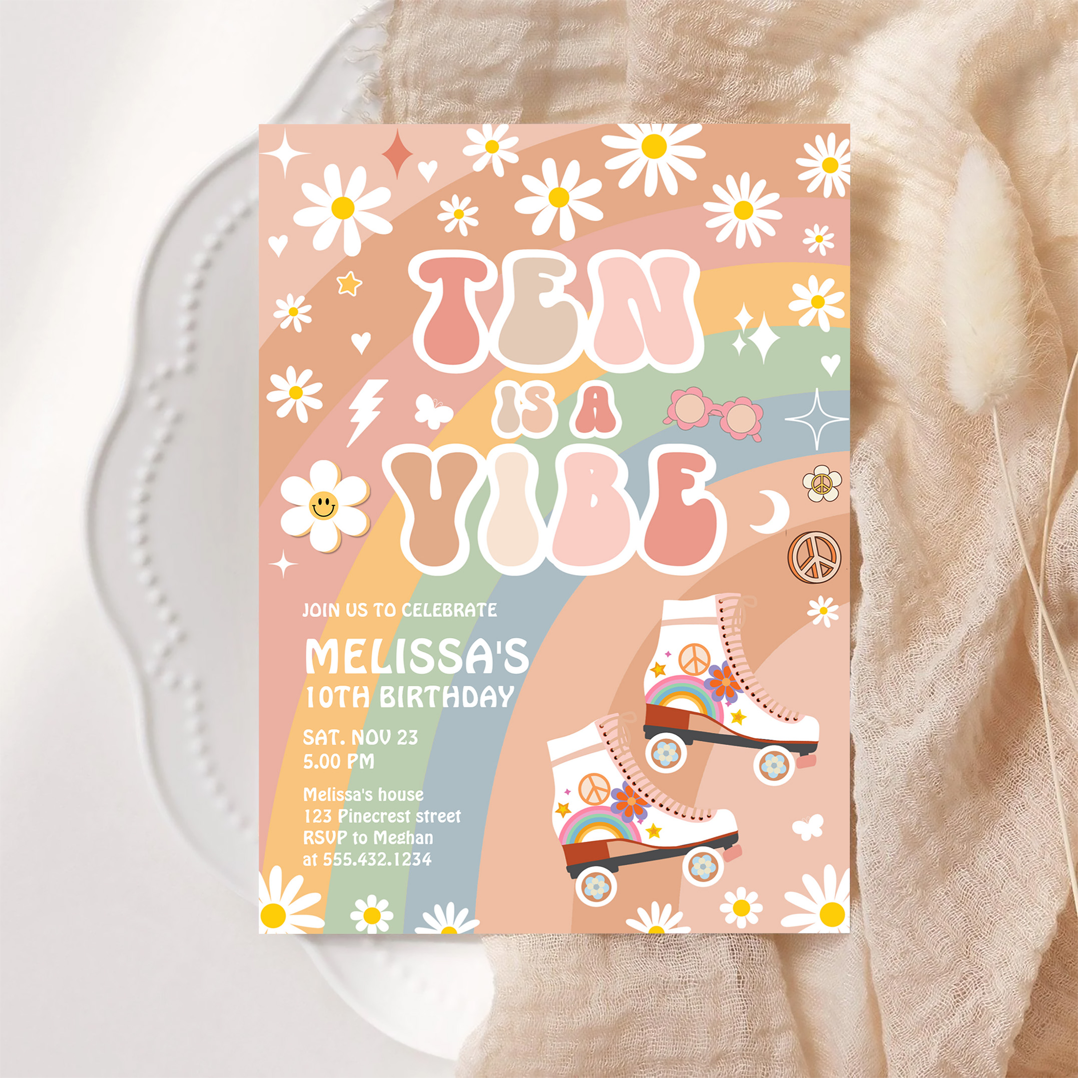 Ten Is A Vibe Groovy Roller Skate 10th Birthday Invitation
